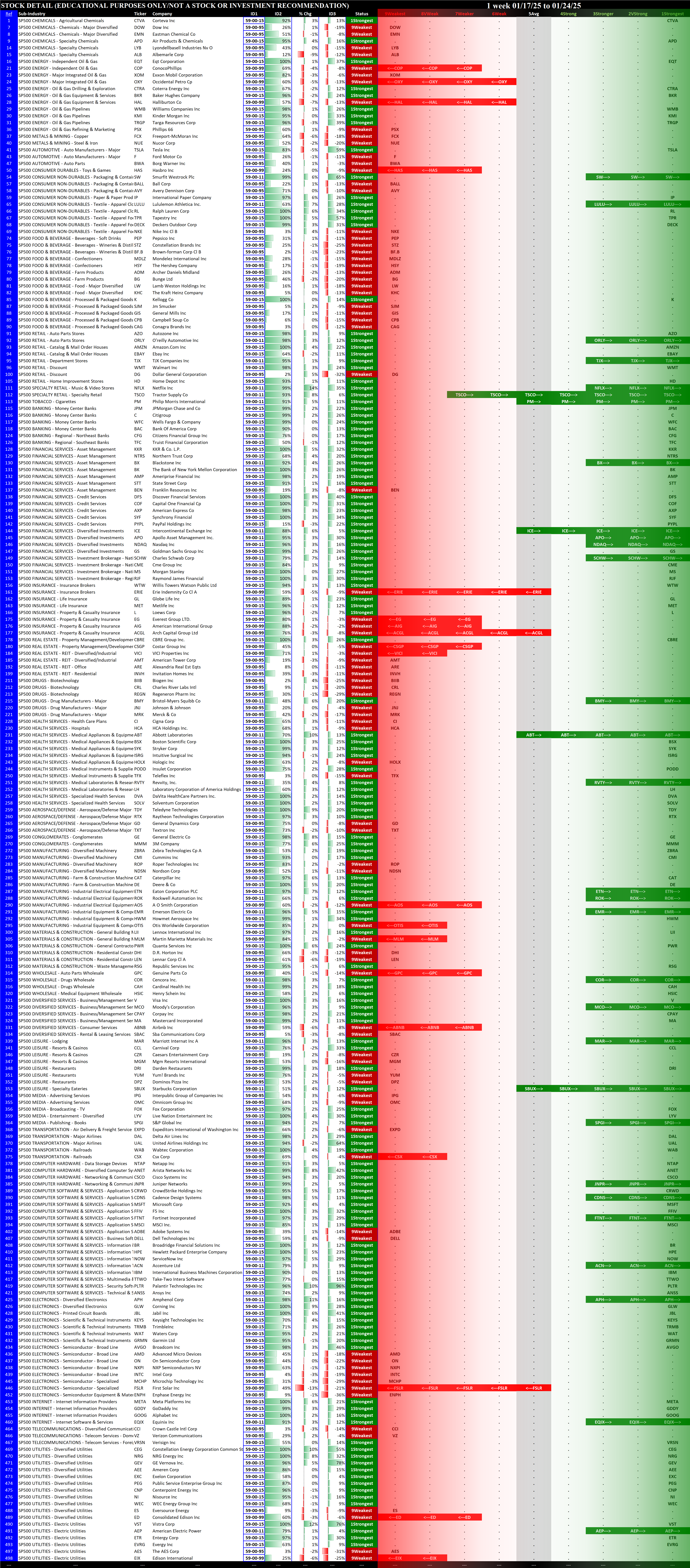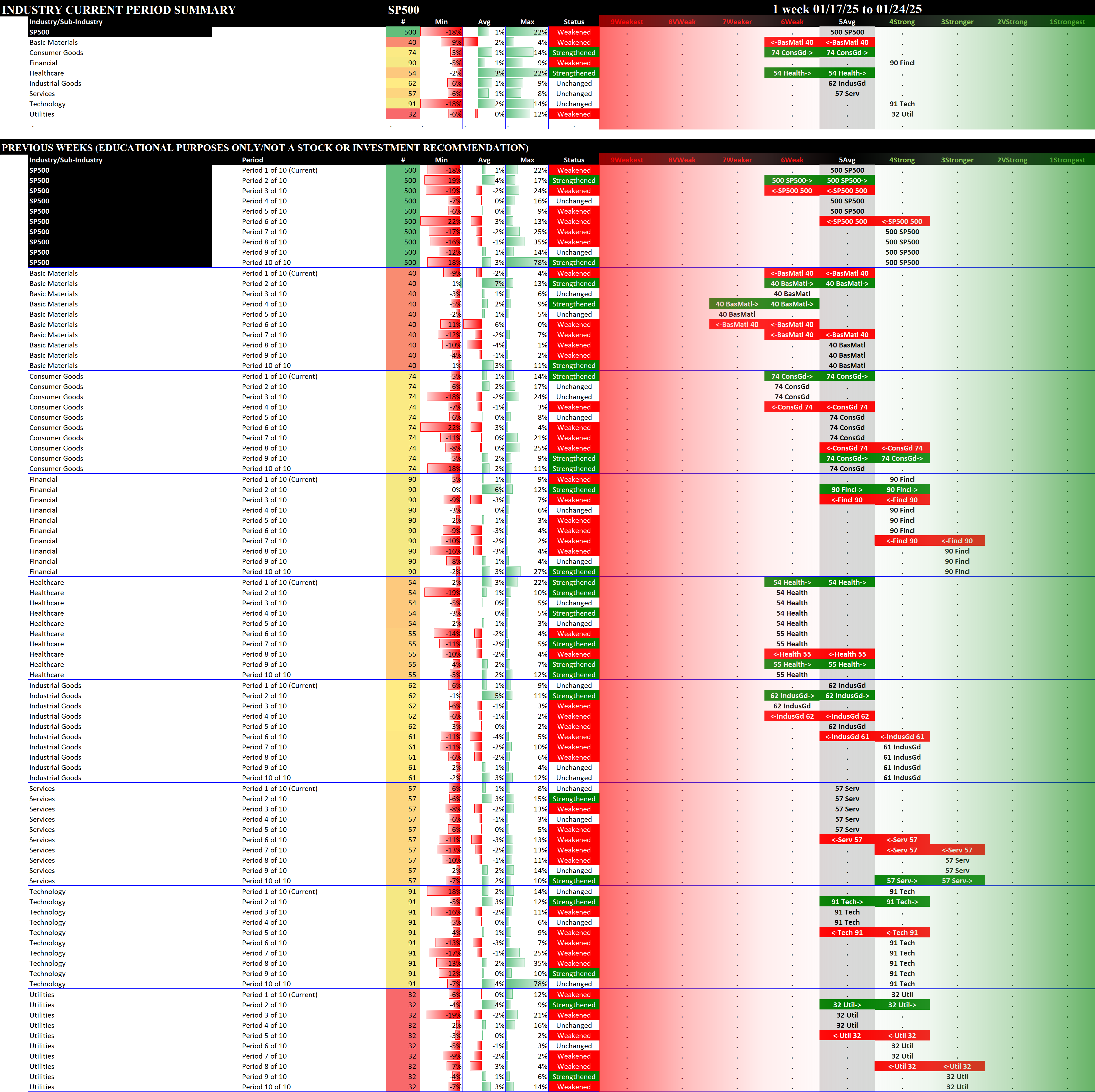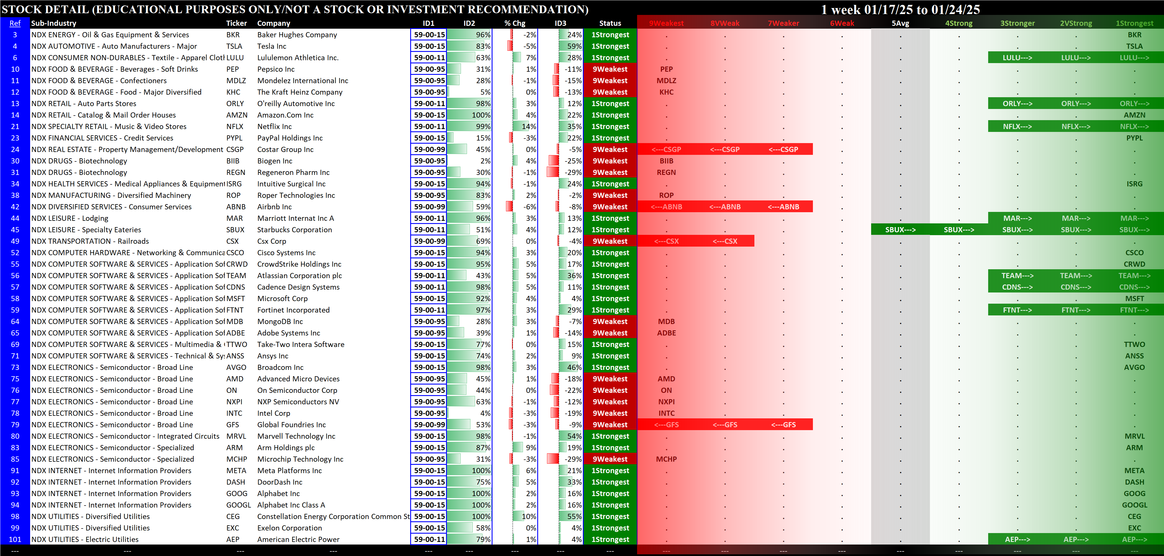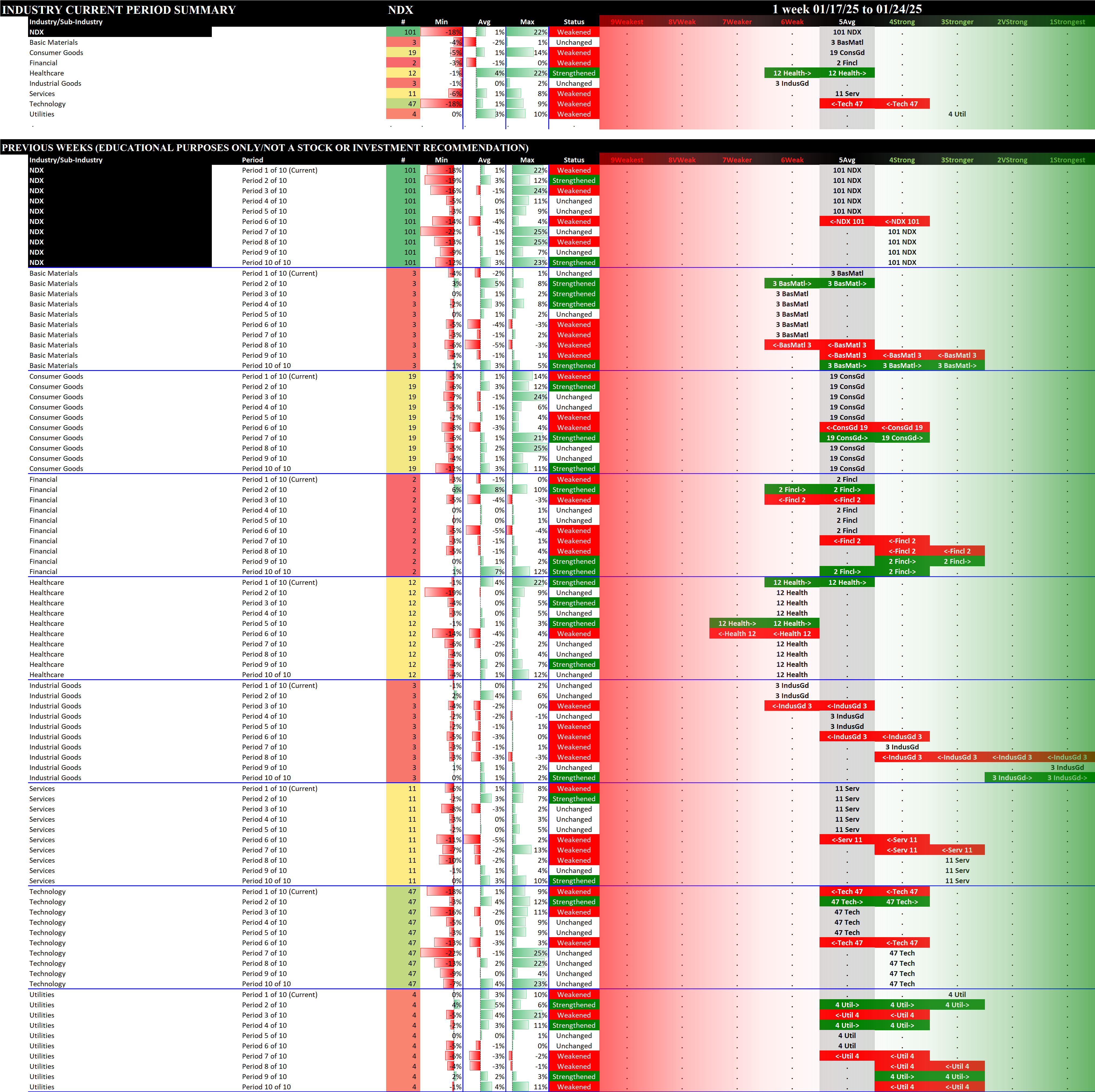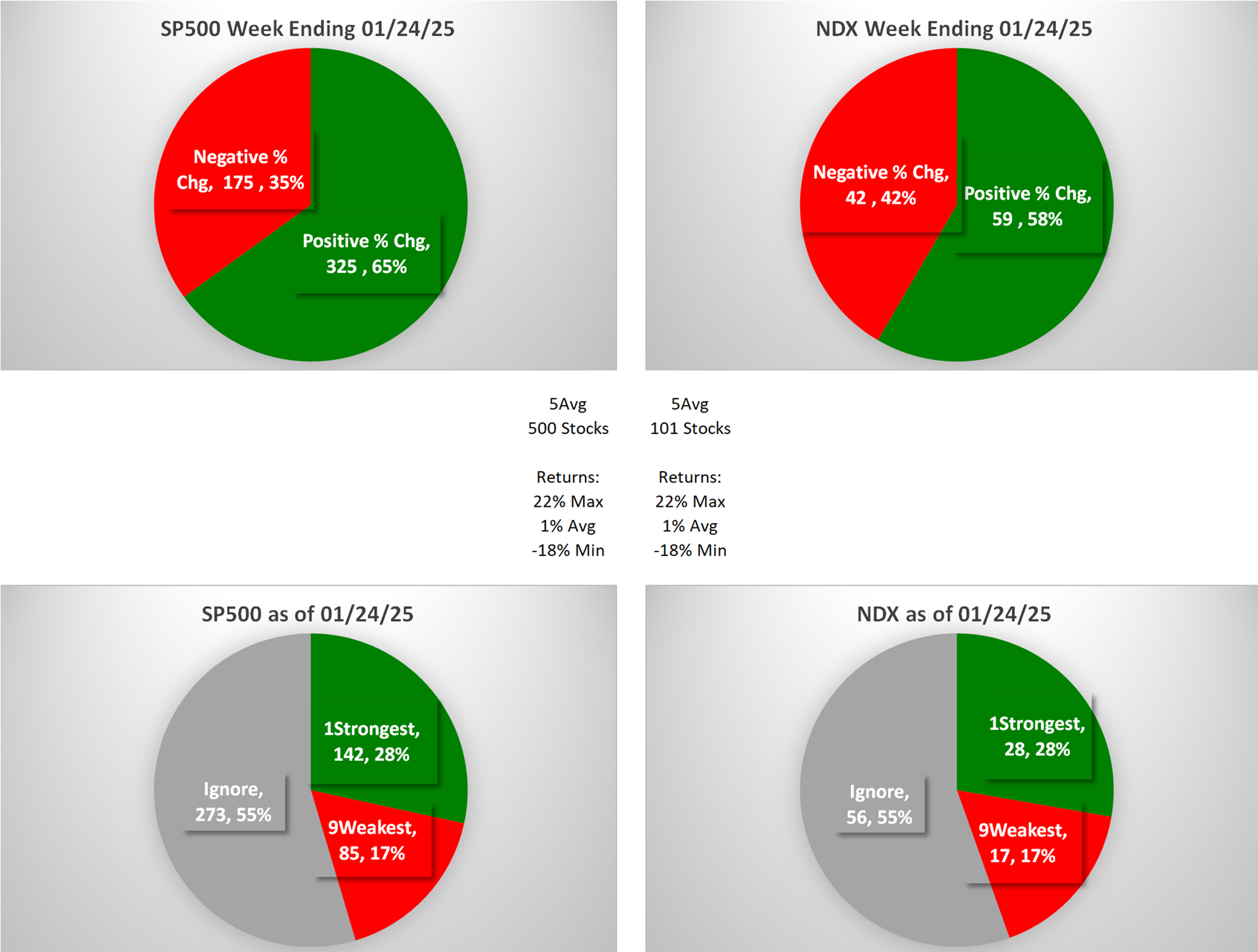 This analysis provides a Stock Market Organizer summary view of the S&P 500 and Nasdaq 100 for the week ended Friday, 01/24/25. This means this is a stock-by-stock strength analysis of the component stocks for each index, aggregated upward in level to the sector and index levels.