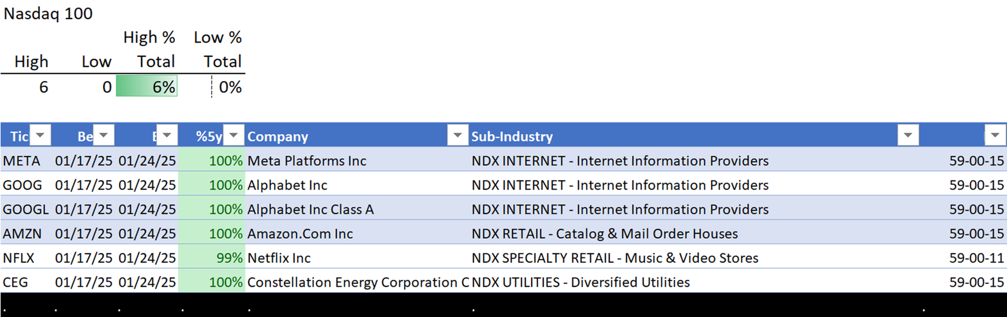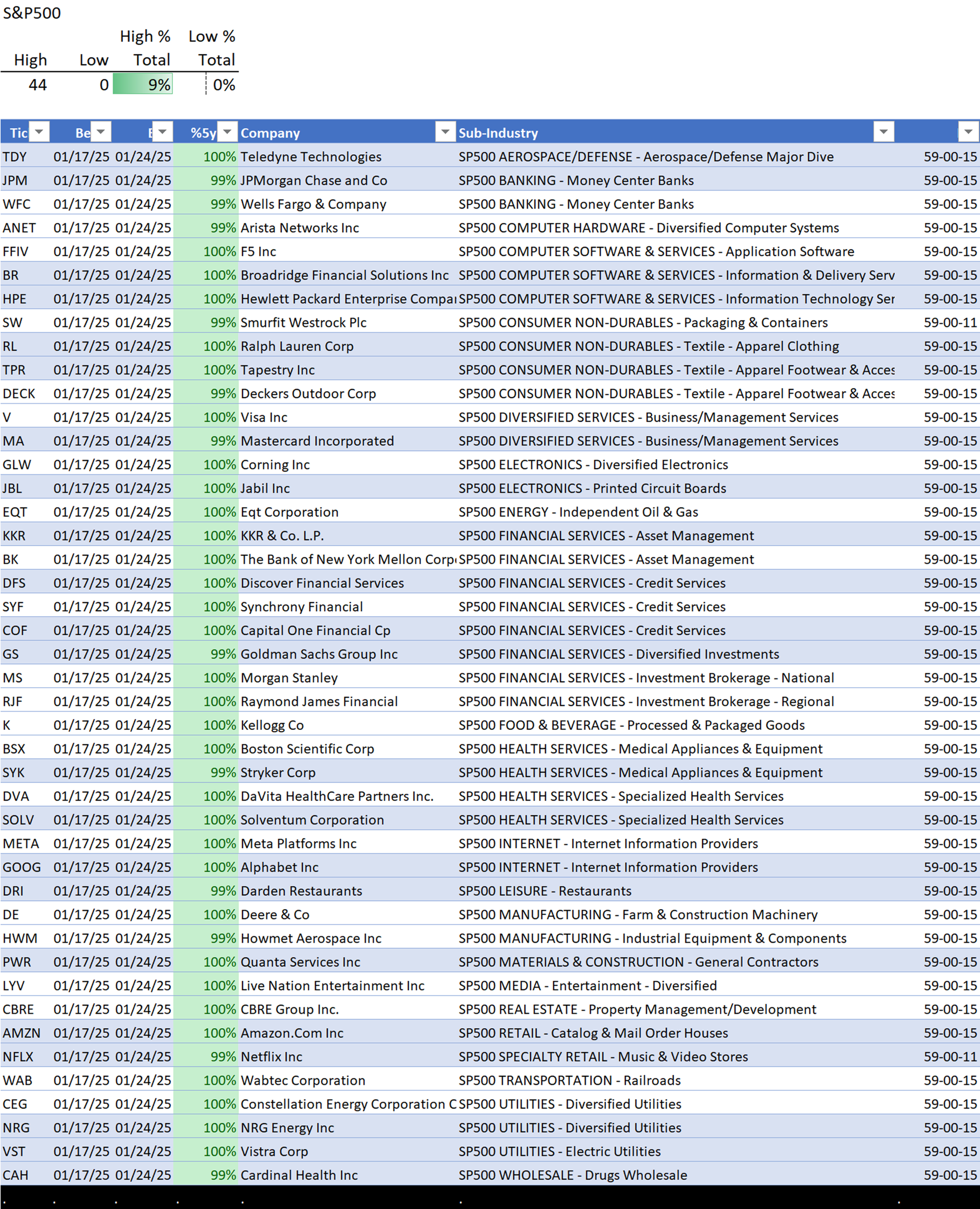 For the week ending Friday, January 24, 2025 there are 44 multi-year highs and 0 multi-year lows for the S&P500. The Nasdaq 100 had a ratio of 6:0. Compare this to the week ending Friday, January 17, 2025 where the S&P500 ratio was 31:5 and the Nasdaq 100 ratio was 6:2.