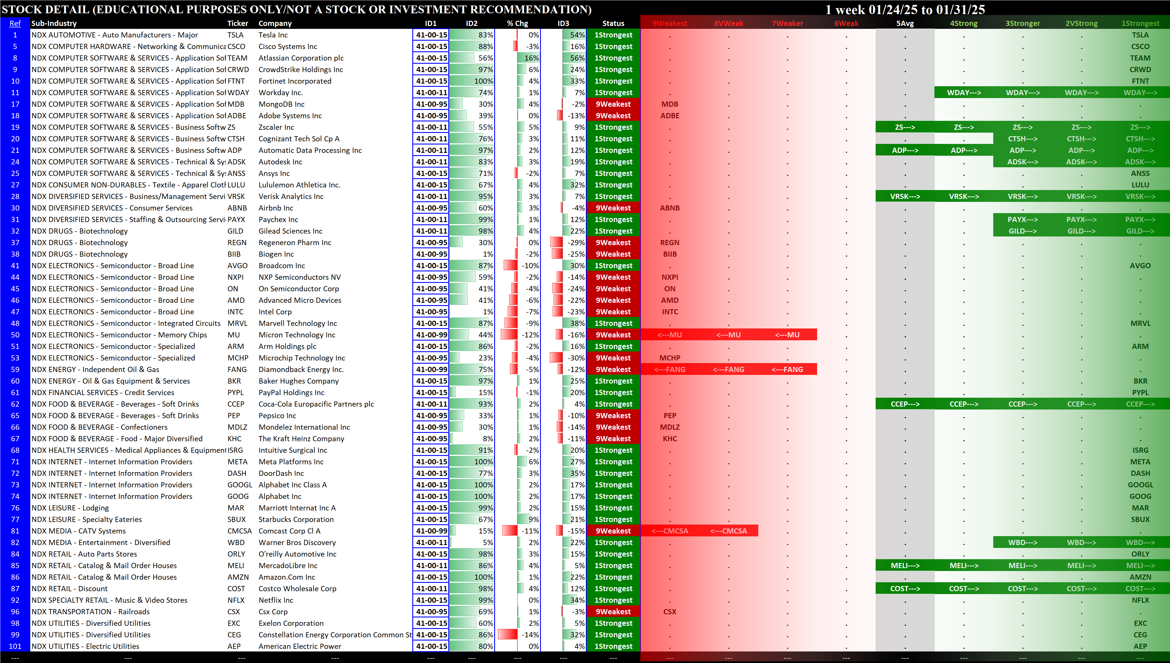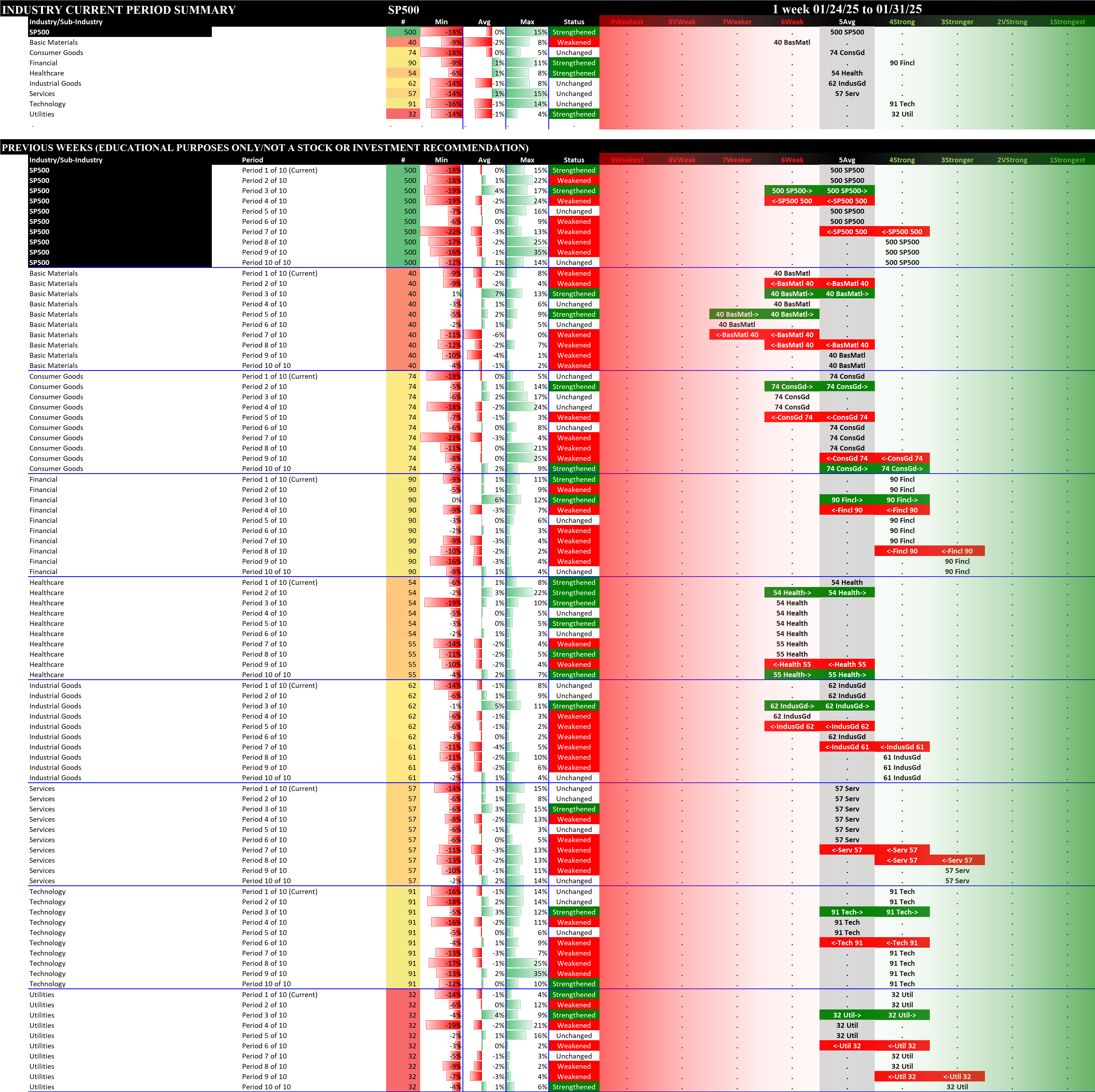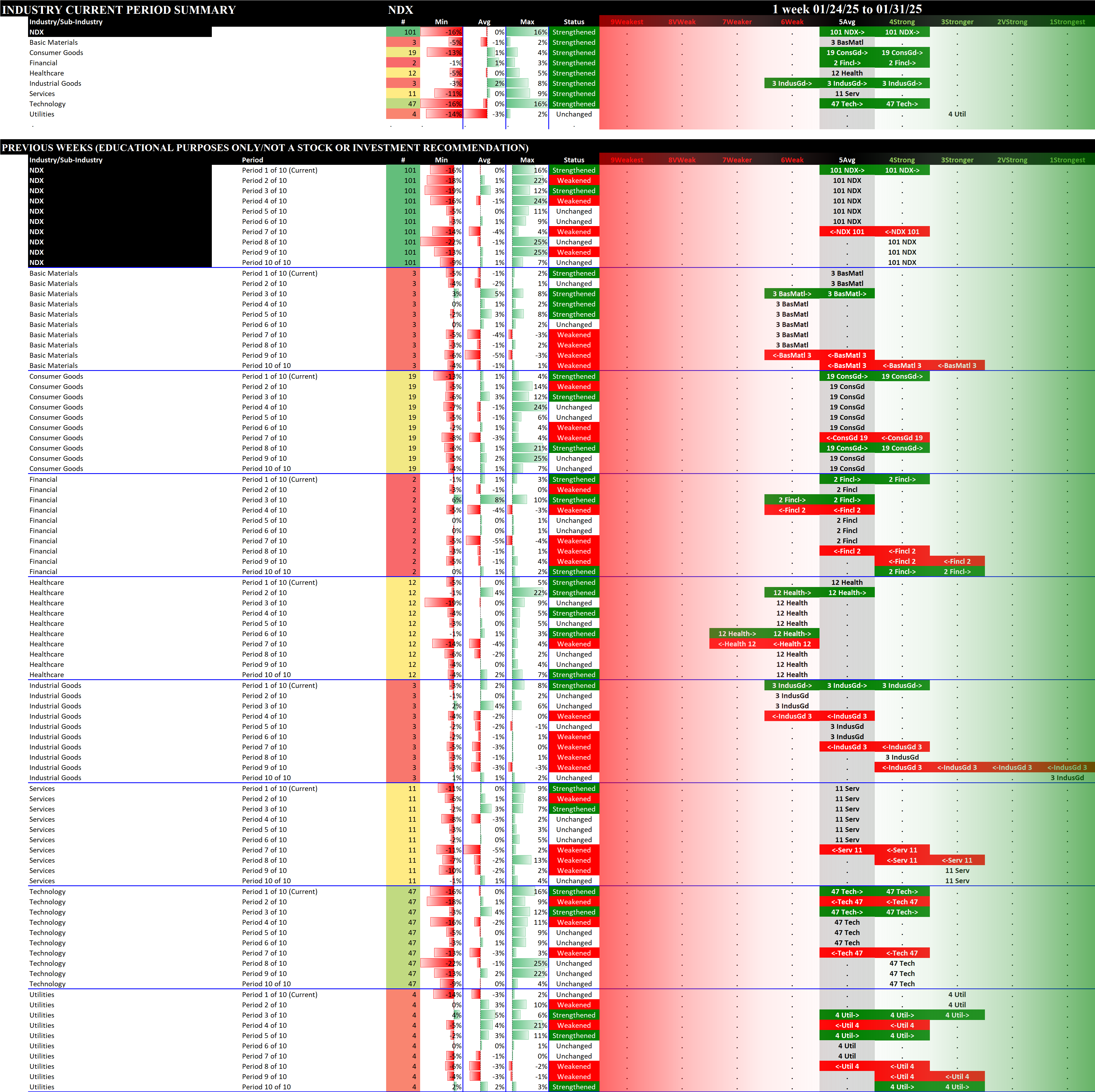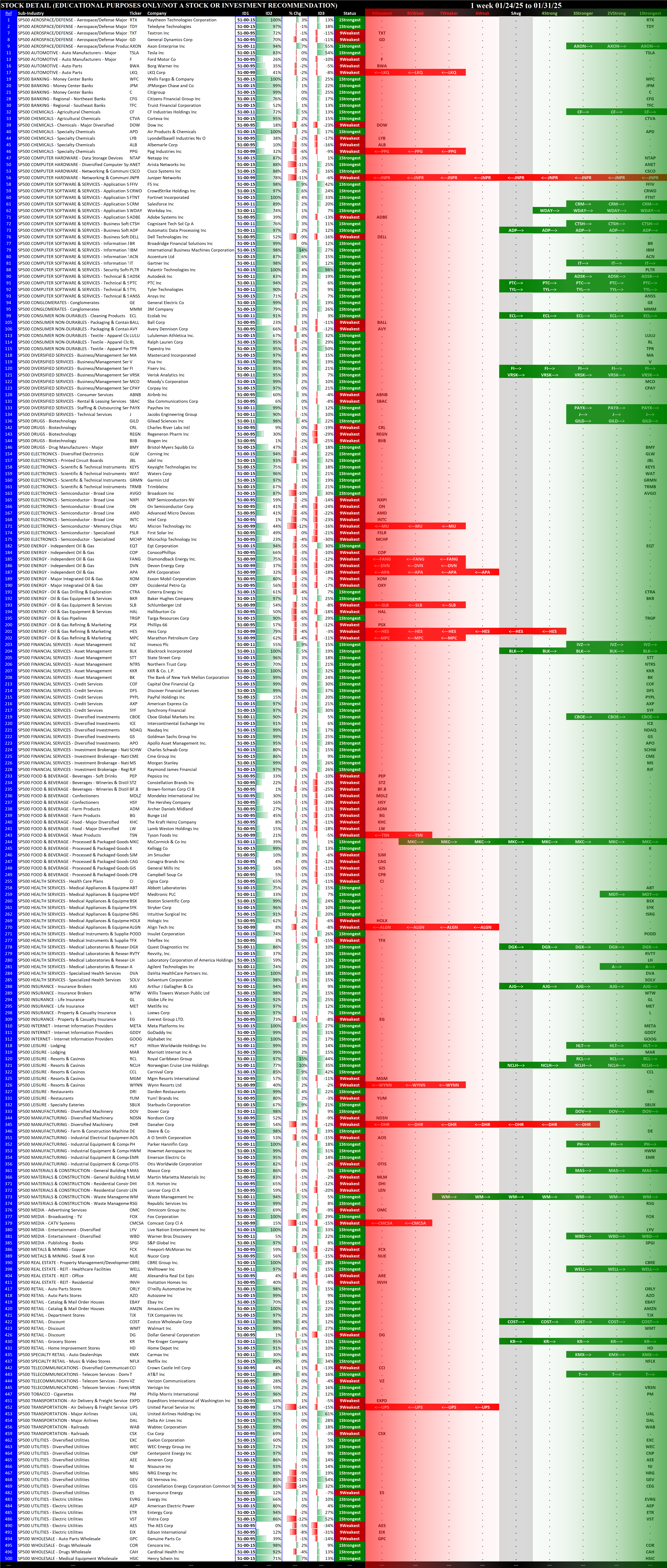 This analysis provides a Stock Market Organizer summary view of the S&P 500 and Nasdaq 100 for the week ended Friday, 01/31/25. This means this is a stock-by-stock strength analysis of the component stocks for each index, aggregated upward in level to the sector and index levels.