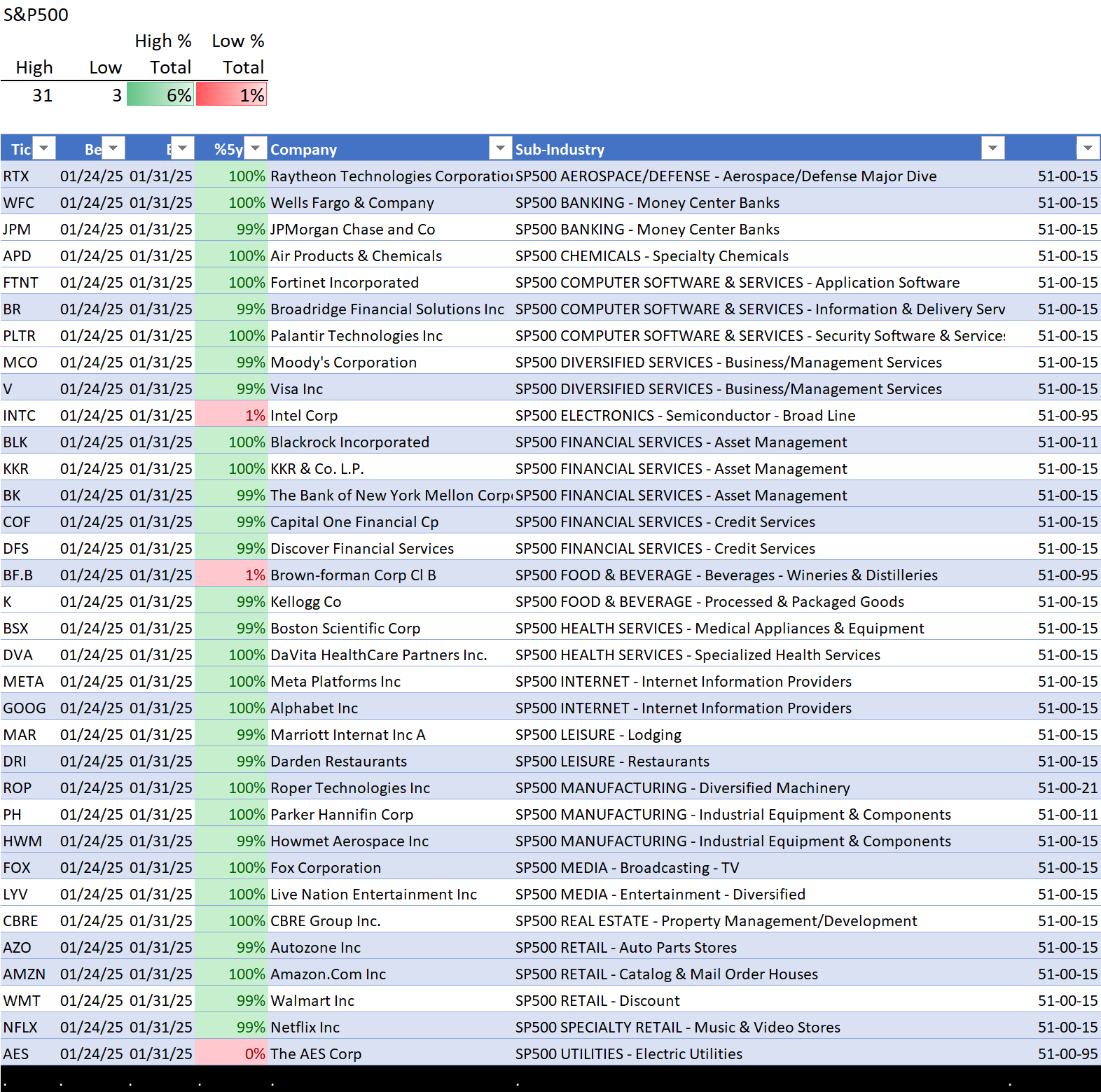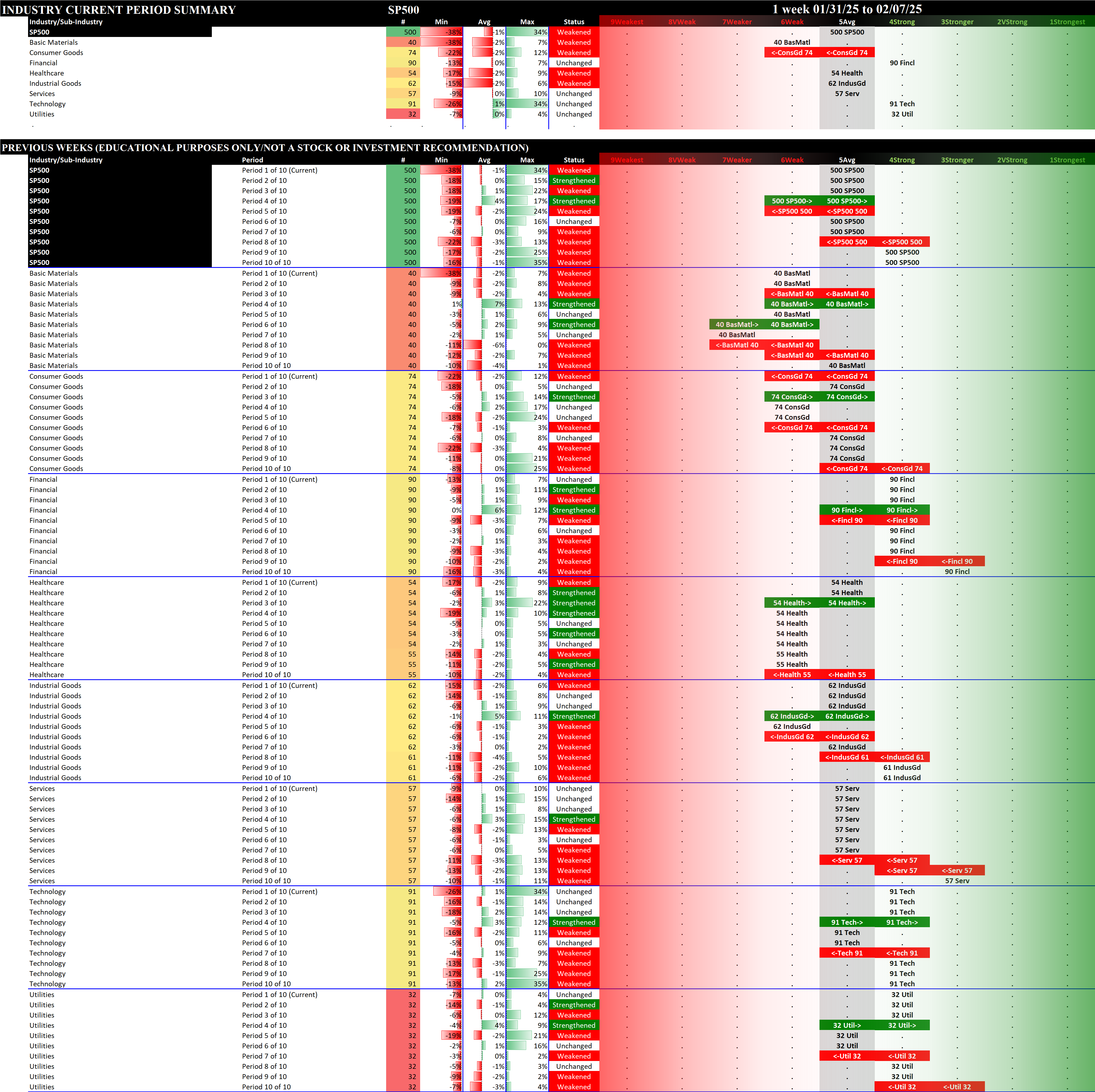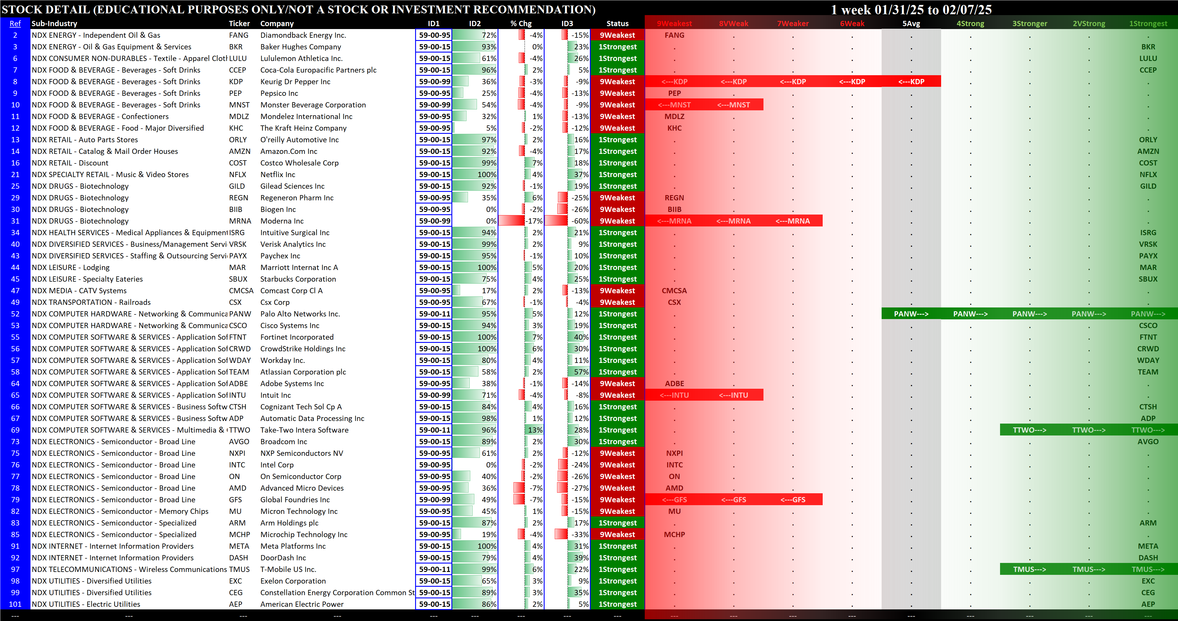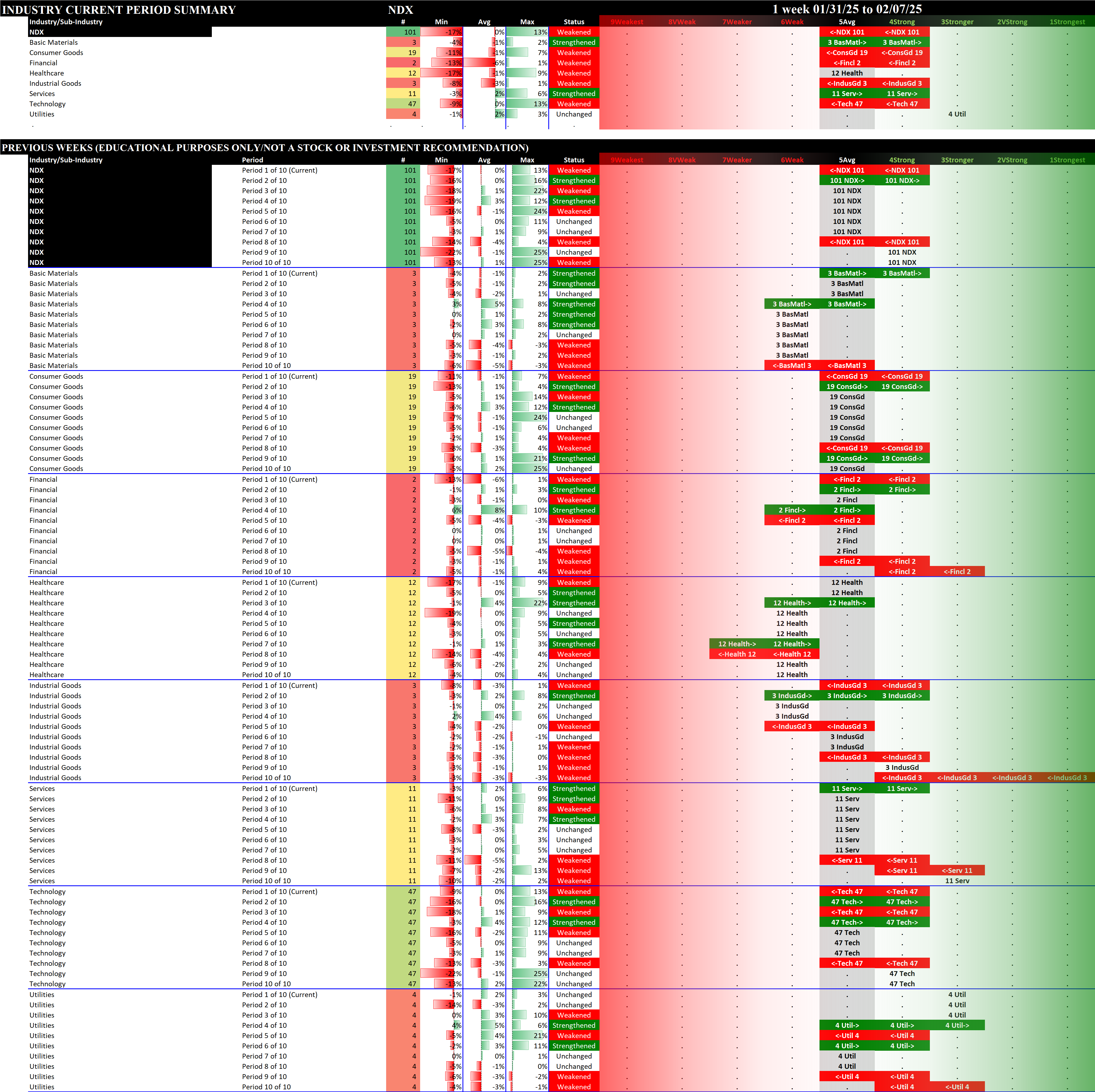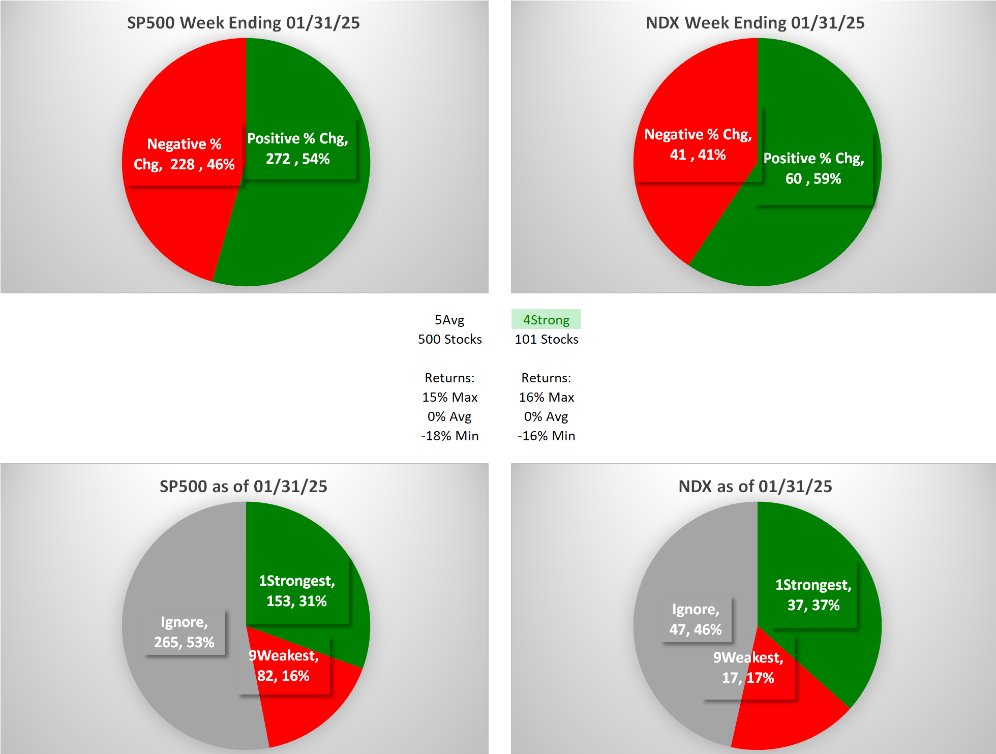 This analysis provides a Stock Market Organizer summary view of the S&P 500 and Nasdaq 100 for the week ended Friday, 02/07/25. This means this is a stock-by-stock strength analysis of the component stocks for each index, aggregated upward in level to the sector and index levels.