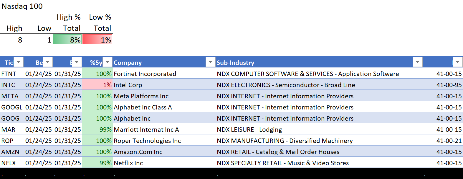 For the week ending Friday, February 07, 2025 there are 31 multi-year highs and 12 multi-year lows for the S&P500. The Nasdaq 100 has a ratio of 8:3. Compare this to the week ending Friday, January 31, 2025 where the S&P500 ratio was 31:3 and the Nasdaq 100 ratio was 8:1.