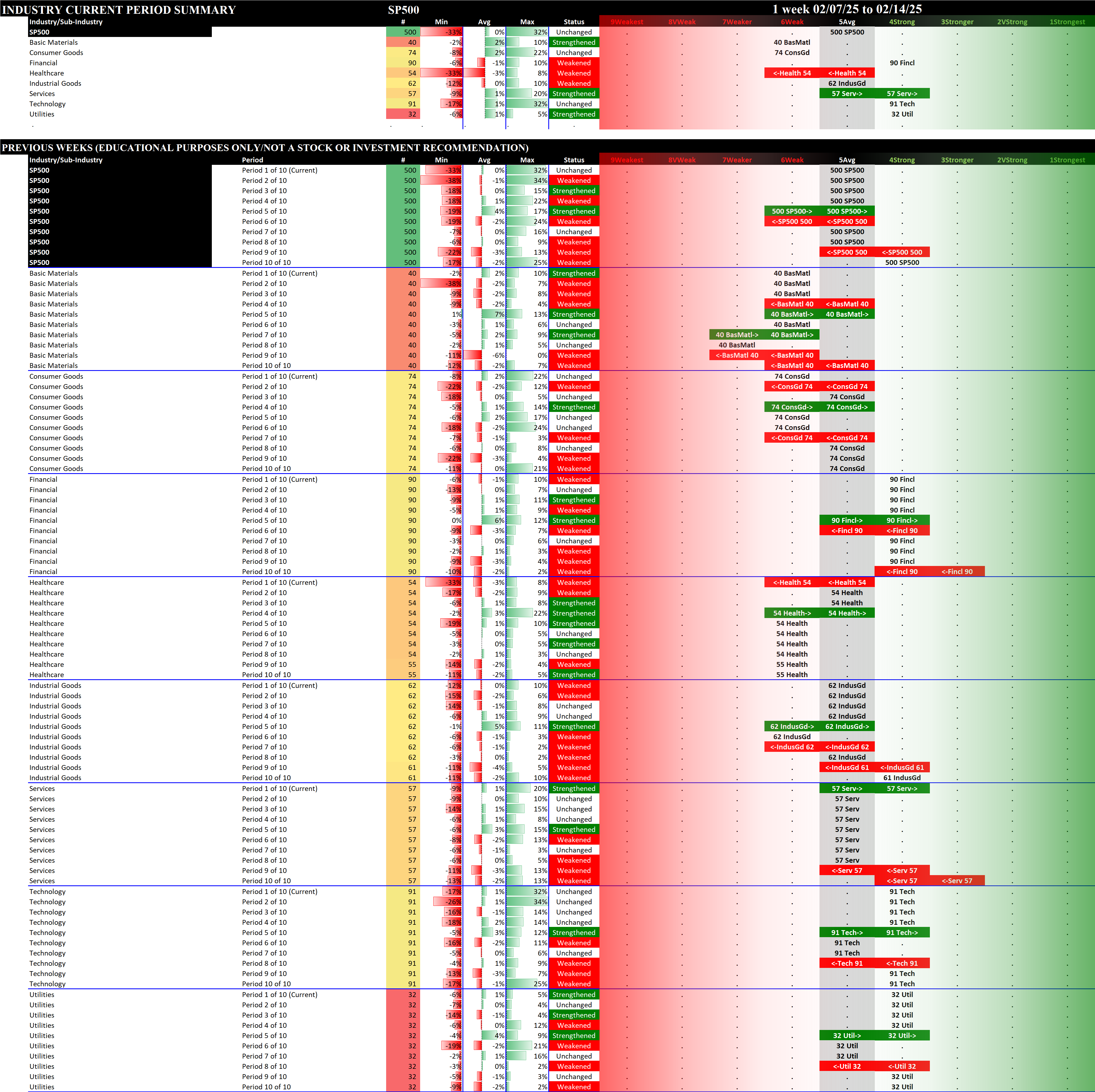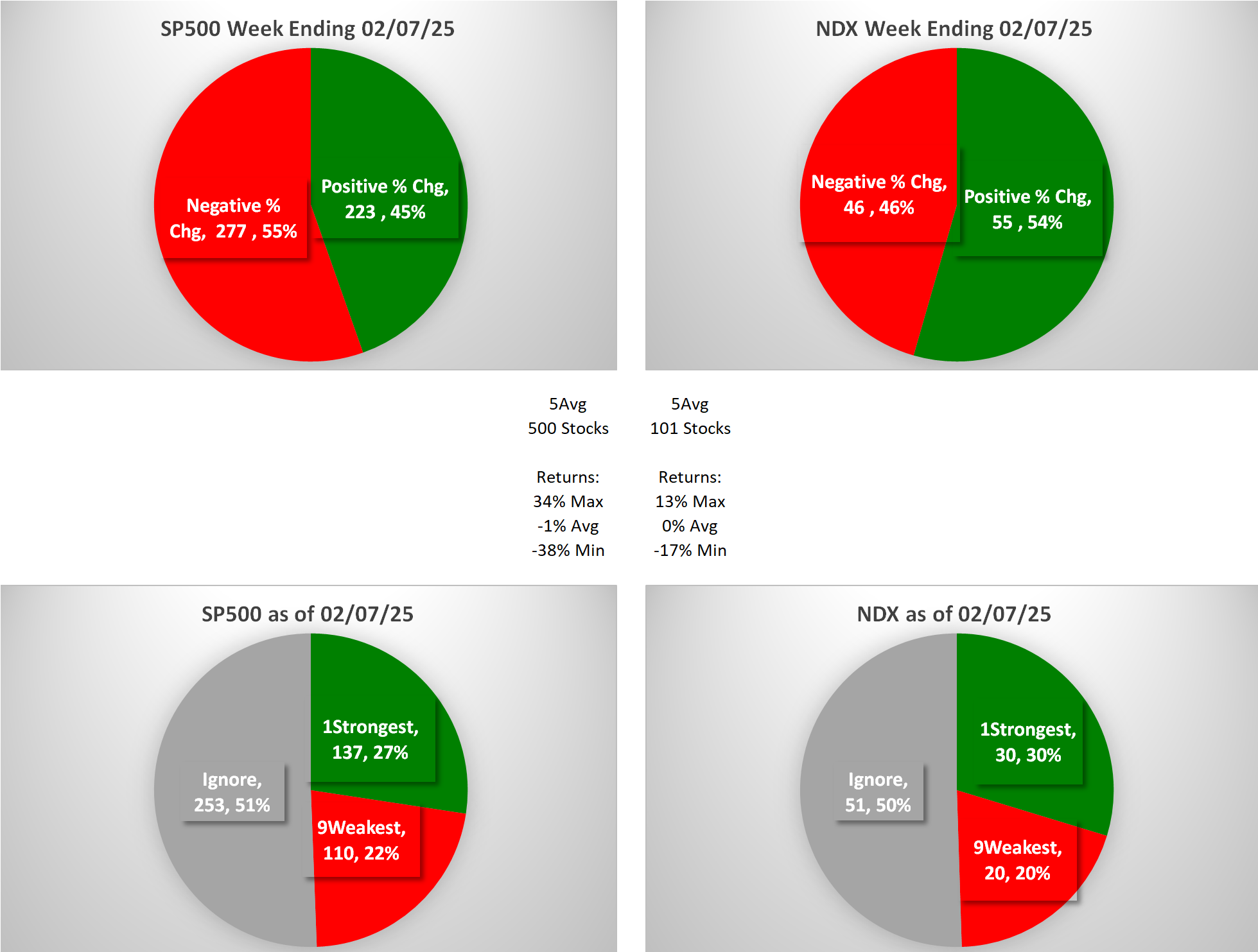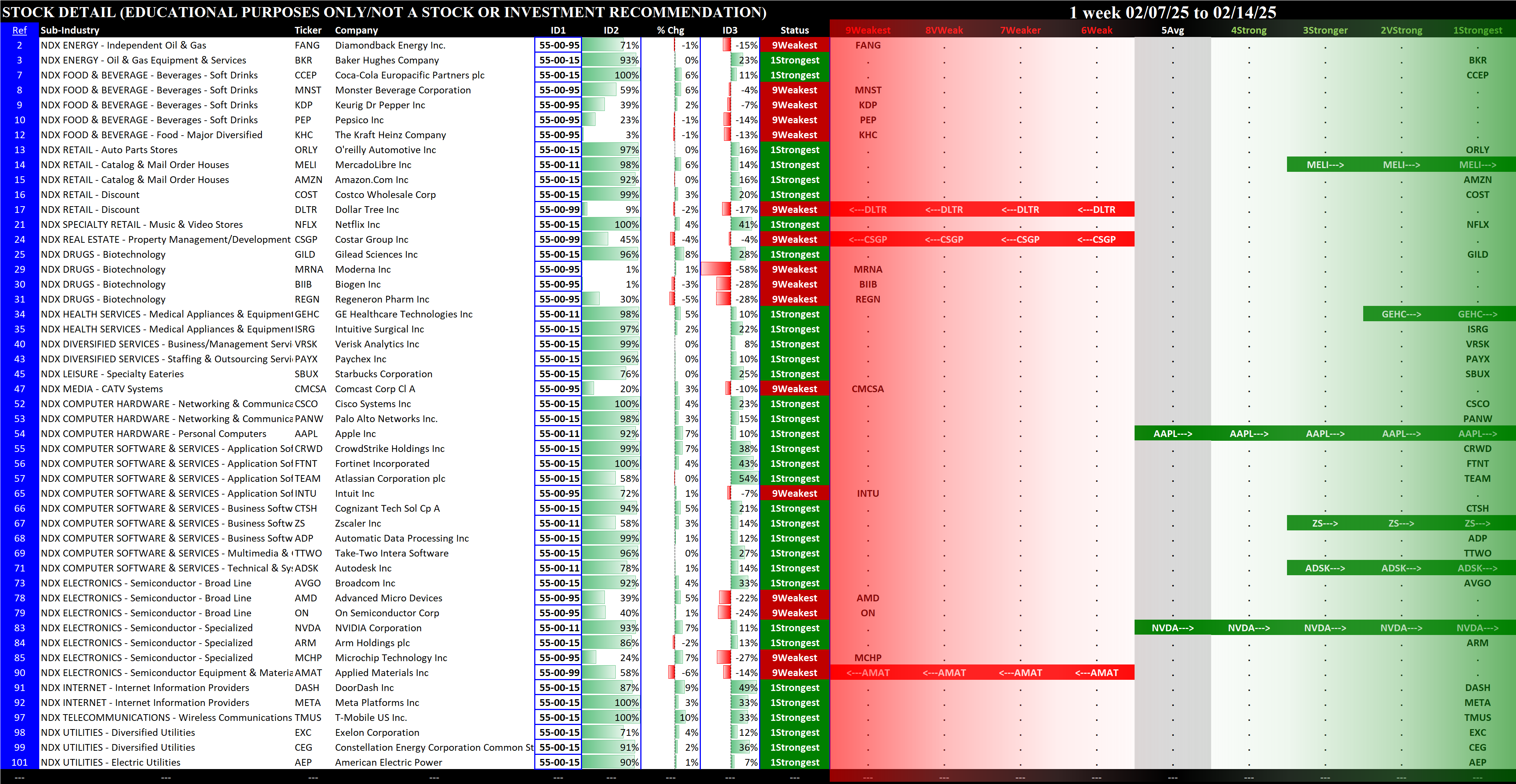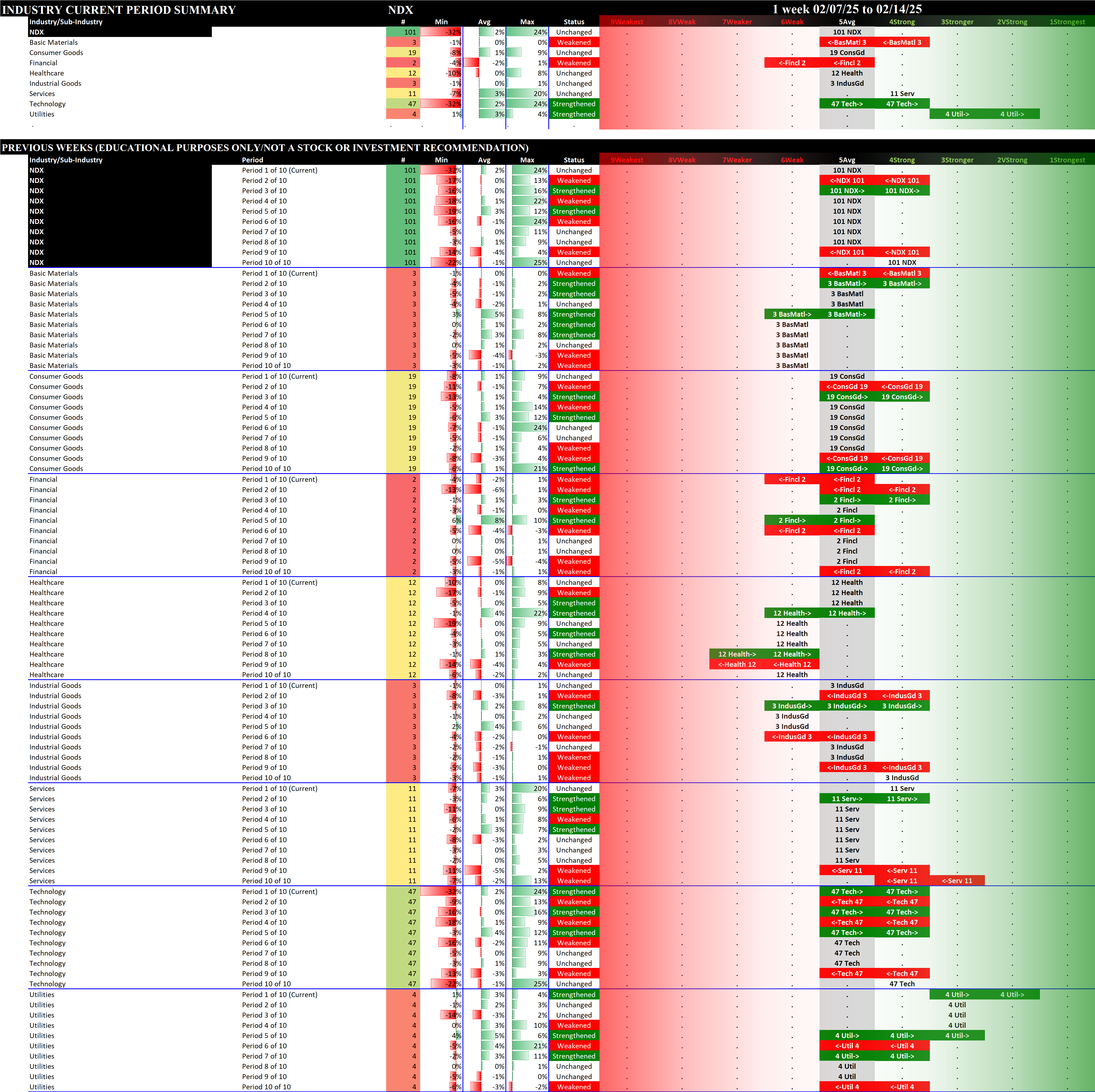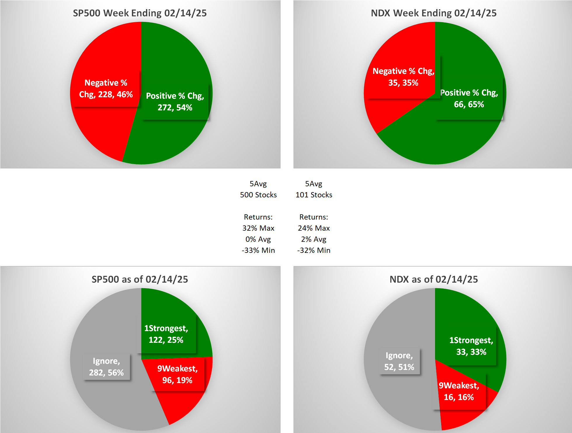This analysis provides a Stock Market Organizer summary view of the S&P 500 and Nasdaq 100 for the week ended Friday, 02/14/25. This means this is a stock-by-stock strength analysis of the component stocks for each index, aggregated upward in level to the sector and index levels.
