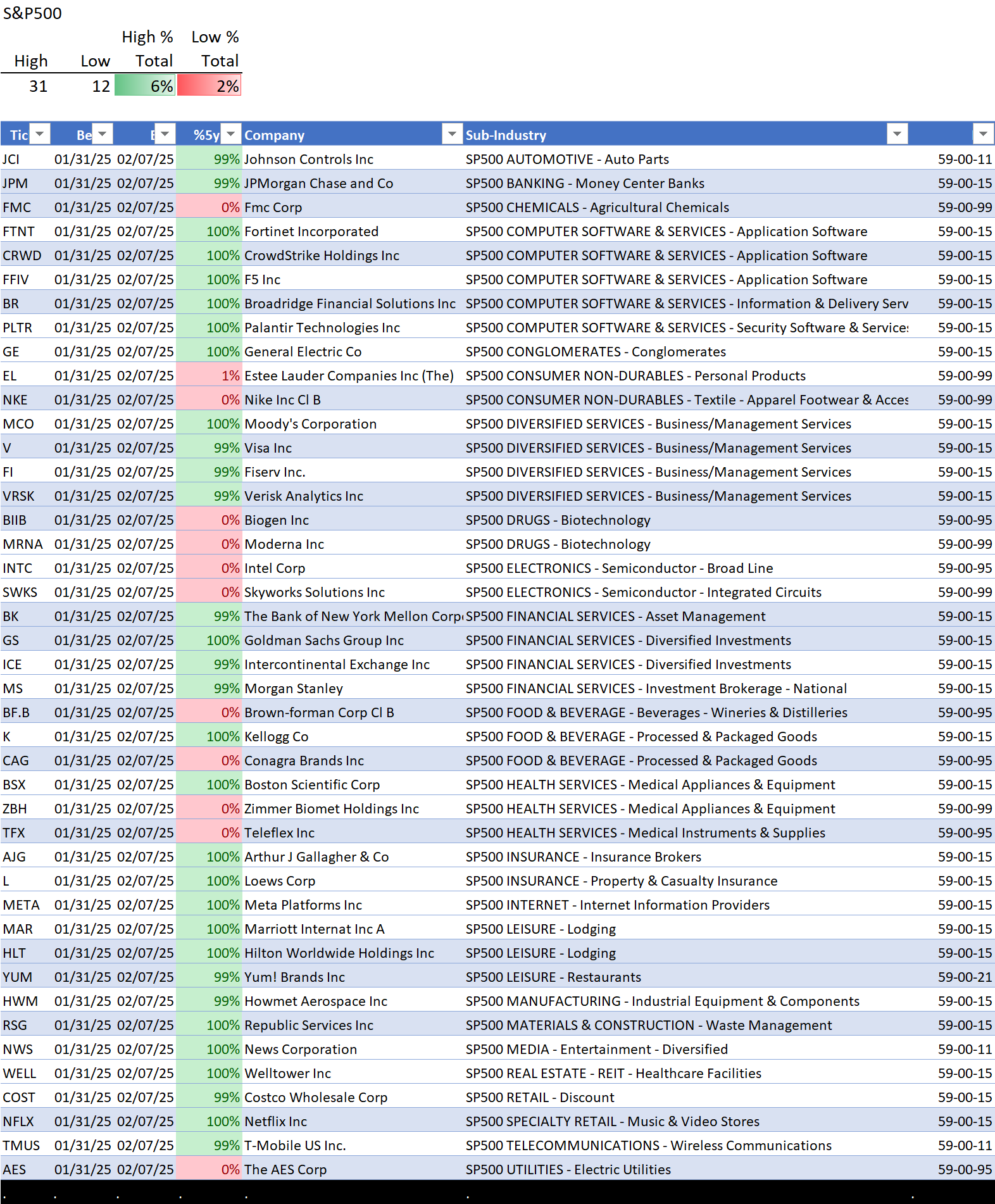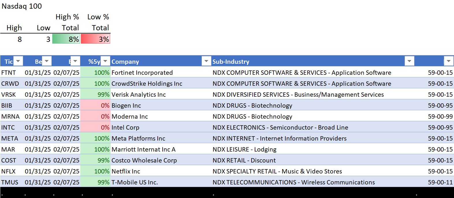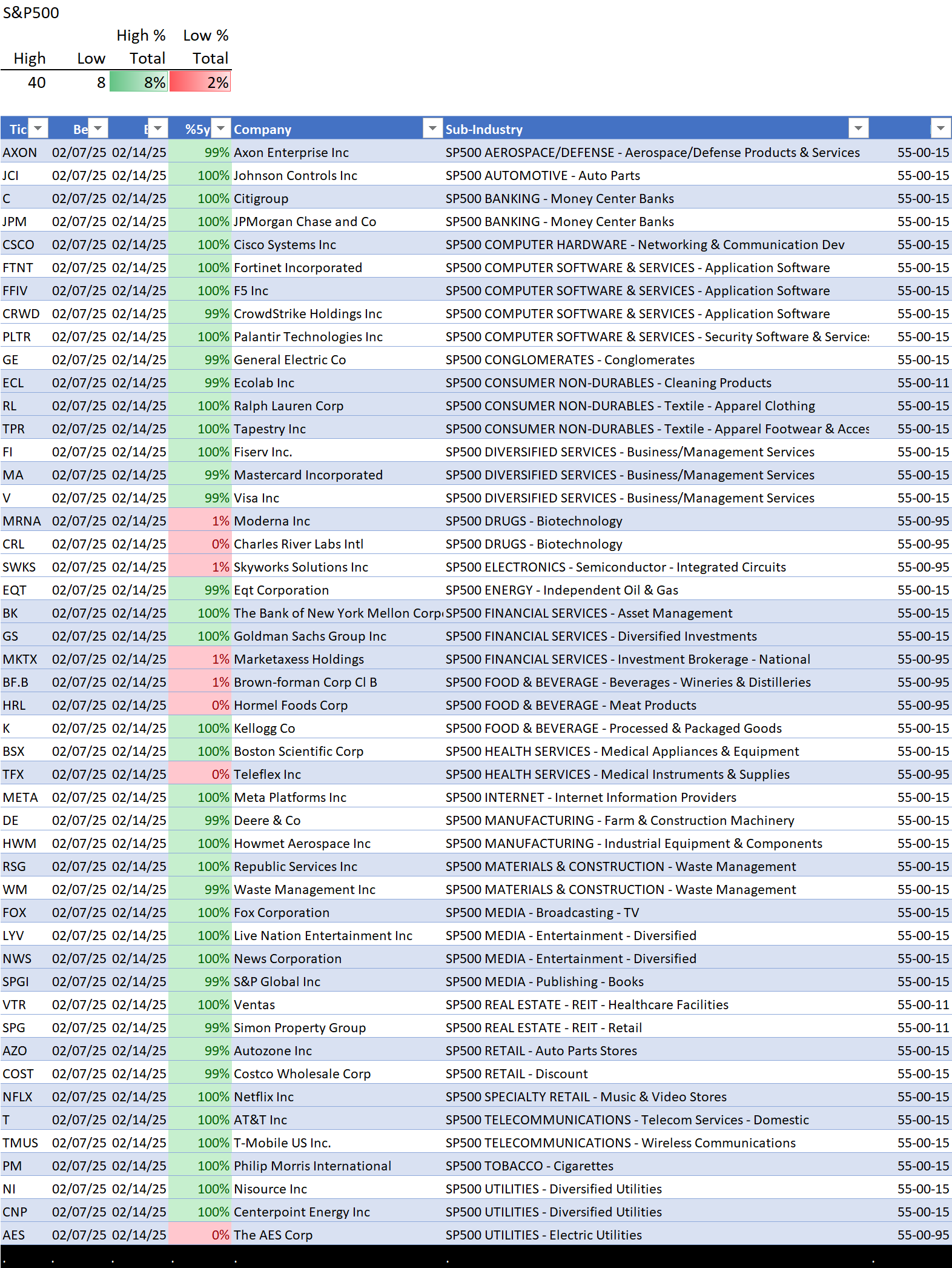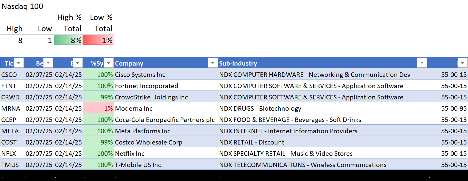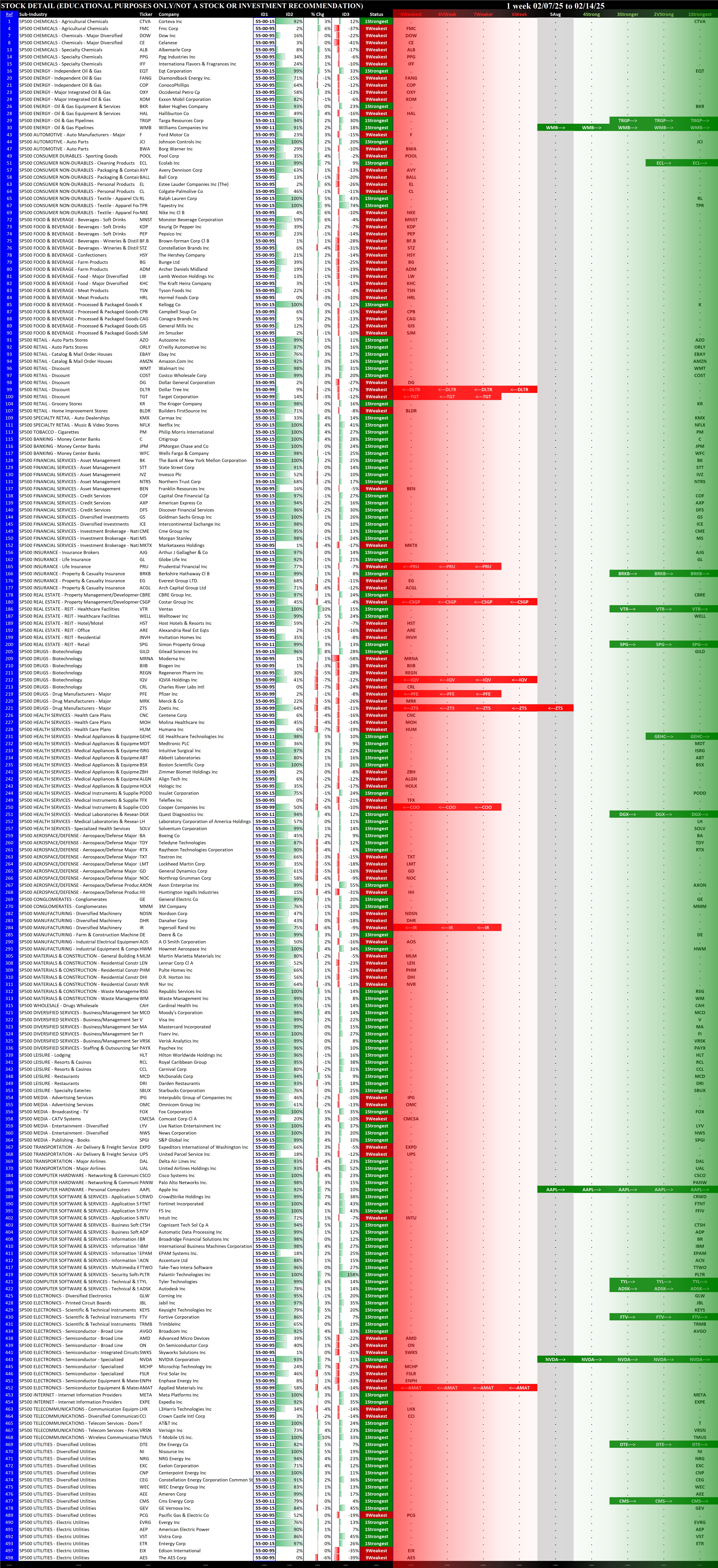 This analysis provides a Stock Market Organizer summary view of the S&P 500 and Nasdaq 100 for the week ended Friday, 02/14/25. This means this is a stock-by-stock strength analysis of the component stocks for each index, aggregated upward in level to the sector and index levels.