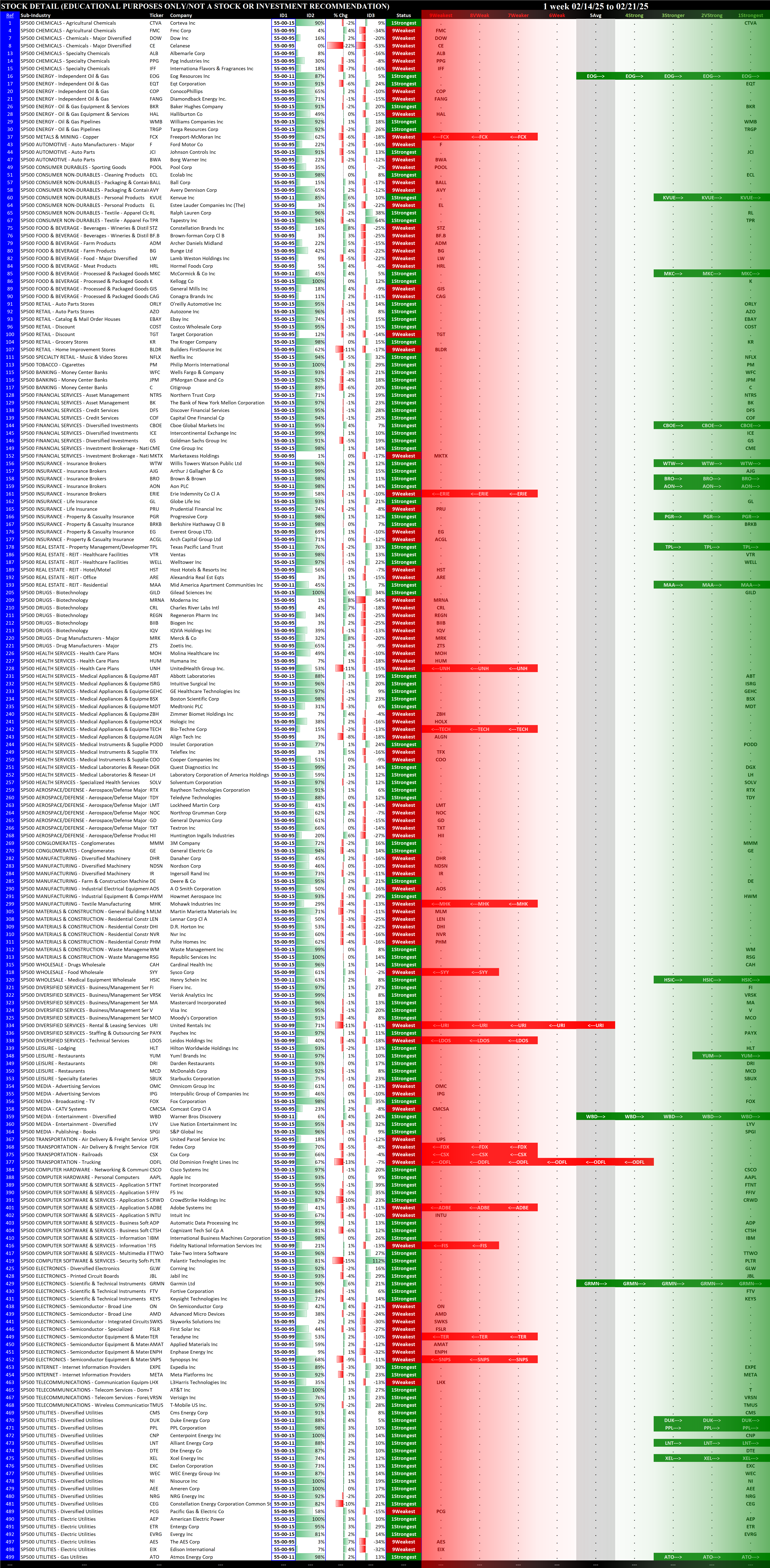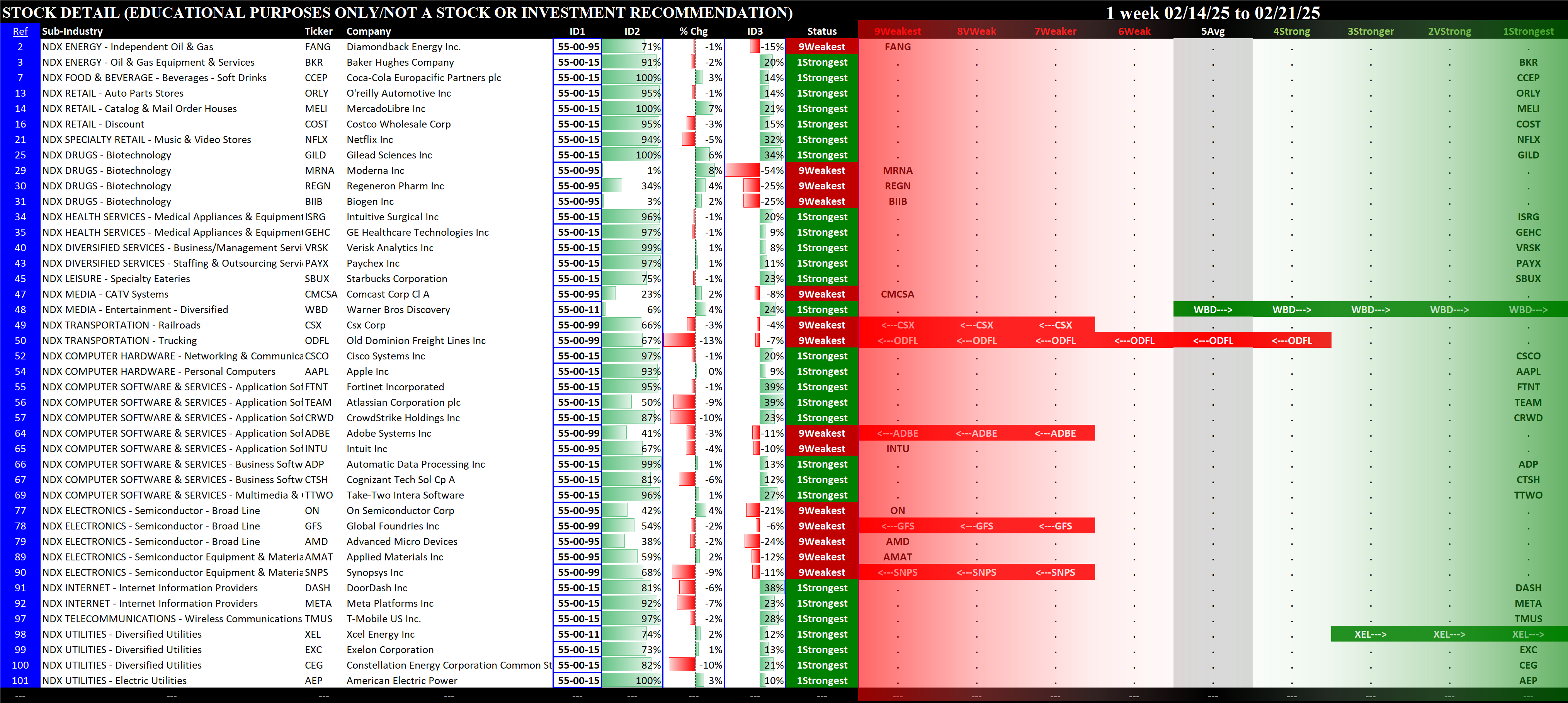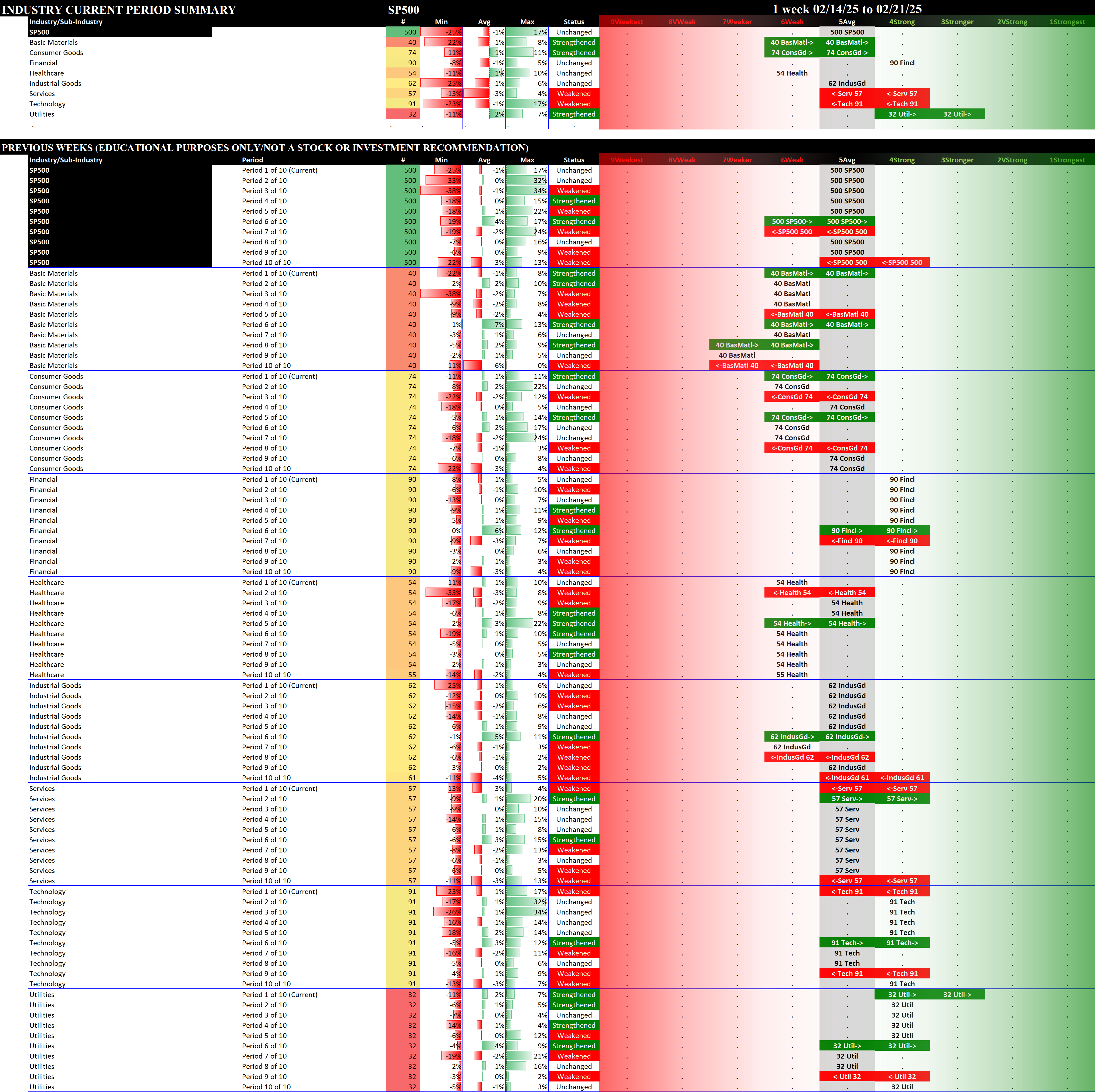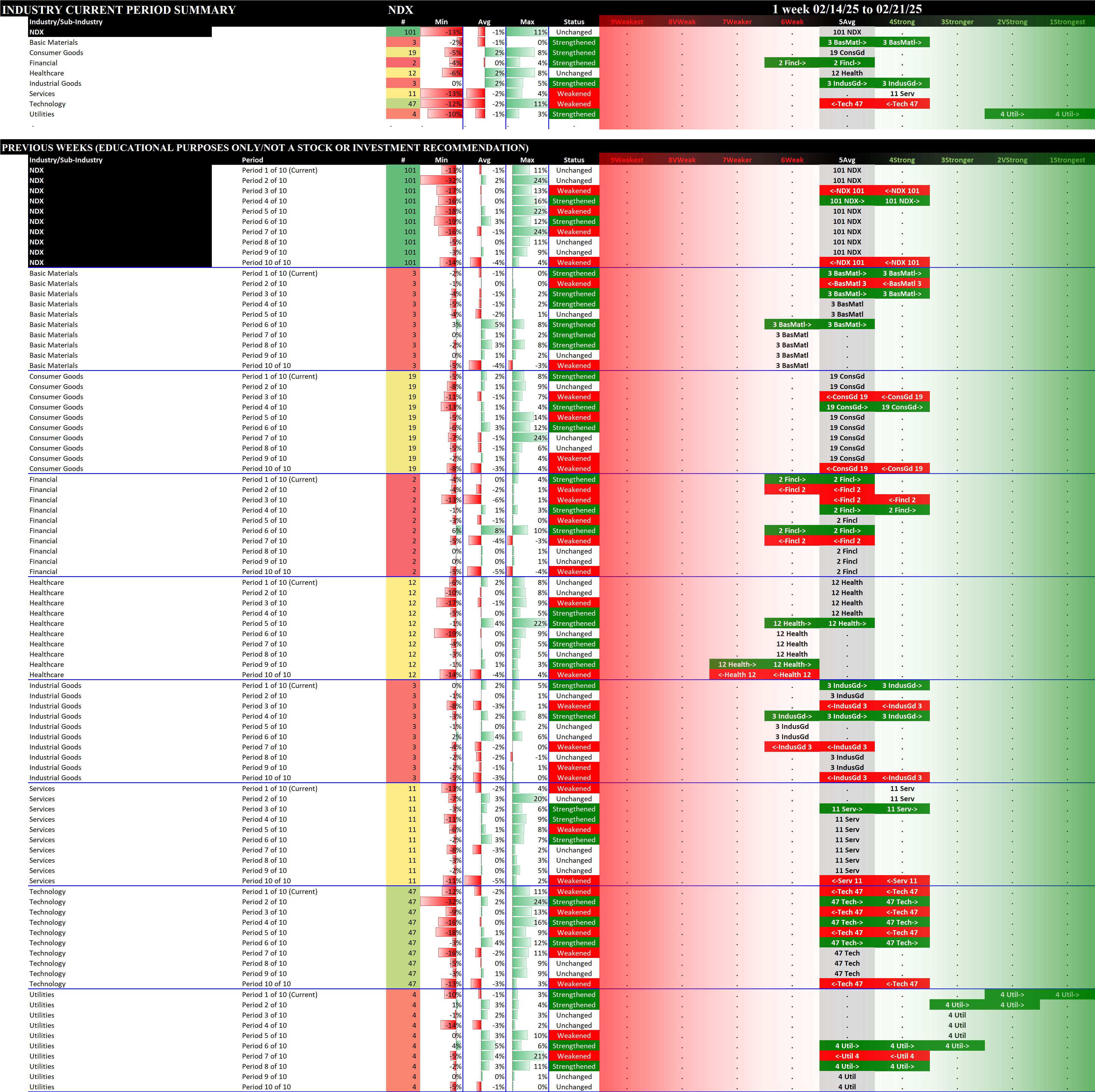 This analysis provides a Stock Market Organizer summary view of the S&P 500 and Nasdaq 100 for the week ended Friday, 02/21/25. This means this is a stock-by-stock strength analysis of the component stocks for each index, aggregated upward in level to the sector and index levels.
