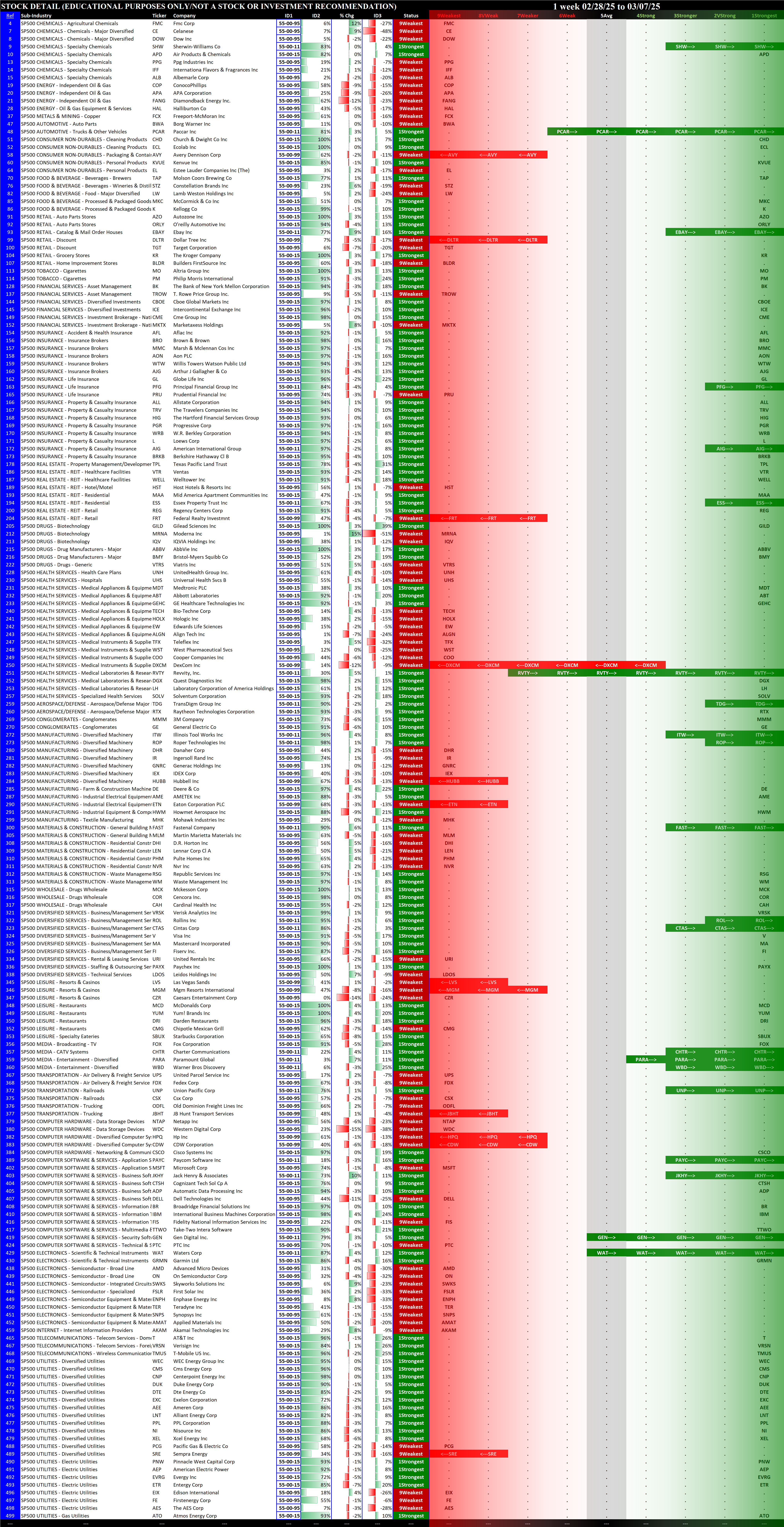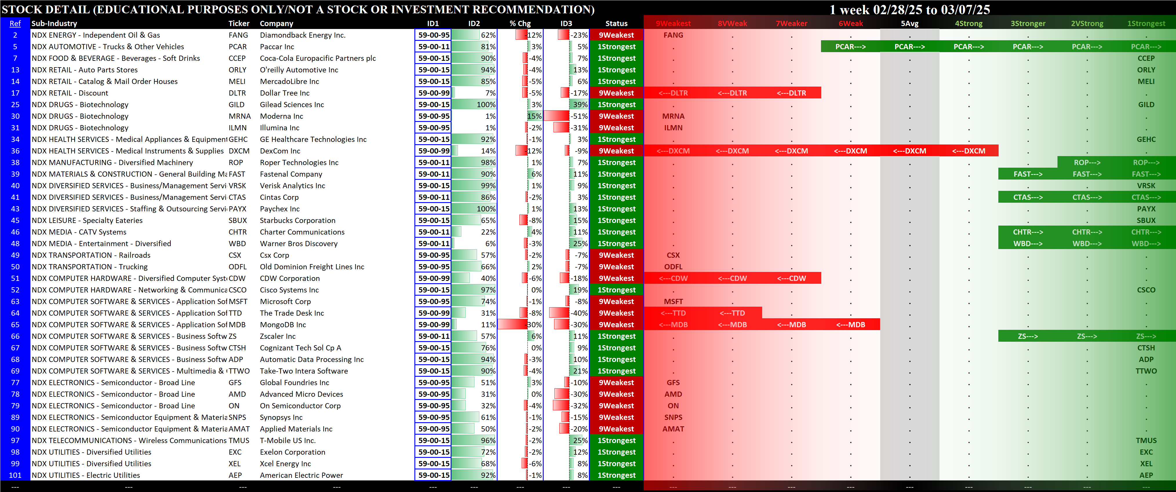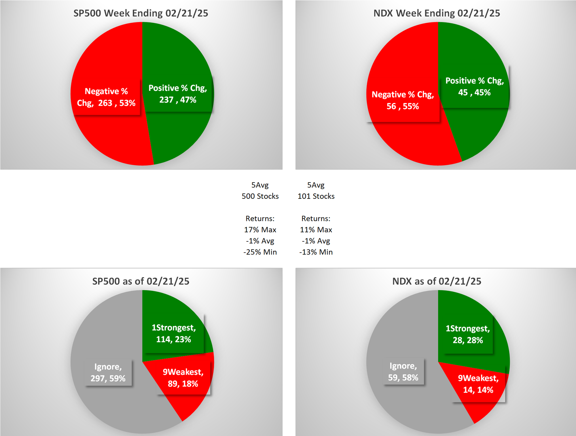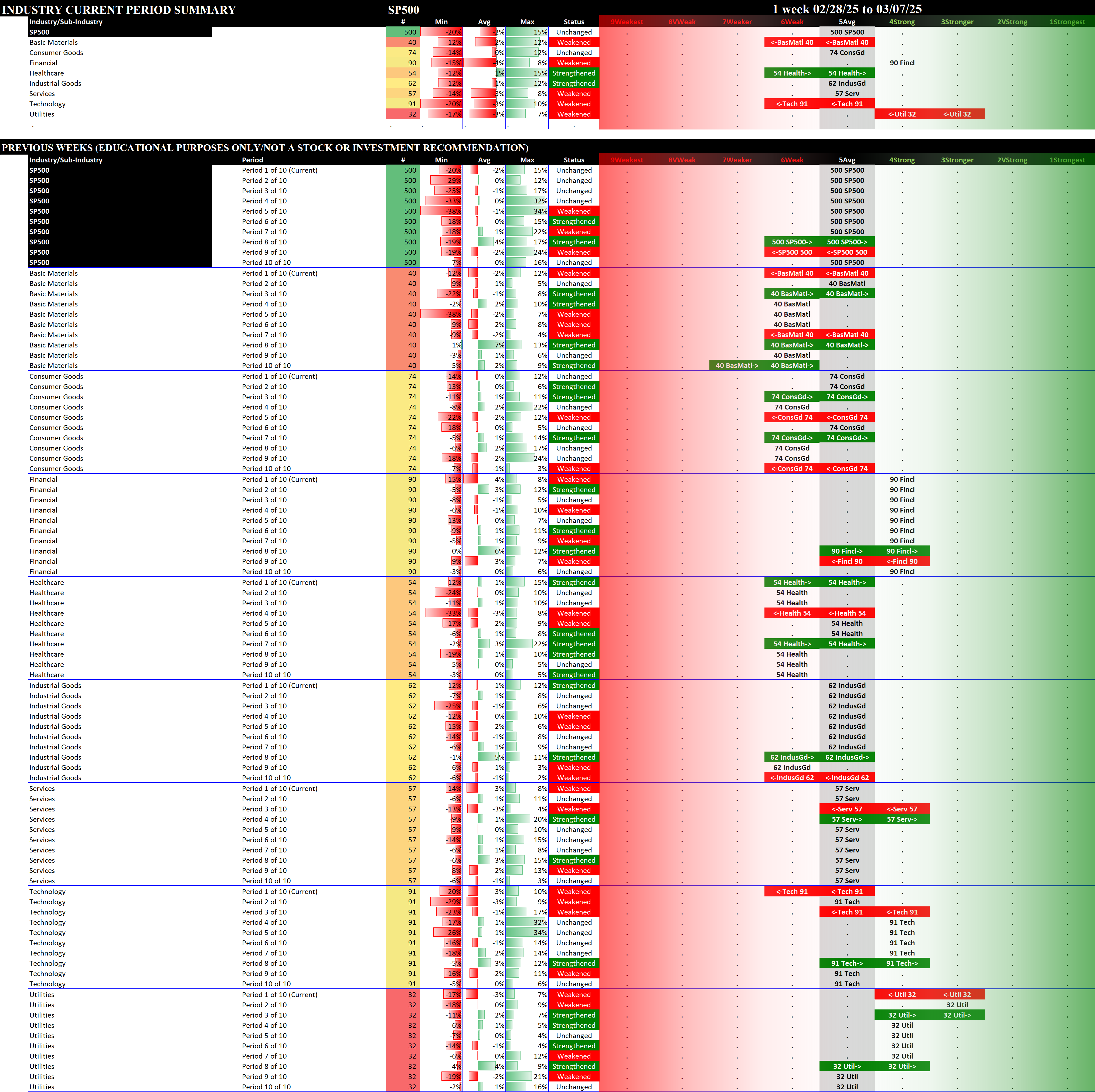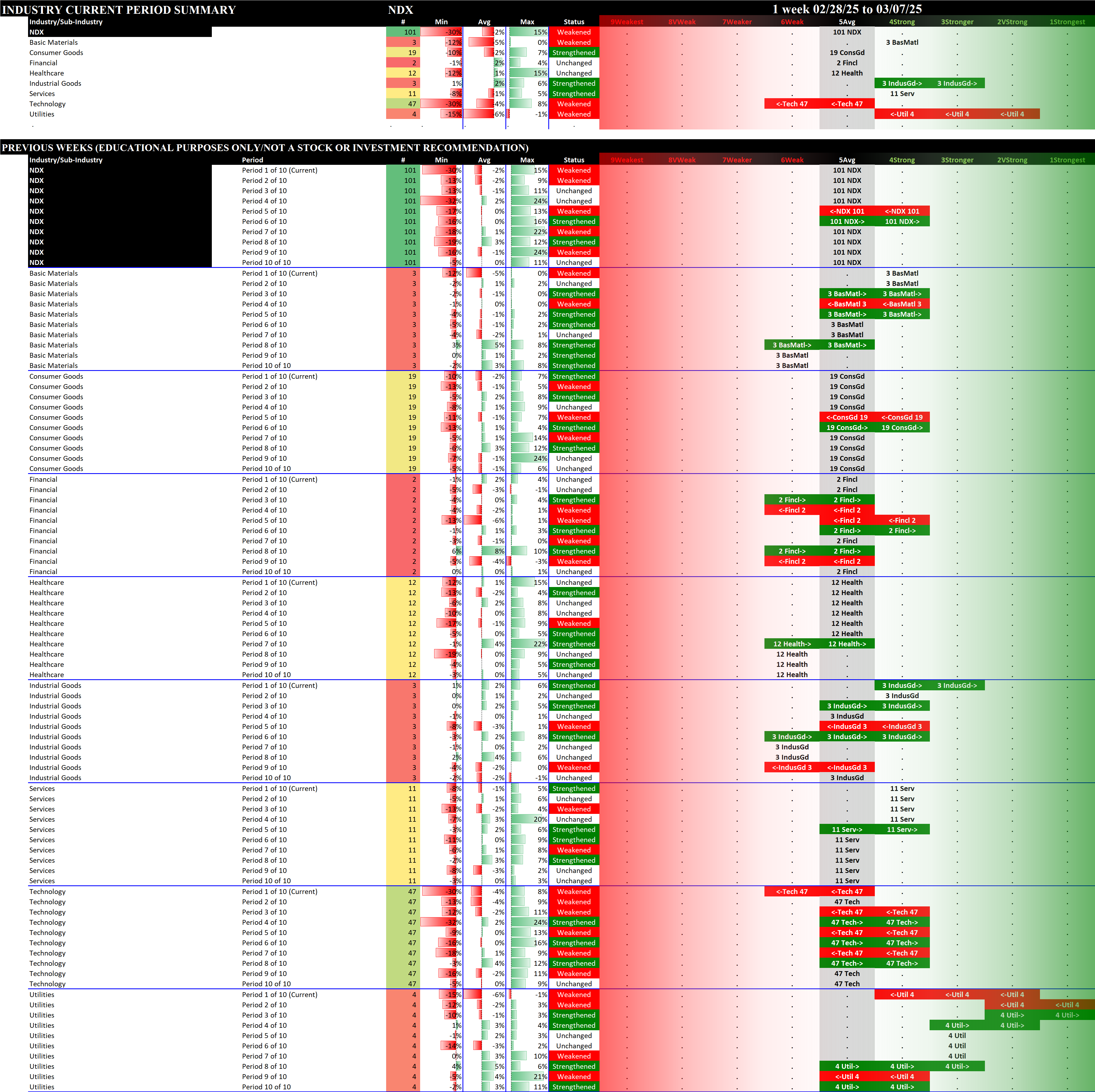 This analysis provides a Stock Market Organizer summary view of the S&P 500 and Nasdaq 100 for the week ended Friday, 03/07/25. This means this is a stock-by-stock strength analysis of the component stocks for each index, aggregated upward in level to the sector and index levels.