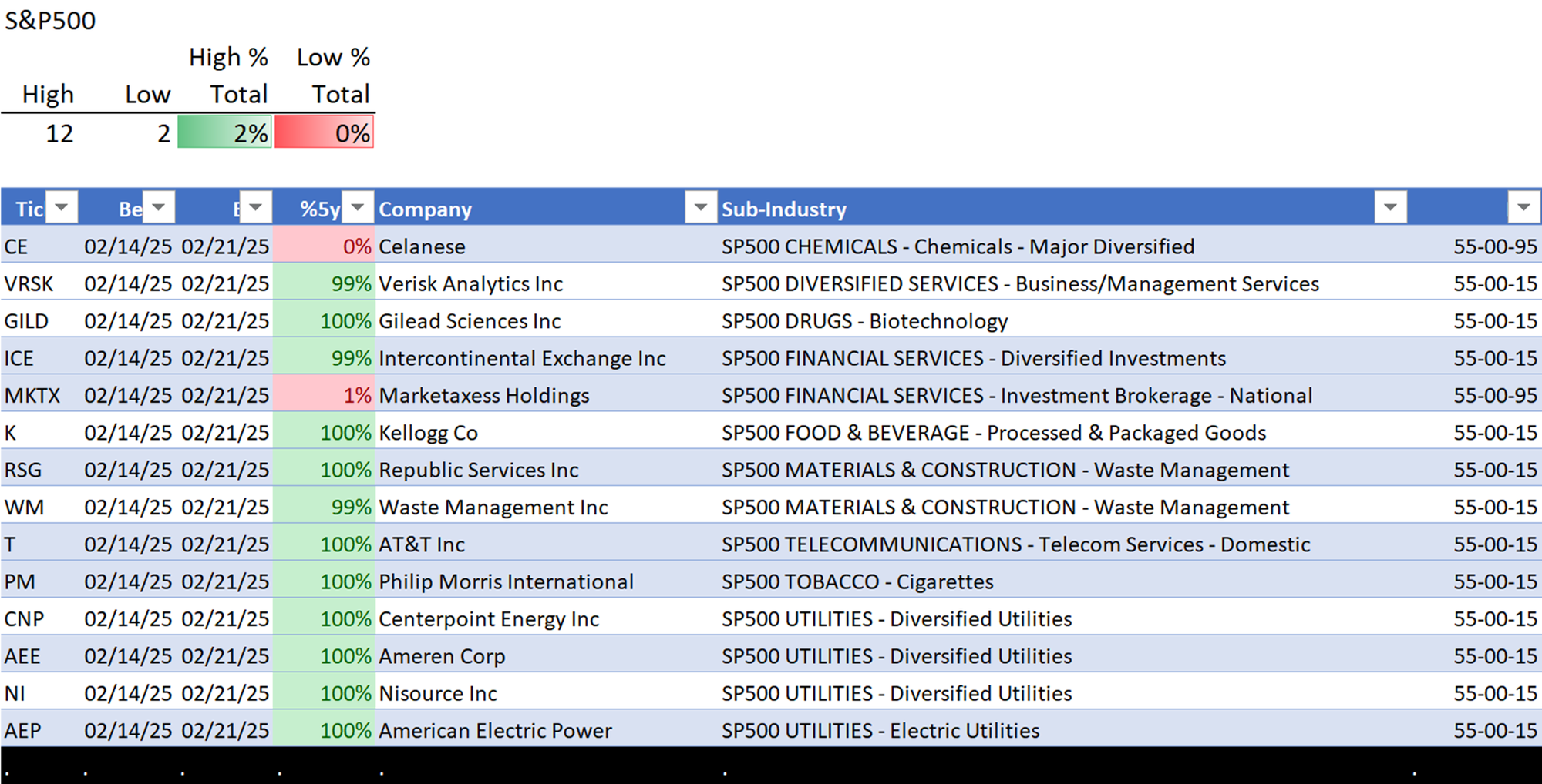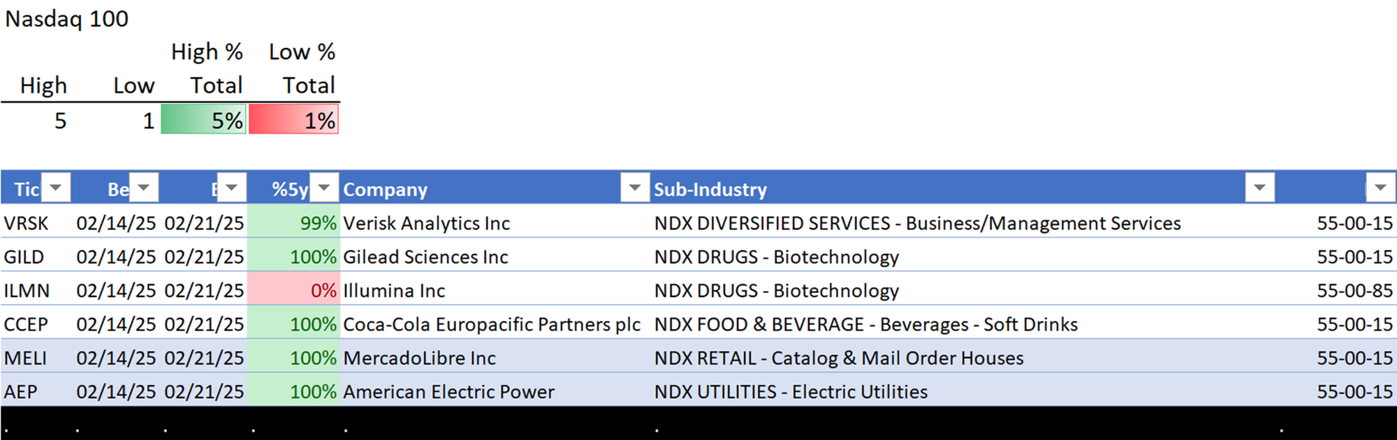 For the week ending Friday, February 21, 2025 there were 12 multi-year highs and 2 multi-year lows for the S&P500. The Nasdaq 100 had a ratio of 5:1.