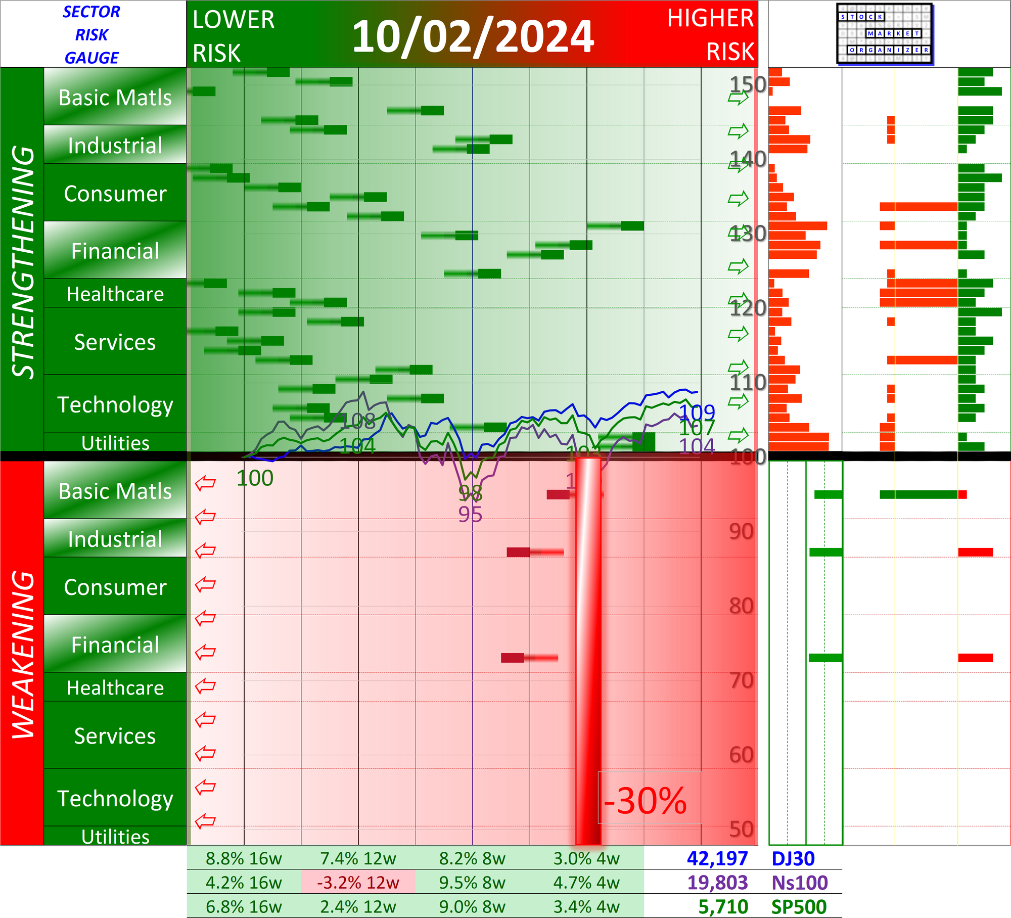 Current 2024-10-02 Sector Risk Gauge, indicative of a -30% Market Strength Score. The underlying objectively measured change depends on the strengthening and weakening of the component industries and sectors.