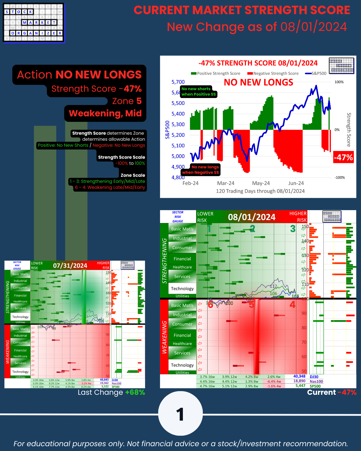 If anything, the market is dynamic and while it’s OK to be wrong, it’s not OK to stay wrong. U.S. Stock Market status change as of 2024-08-01: NO NEW LONGS per the exclusive Stock Market Organizer objectively calculated NEGATIVE Market Strength Score (-47%, scale is -100% to 100%).