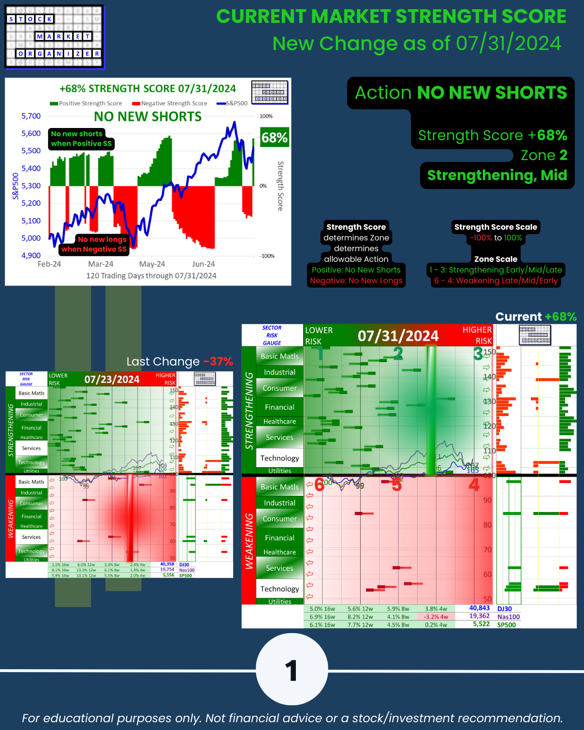 U.S. Stock Market status change as of 2024-07-31, NO NEW SHORTS per the exclusive Stock Market Organizer objectively calculated POSITIVE Market Strength Score (+68%, scale is -100% to 100%).