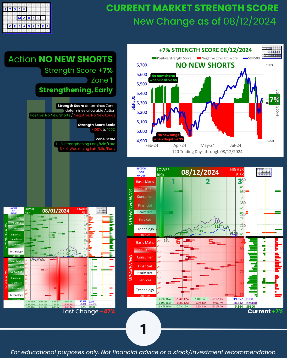 U.S. Stock Market status change as of 2024-08-12: NO NEW SHORTS per the exclusive Stock Market Organizer objectively calculated POSITIVE Market Strength Score (+7%, scale is -100% to 100%).