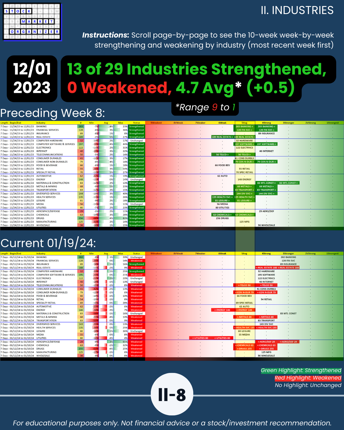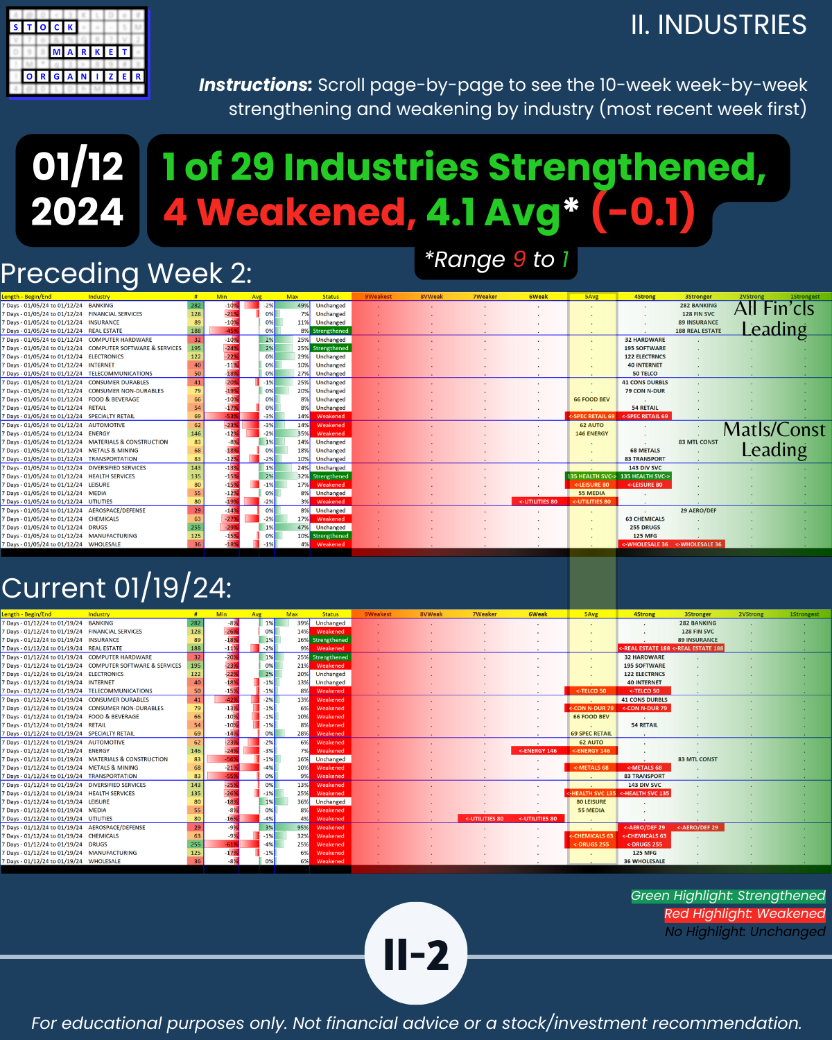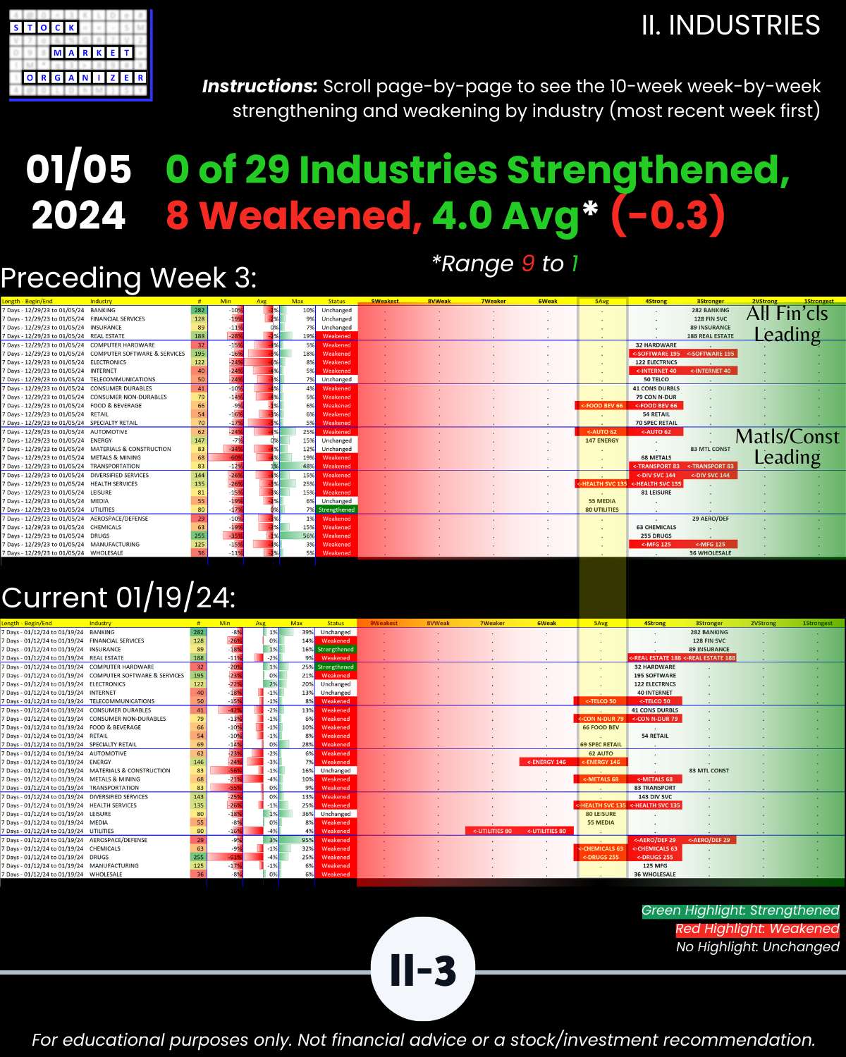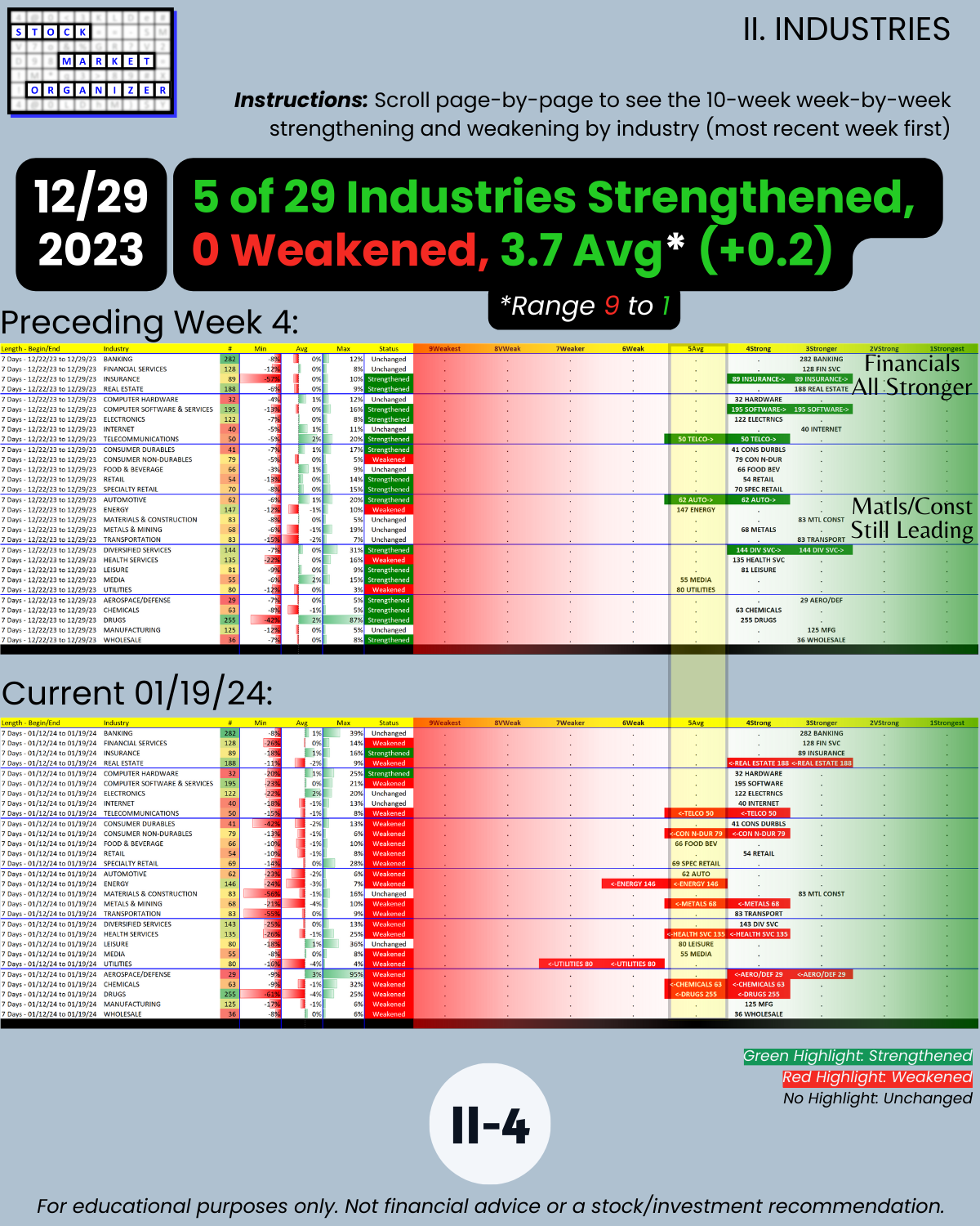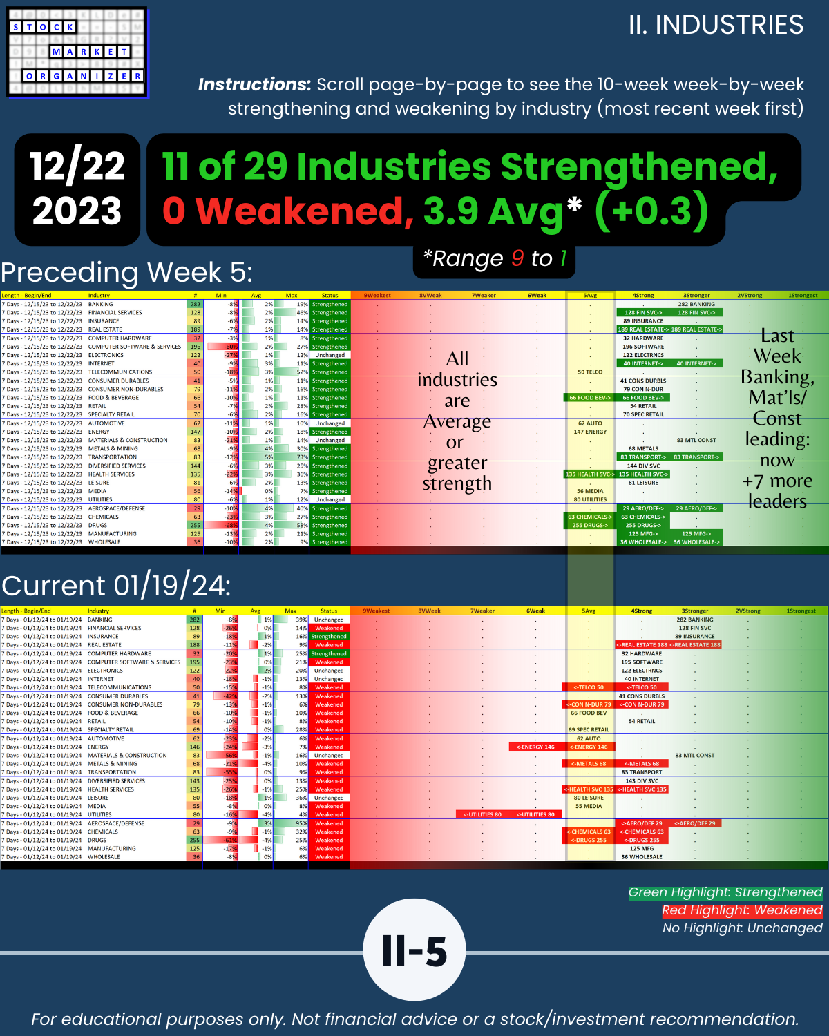 🔹 12/29/23 = 12 industries rated Stronger (3rd strongest of 9 levels), 1/19/24 = 4