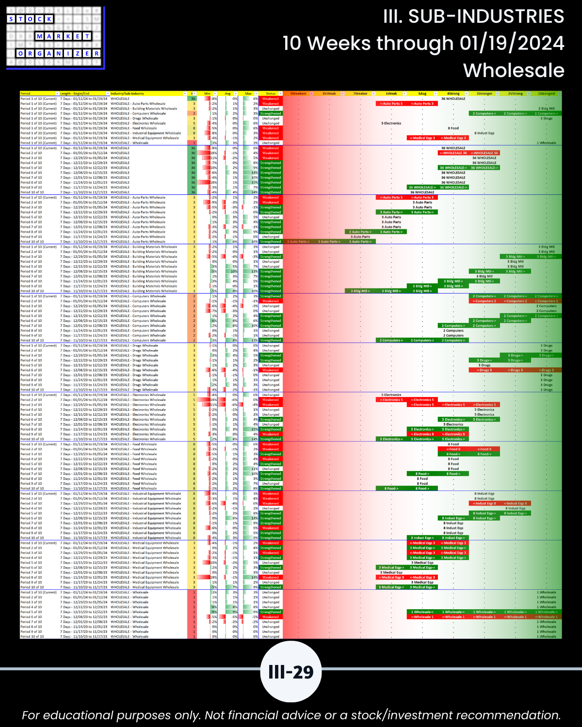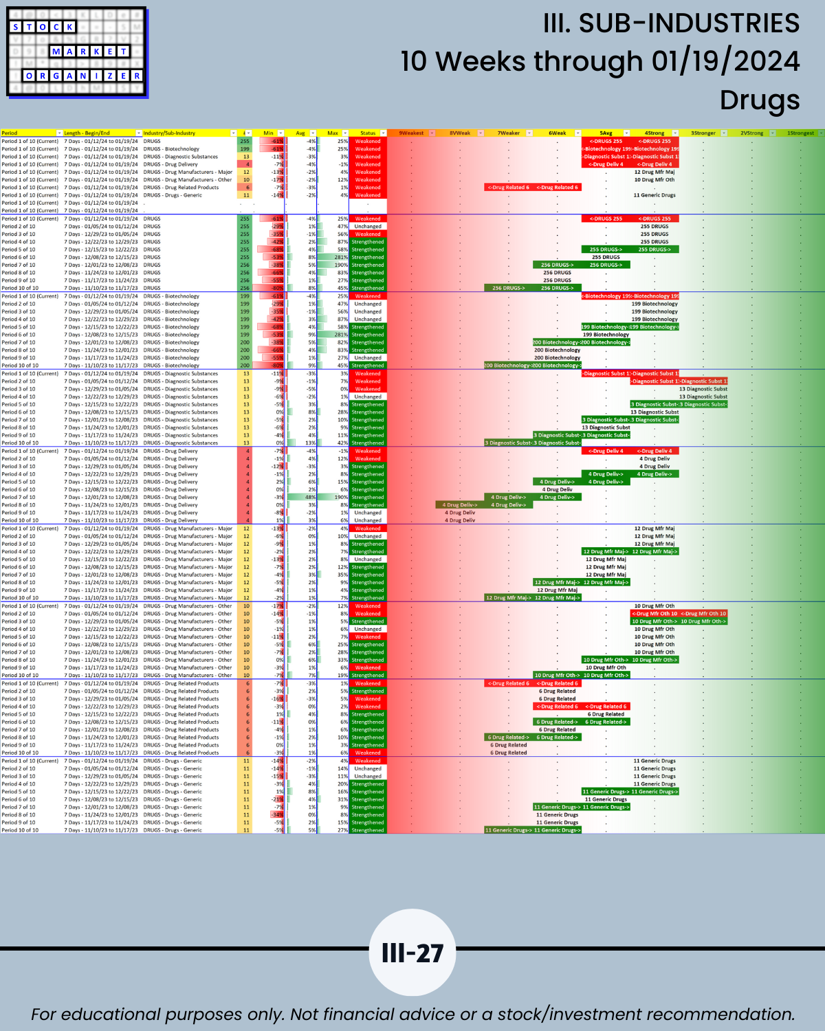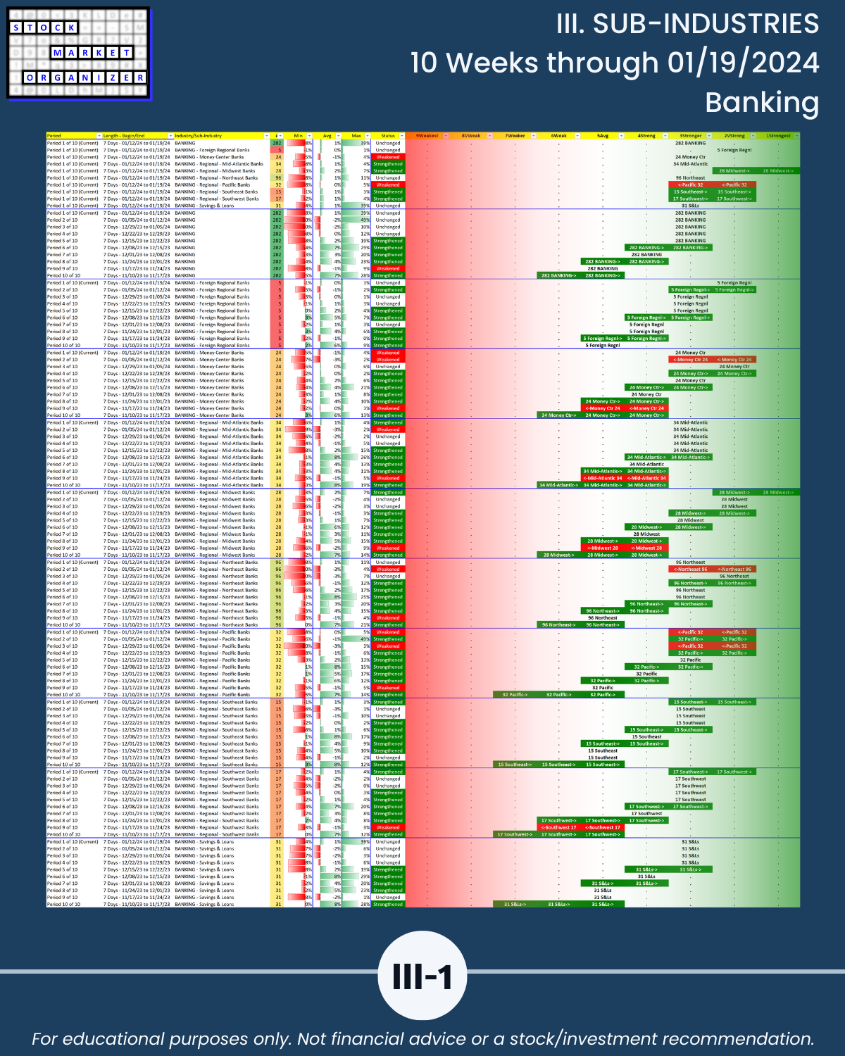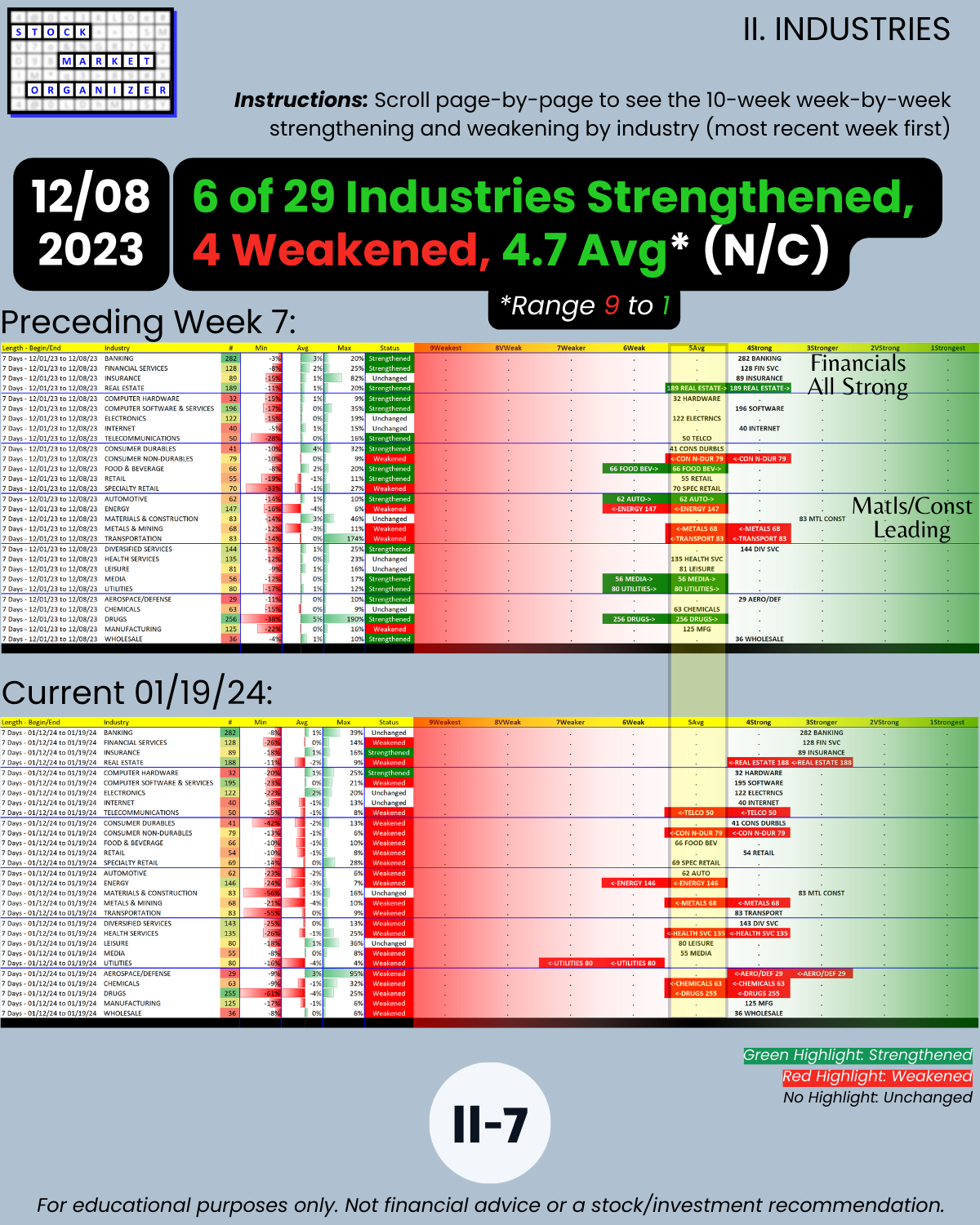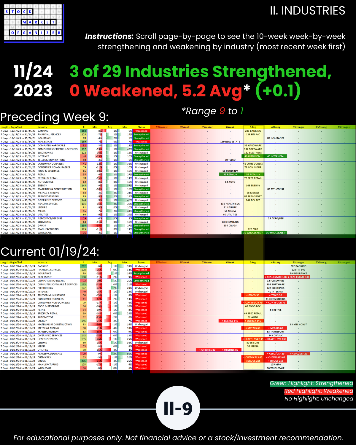🔹 12/29/23 = 12 industries rated Stronger (3rd strongest of 9 levels), 1/19/24 = 4