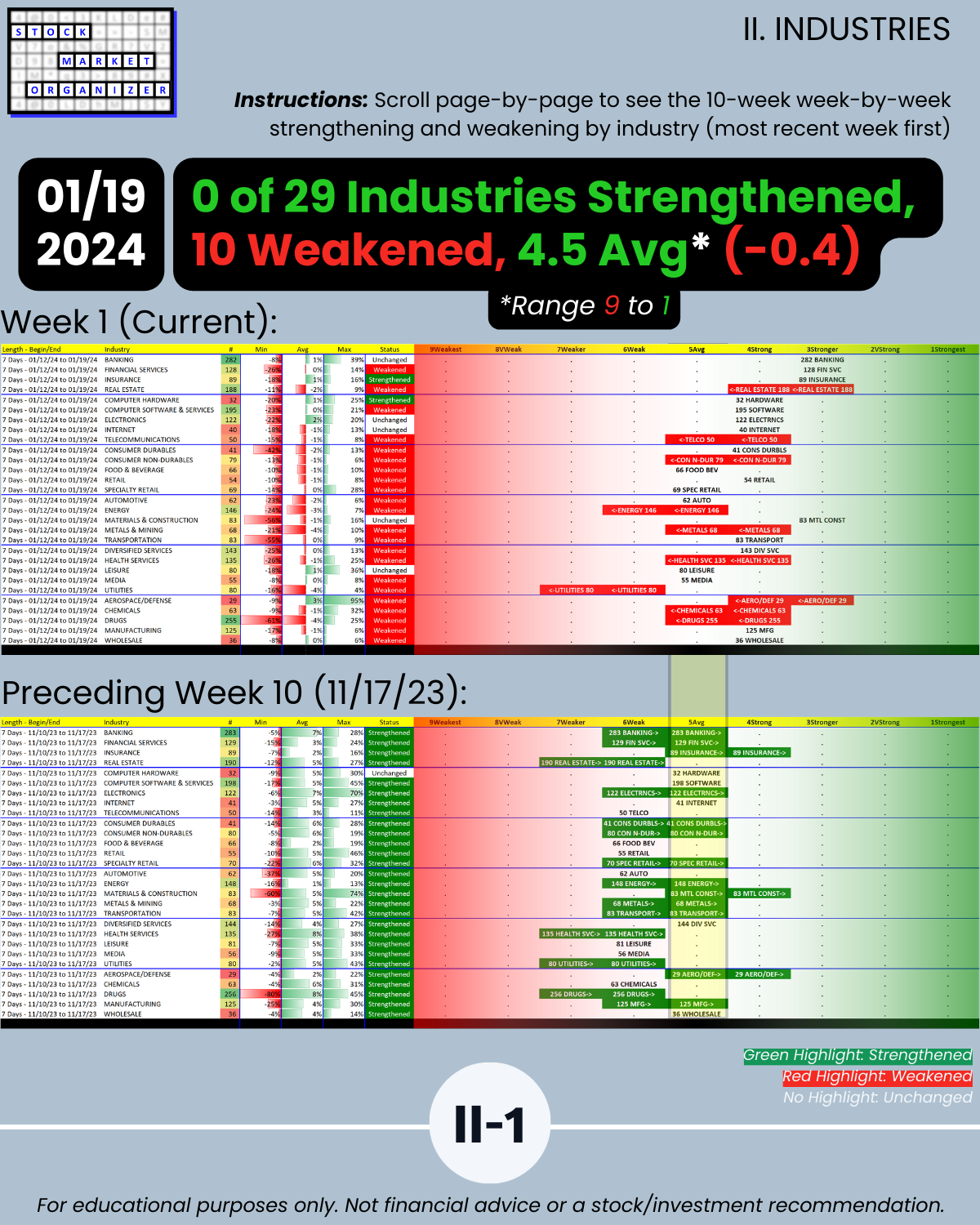 🔹 10 of 29 industries weakened and 0 strengthened last week