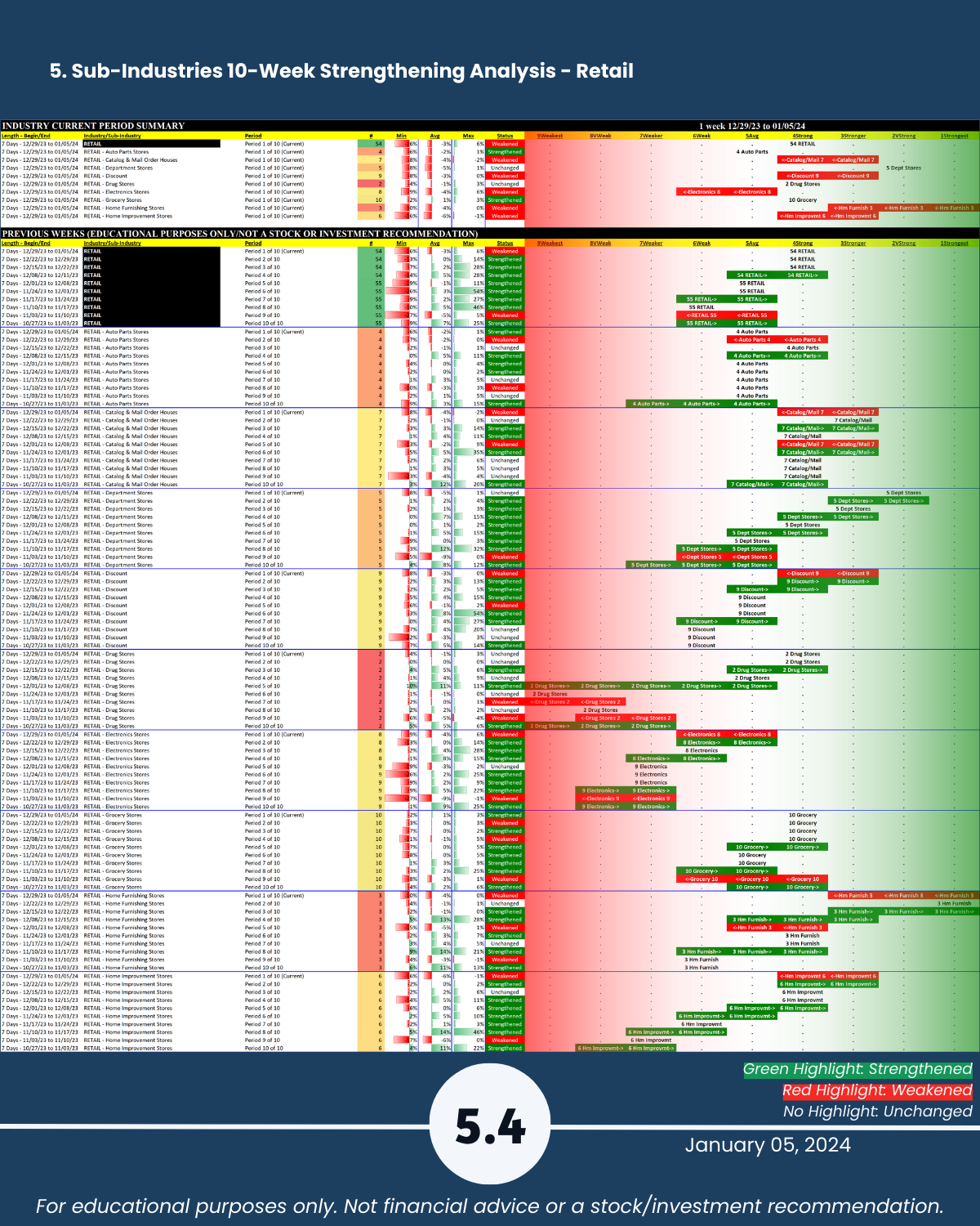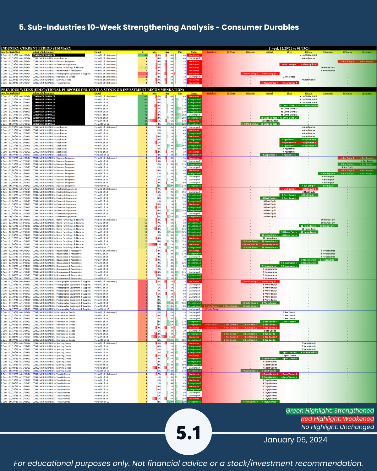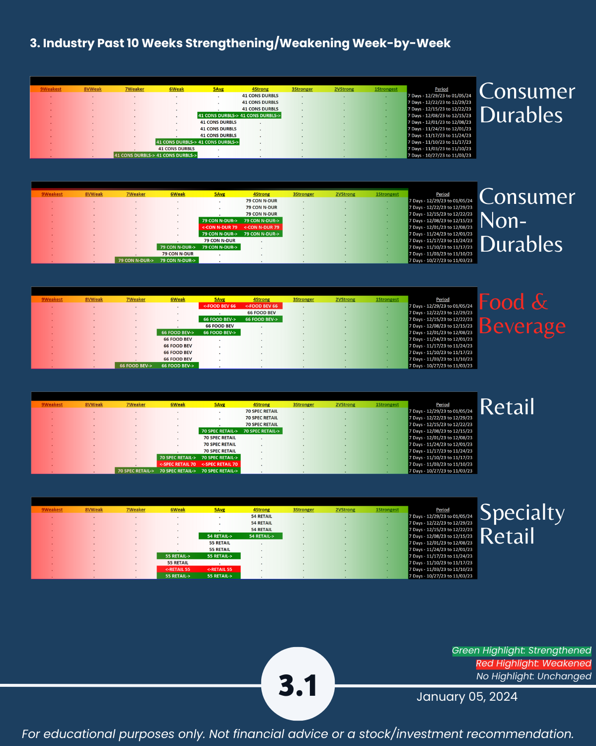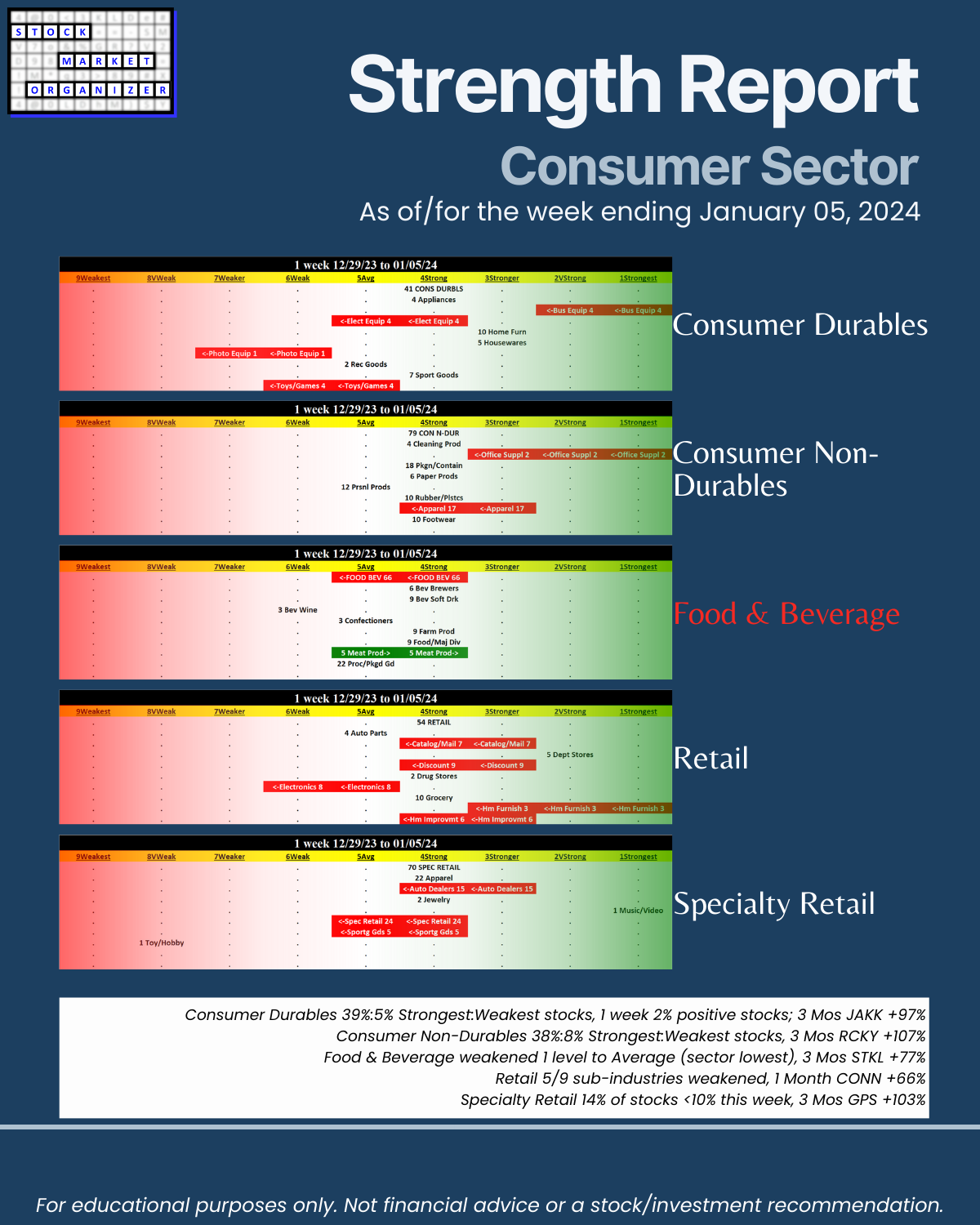 Are you curious as to exactly what is happening in the Consumer sector? See attached. Following up this 1/2/24 market report, this Consumer sector report takes you through an objective analysis of strengthening and weakening in the five component Consumer industries (Consumer Durables, Consumer Non-durables, Food & Beverage, Retail, and Specialty Retail).