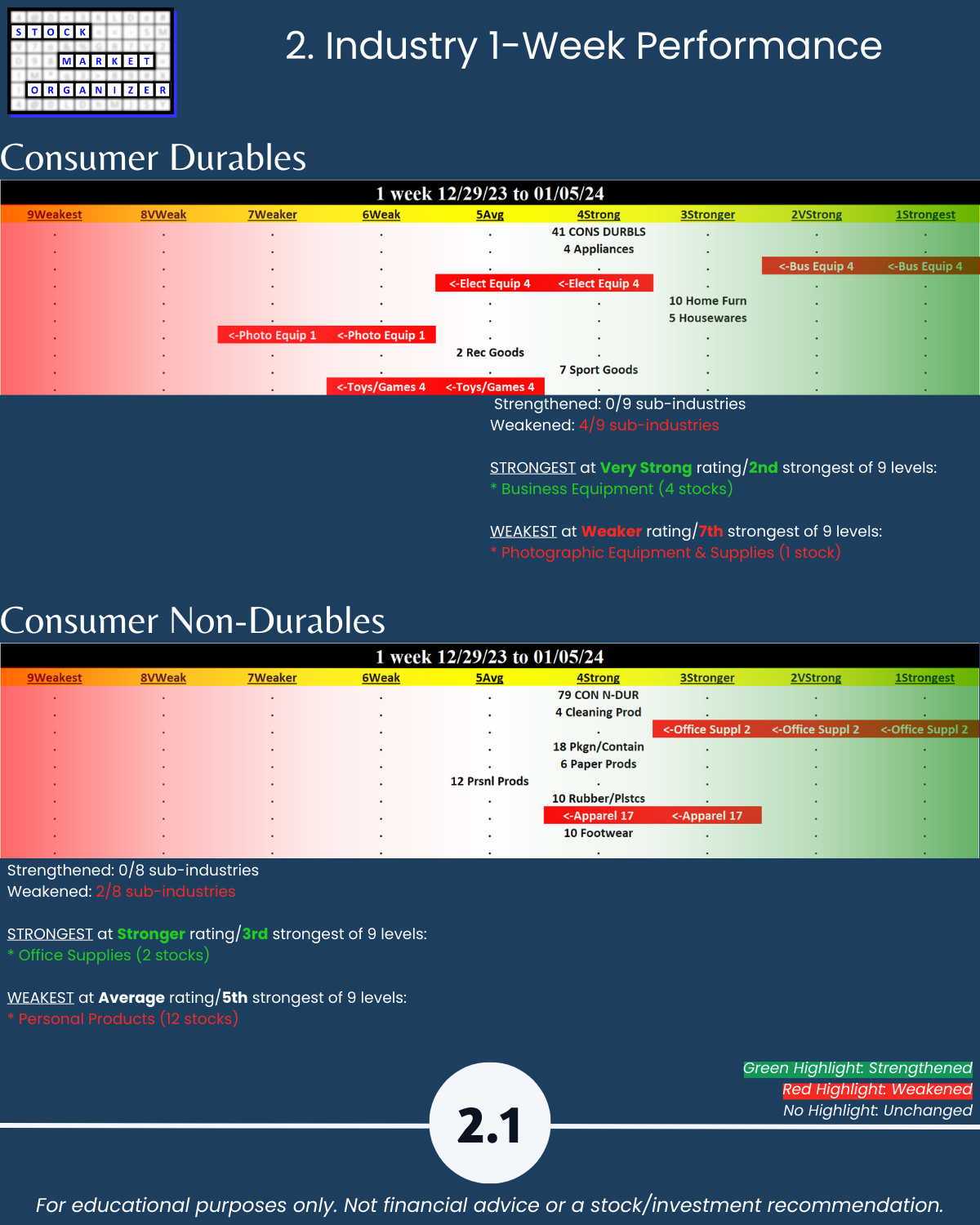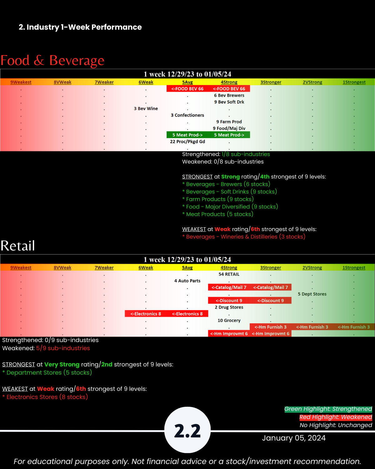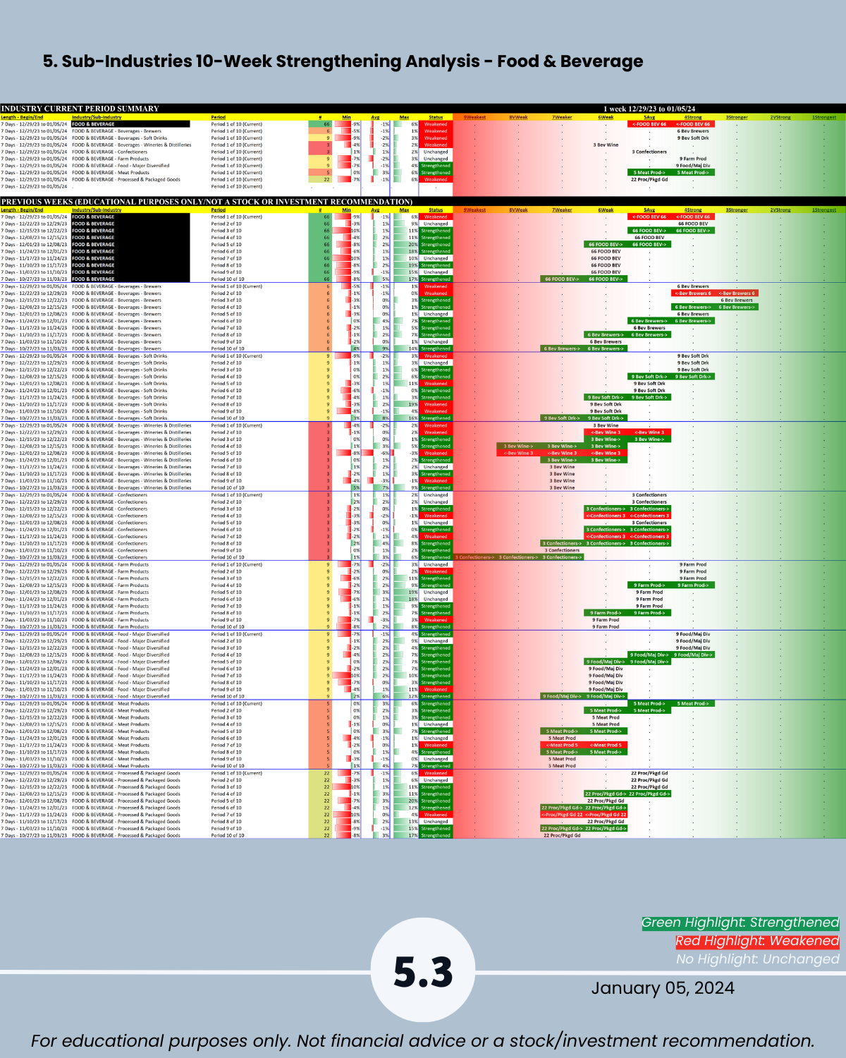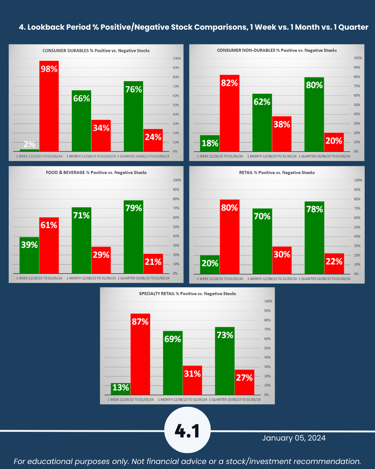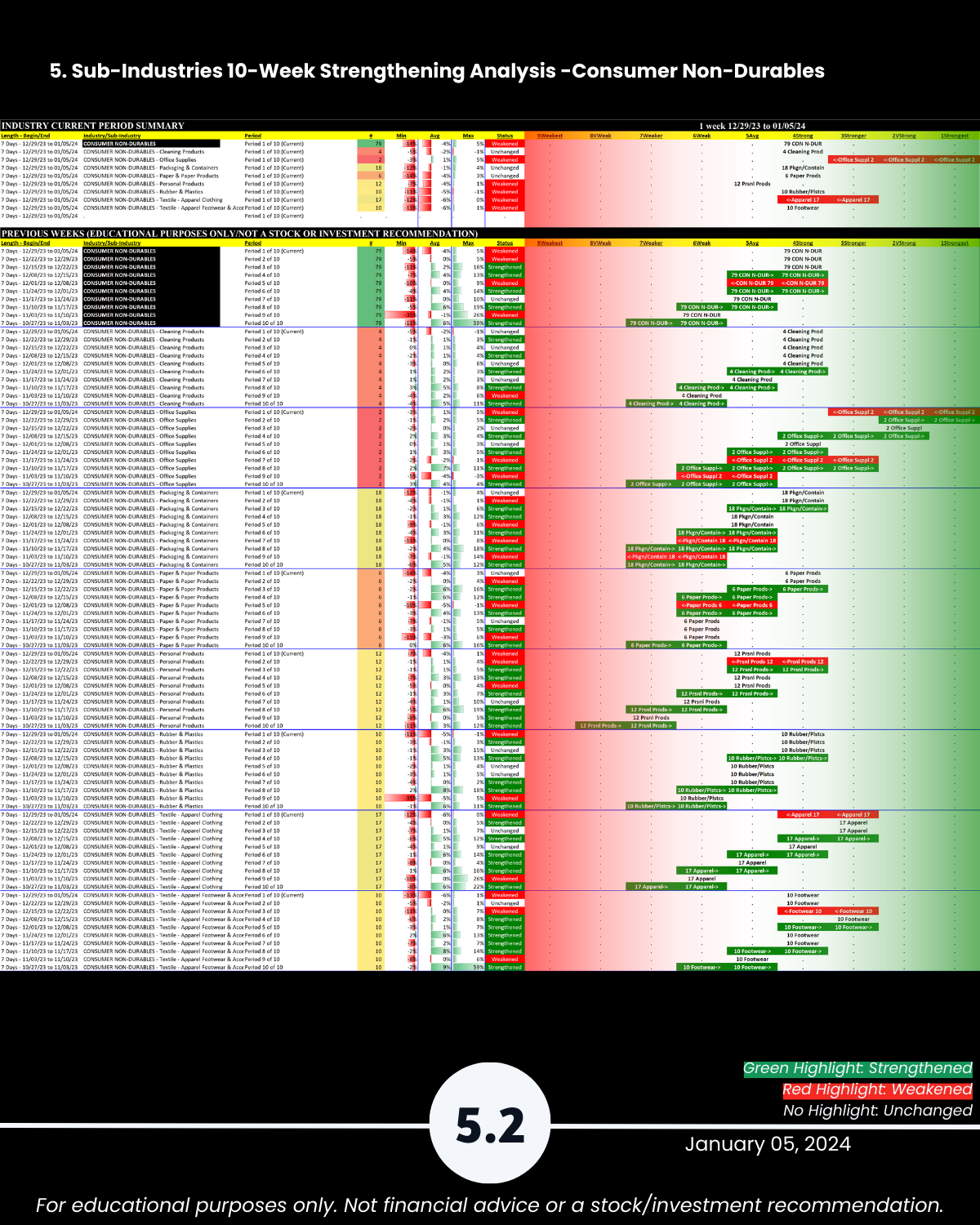 Are you curious as to exactly what is happening in the Consumer sector? See attached. Following up this 1/2/24 market report, this Consumer sector report takes you through an objective analysis of strengthening and weakening in the five component Consumer industries (Consumer Durables, Consumer Non-durables, Food & Beverage, Retail, and Specialty Retail).