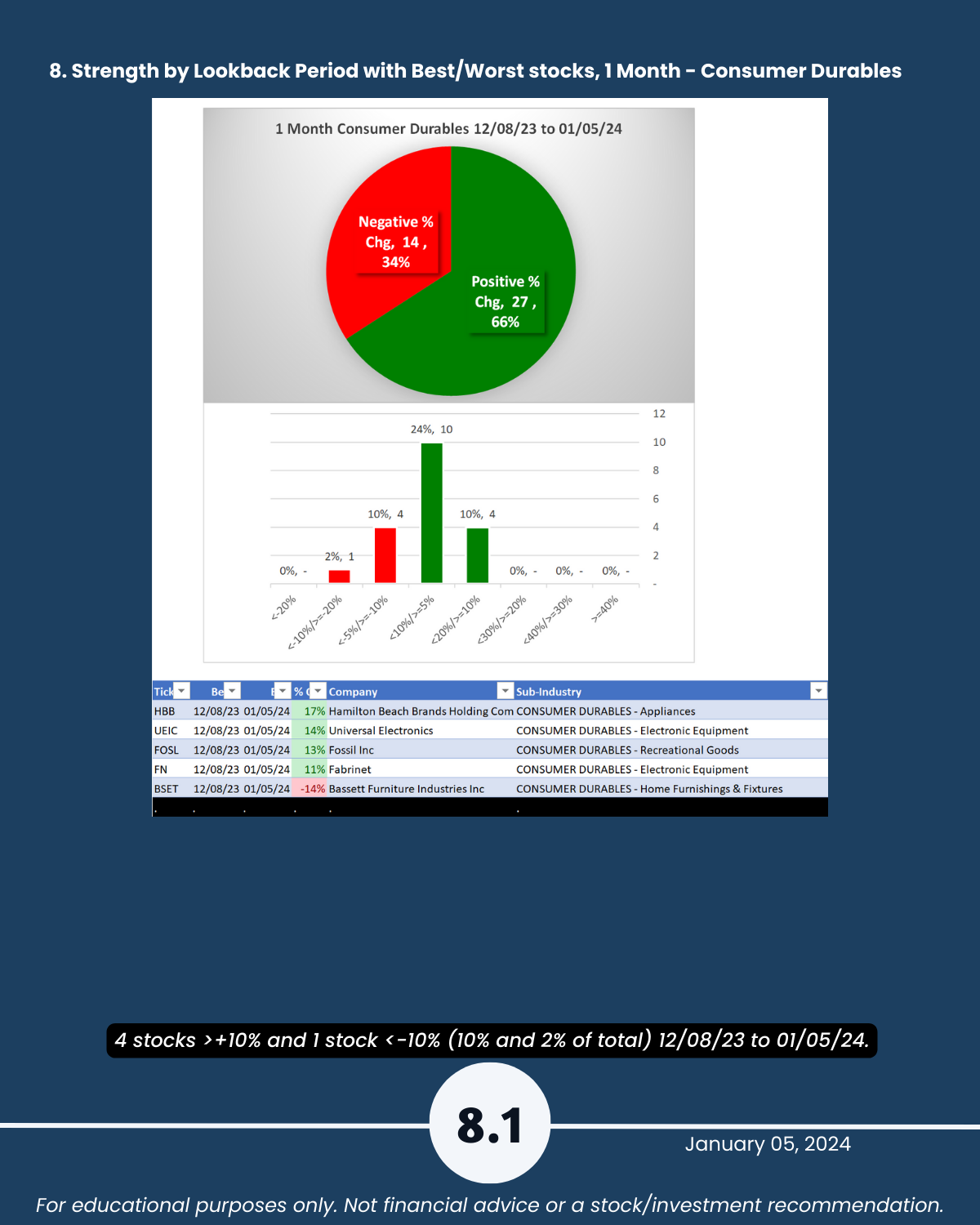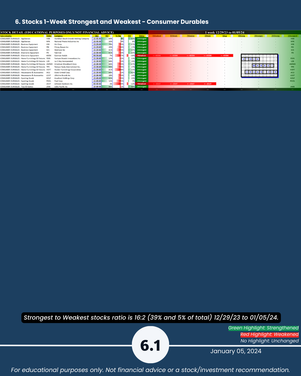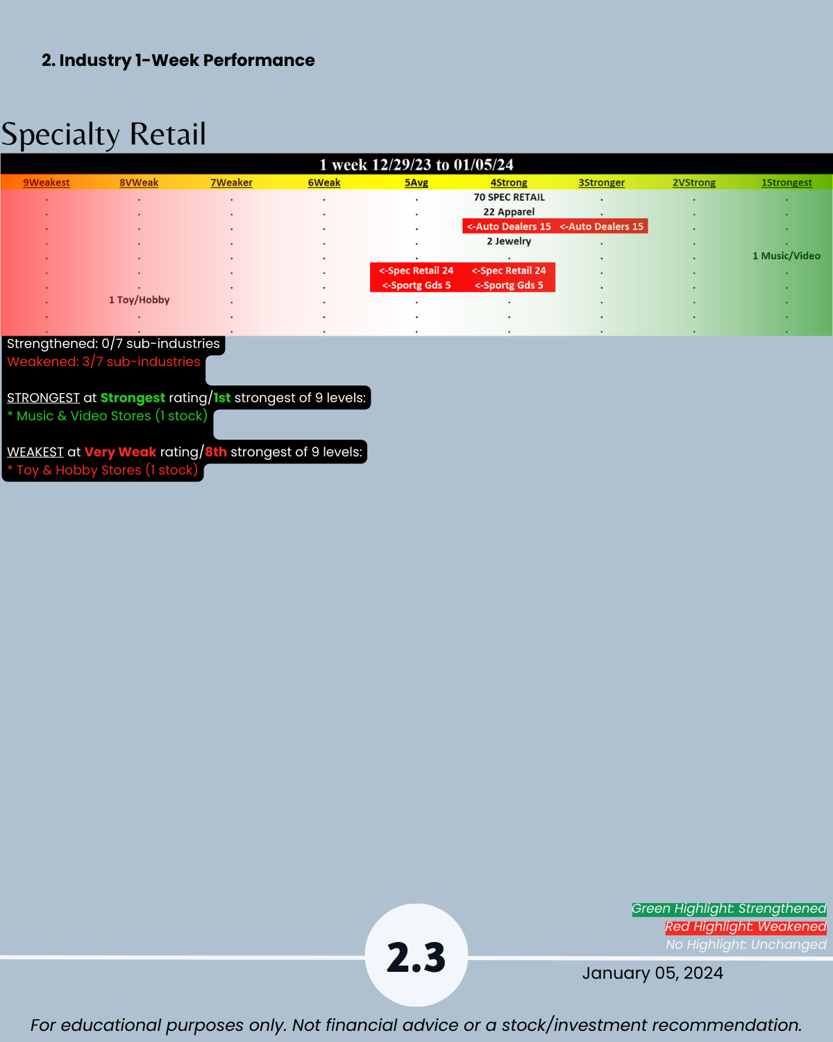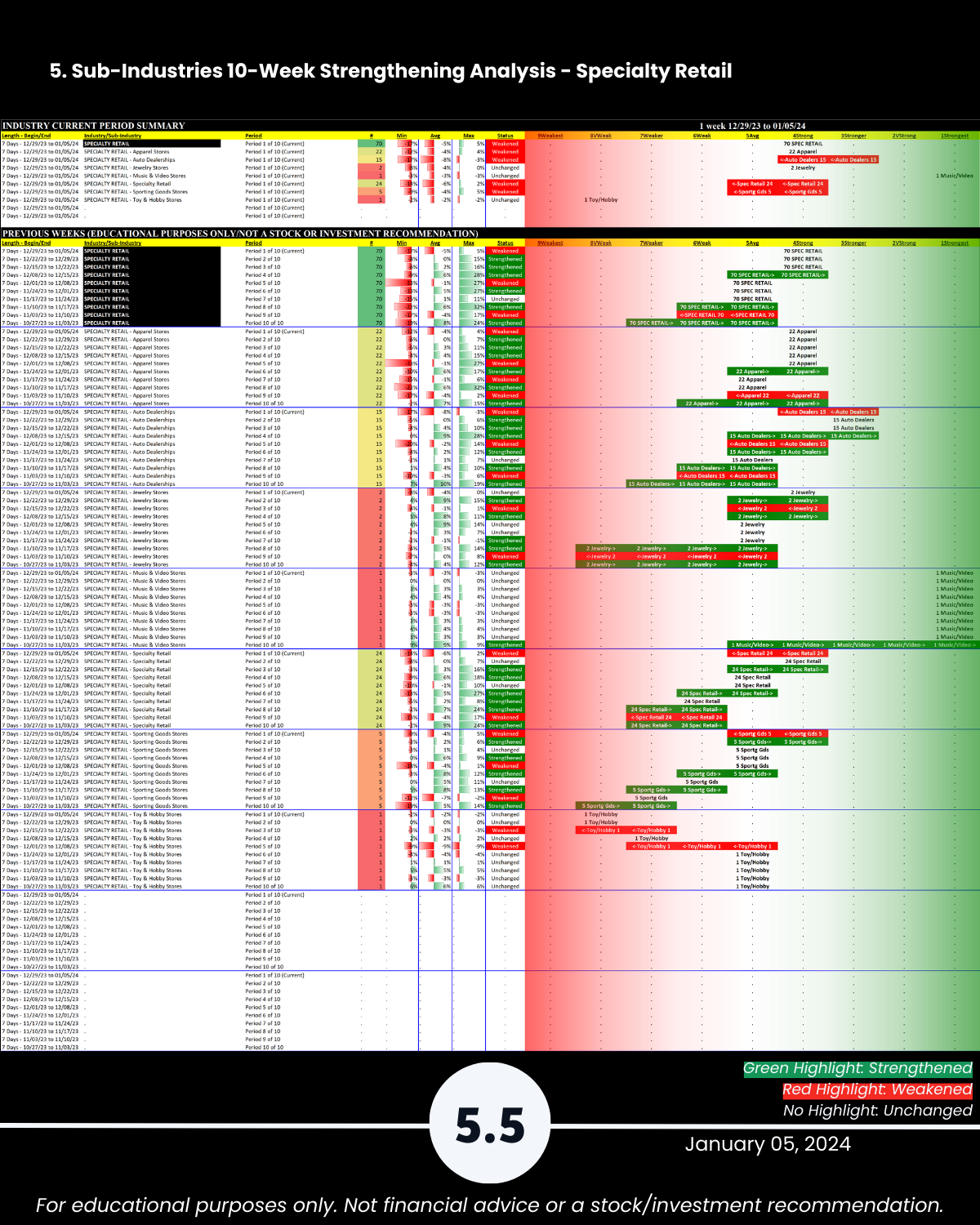 Are you curious as to exactly what is happening in the Consumer sector? See attached. Following up this 1/2/24 market report, this Consumer sector report takes you through an objective analysis of strengthening and weakening in the five component Consumer industries (Consumer Durables, Consumer Non-durables, Food & Beverage, Retail, and Specialty Retail).