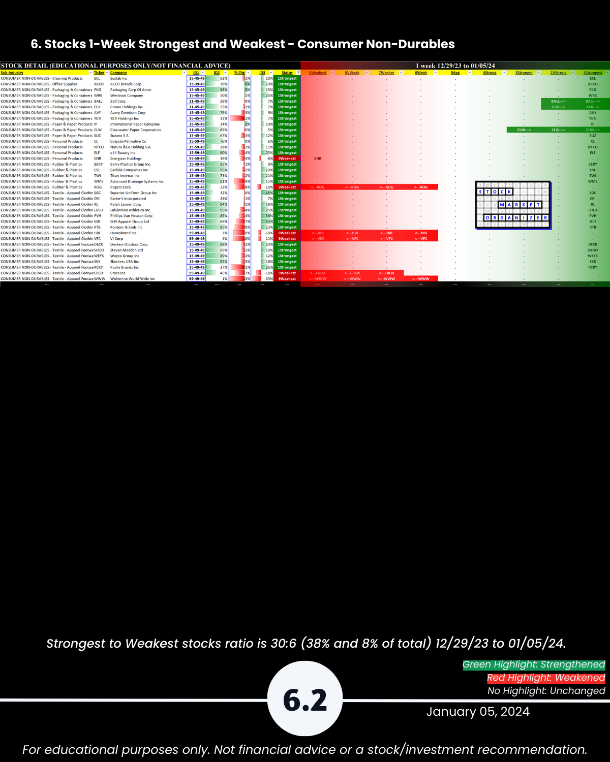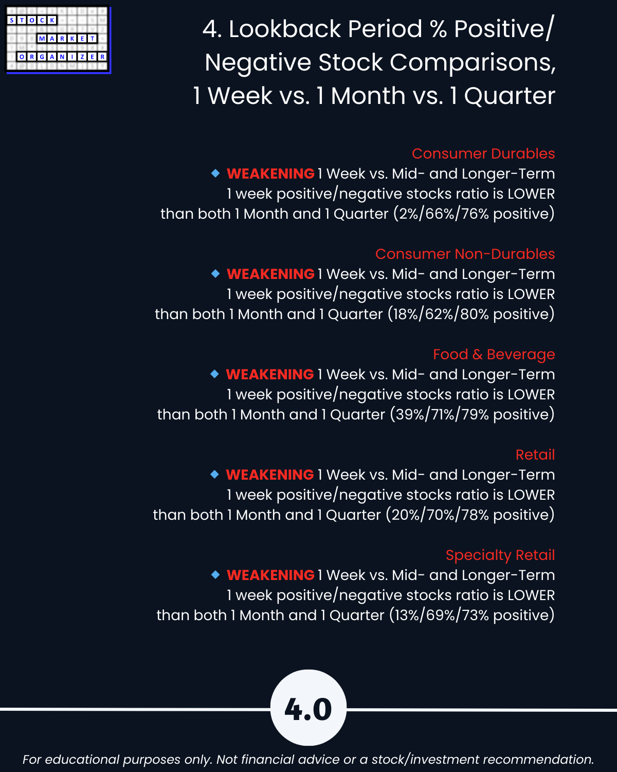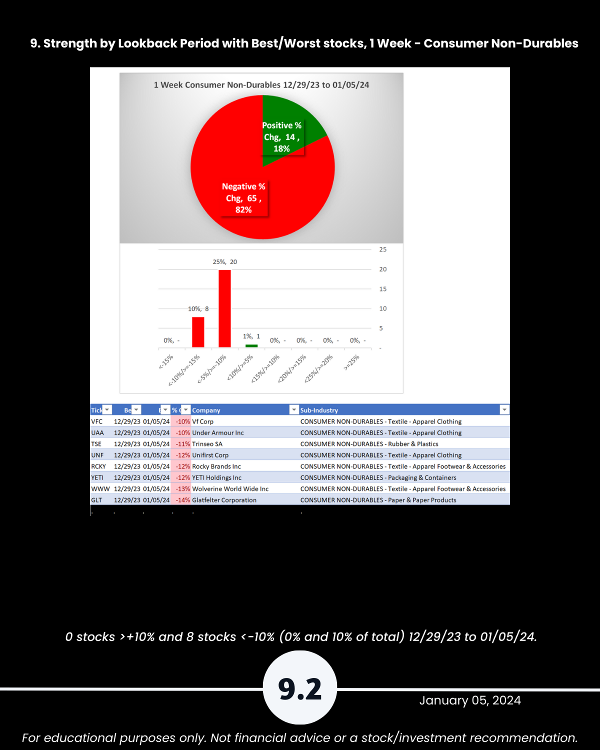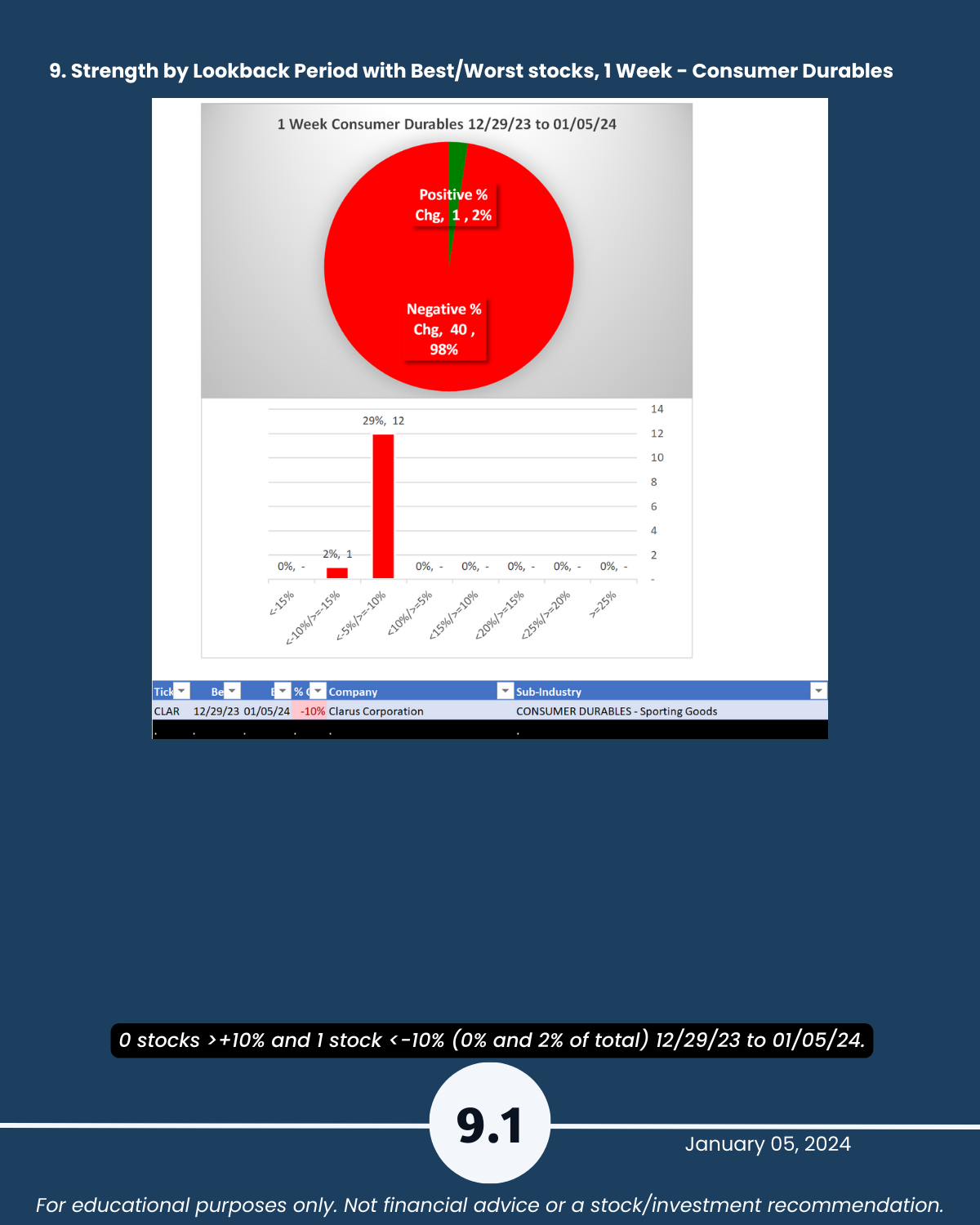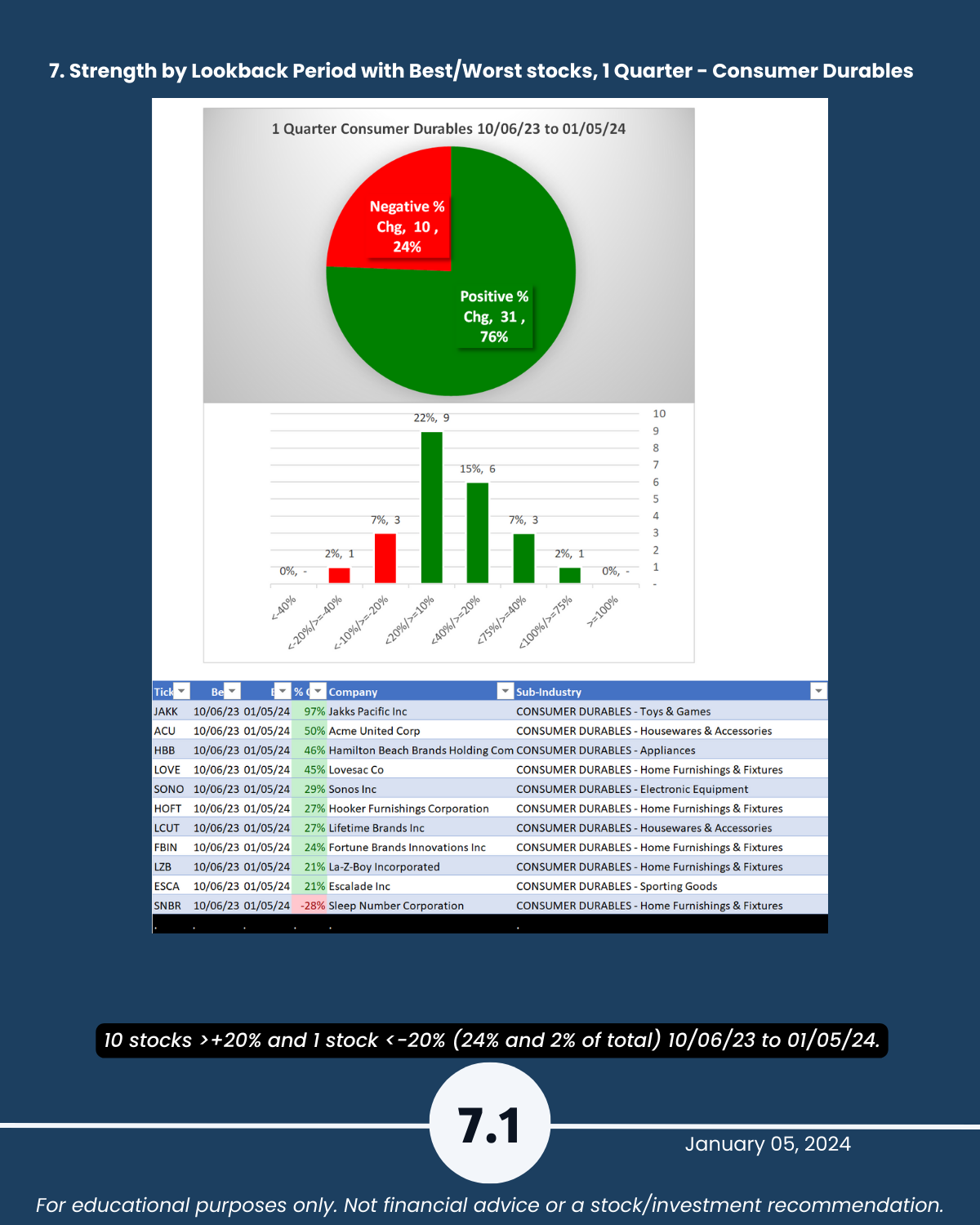 Are you curious as to exactly what is happening in the Consumer sector? See attached. Following up this 1/2/24 market report, this Consumer sector report takes you through an objective analysis of strengthening and weakening in the five component Consumer industries (Consumer Durables, Consumer Non-durables, Food & Beverage, Retail, and Specialty Retail).