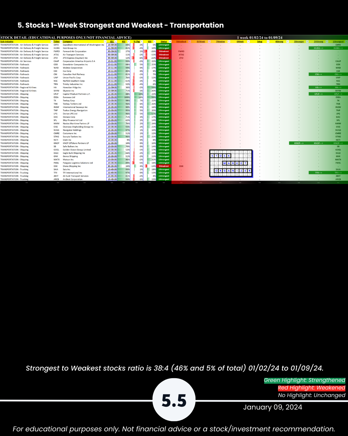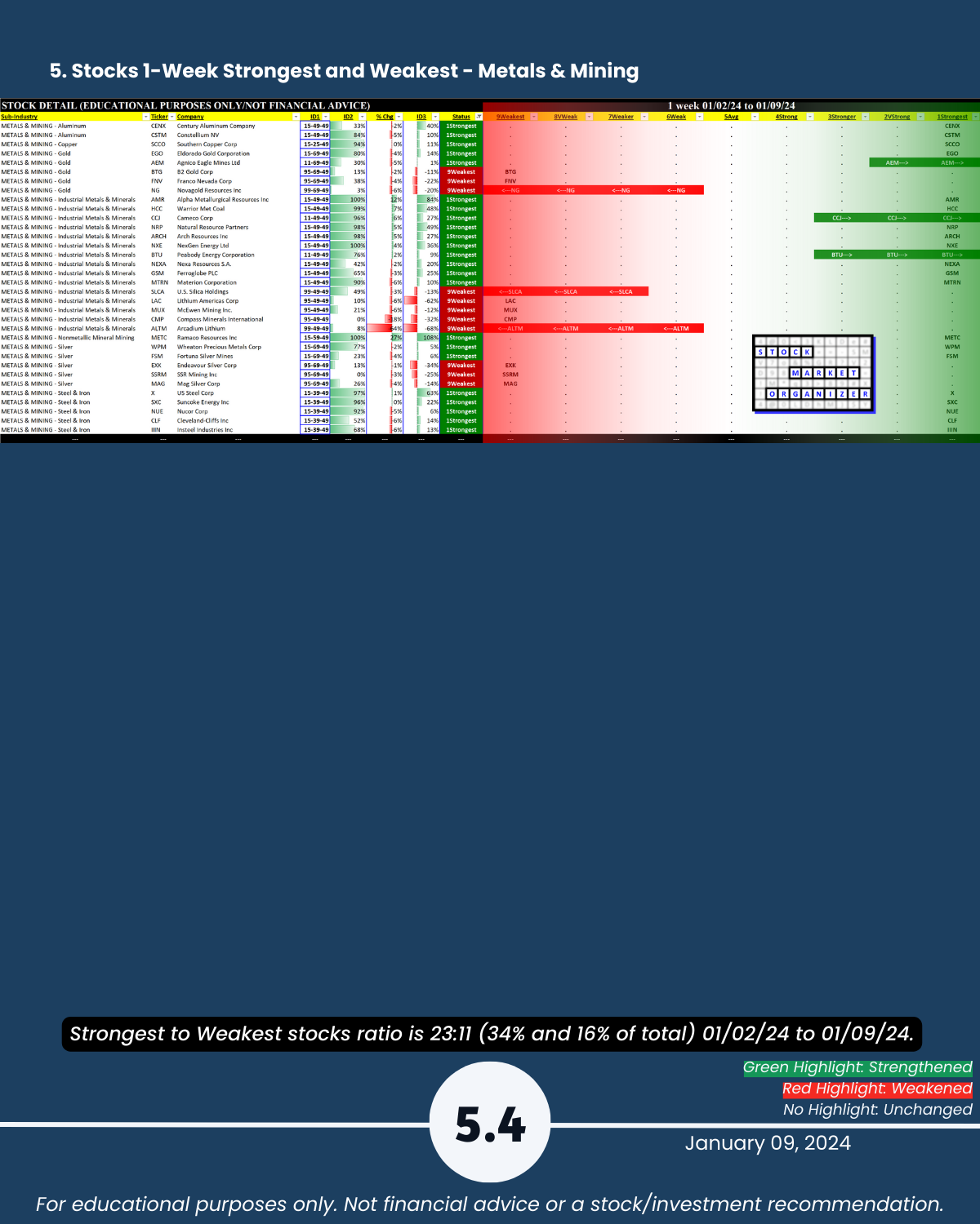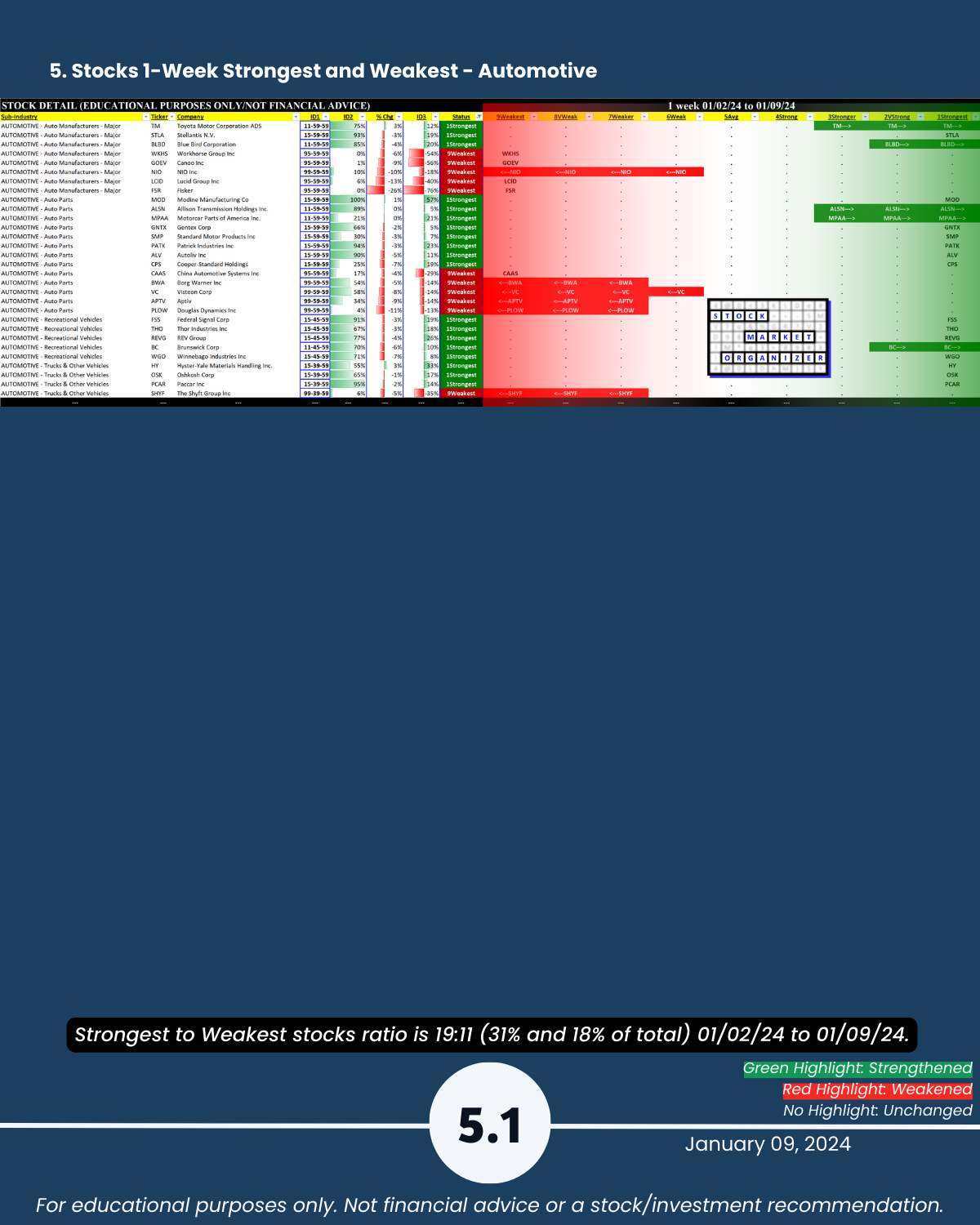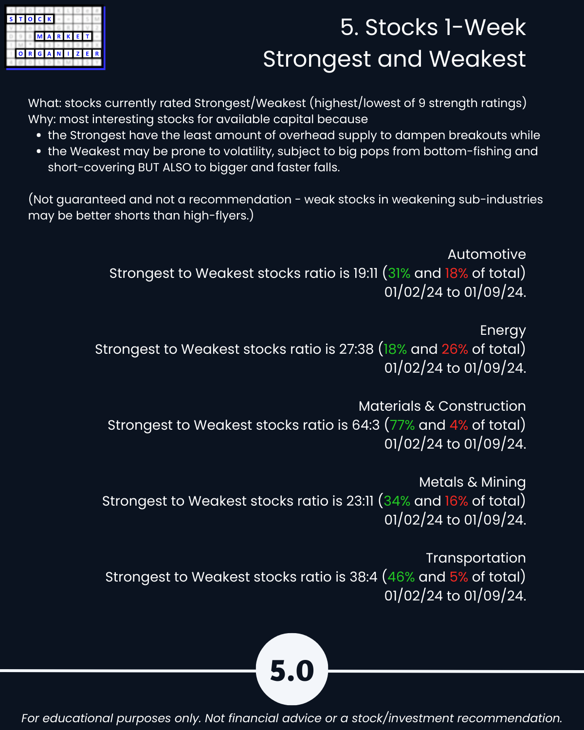 Section 5 lists the strongest and weakest stocks according to Stock Market Organizer ratings.