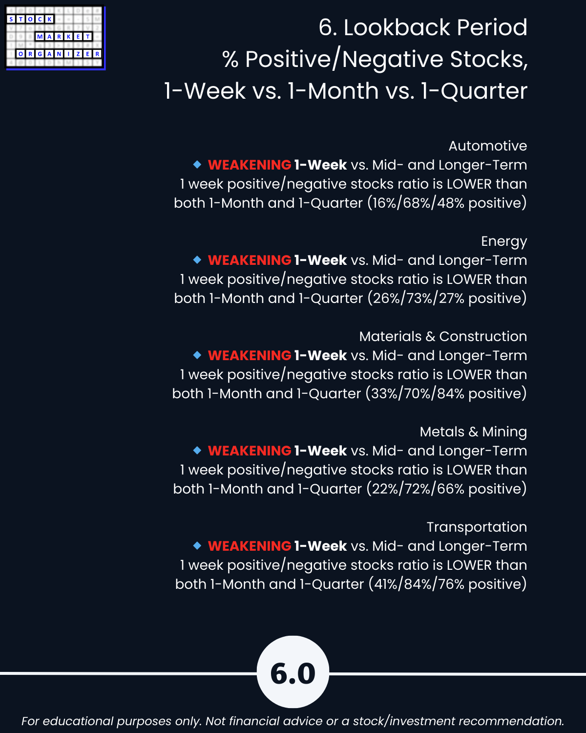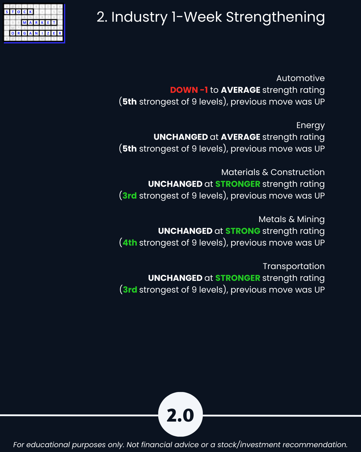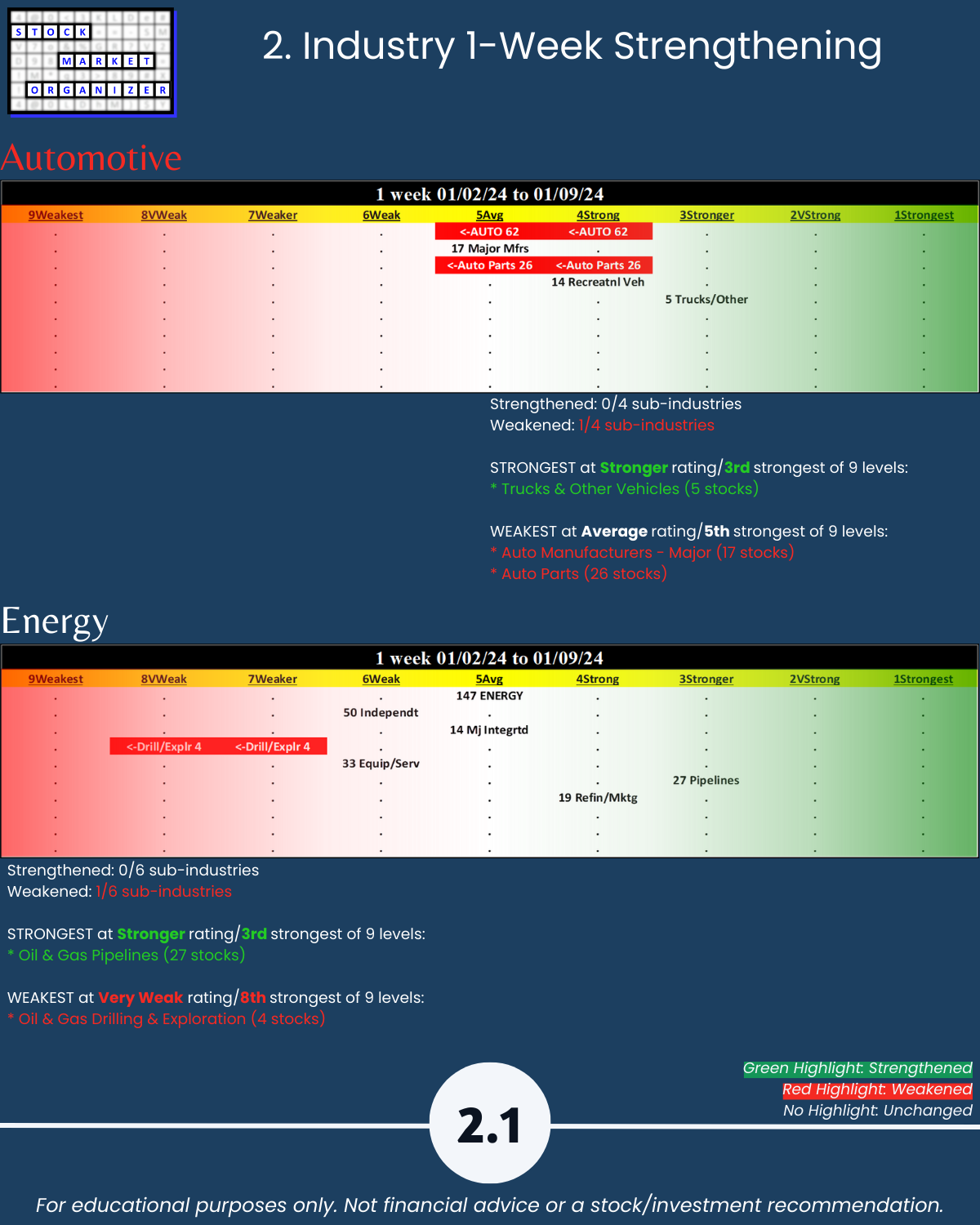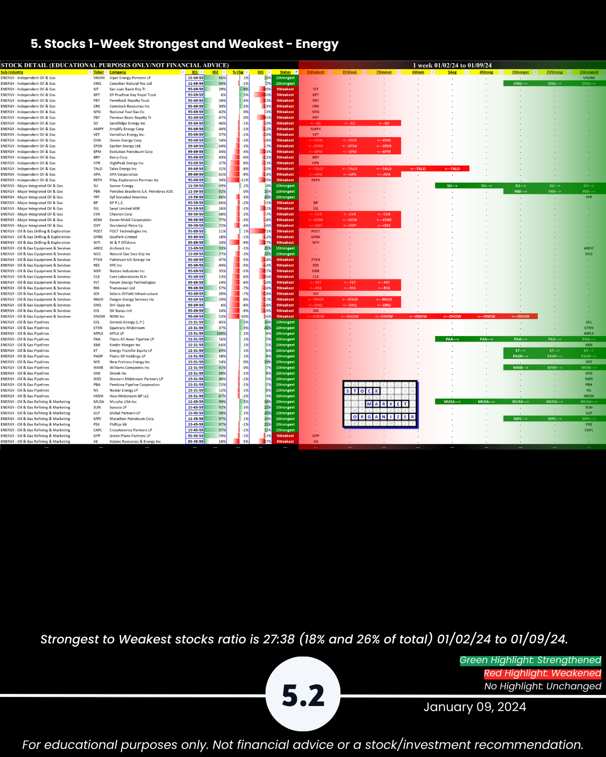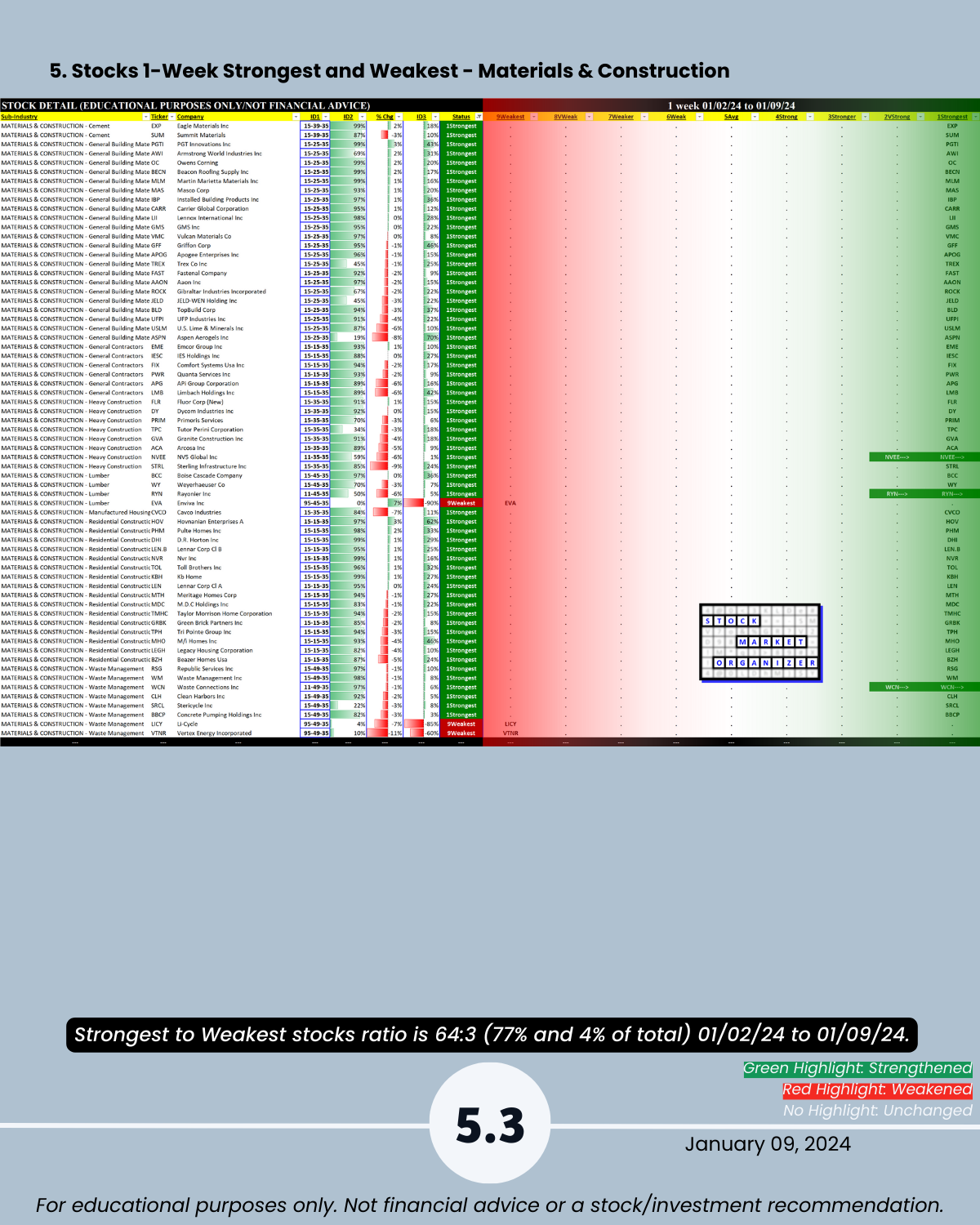 Section 5 lists the strongest and weakest stocks according to Stock Market Organizer ratings.