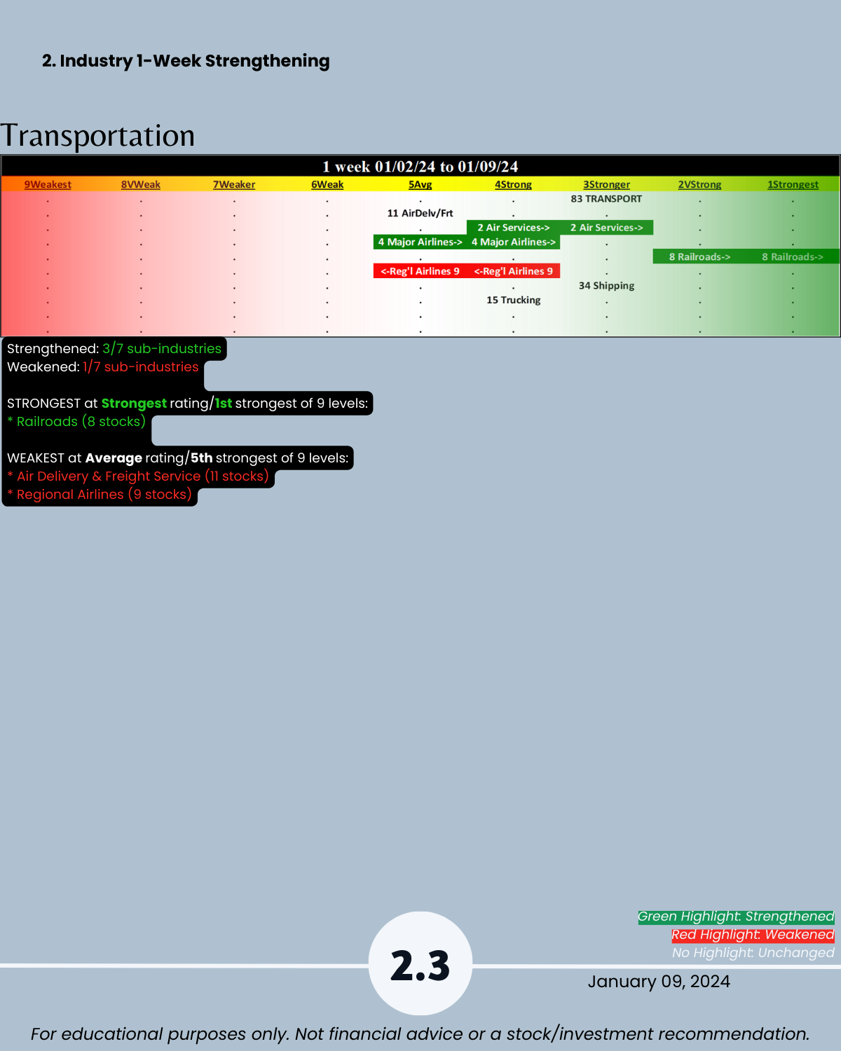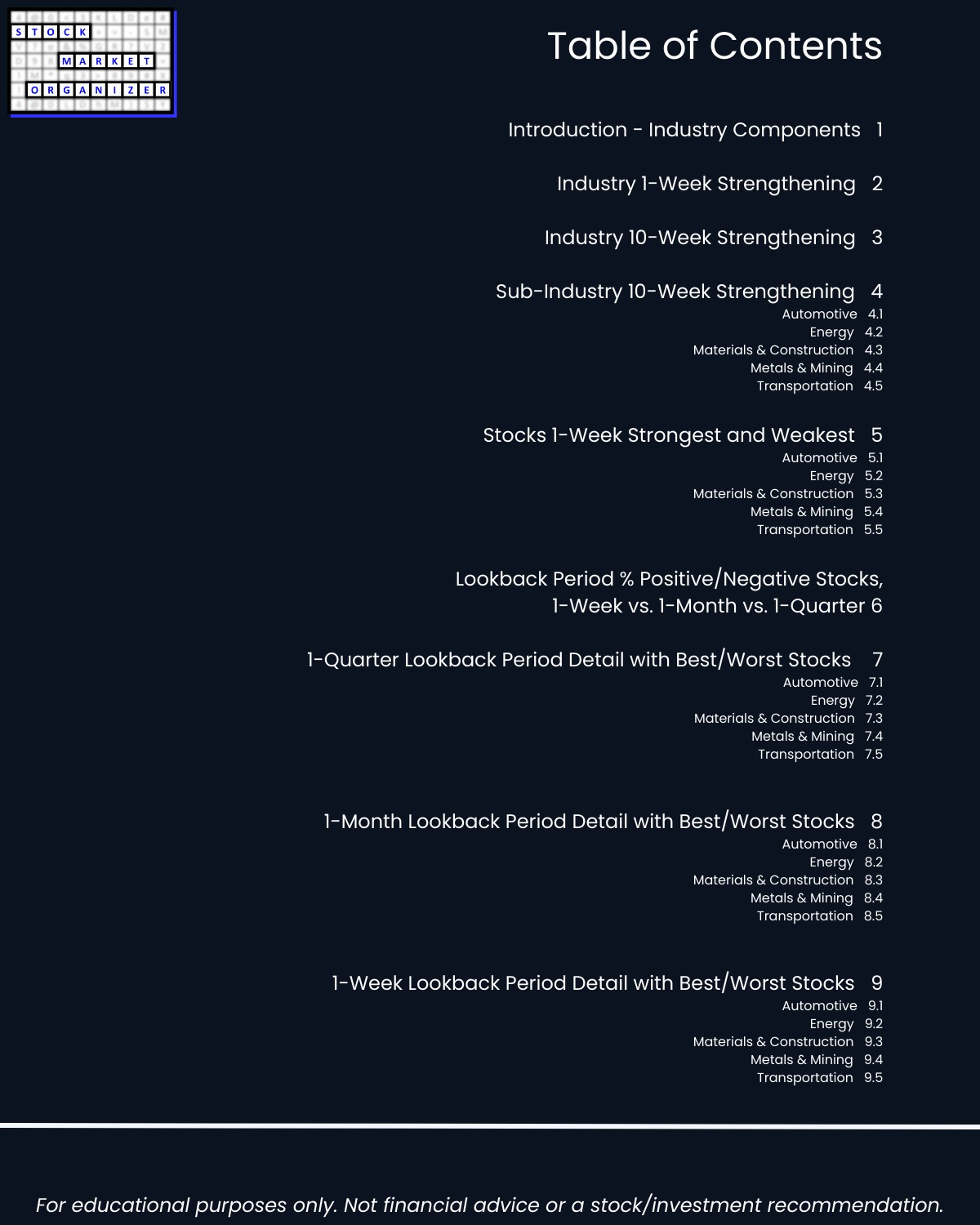 The attached report takes you through an objective analysis of strengthening and weakening in the following 5 industries: Automotive (e.g. TSLA, GM, F), Energy (oil companies), Materials & Construction (homebuilders), Metals & Mining (Gold), and Transportation.