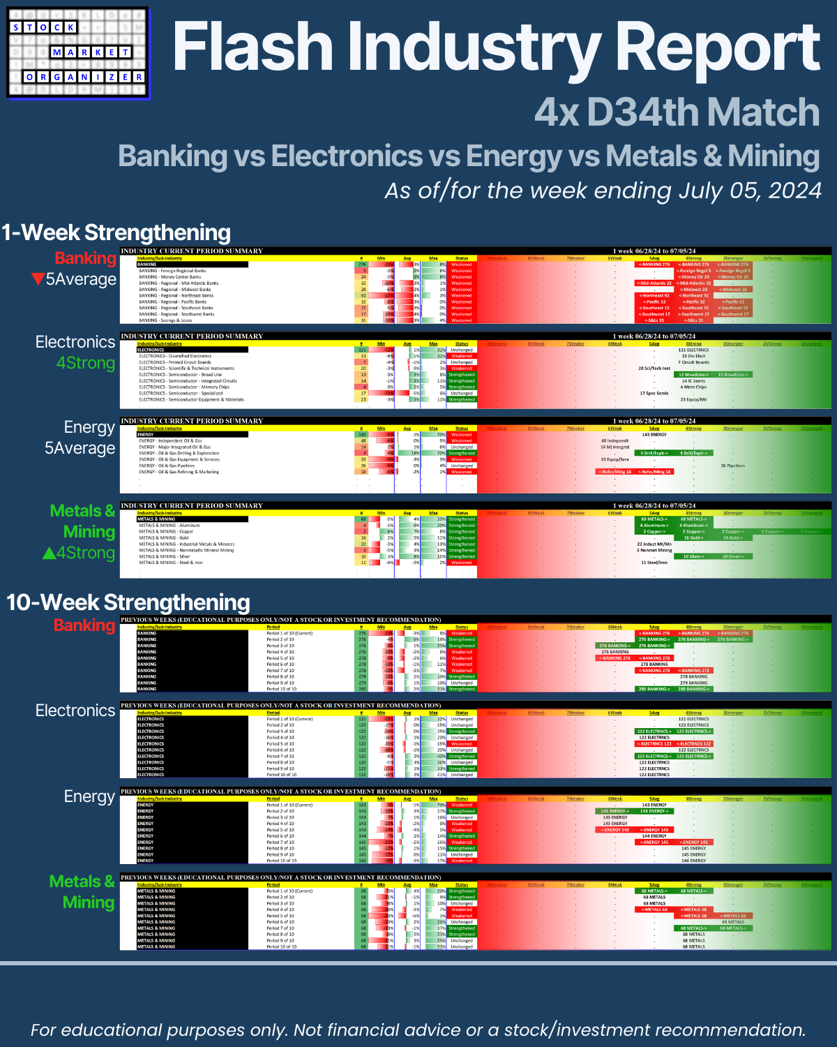 7/5/24 how can you objectively compare strength/strengthening for the disparate Banking (weakened 2 levels to 5Average), Electronics (chips/semis, no change at 4Strong), Energy (no change at 5Average), and Metals & Mining (strengthened to 4Strong) industries? One method is attached. Named in honor of the MTV Claymation celebrity brawl series, this Industry D34th Match Report gives you a direct strength comparison of these industries, their sub-industries, and their individual stocks.