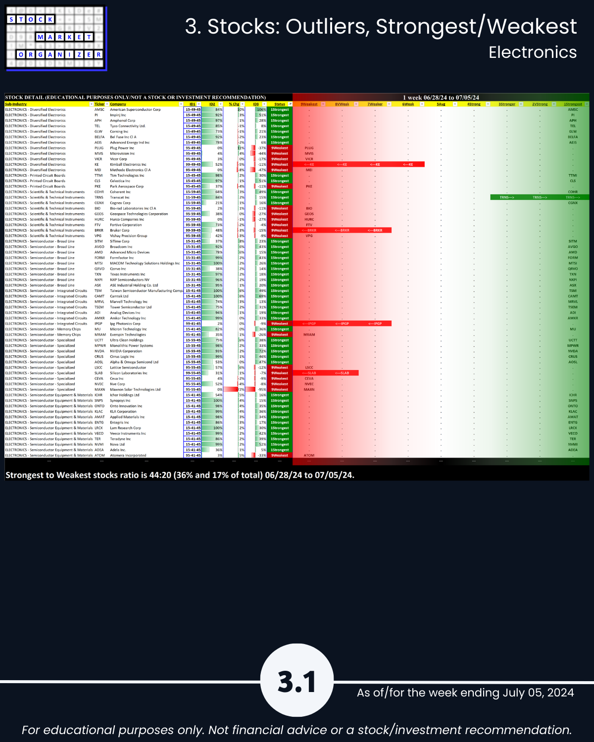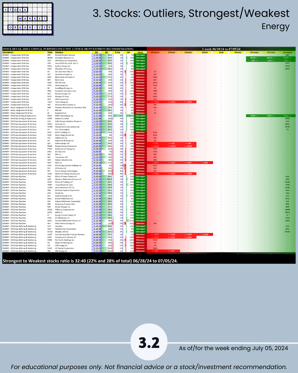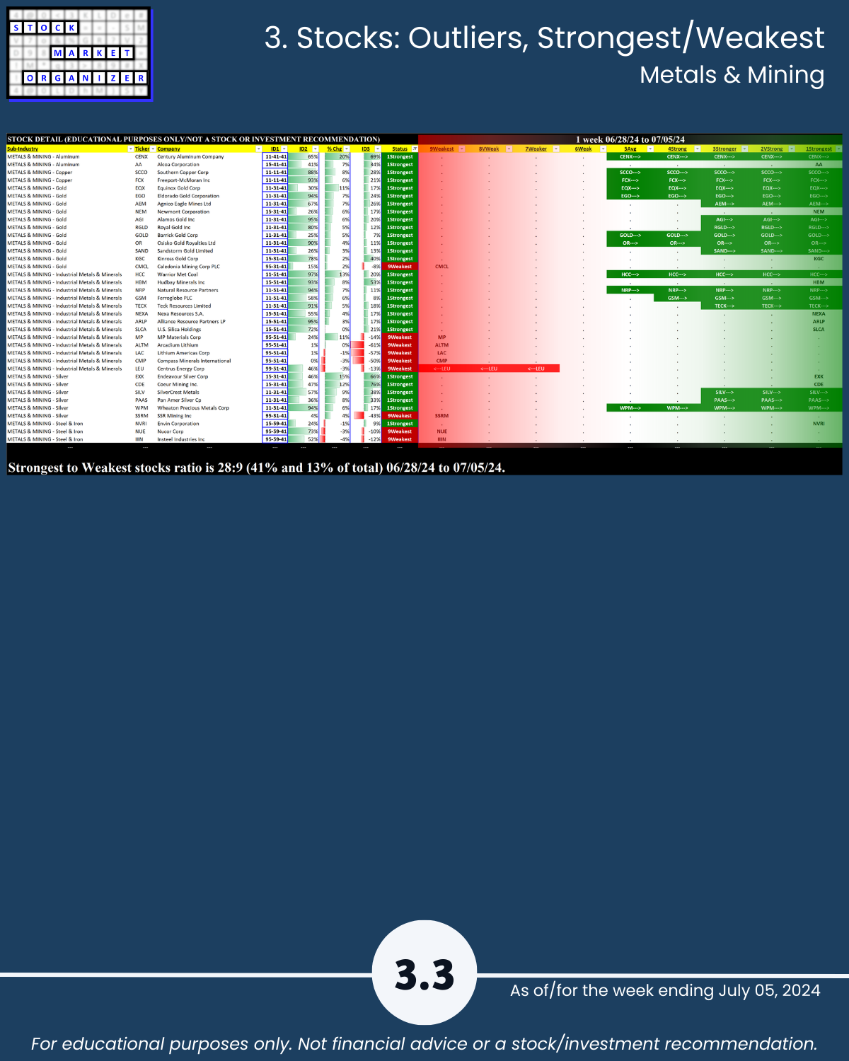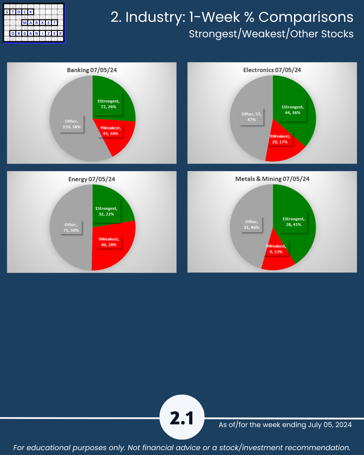 Section 2 INDUSTRY – provides a direct weekly comparison of positive and negative stocks and strongest/weakest stocks. Banking had a terribly negative week (87% negative stocks). Will this continue? No clue, I don’t predict, I just know what it DID. I can then act appropriately with this insight. Meanwhile, Metals & Mining has 41% stocks rated 1Strongest. This is nearly double that of Energy.