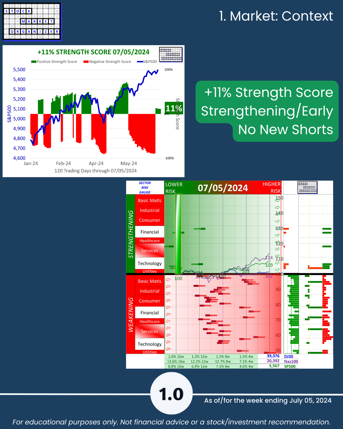 Section 1 MARKET –shows the proprietary Market Strength Score which is currently +11%. This means No New Shorts. Important to have something like this if you believe rising tides lift all boats.
