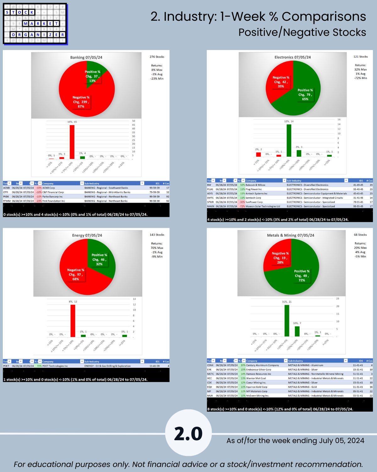 Quickly see on page 2.0 outlier stocks >10% and <-10% by industry.