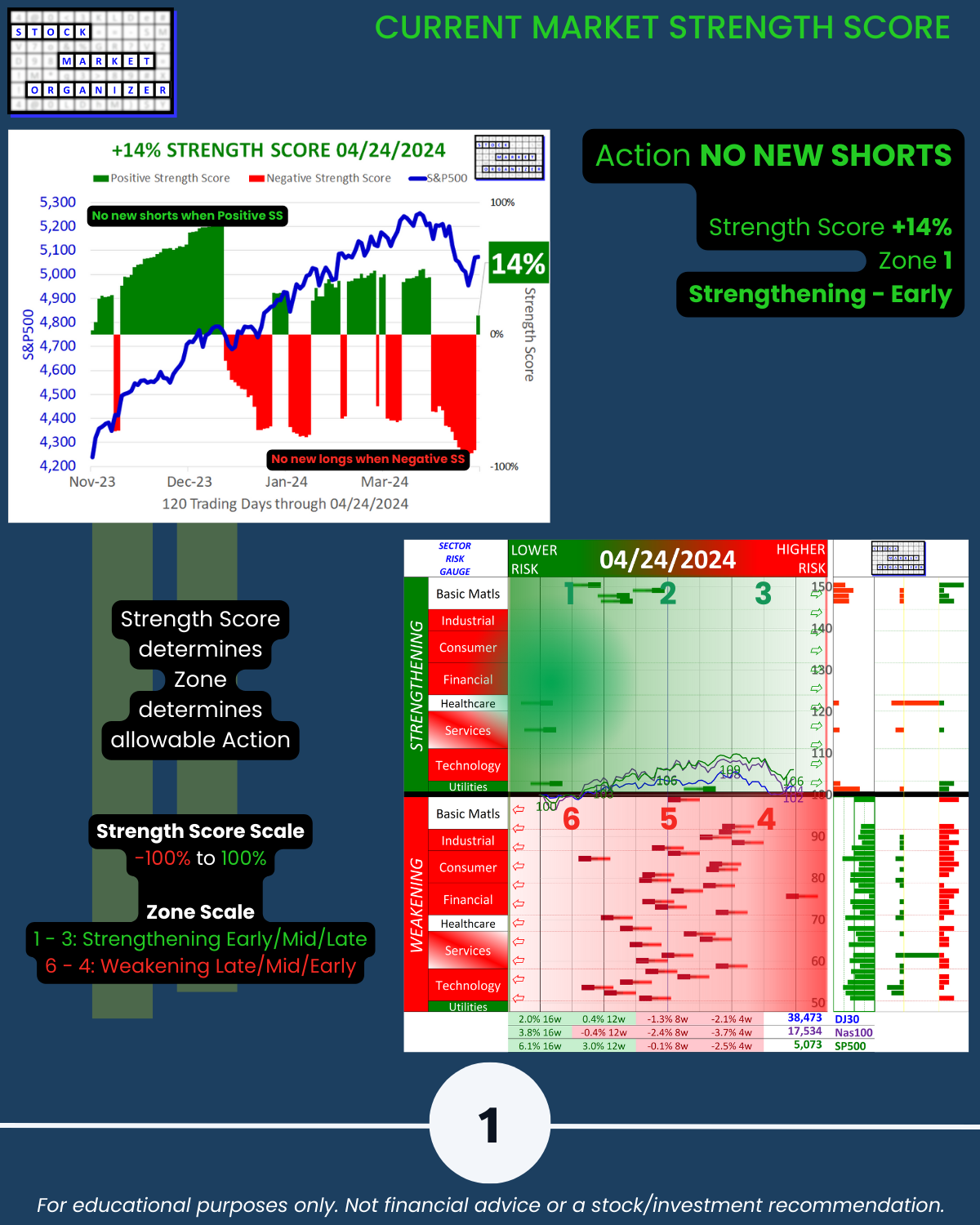 U.S. Stock Market status change as of 2024-04-24, NO NEW SHORTS per the exclusive Stock Market Organizer objectively calculated POSITIVE Market Strength Score (+14%, scale is -100% to 100%).