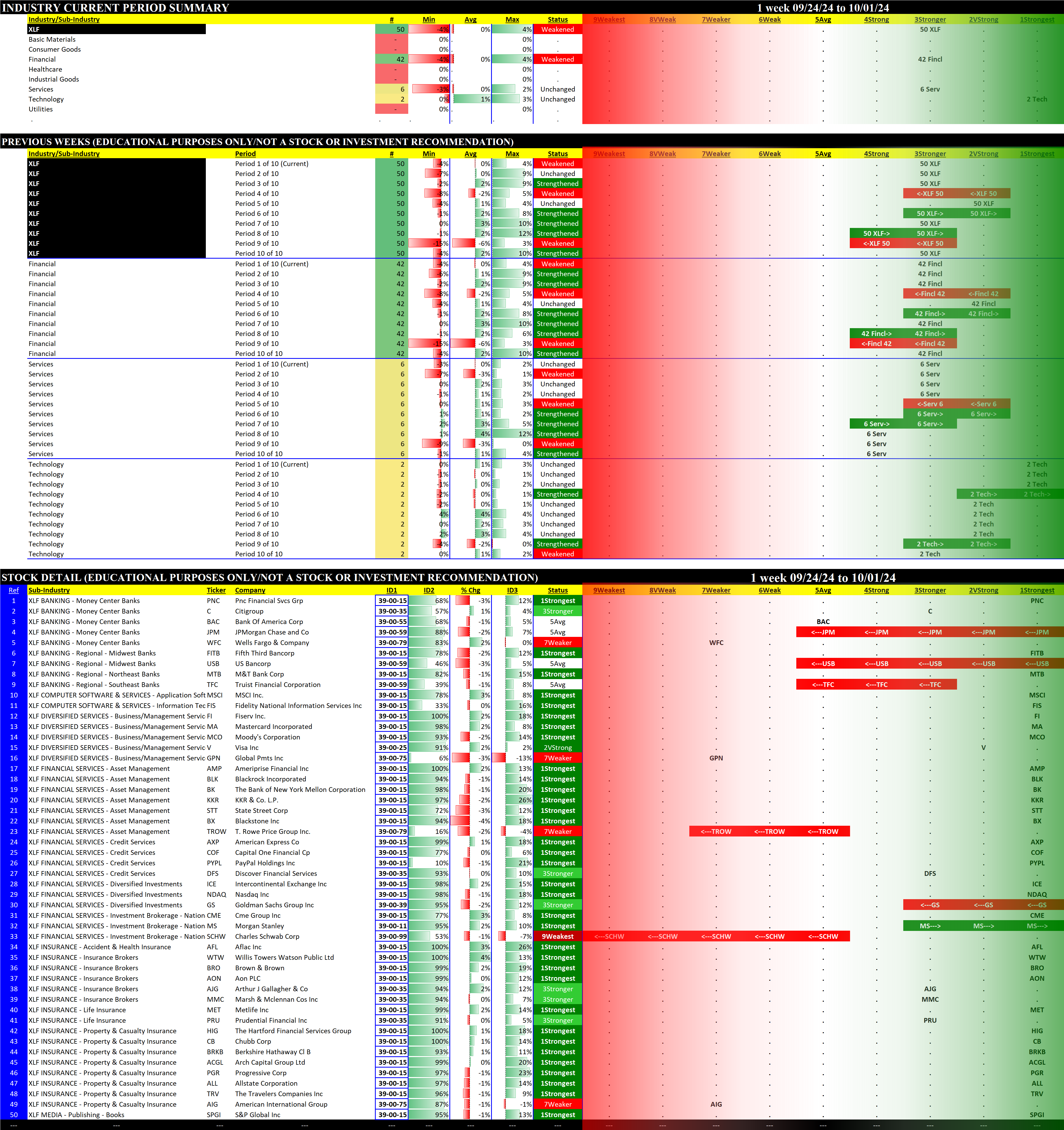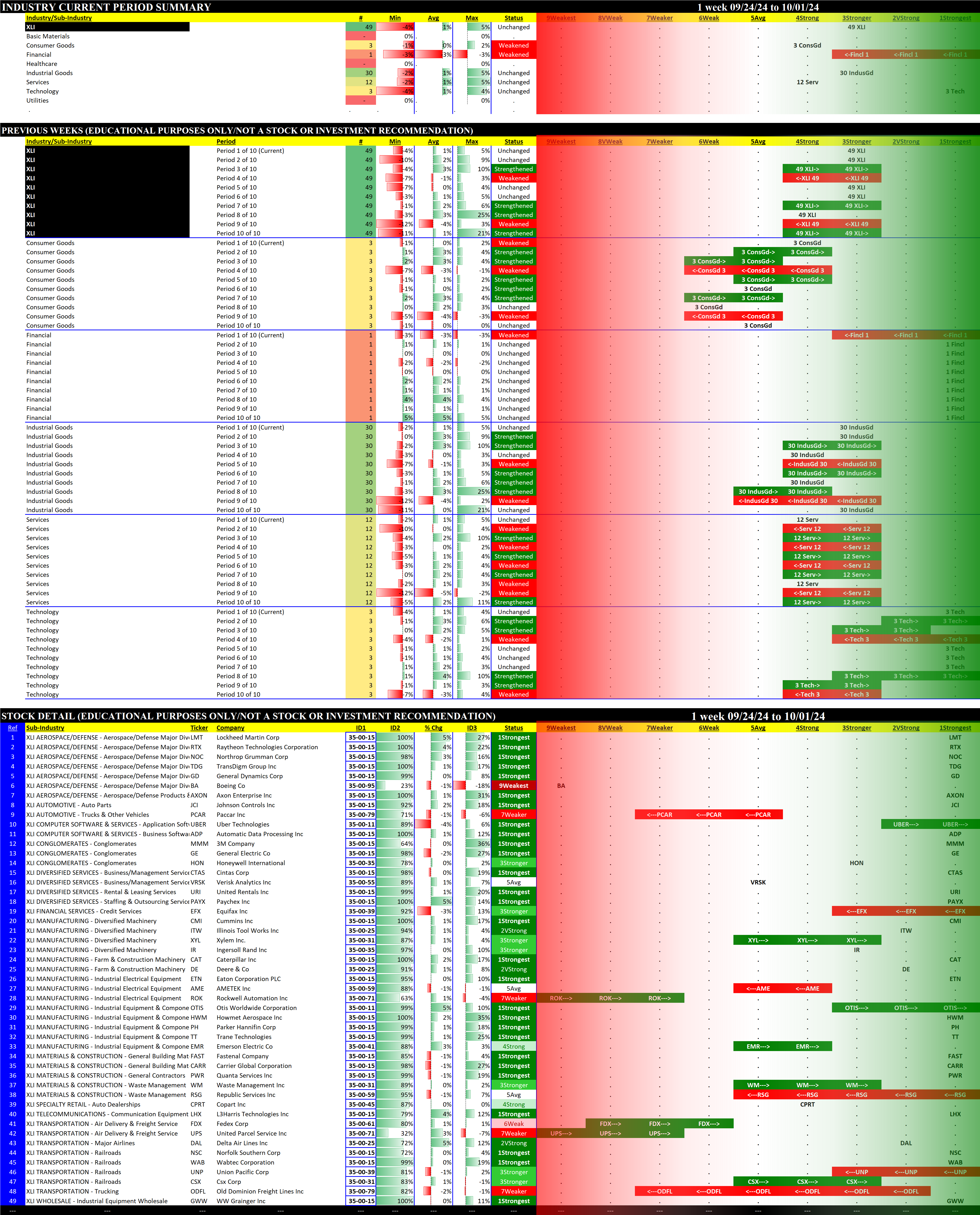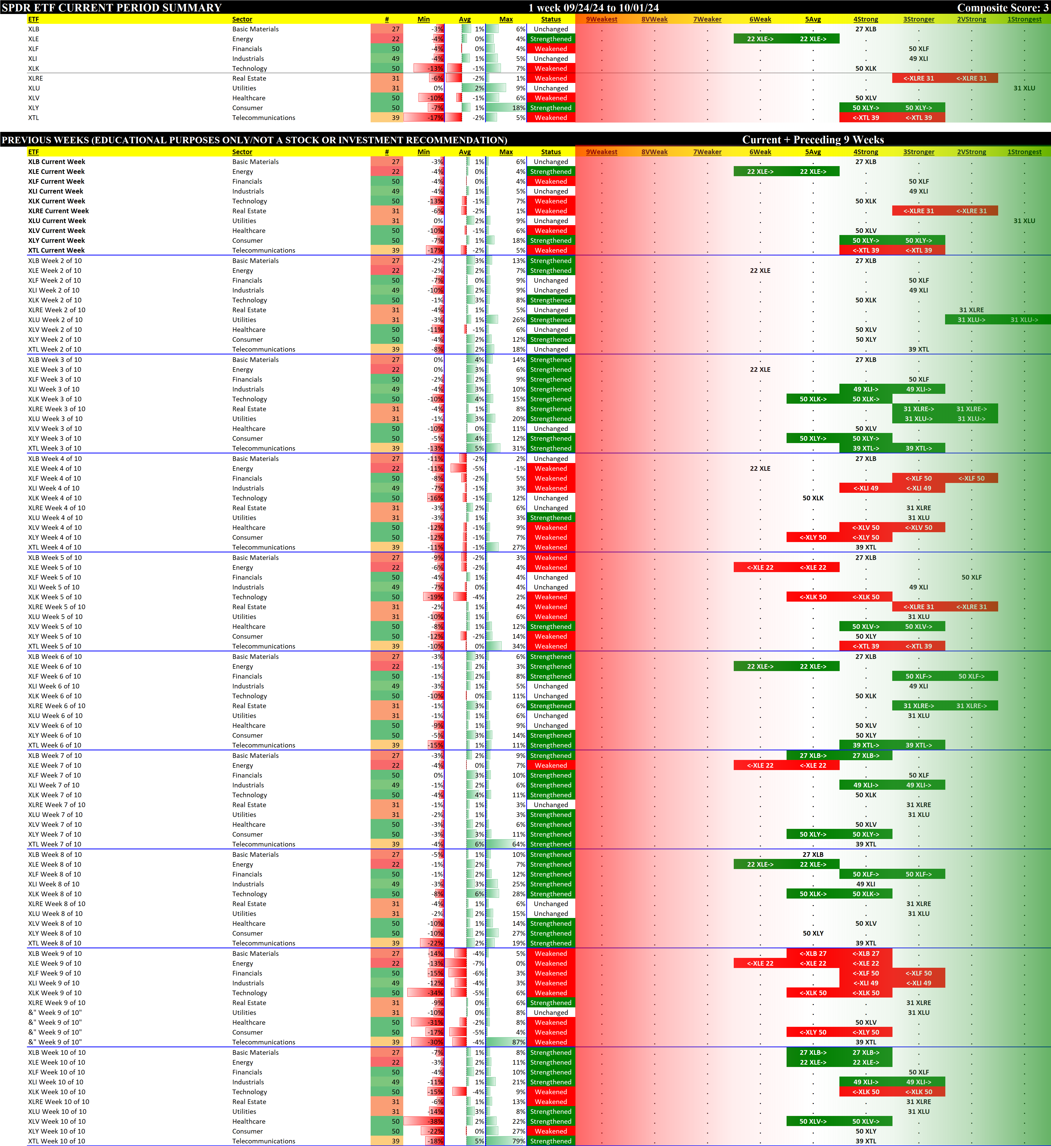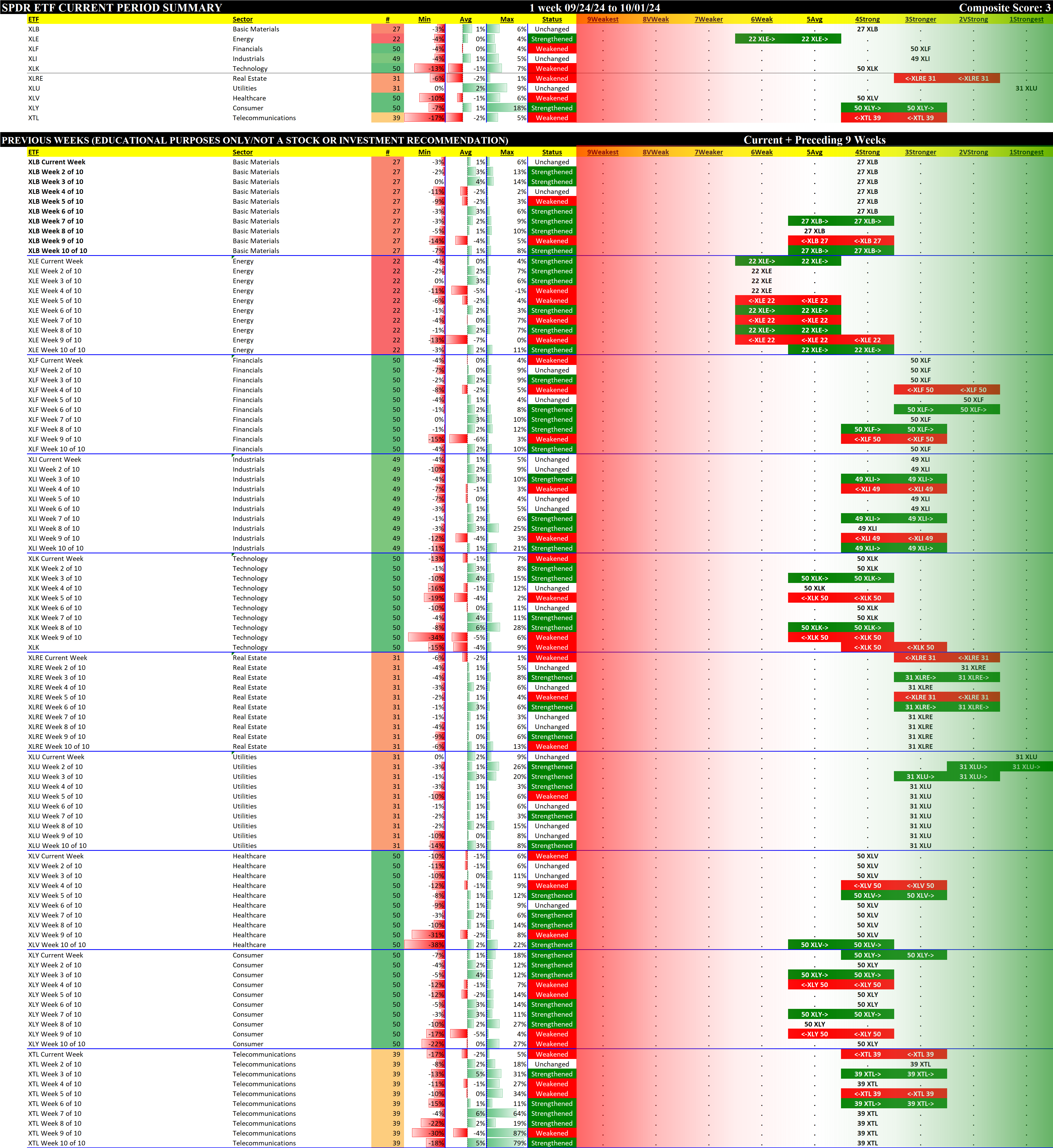 The following Stock Market Organizer strengthening/weakening analysis looks at the 10 SPDR ETFs and their underlying component stocks for the week ending 2024-10-01, as follows: