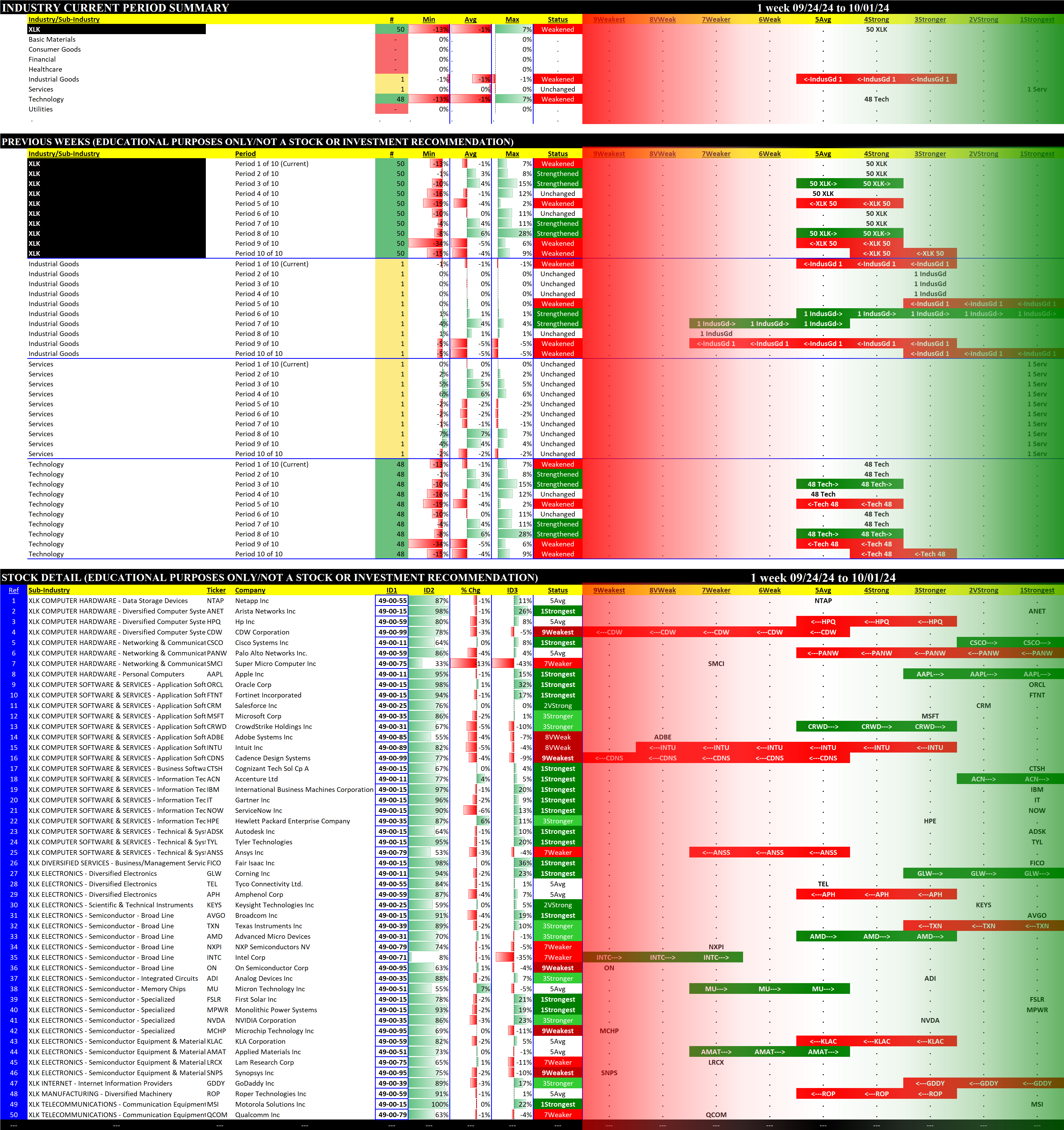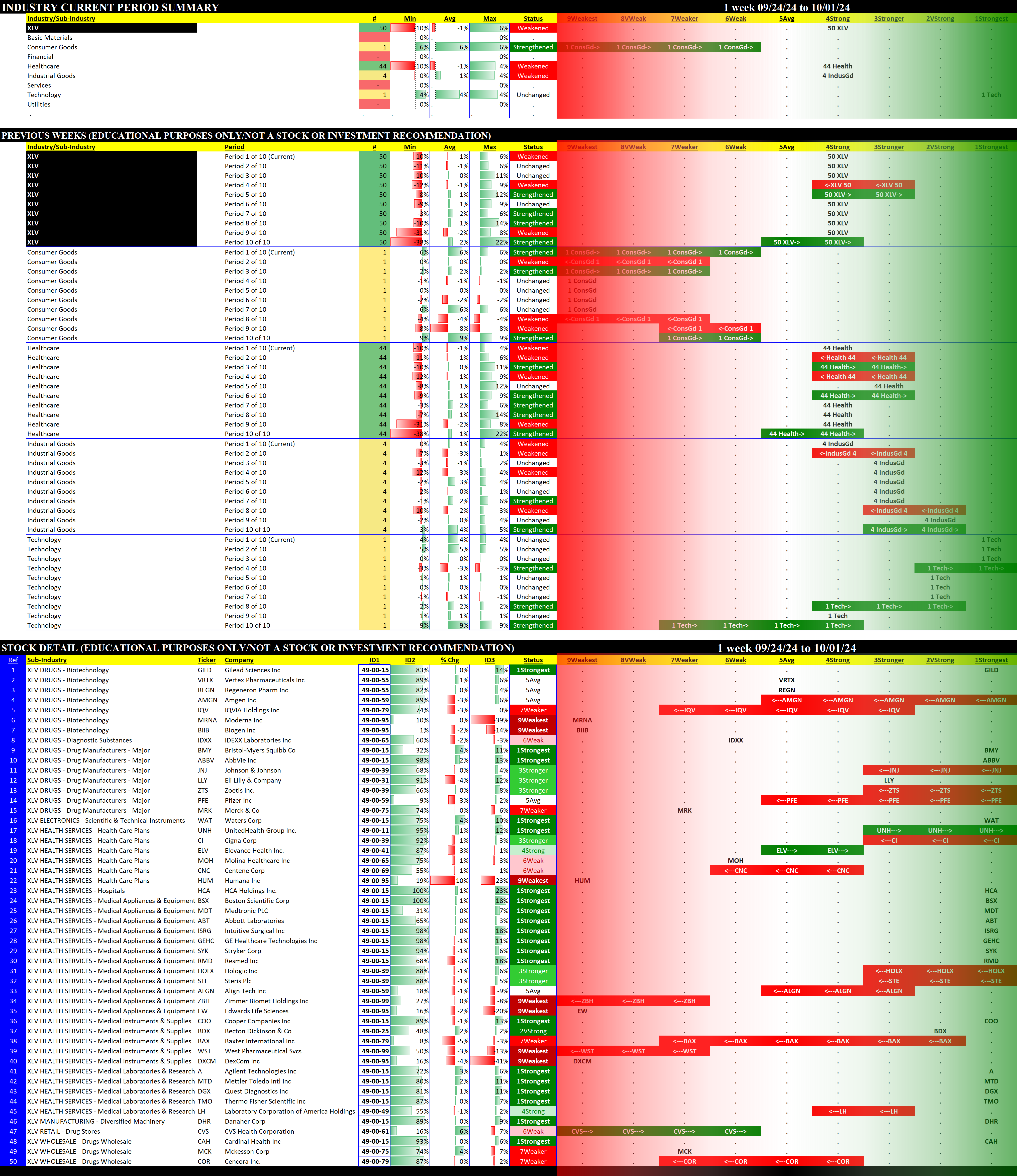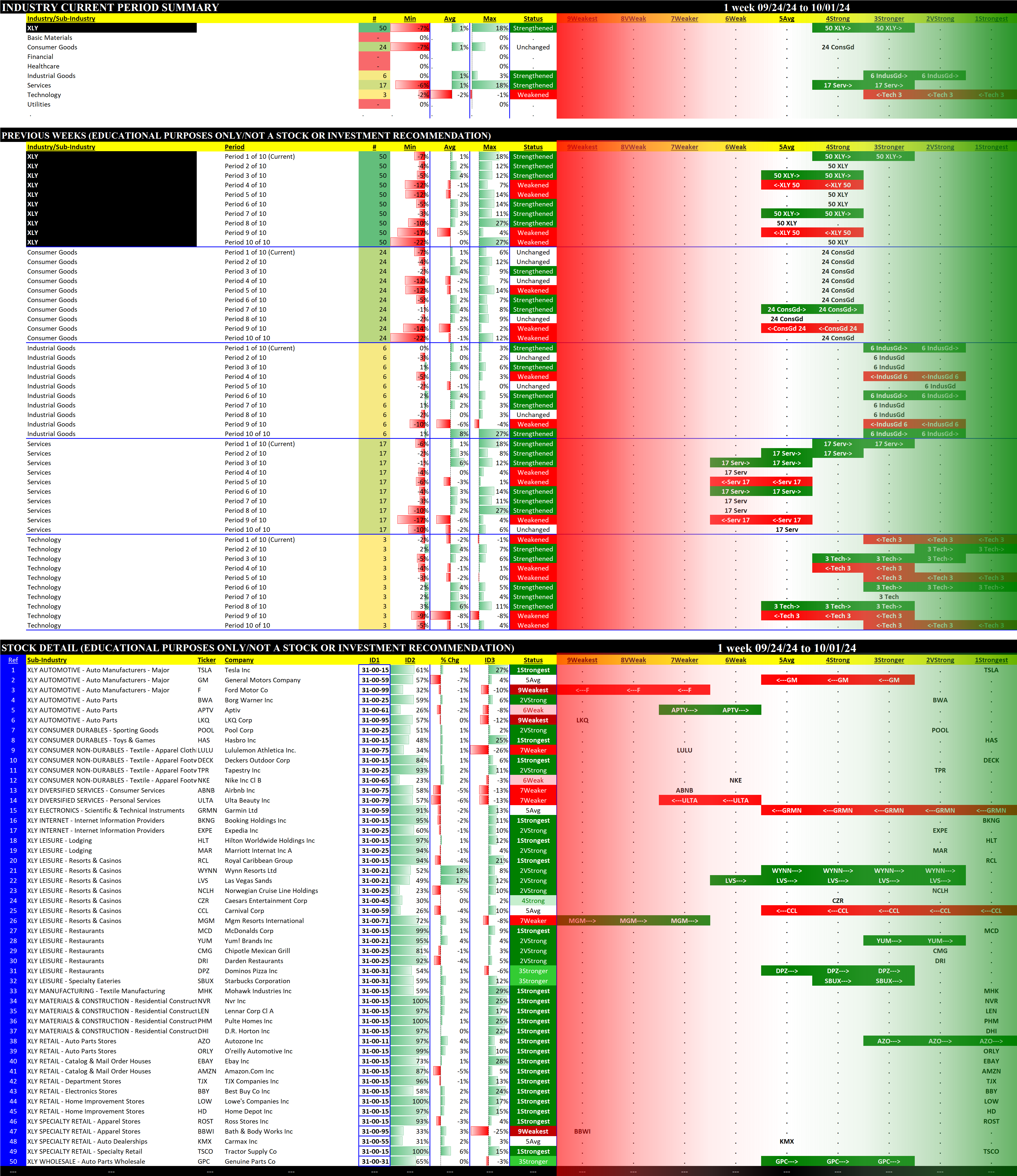 The following Stock Market Organizer strengthening/weakening analysis looks at the 10 SPDR ETFs and their underlying component stocks for the week ending 2024-10-01, as follows: