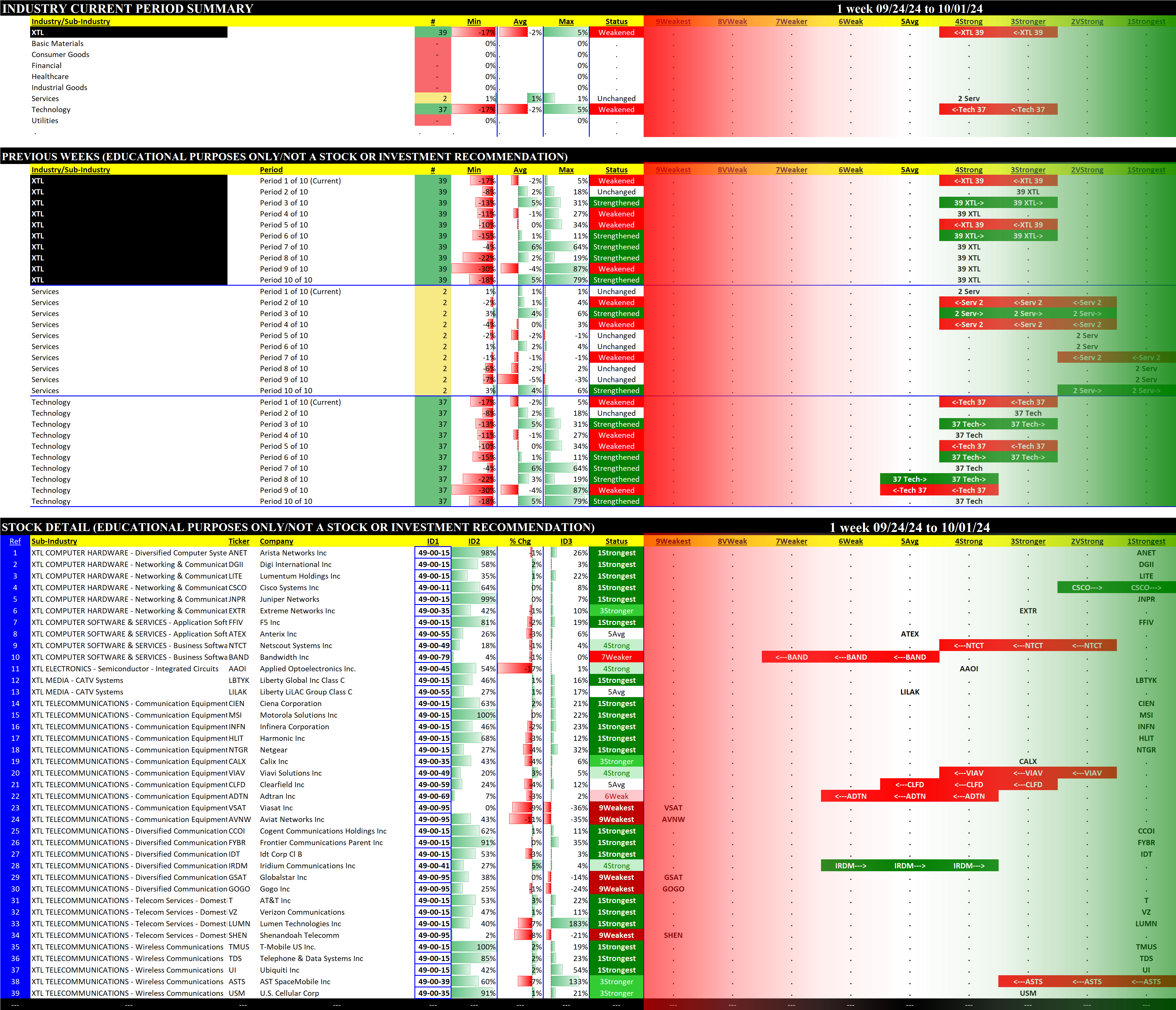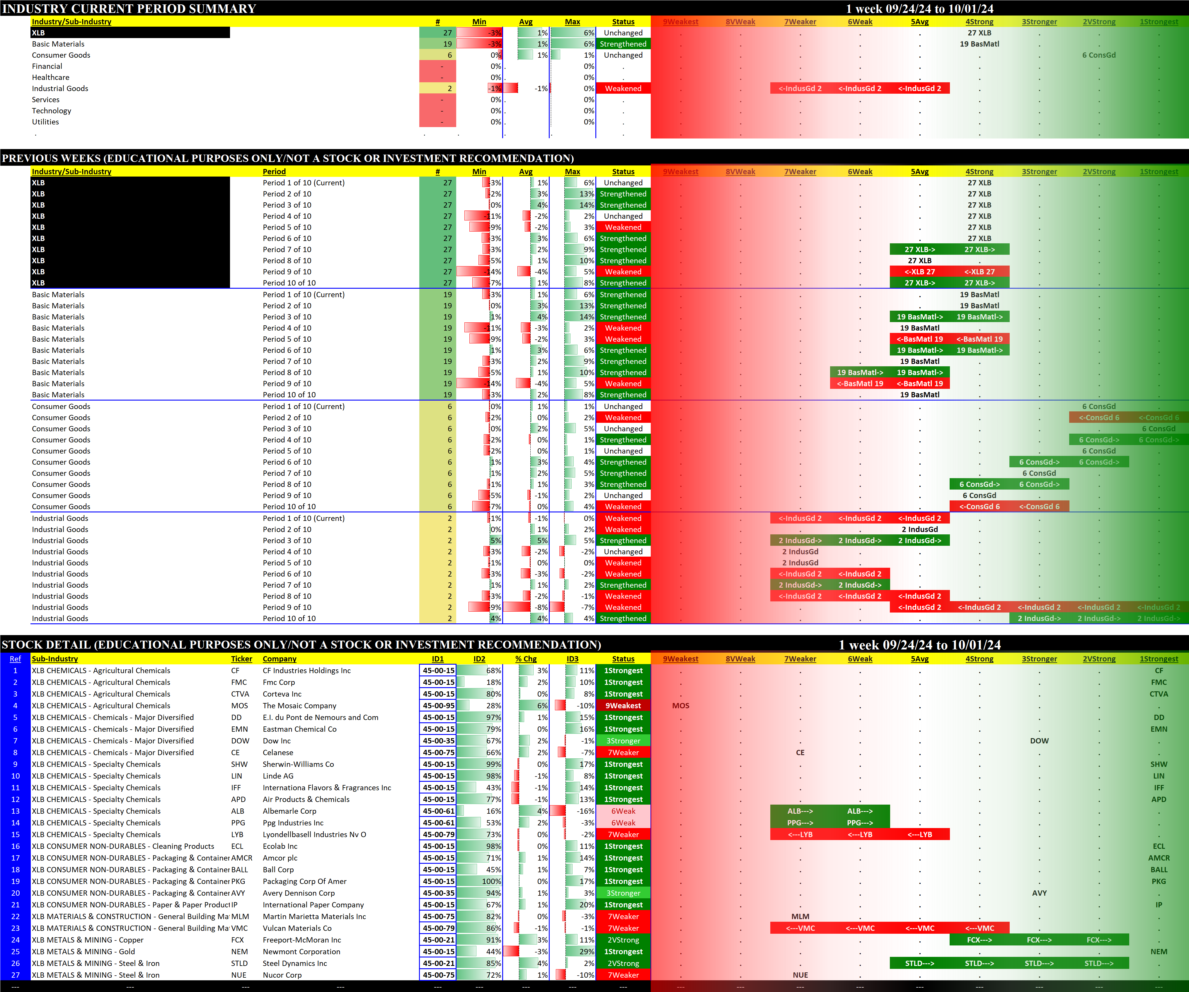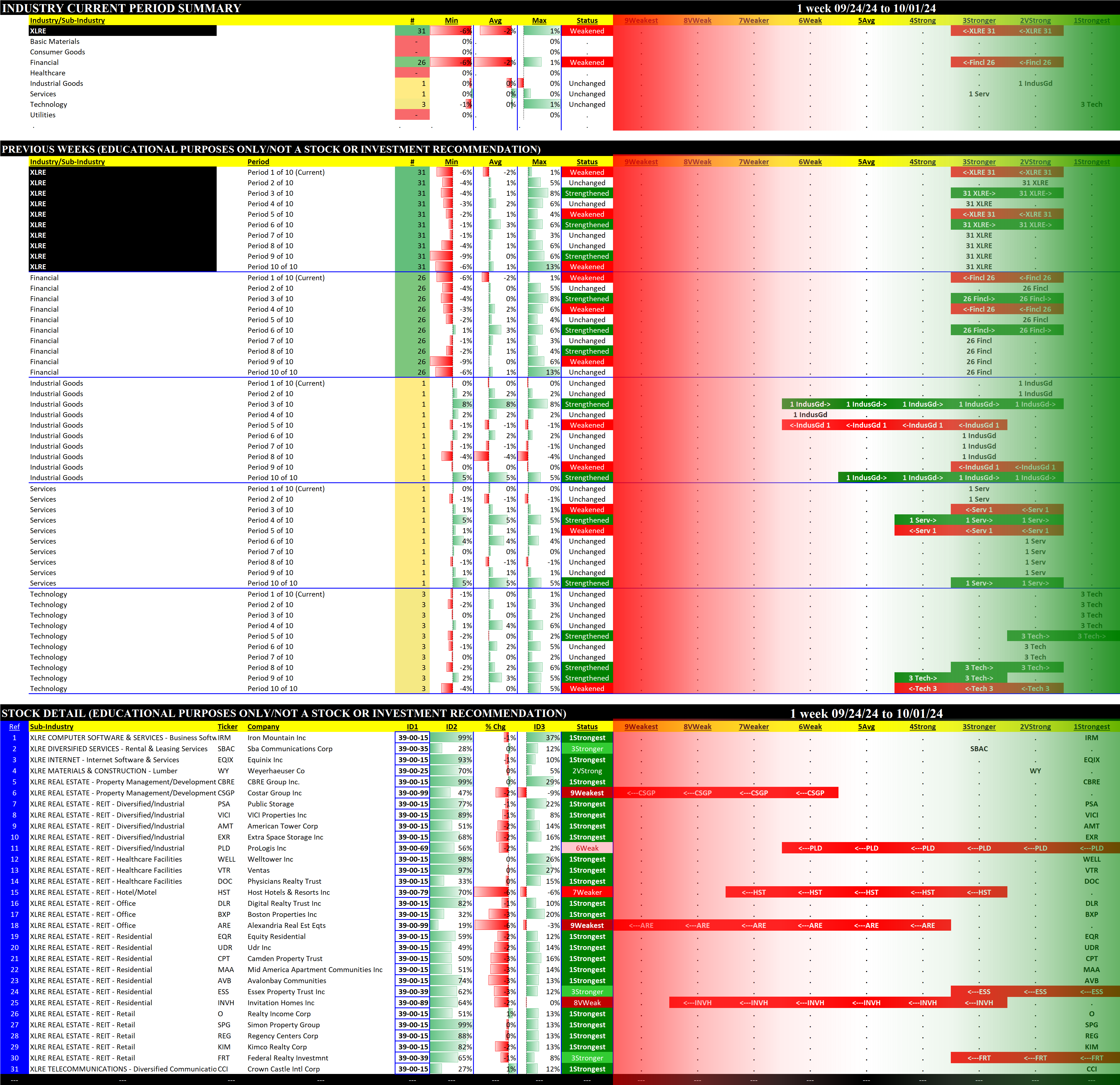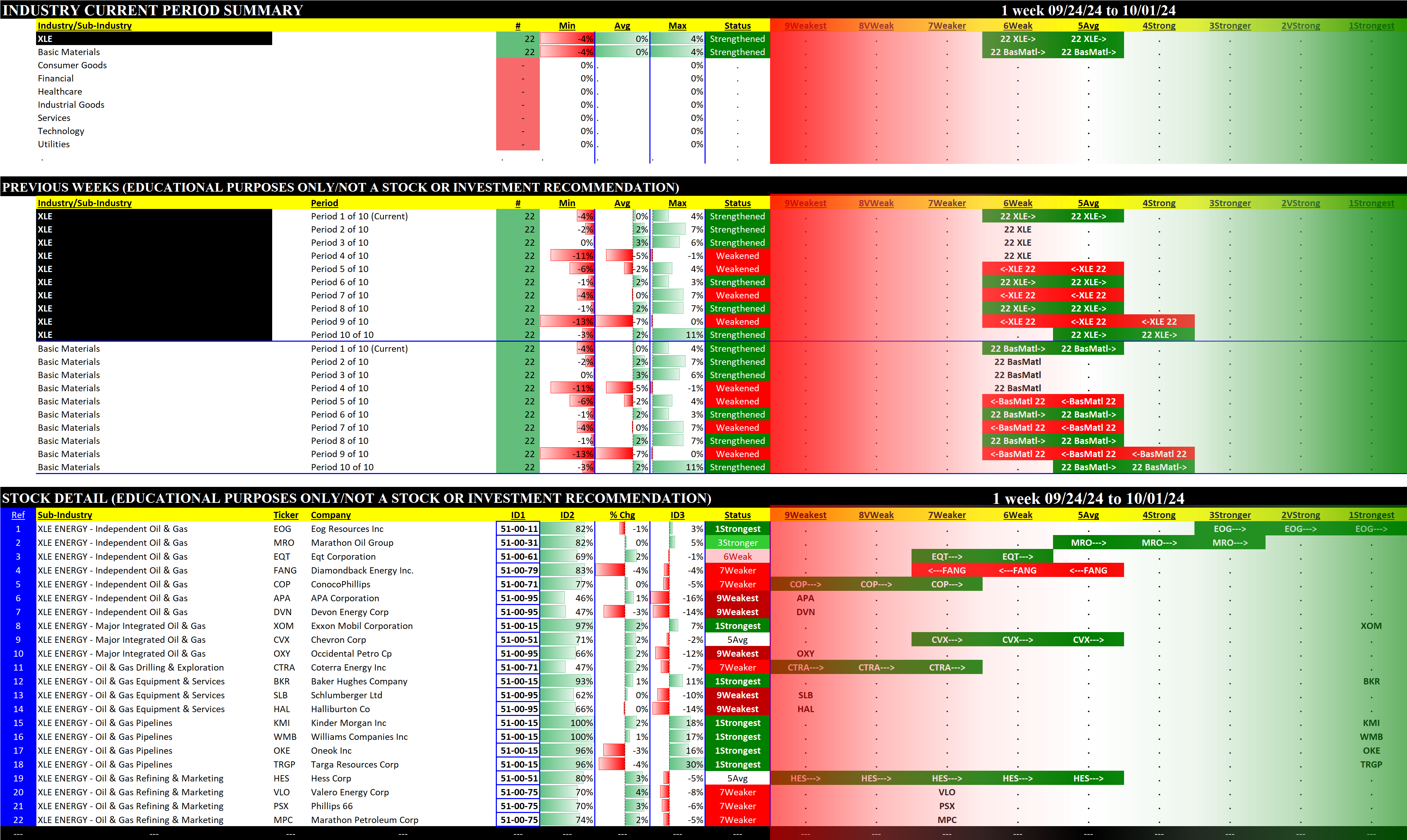 The following Stock Market Organizer strengthening/weakening analysis looks at the 10 SPDR ETFs and their underlying component stocks for the week ending 2024-10-01, as follows: