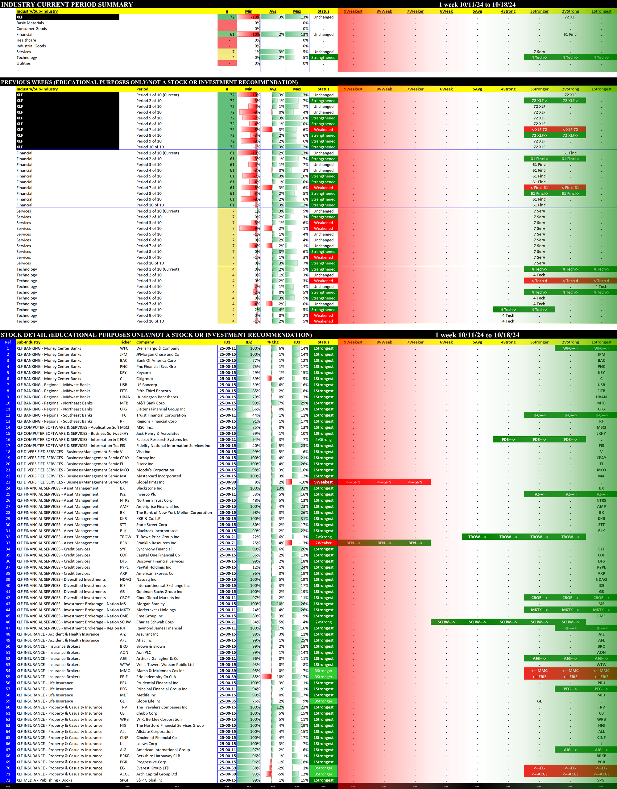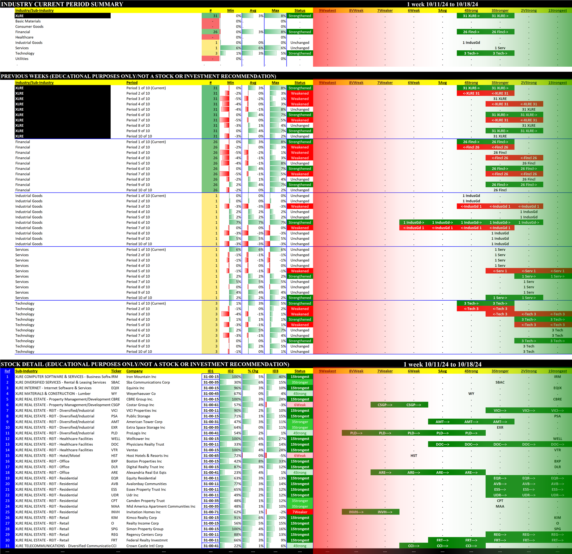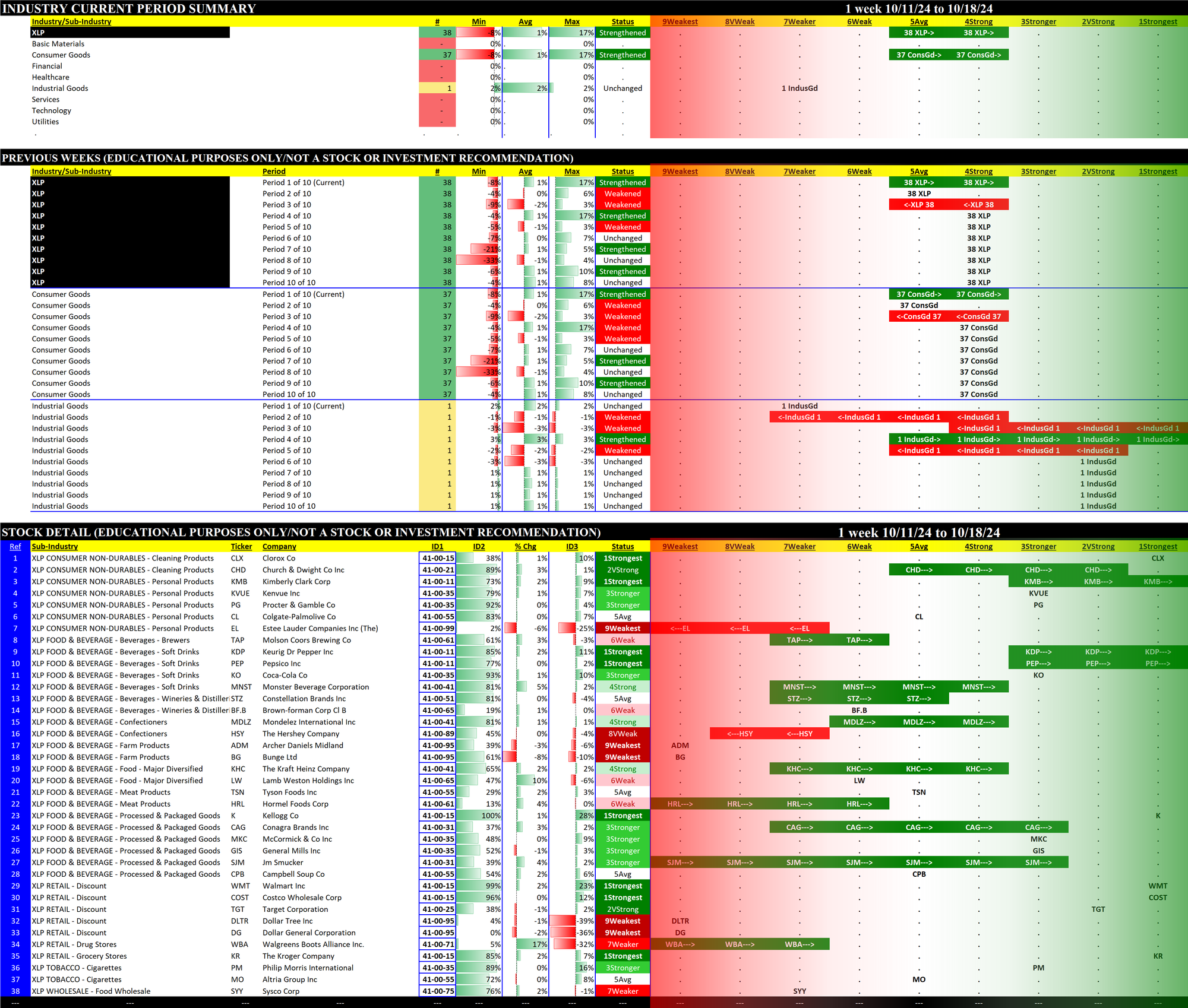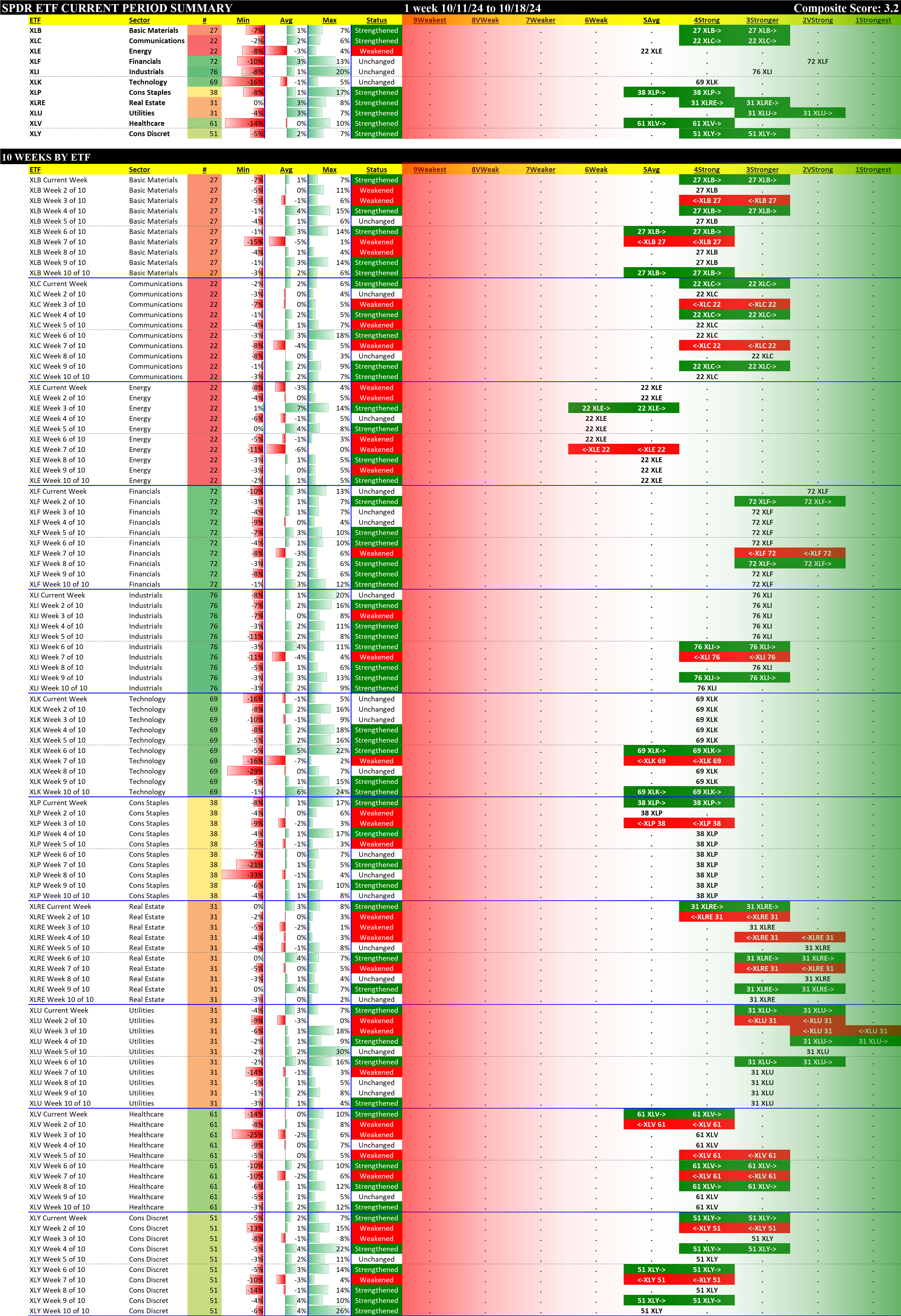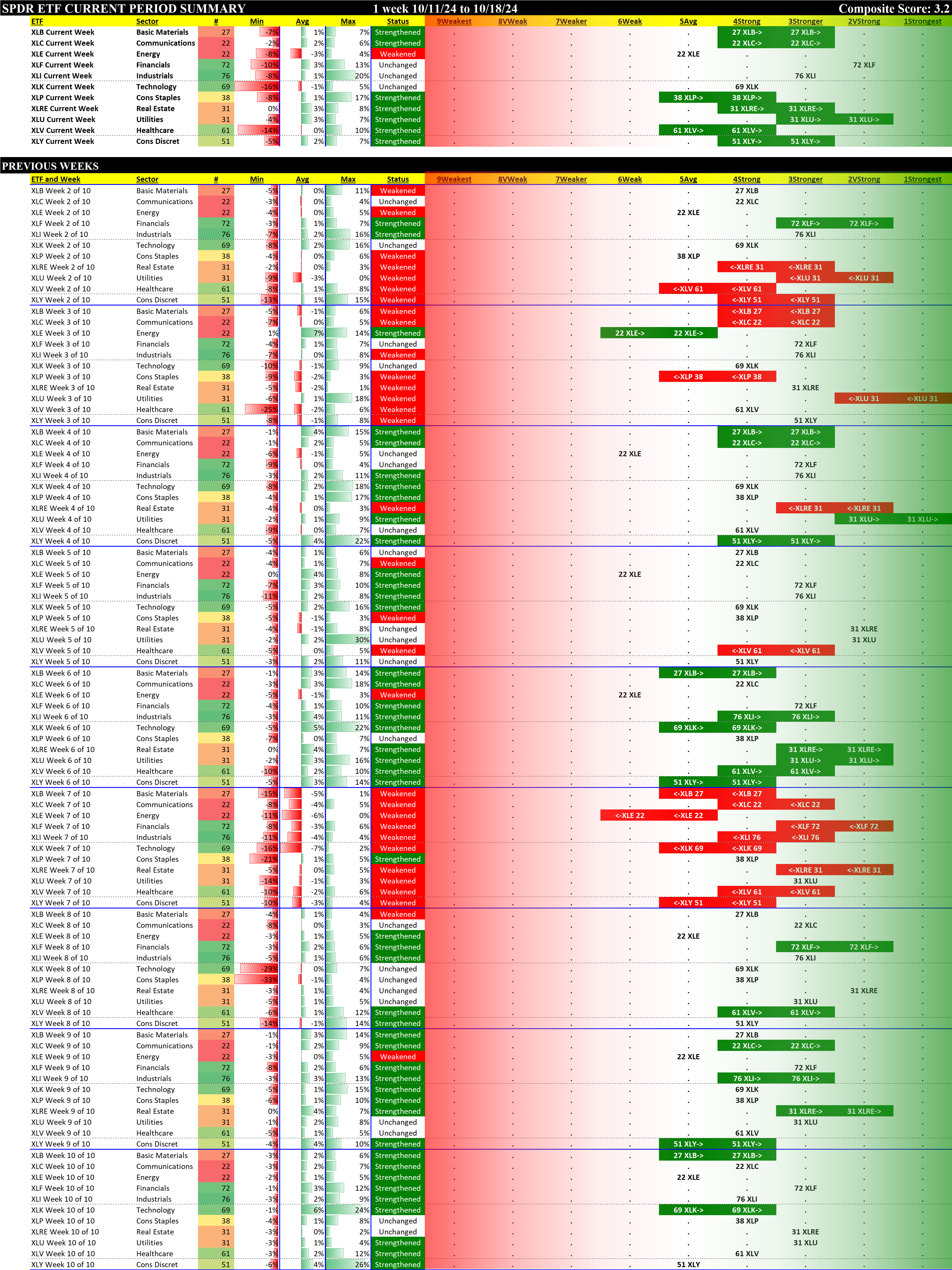 The following Stock Market Organizer strengthening/weakening analysis looks at the 11 SPDR ETFs and their underlying component stocks for the week ending Friday 2024-10-18, as follows: