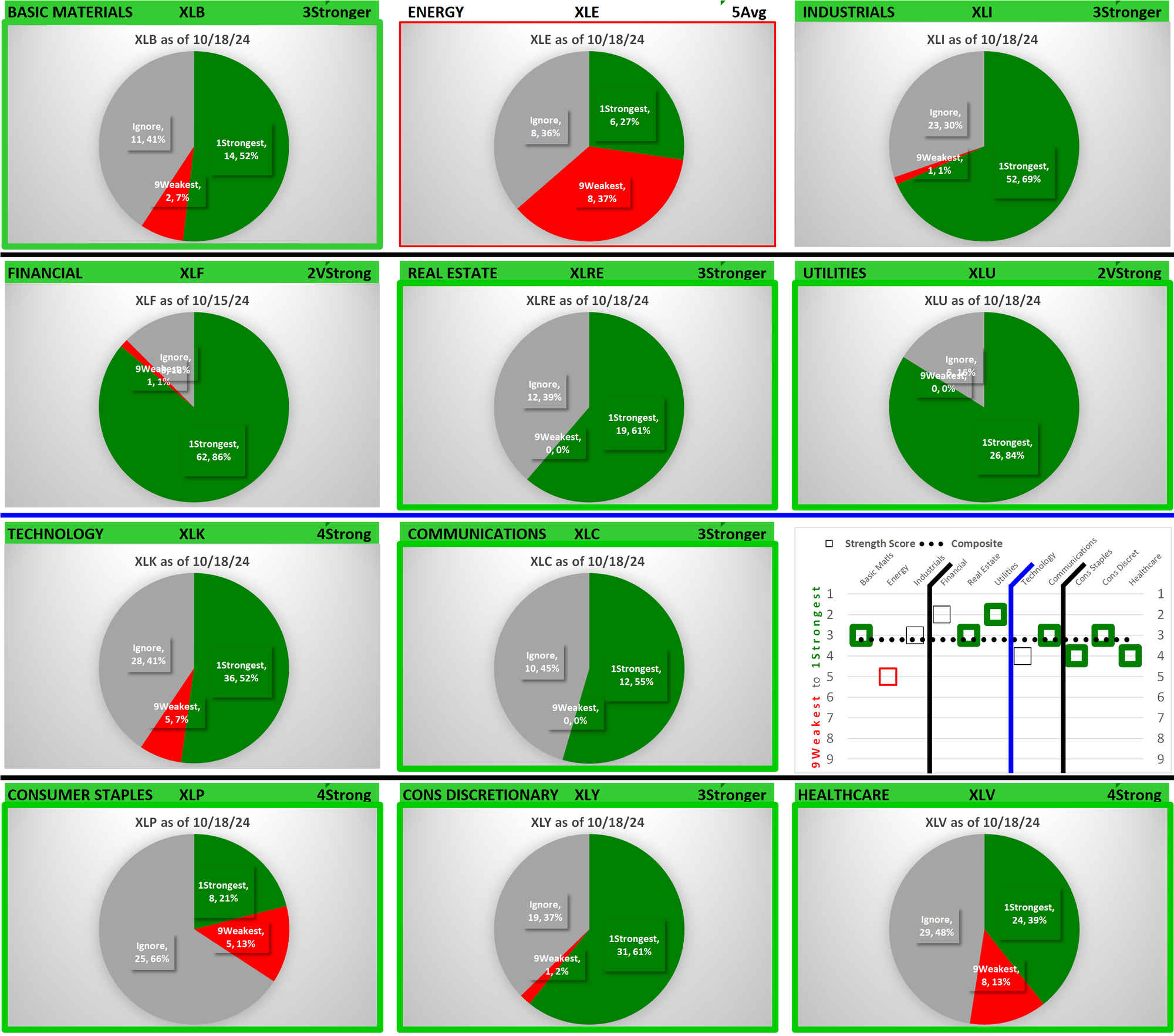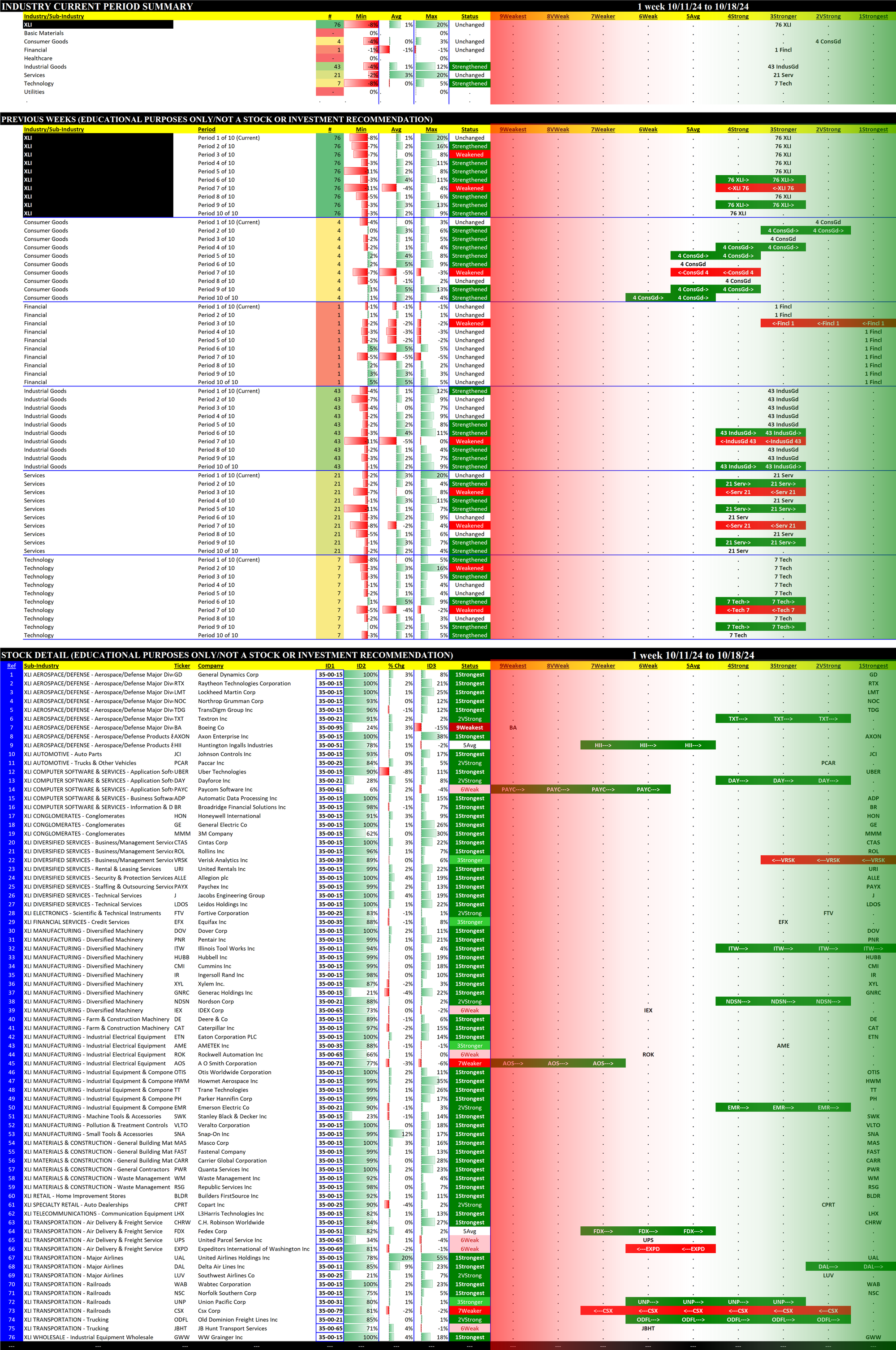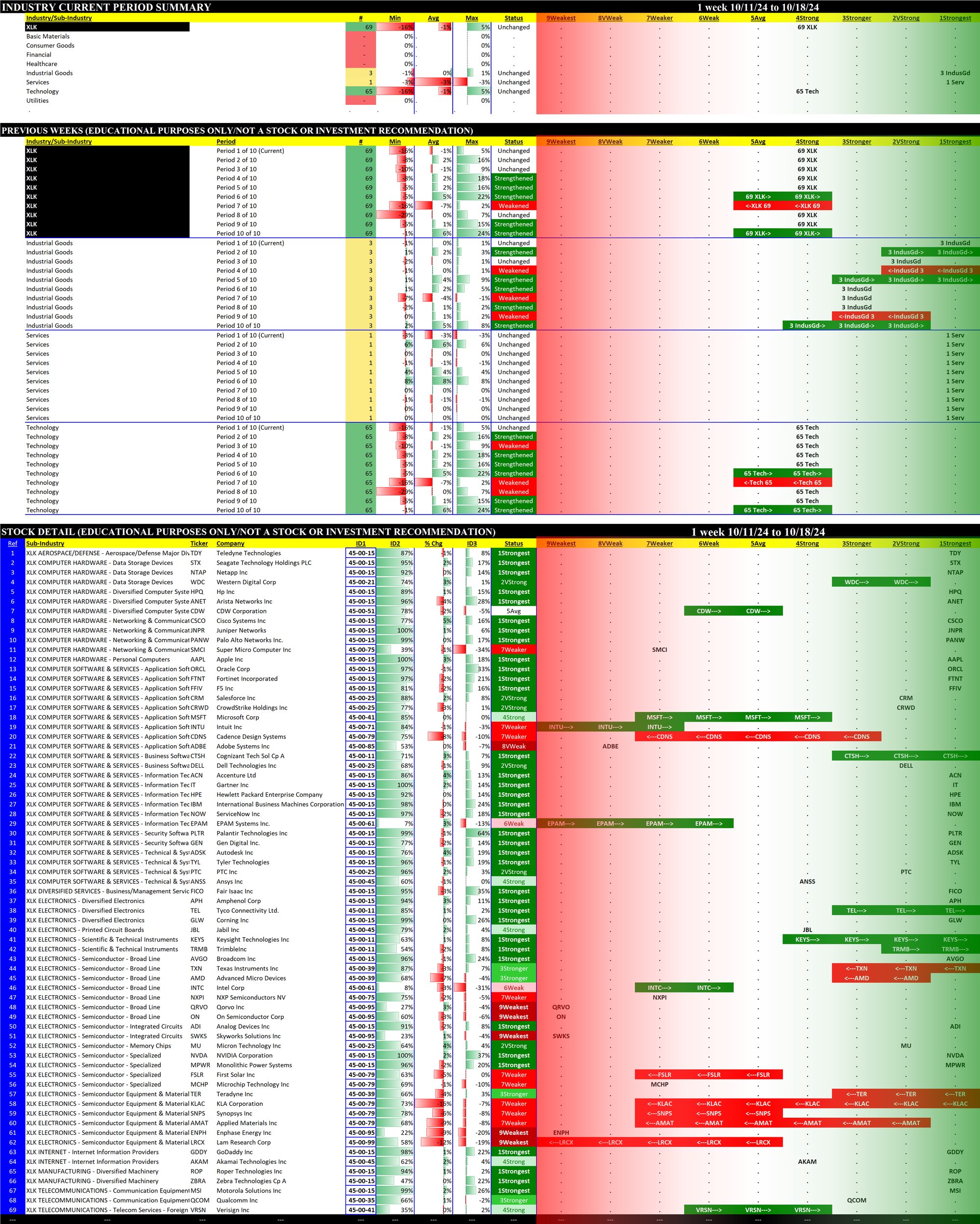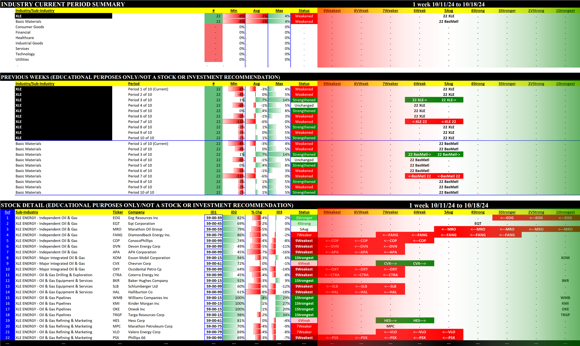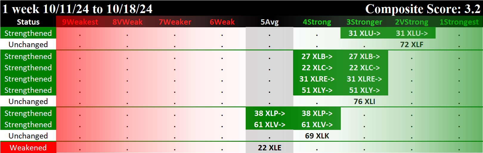 The following Stock Market Organizer strengthening/weakening analysis looks at the 11 SPDR ETFs and their underlying component stocks for the week ending Friday 2024-10-18, as follows:
