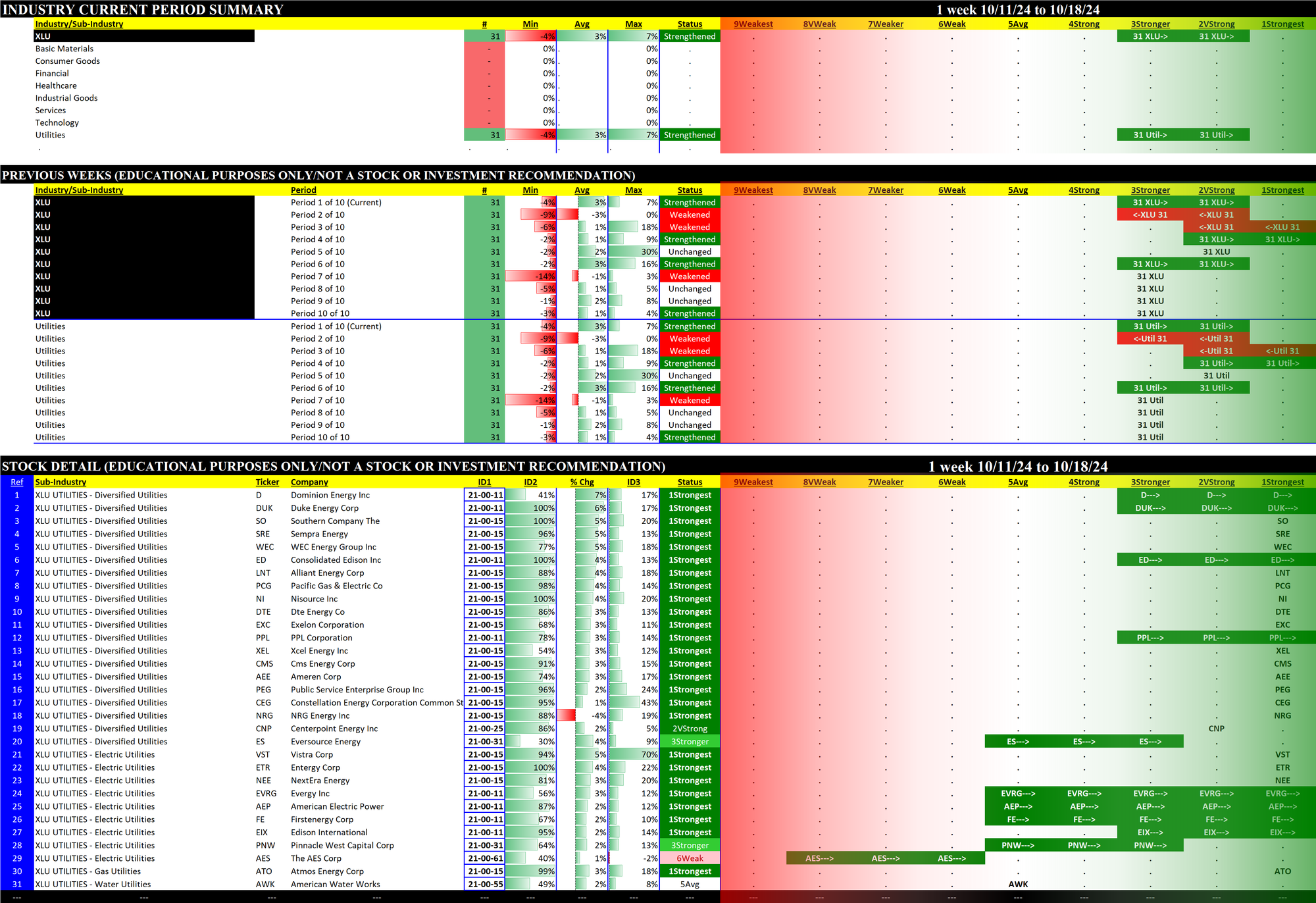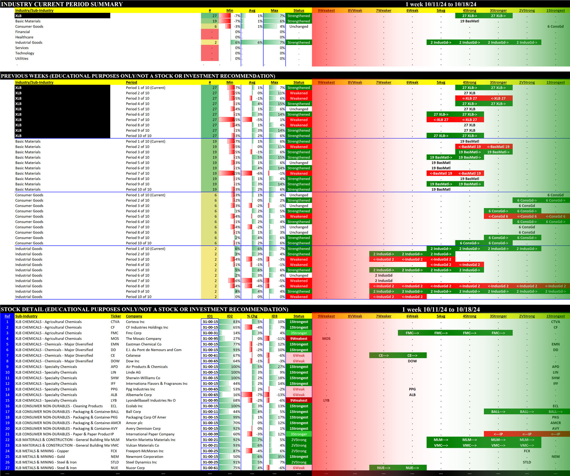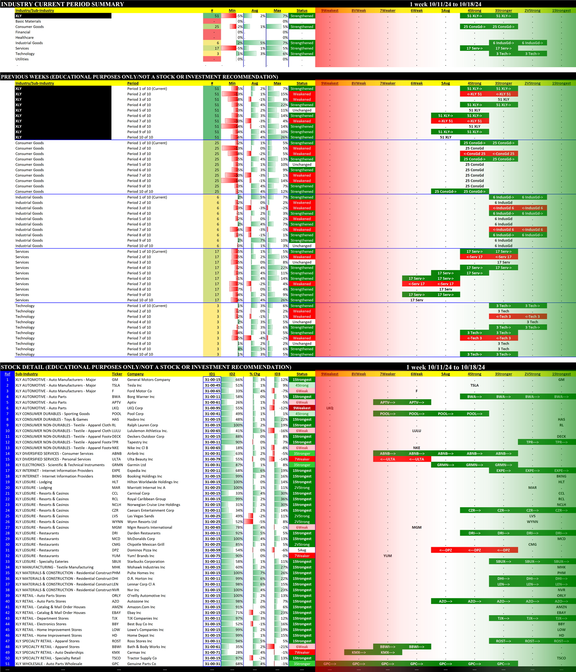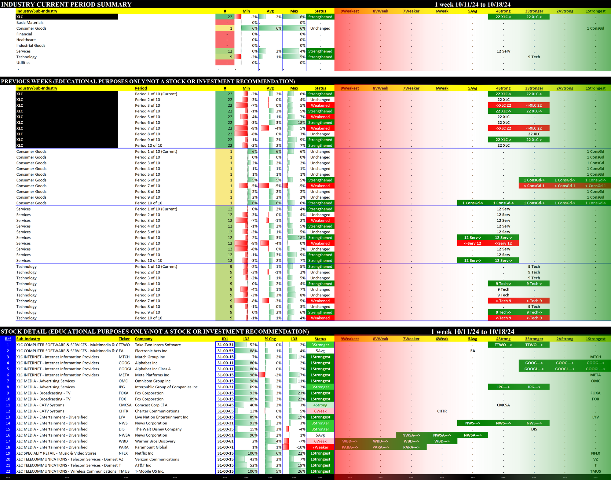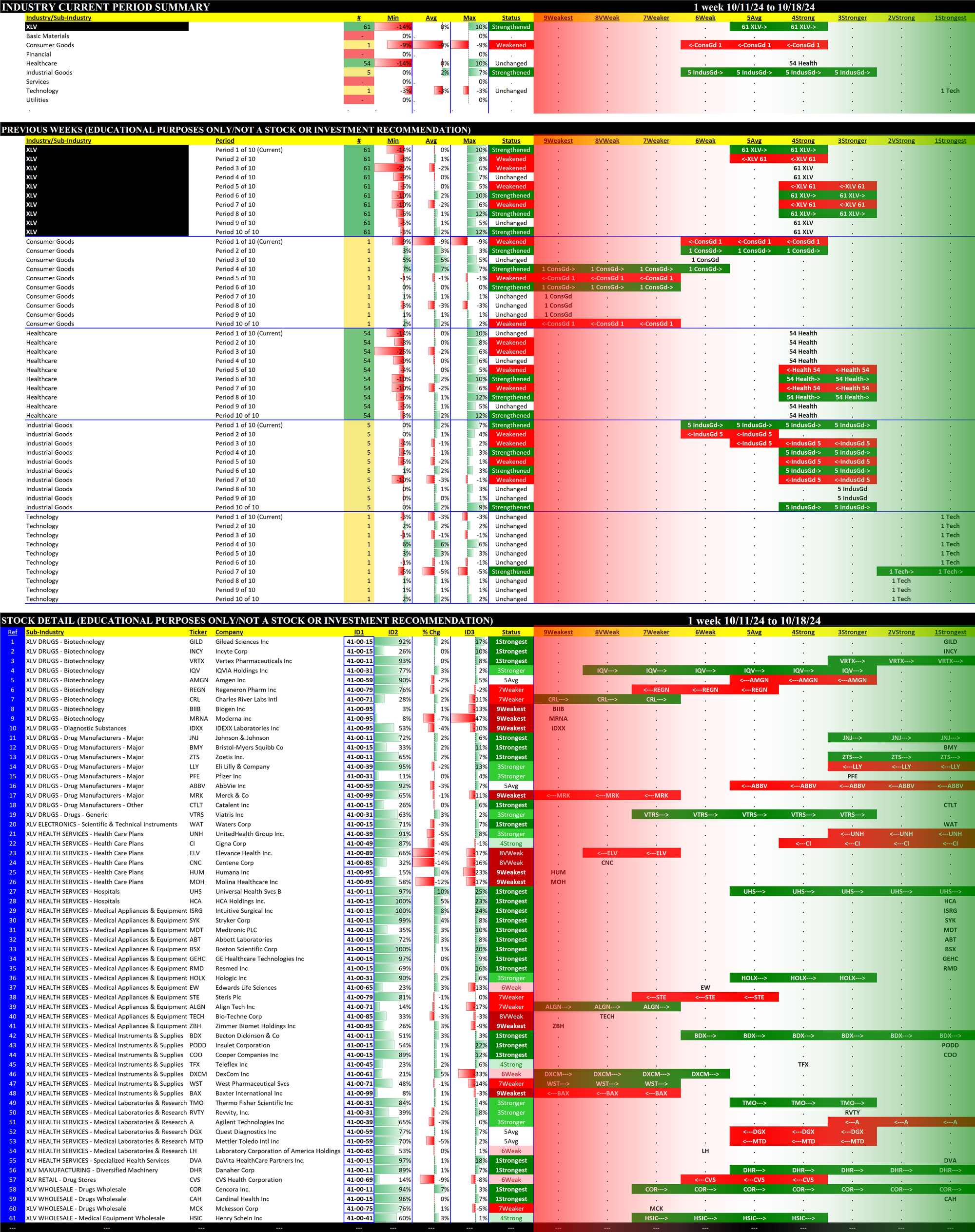 The following Stock Market Organizer strengthening/weakening analysis looks at the 11 SPDR ETFs and their underlying component stocks for the week ending Friday 2024-10-18, as follows: