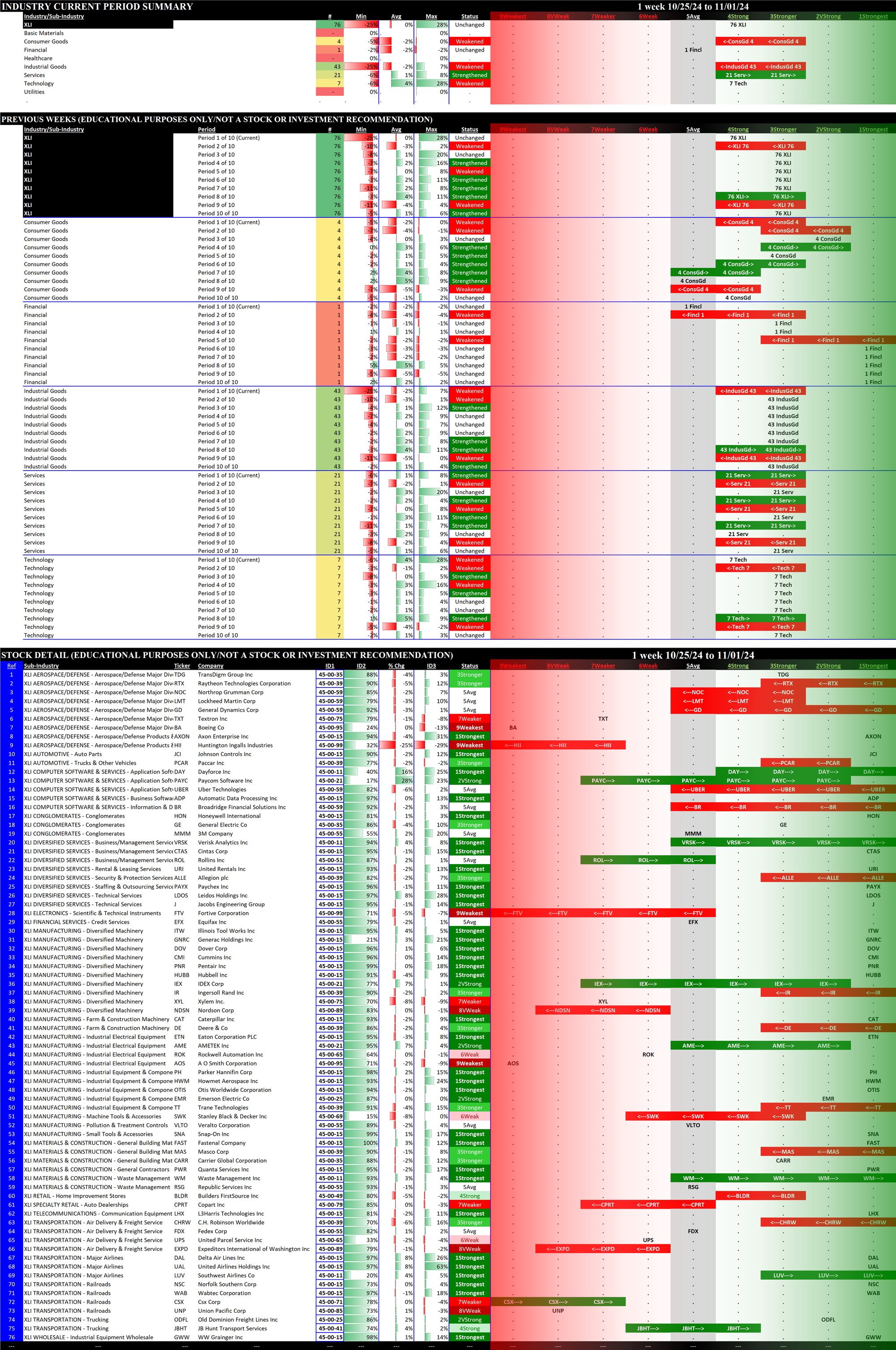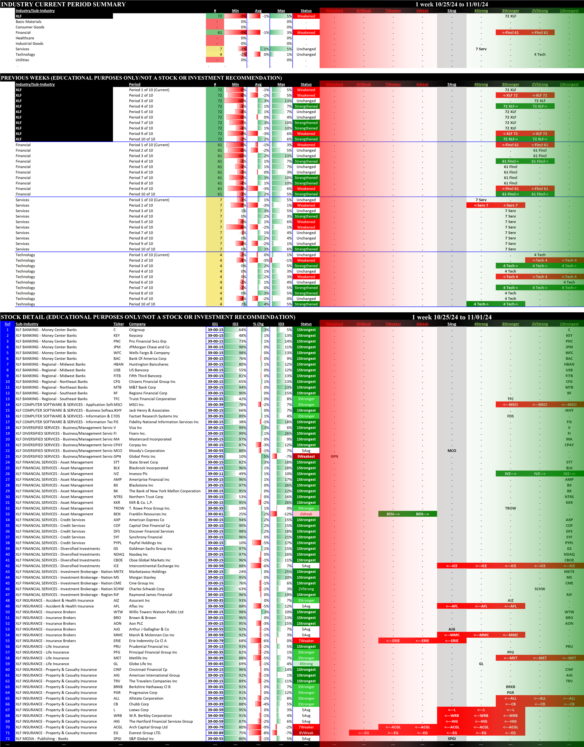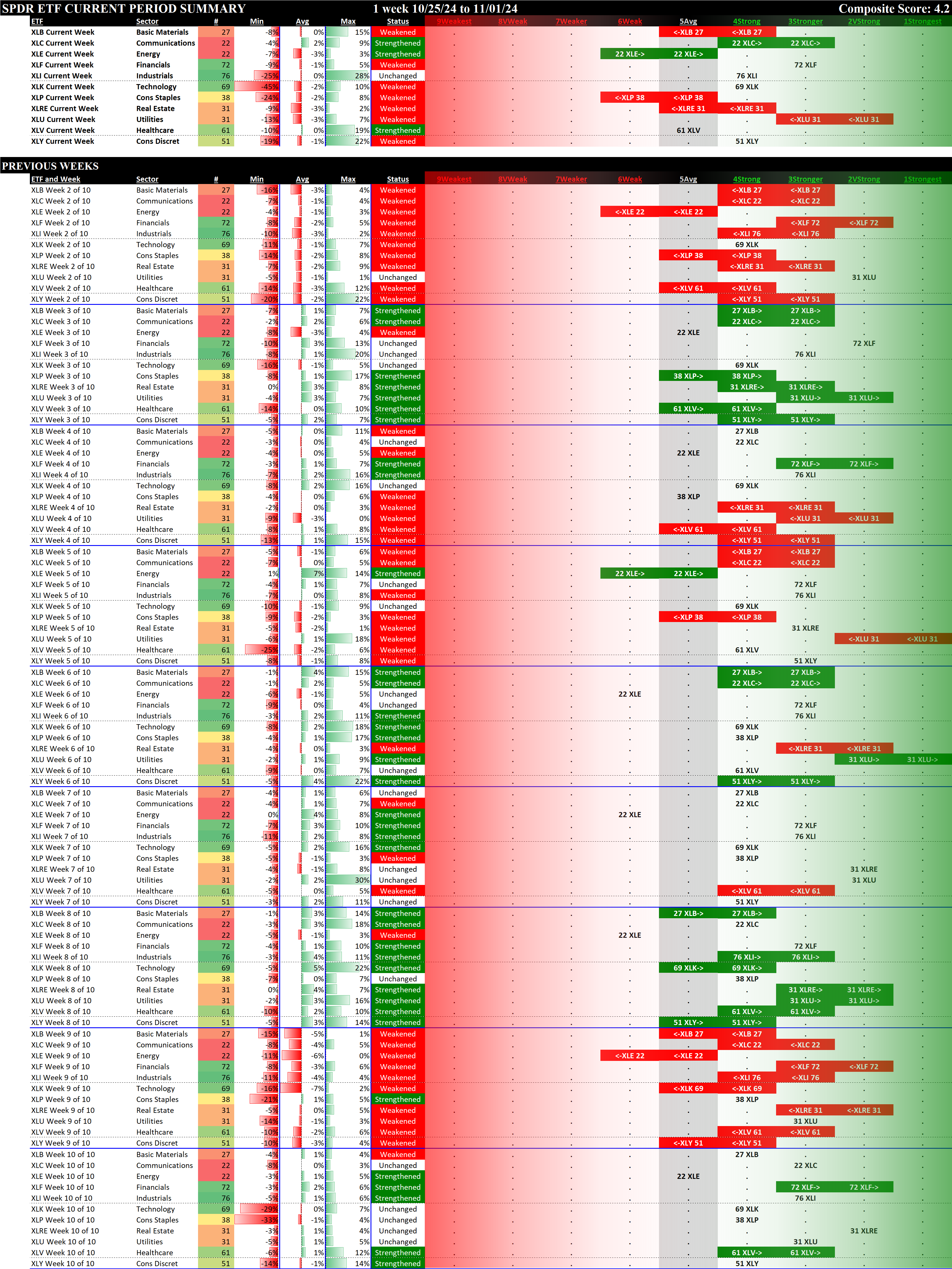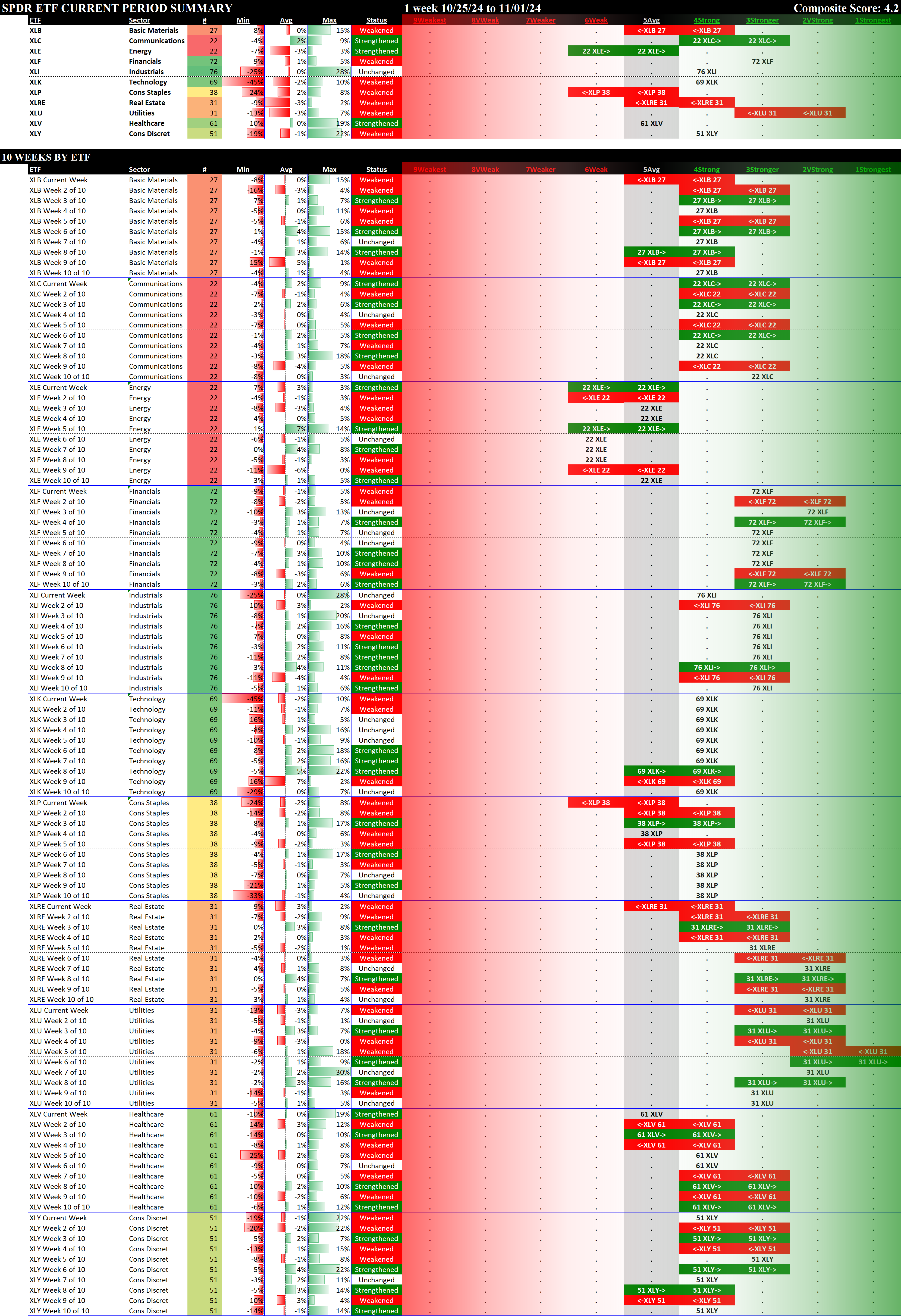 The following Stock Market Organizer strengthening/weakening analysis looks at the 11 SPDR ETFs and their underlying component stocks for the week ending Friday 2024-11-01, as follows: