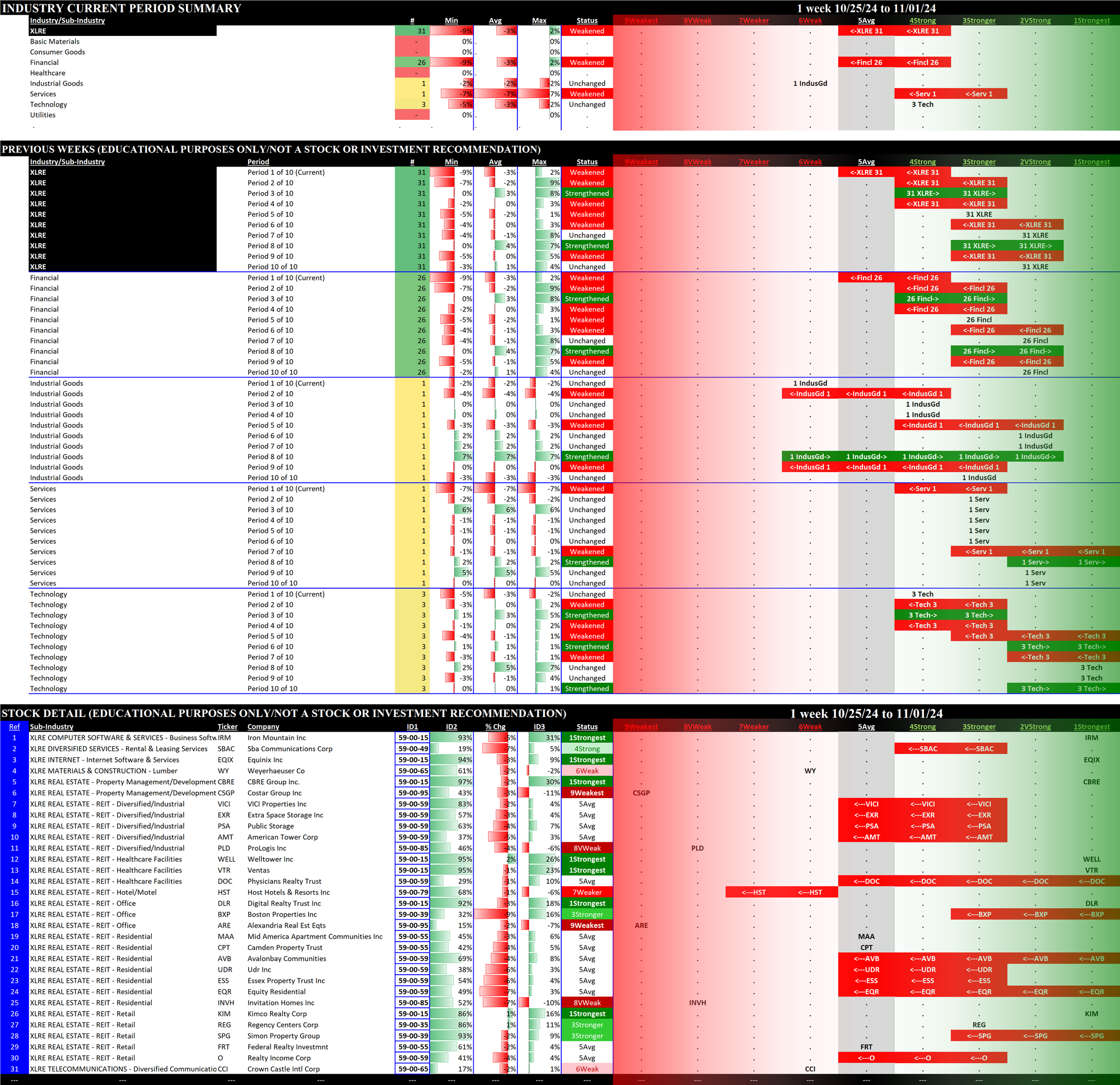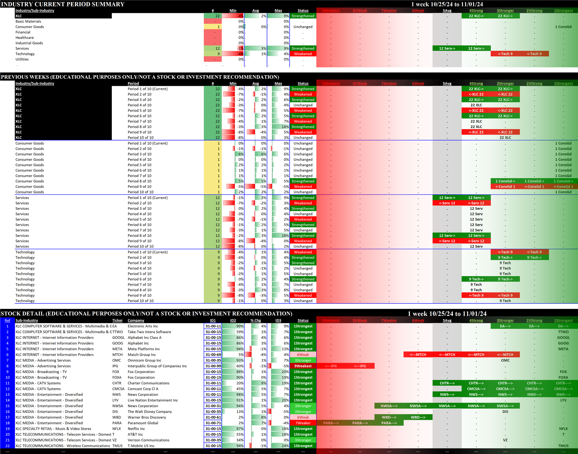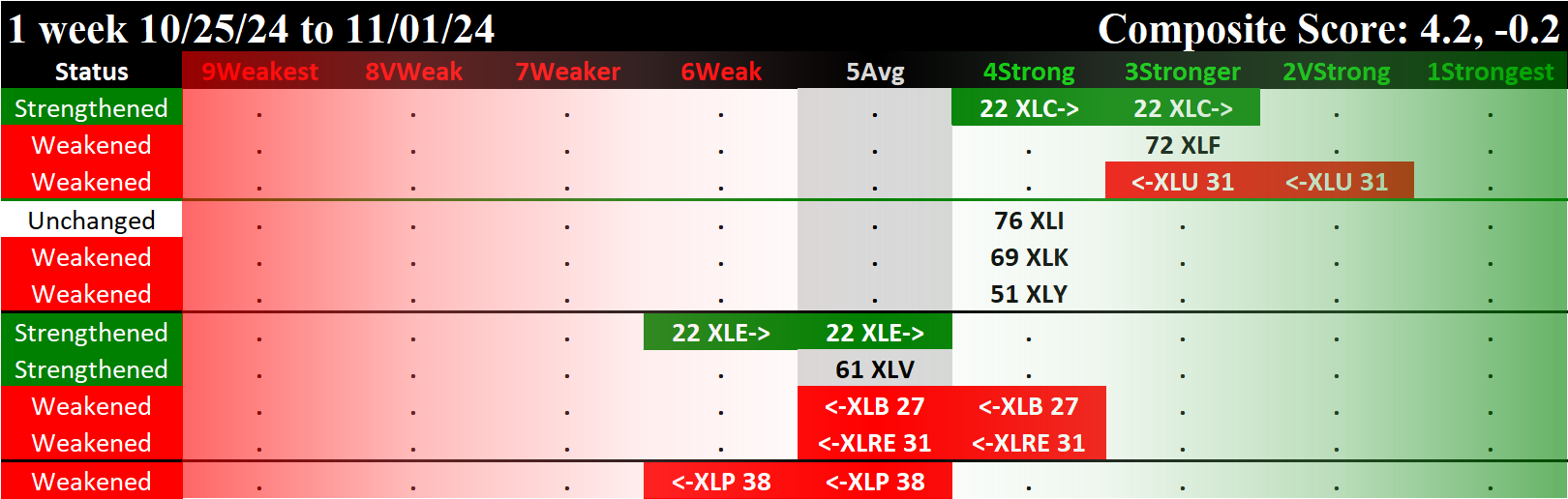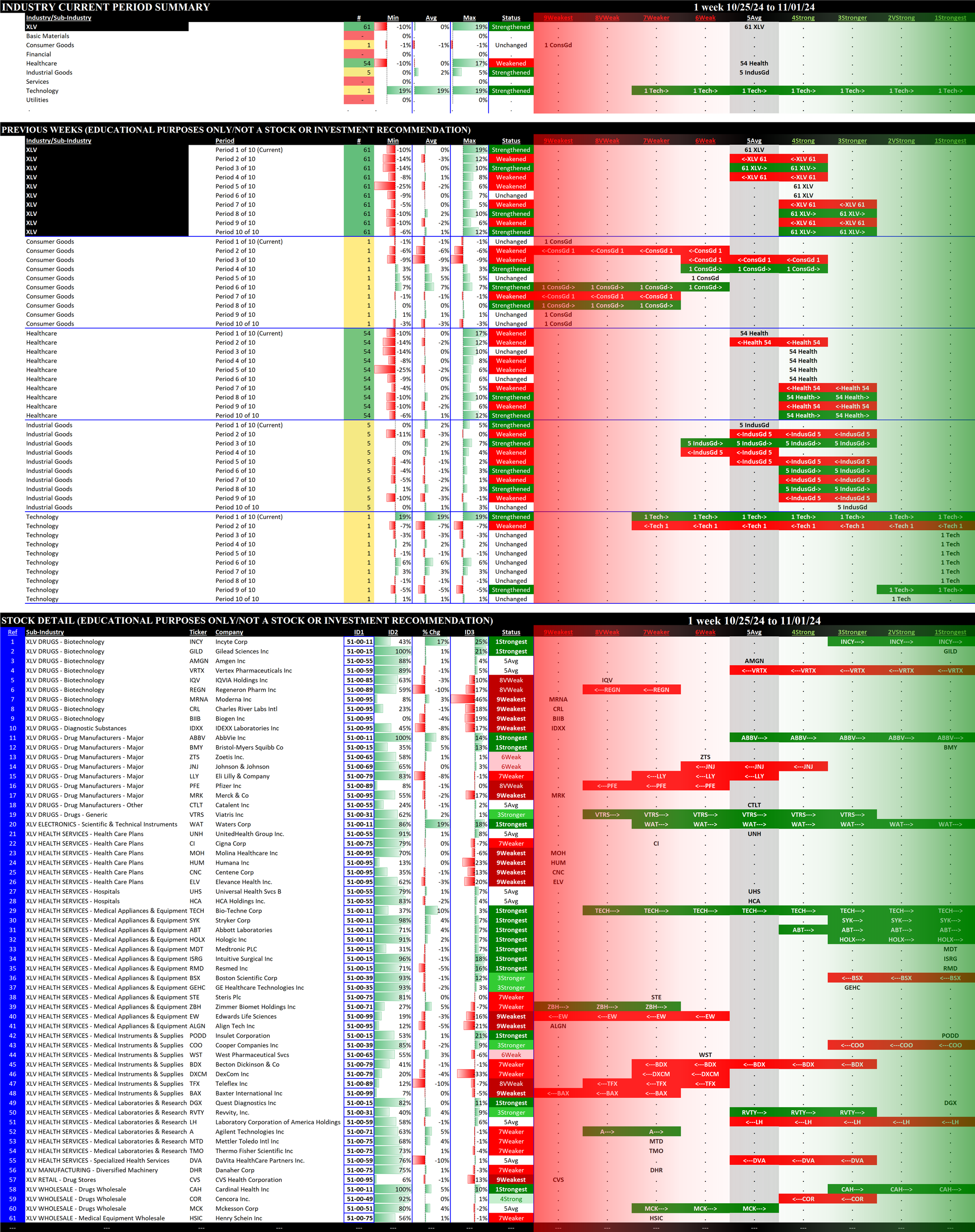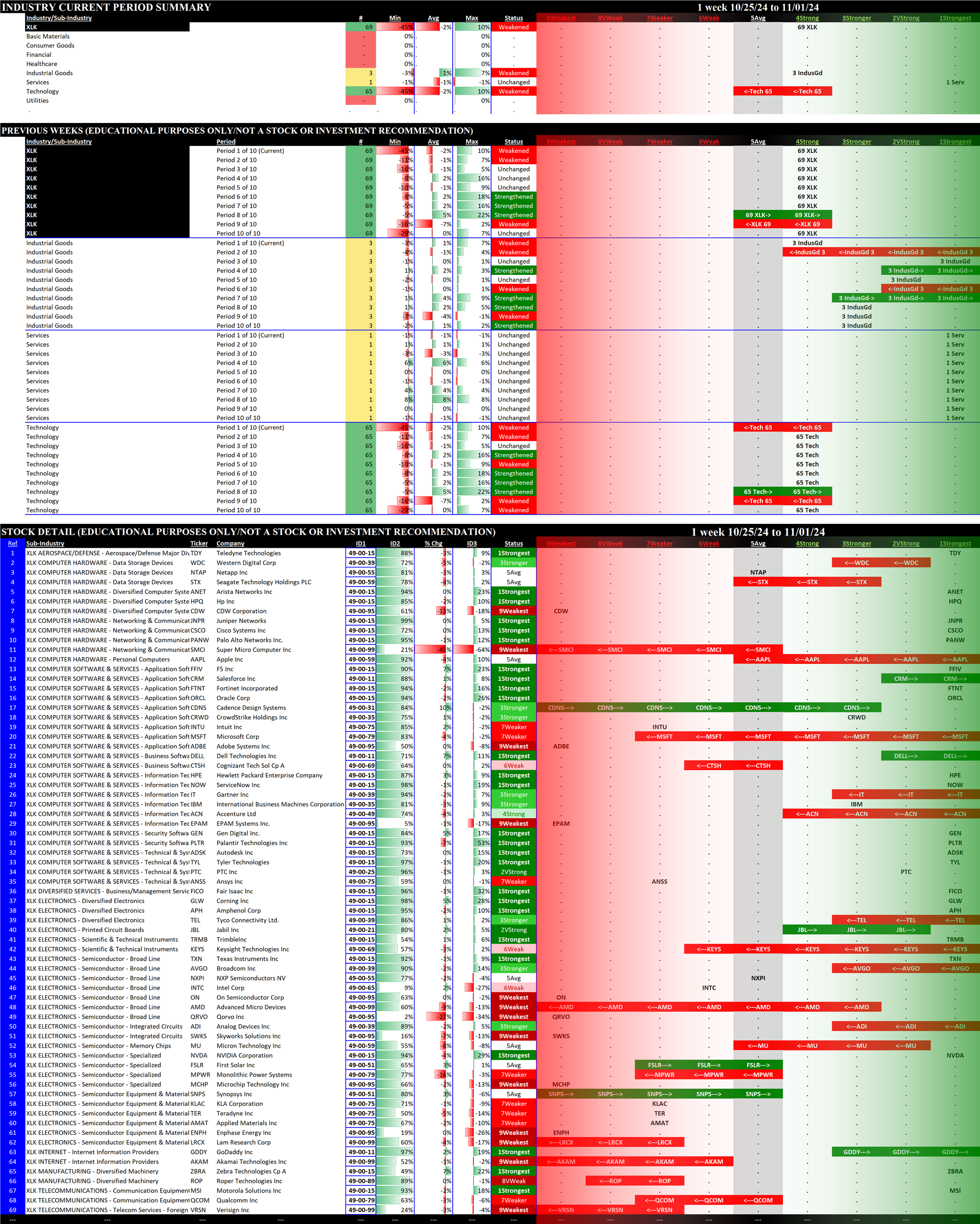 The following Stock Market Organizer strengthening/weakening analysis looks at the 11 SPDR ETFs and their underlying component stocks for the week ending Friday 2024-11-01, as follows: