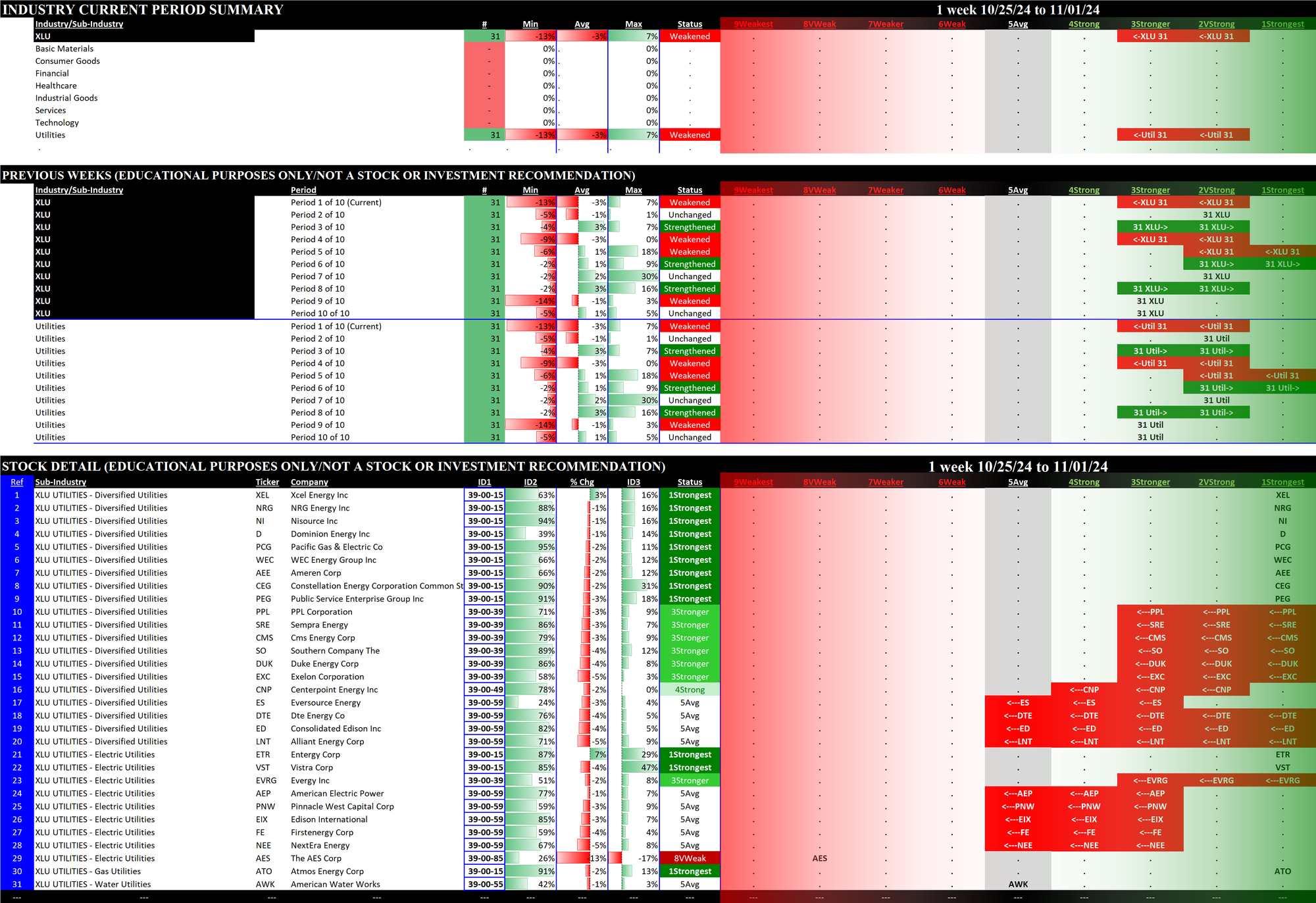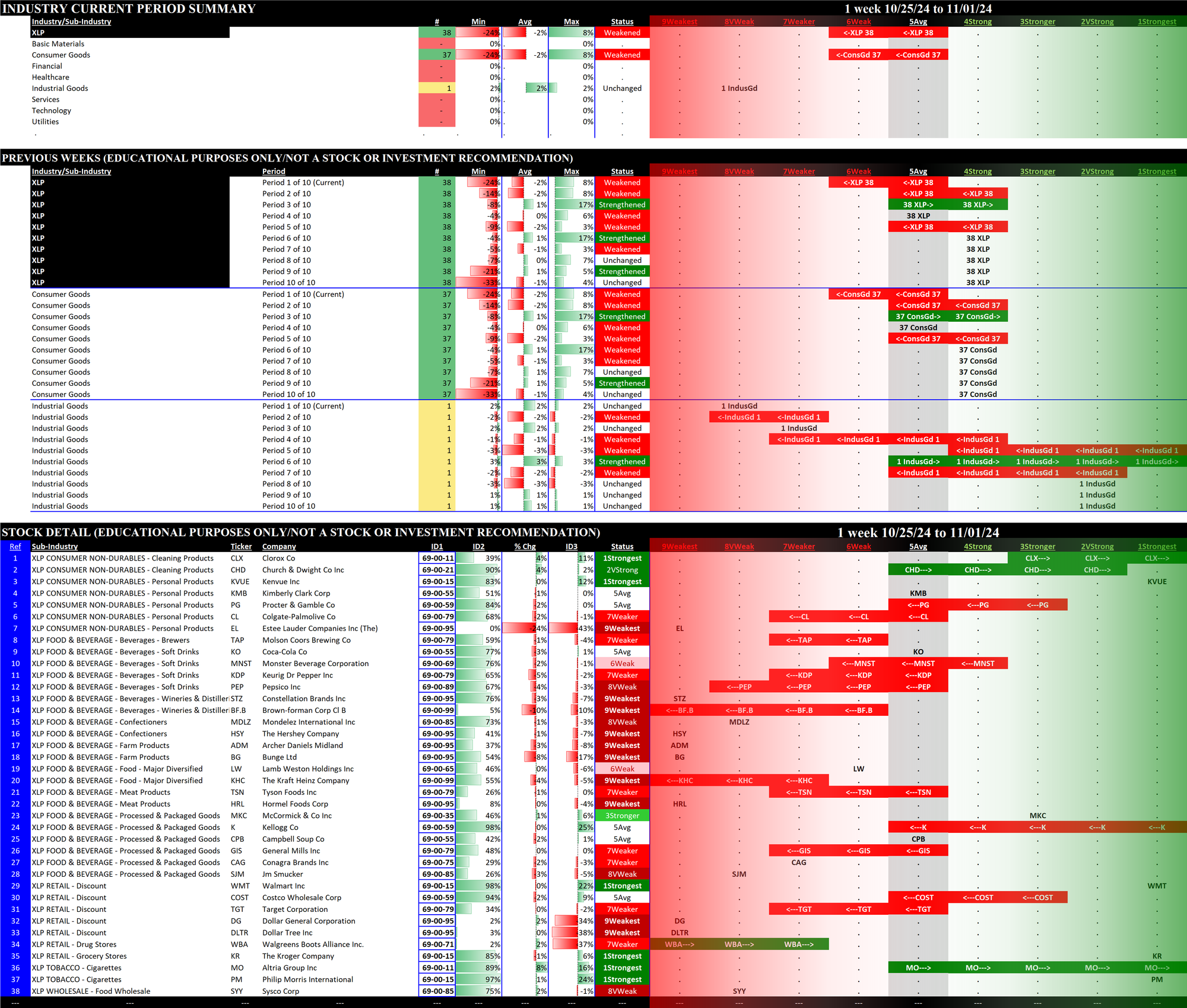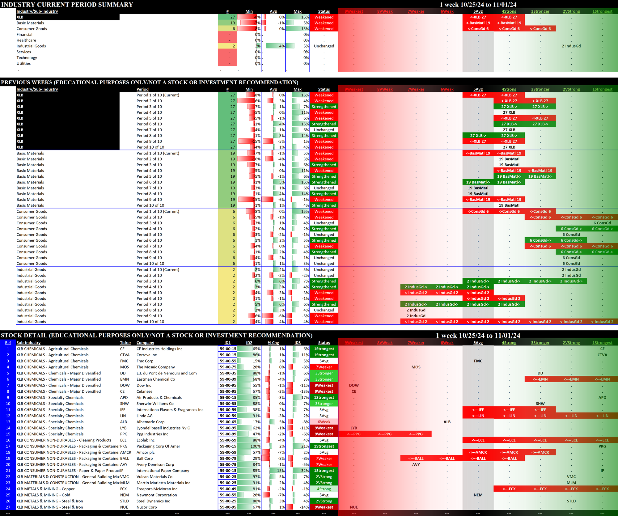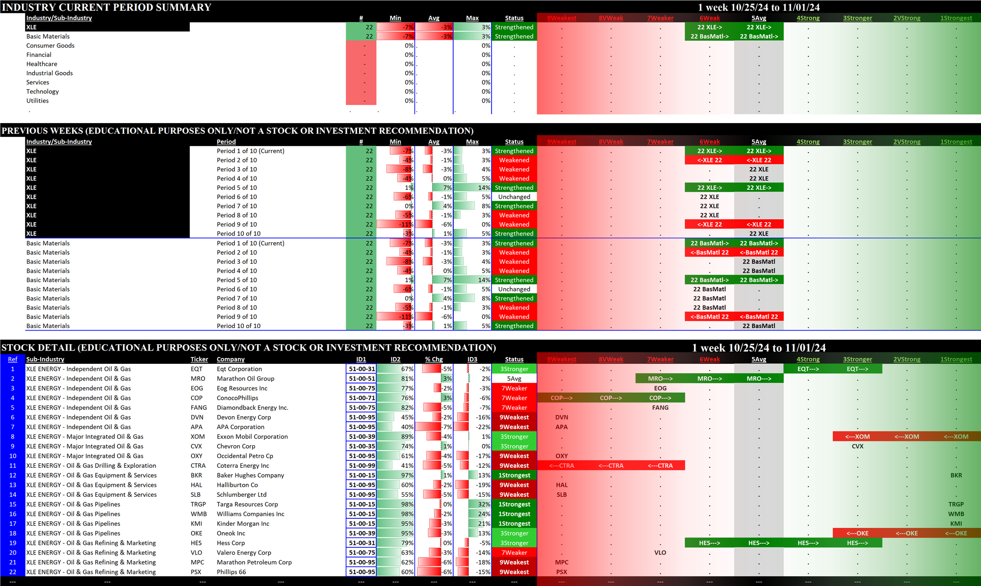 The following Stock Market Organizer strengthening/weakening analysis looks at the 11 SPDR ETFs and their underlying component stocks for the week ending Friday 2024-11-01, as follows: