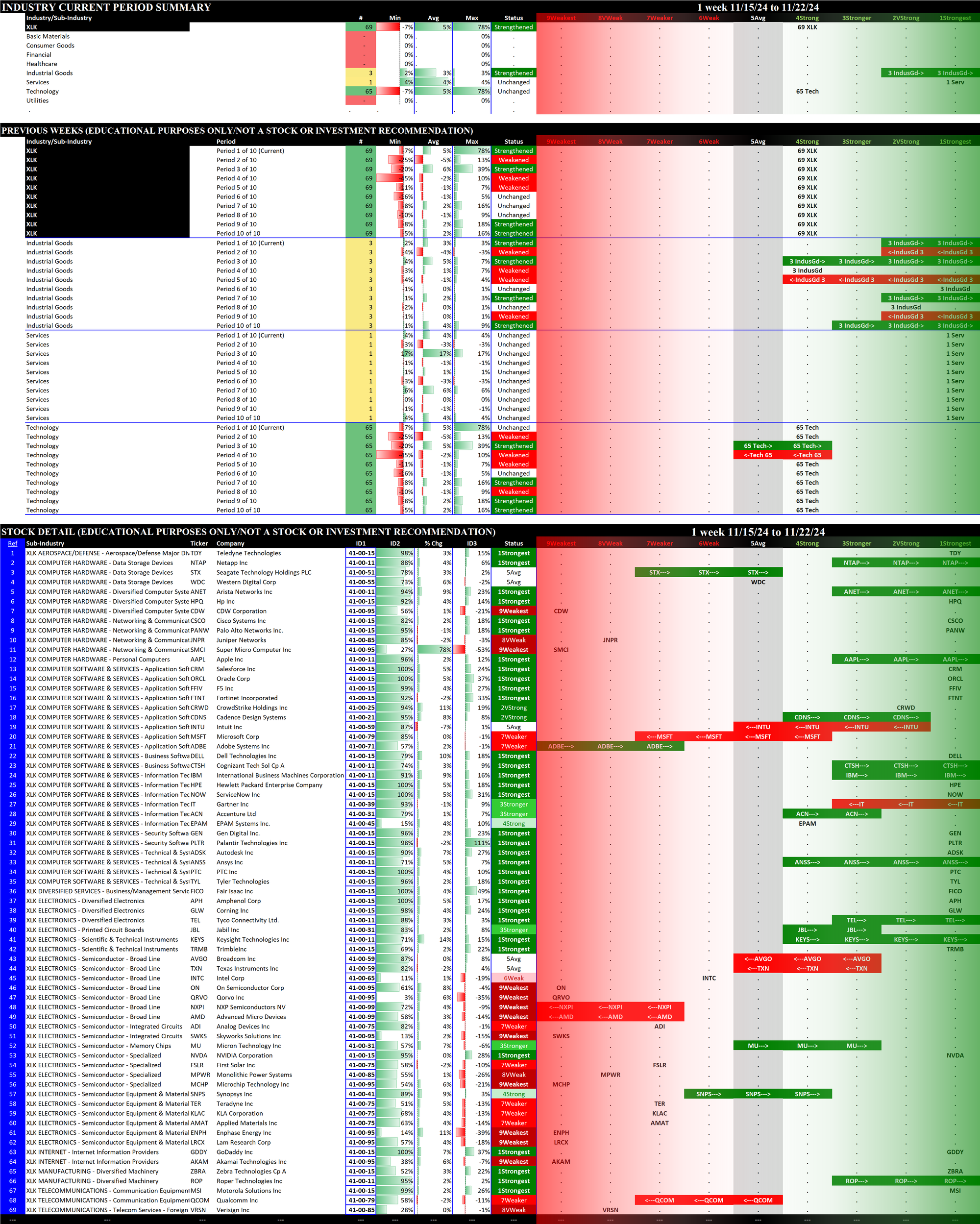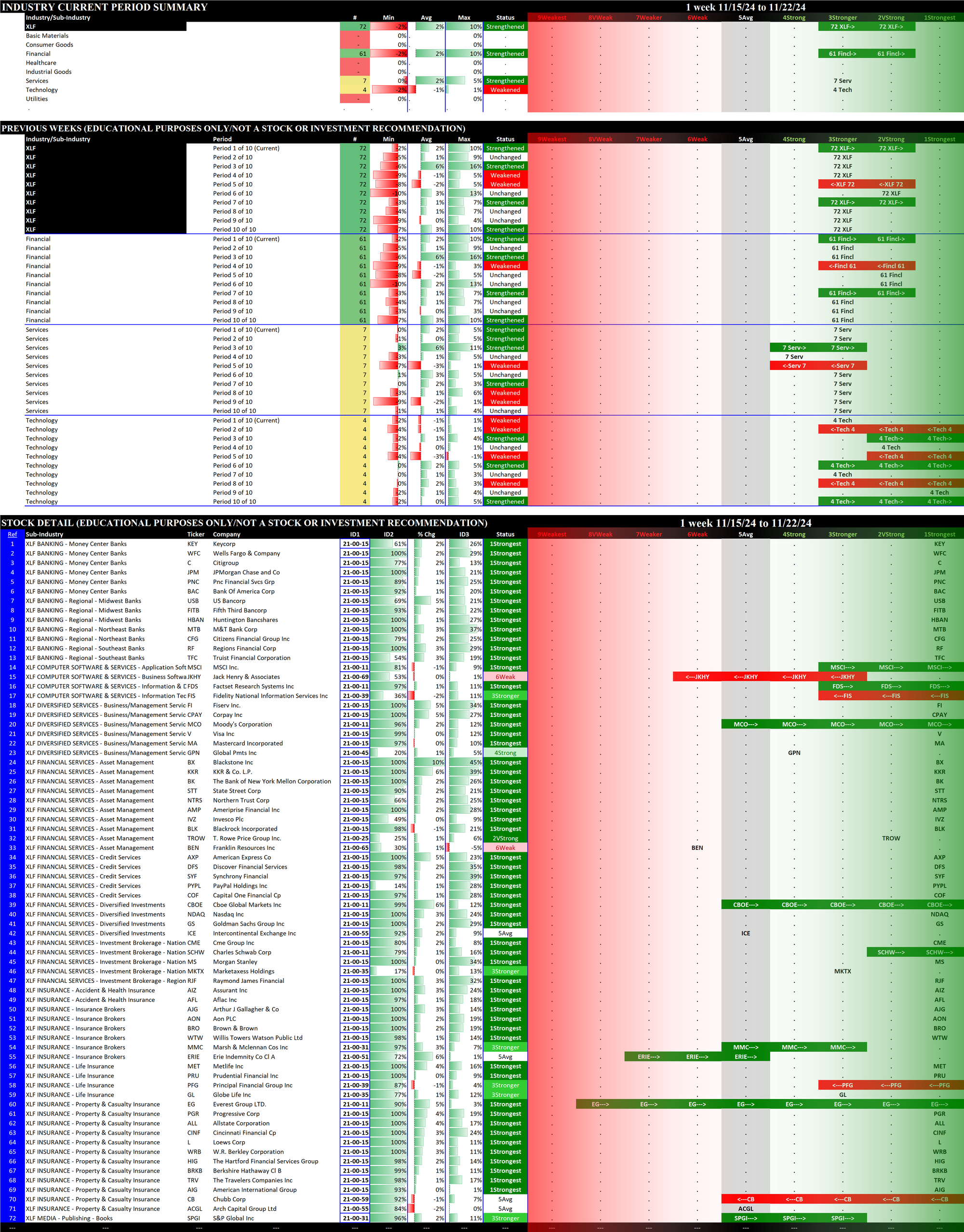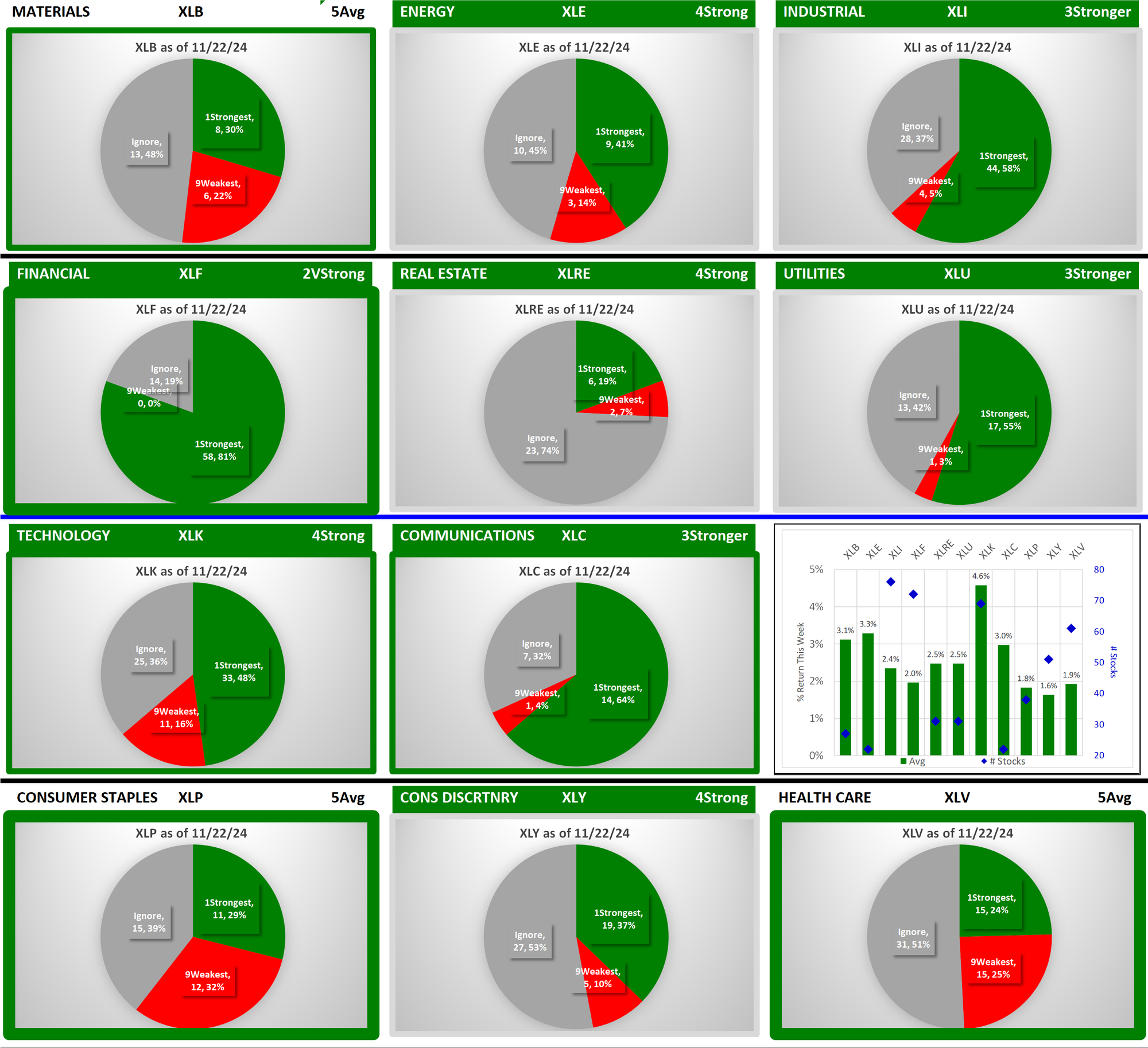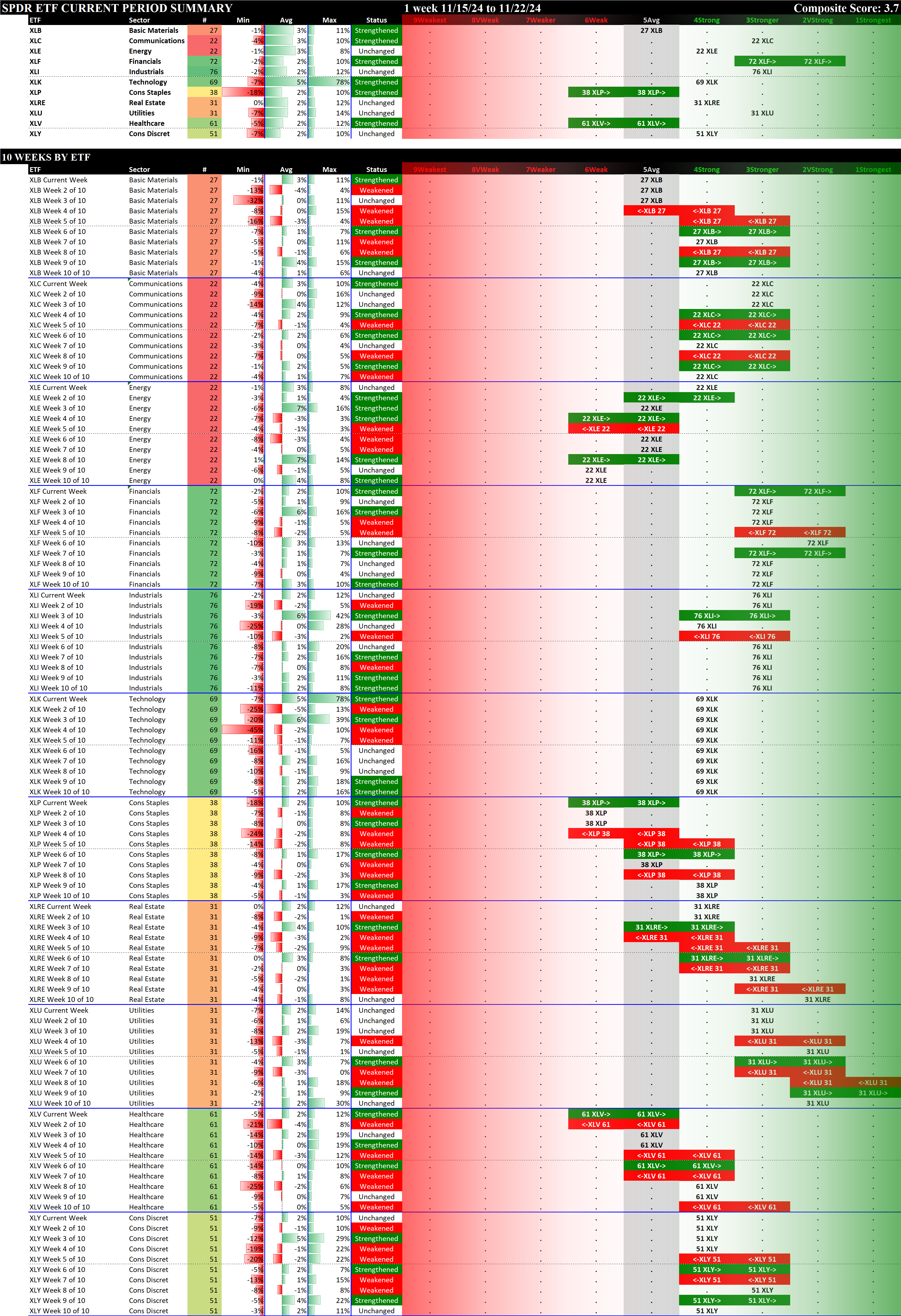 The following Stock Market Organizer strengthening/weakening analysis looks at the 11 SPDR ETFs and their underlying component stocks for the week ending Friday 2024-11-22, as follows: