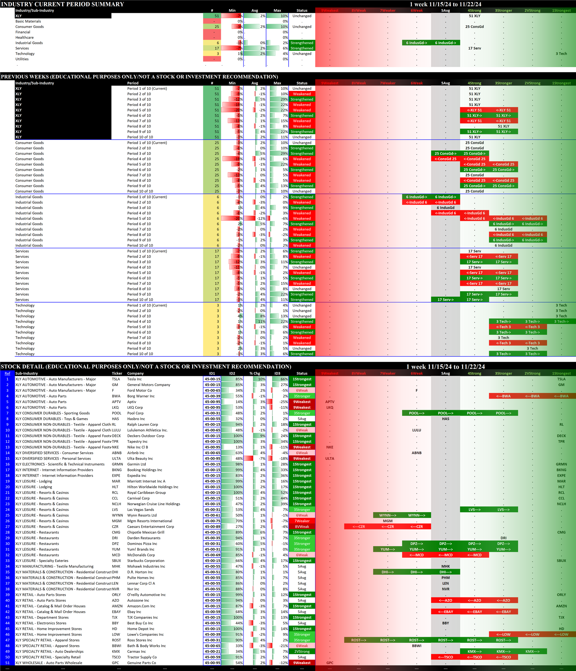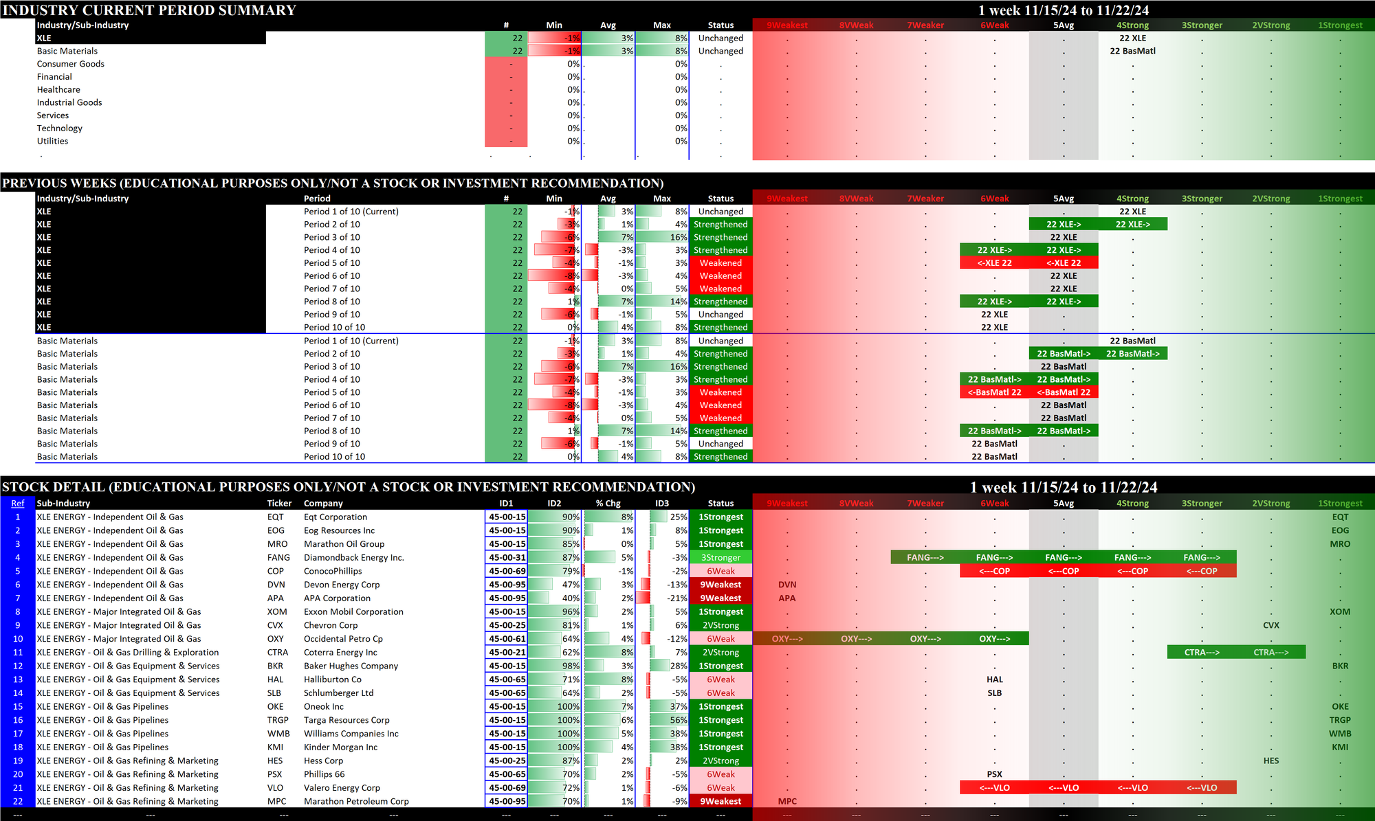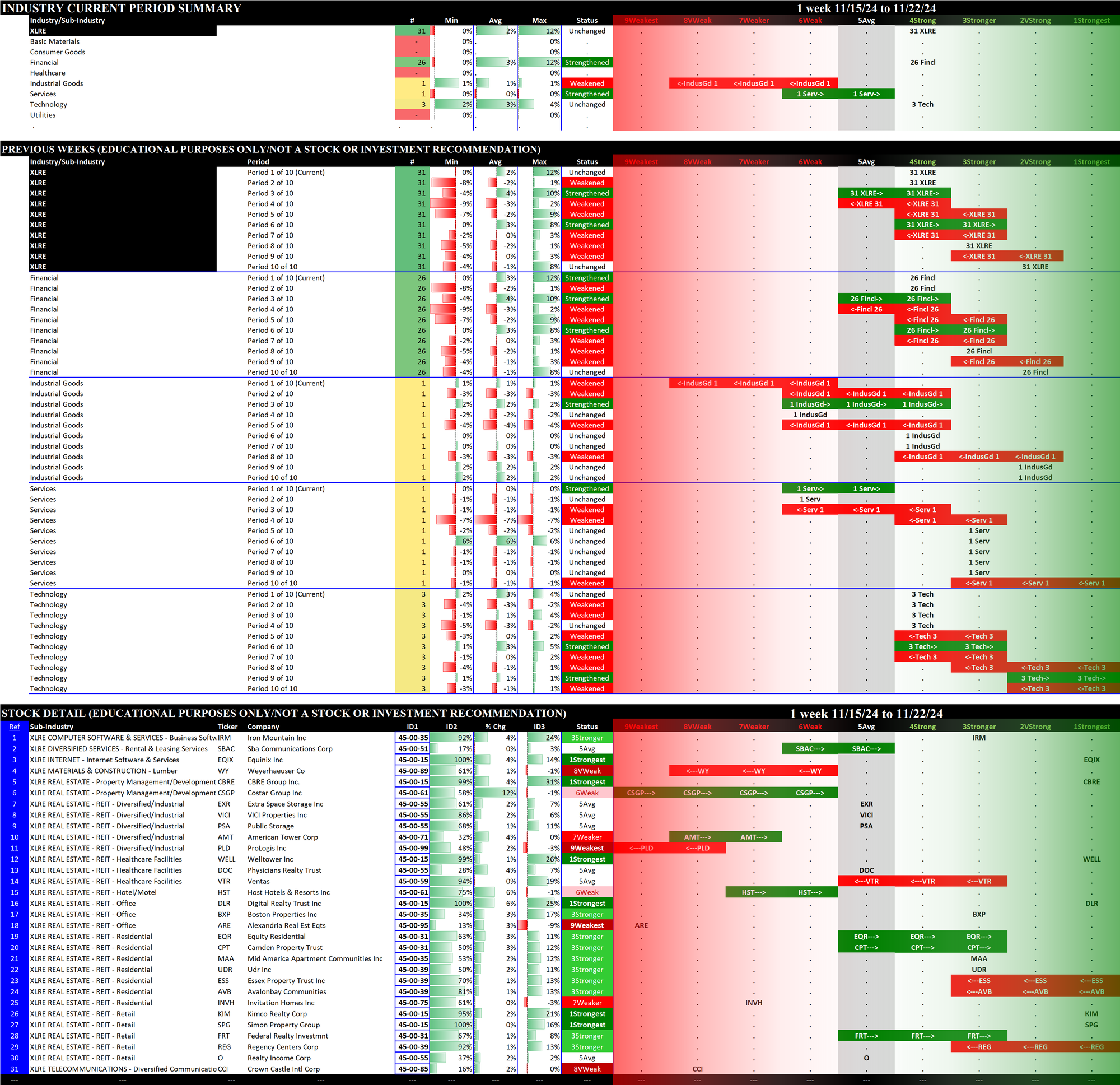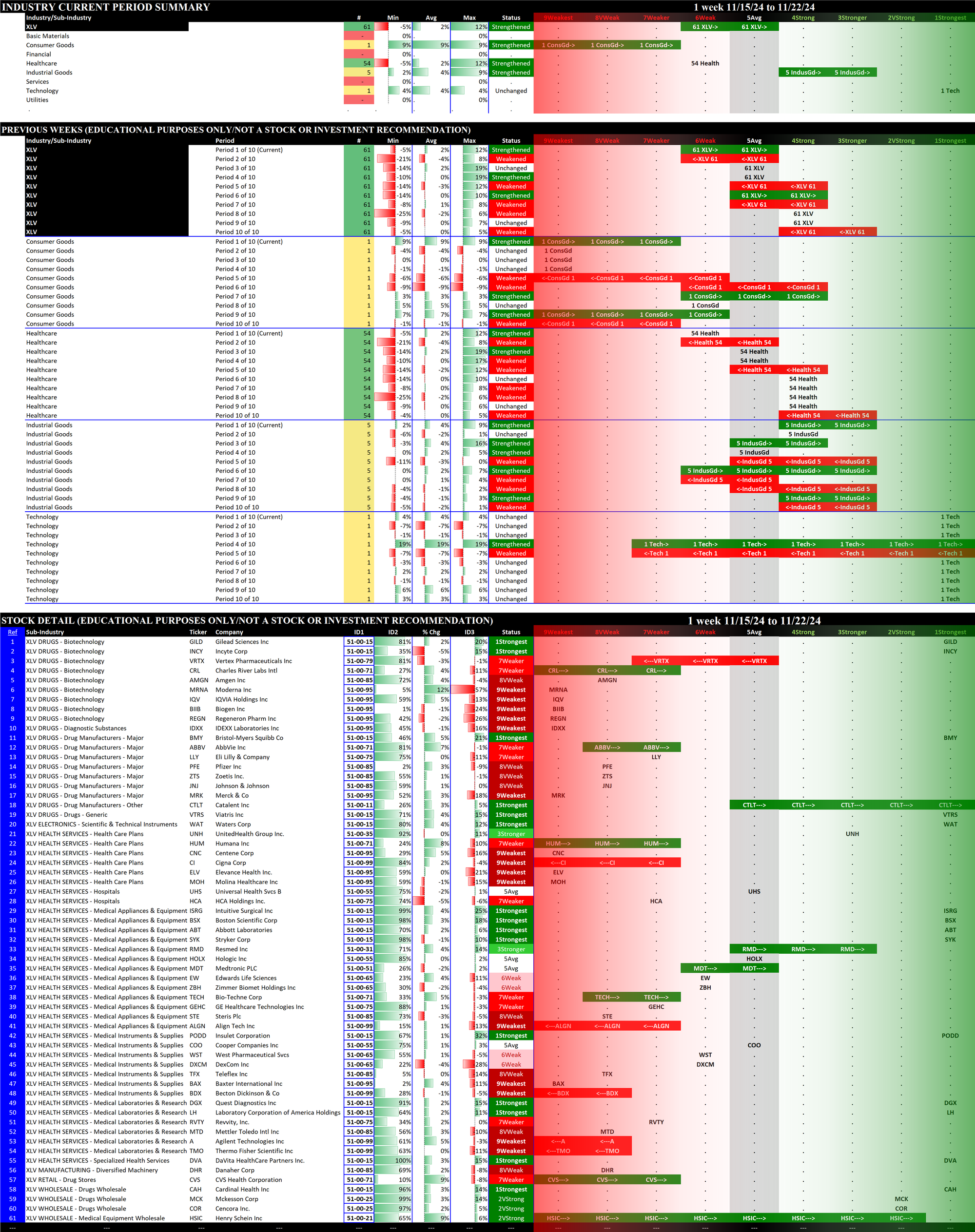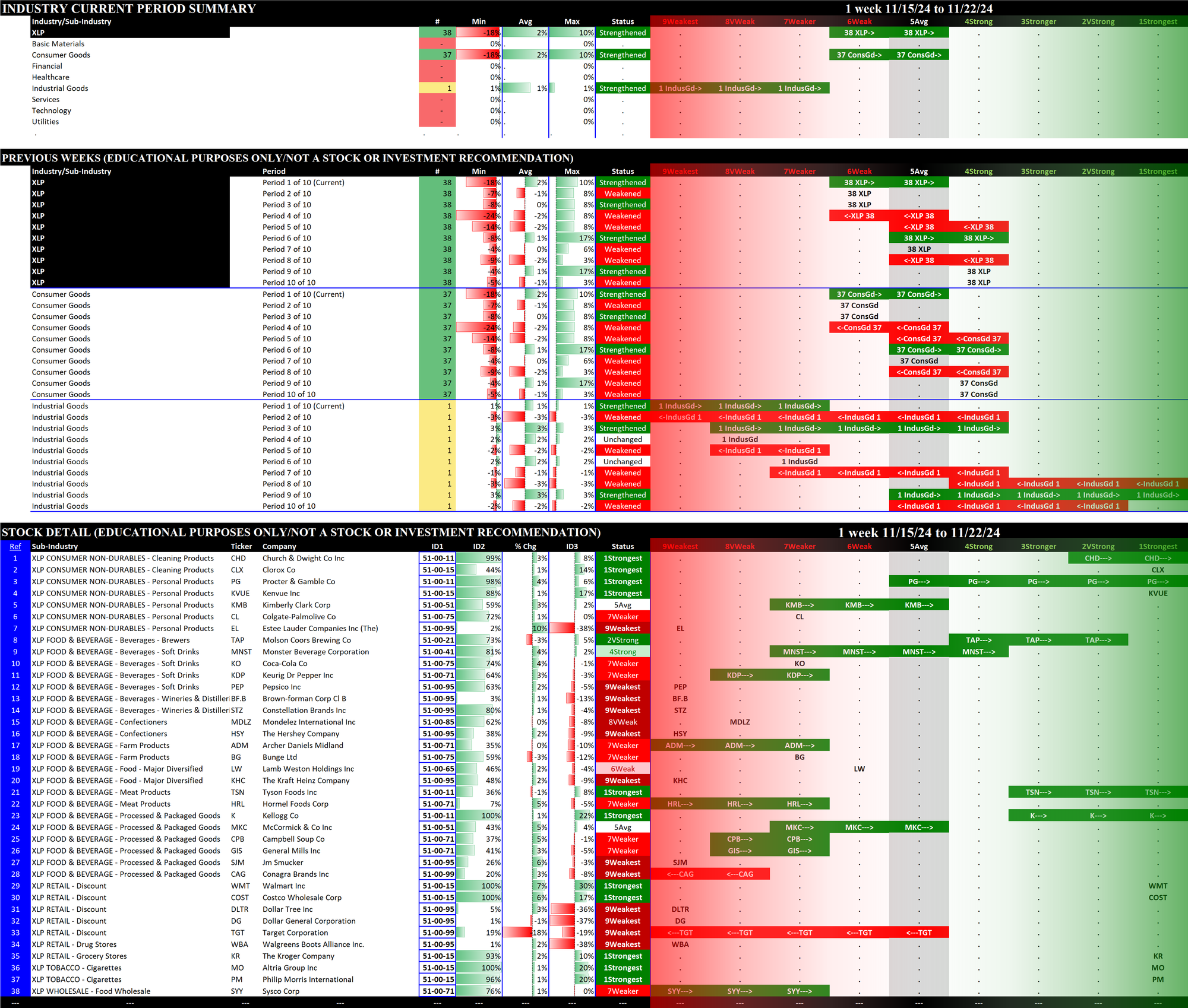 The following Stock Market Organizer strengthening/weakening analysis looks at the 11 SPDR ETFs and their underlying component stocks for the week ending Friday 2024-11-22, as follows: