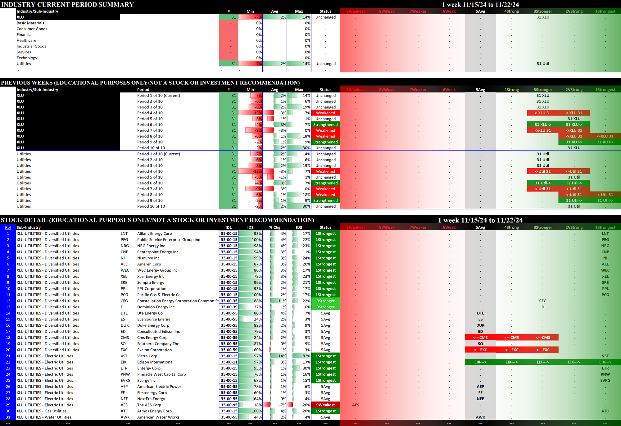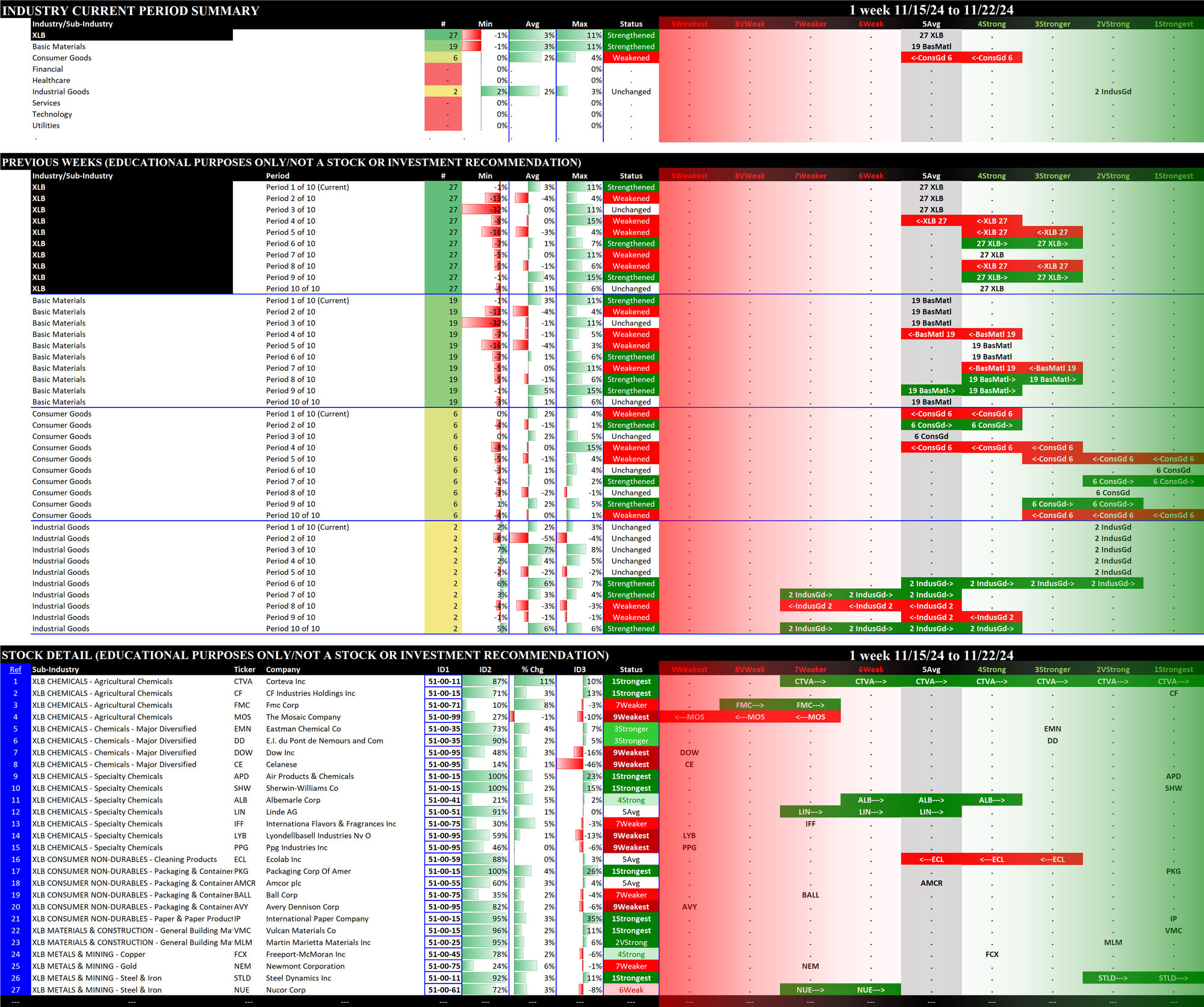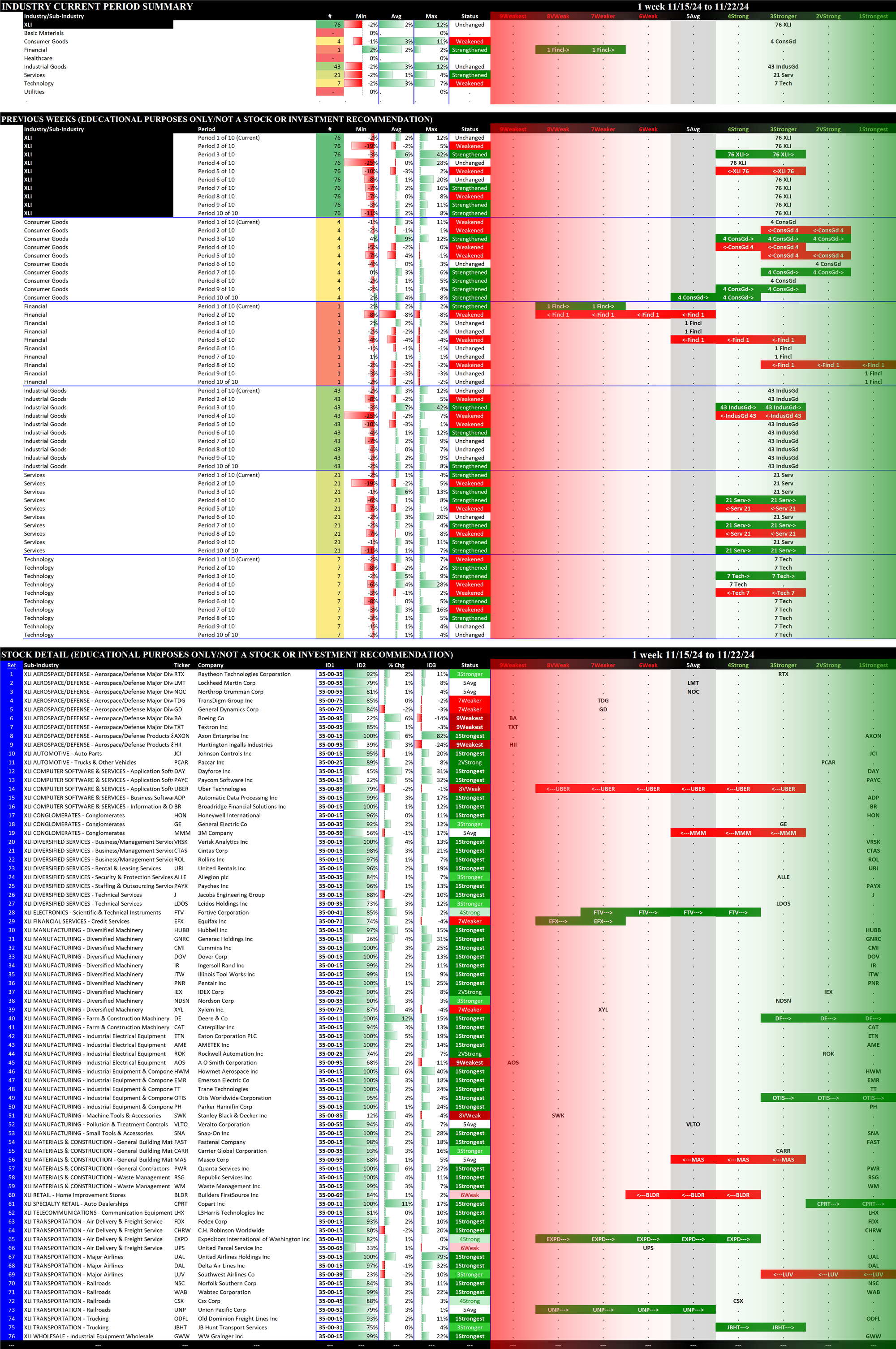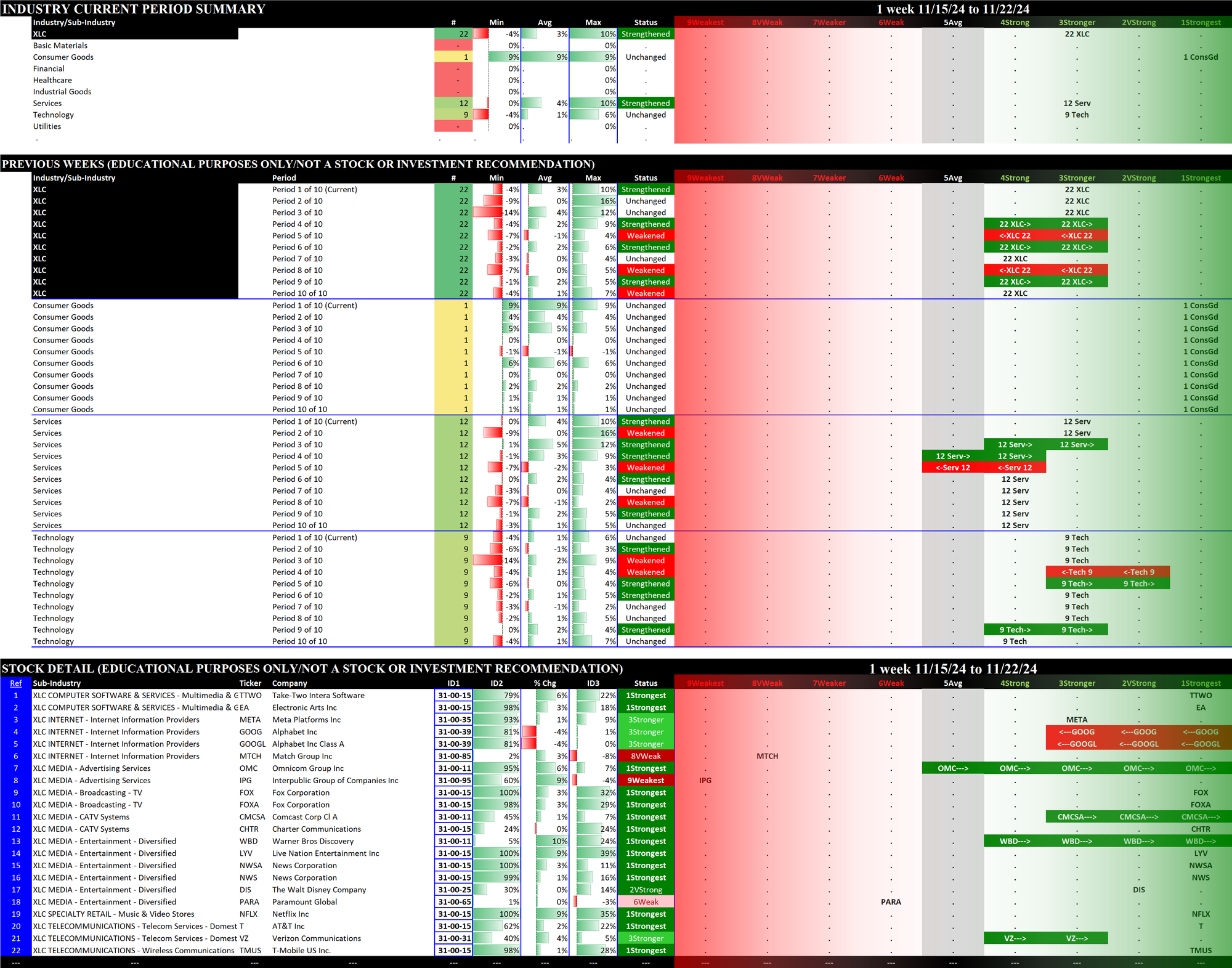 The following Stock Market Organizer strengthening/weakening analysis looks at the 11 SPDR ETFs and their underlying component stocks for the week ending Friday 2024-11-22, as follows: