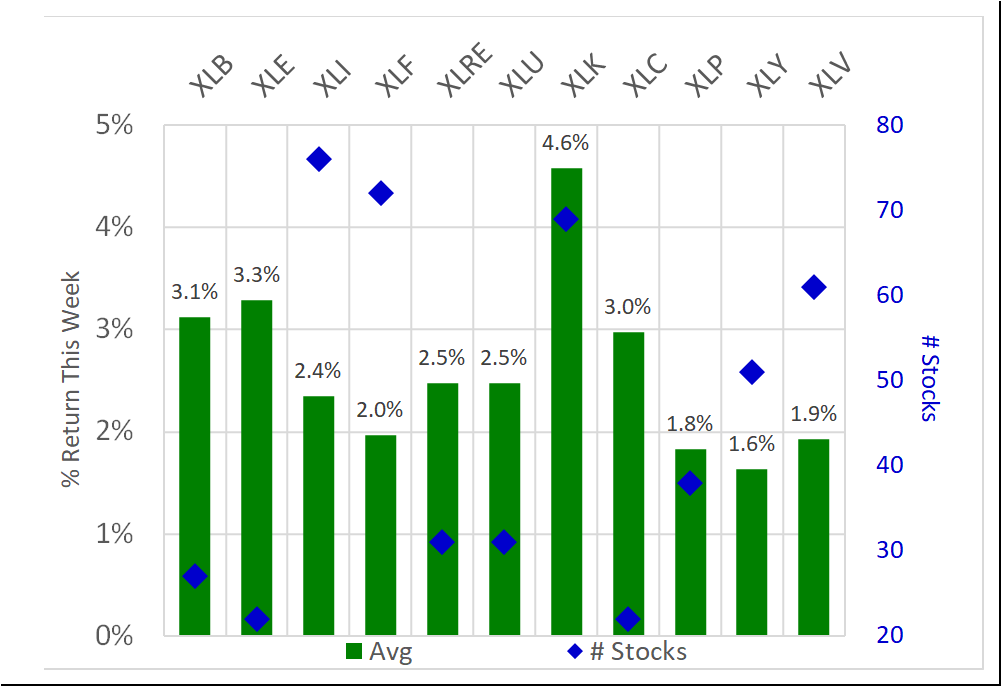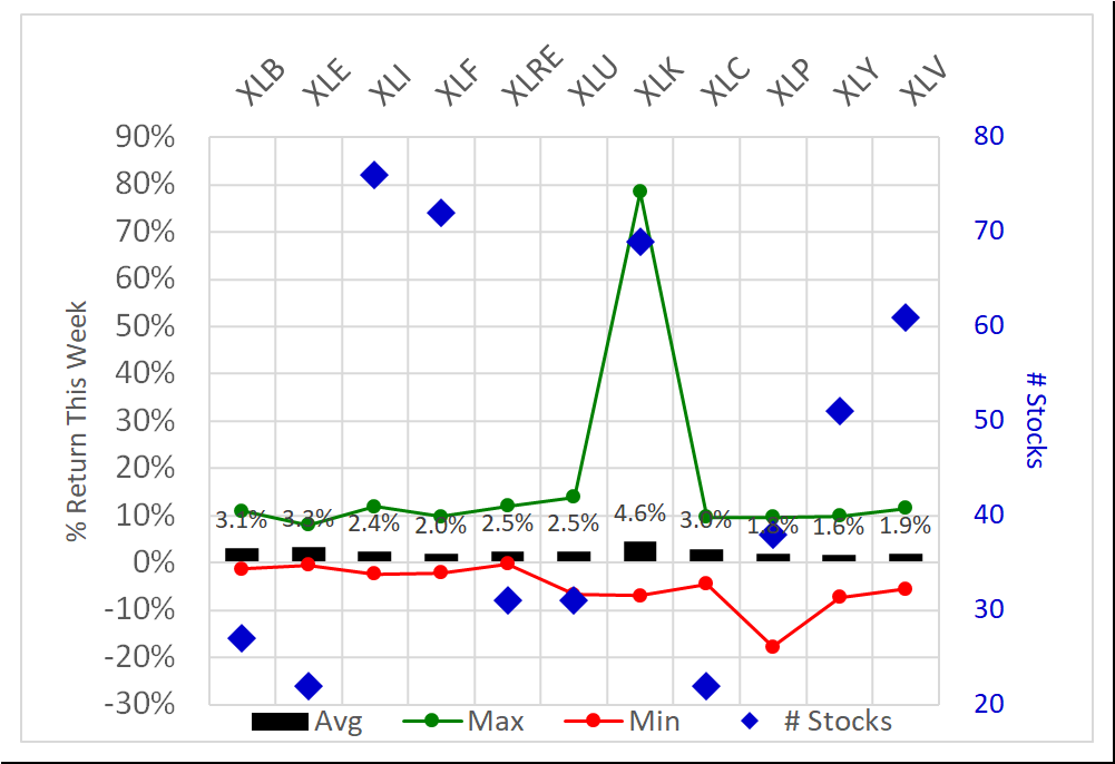 The average returns for the underlying stocks in each ETF are shown below. All were positive, ranging between +1.6% to +4.6%, with the best and worst three highlighted below: