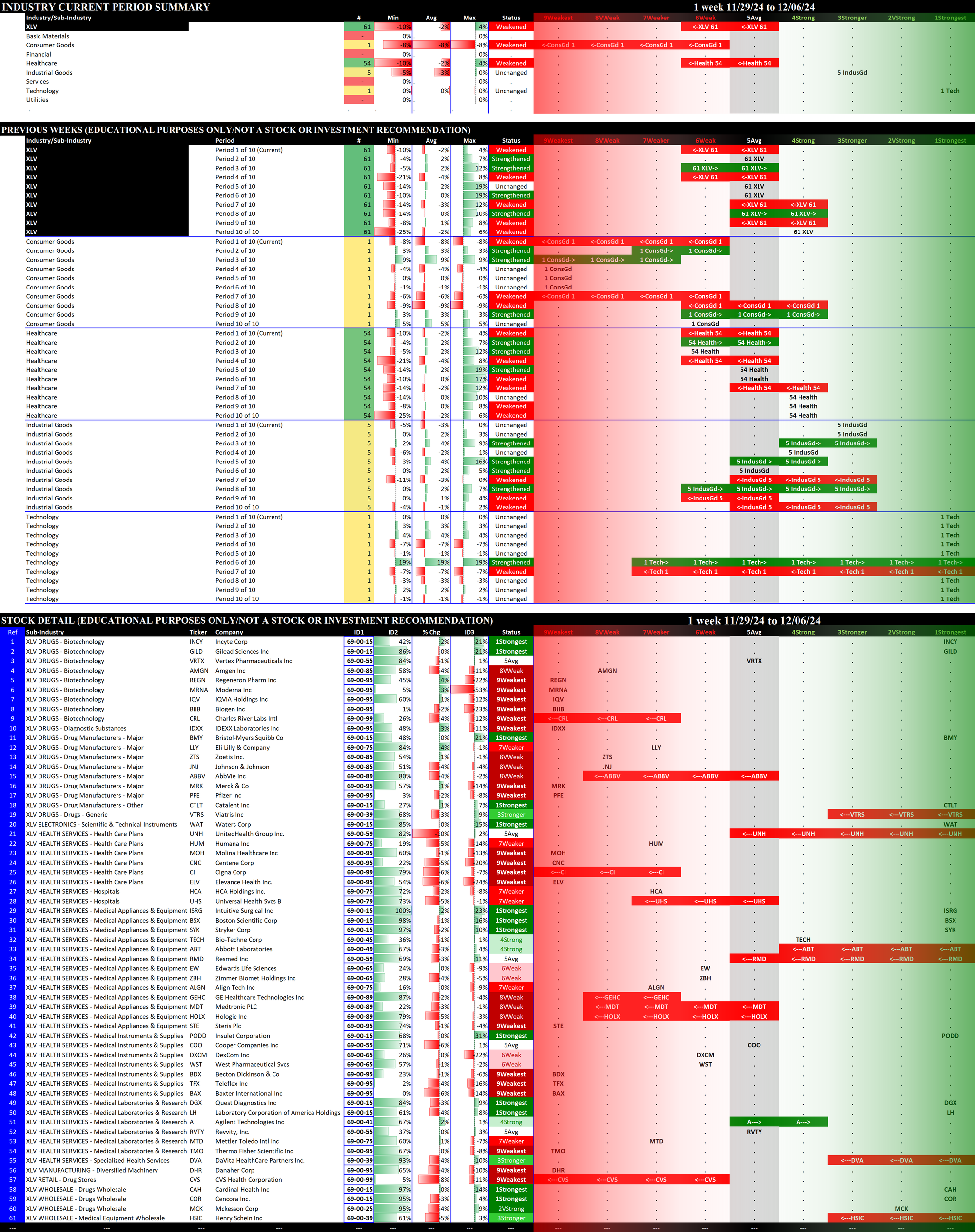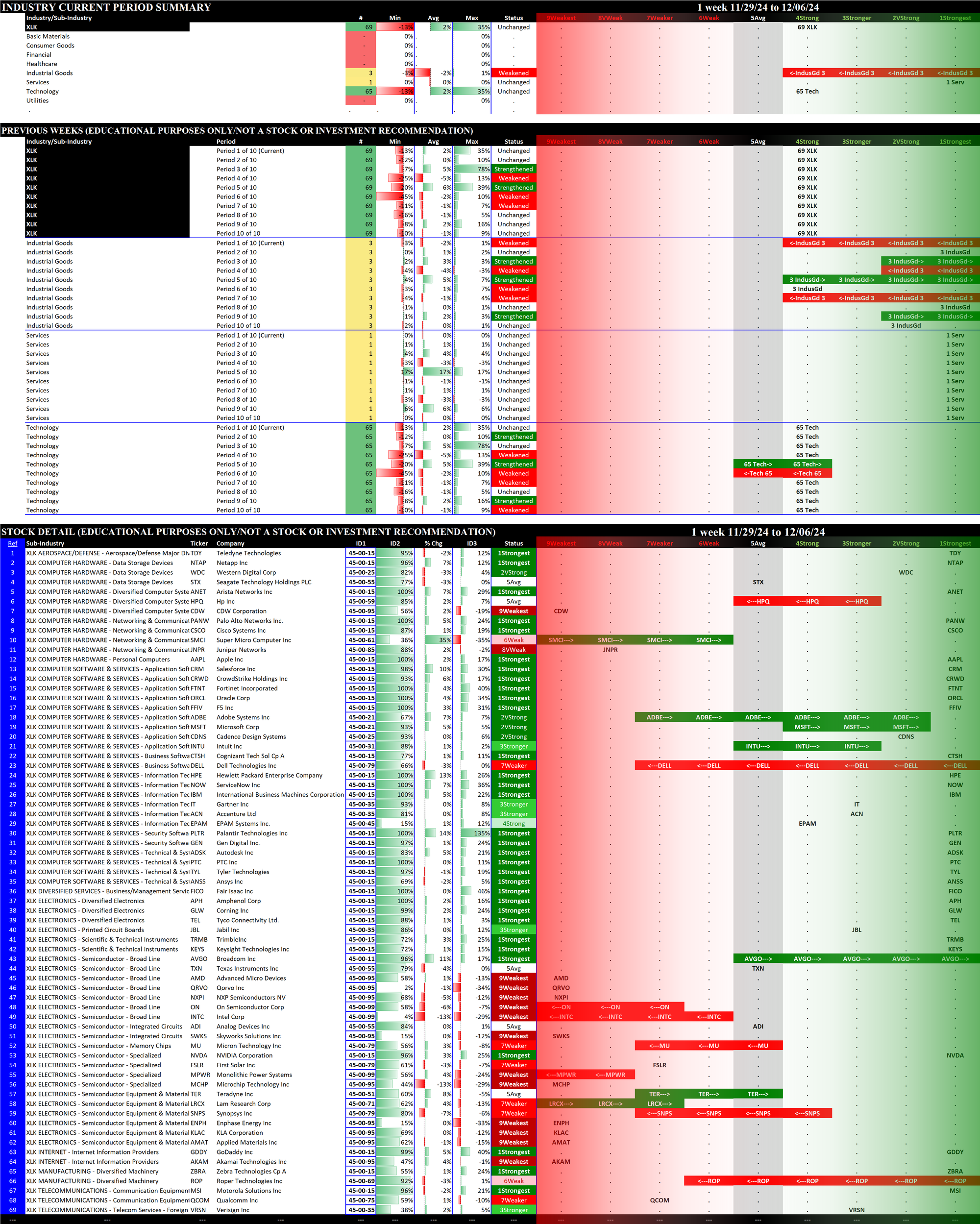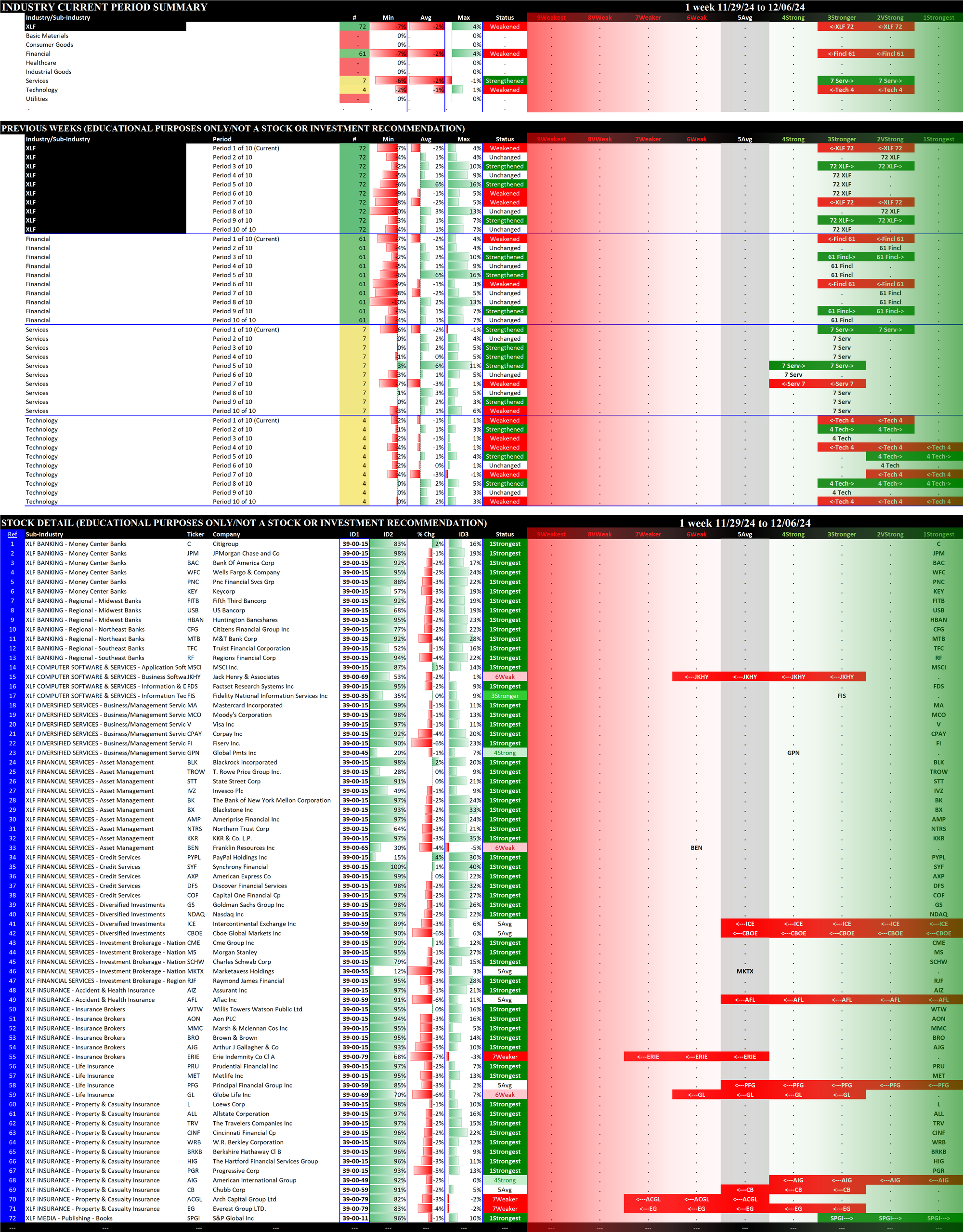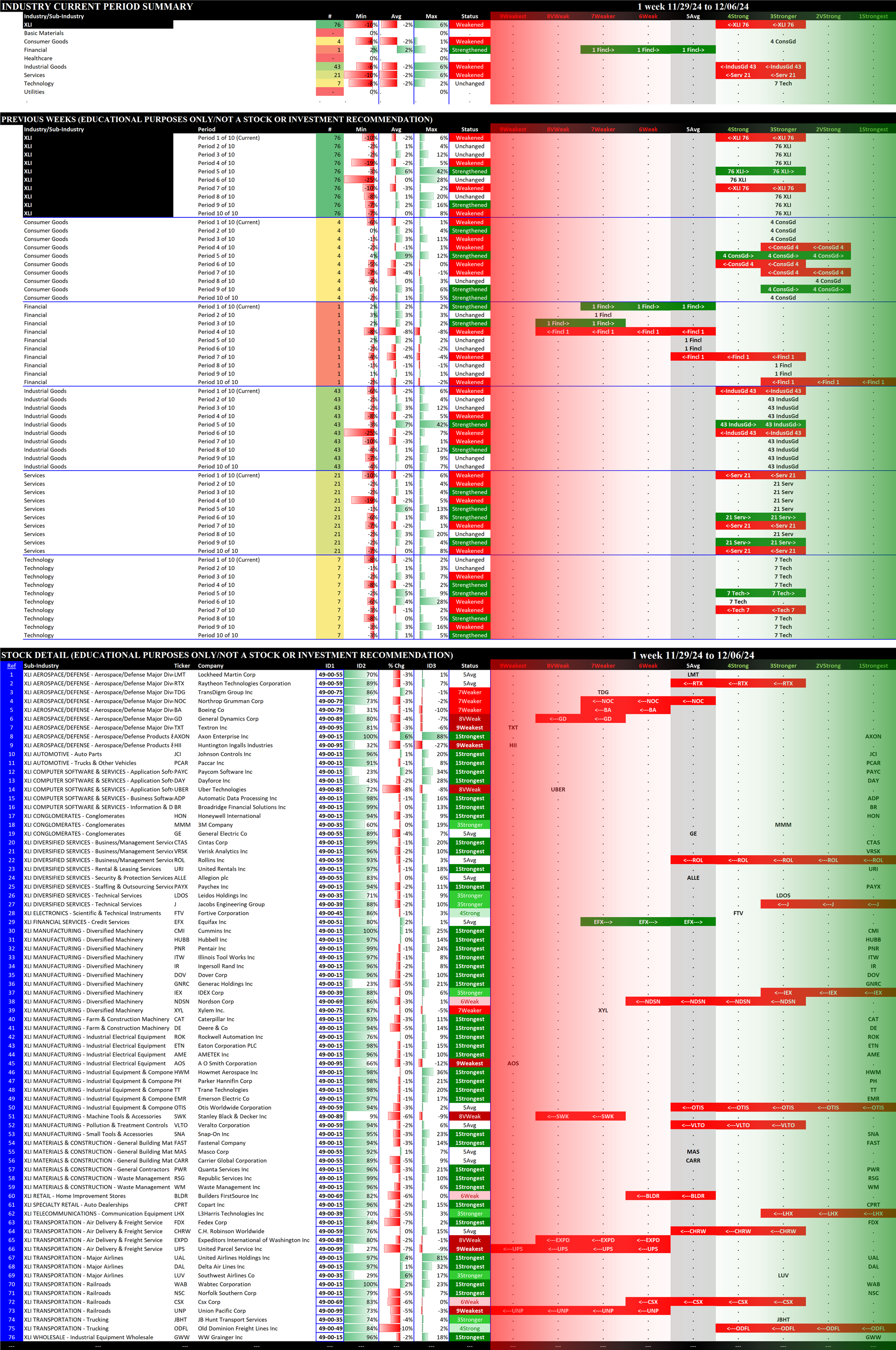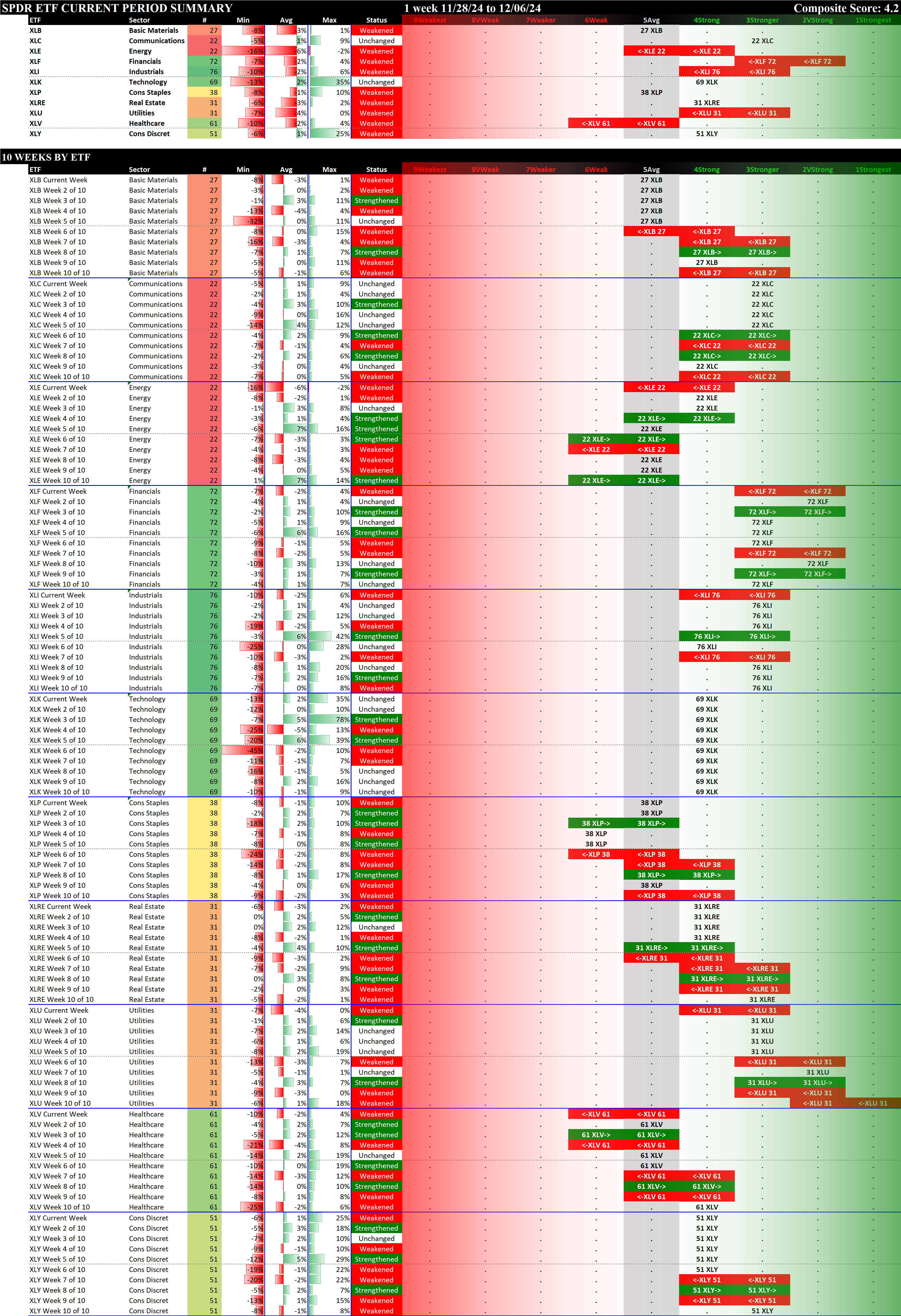 The following Stock Market Organizer strengthening/weakening analysis looks at the 11 SPDR ETFs and their underlying component stocks for the week ending Friday 2024-12-06, as follows: