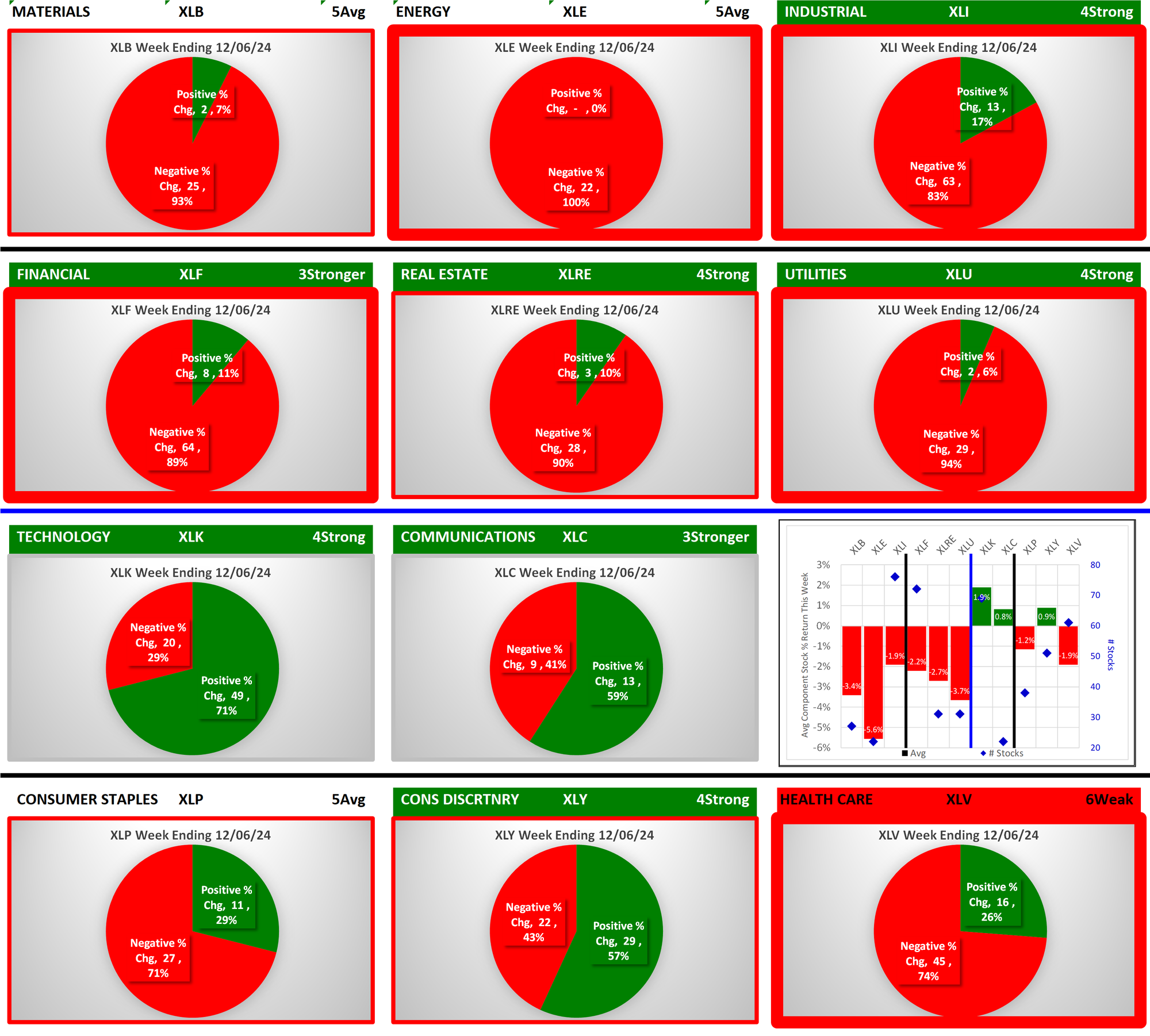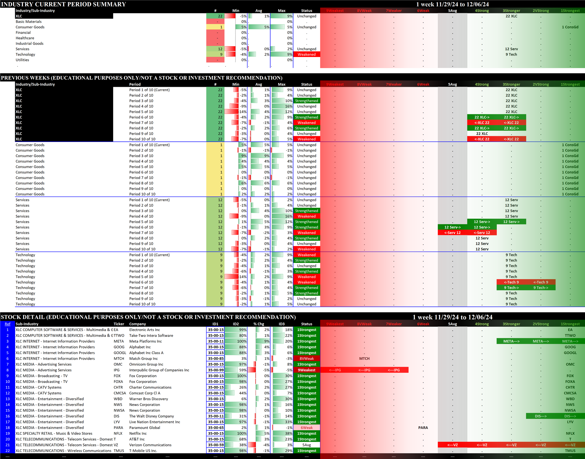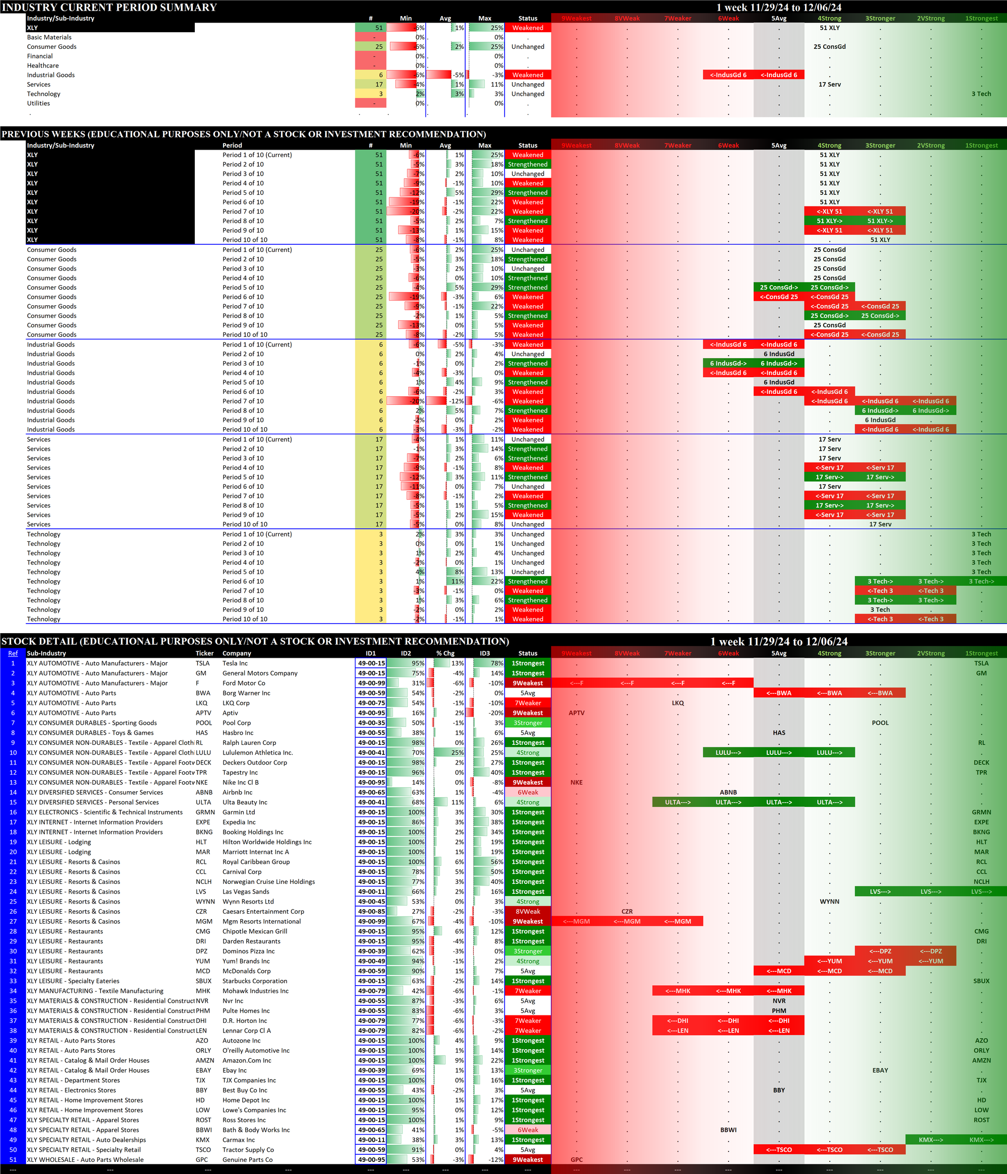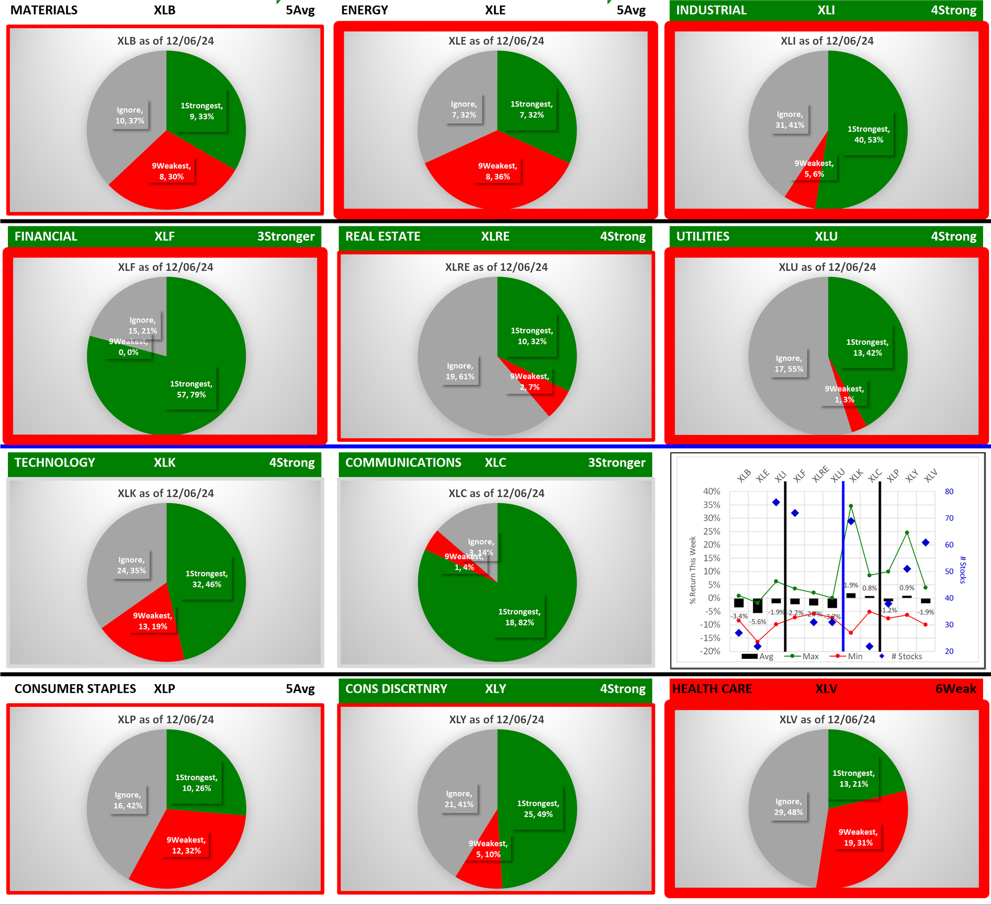 The following Stock Market Organizer strengthening/weakening analysis looks at the 11 SPDR ETFs and their underlying component stocks for the week ending Friday 2024-12-06, as follows: