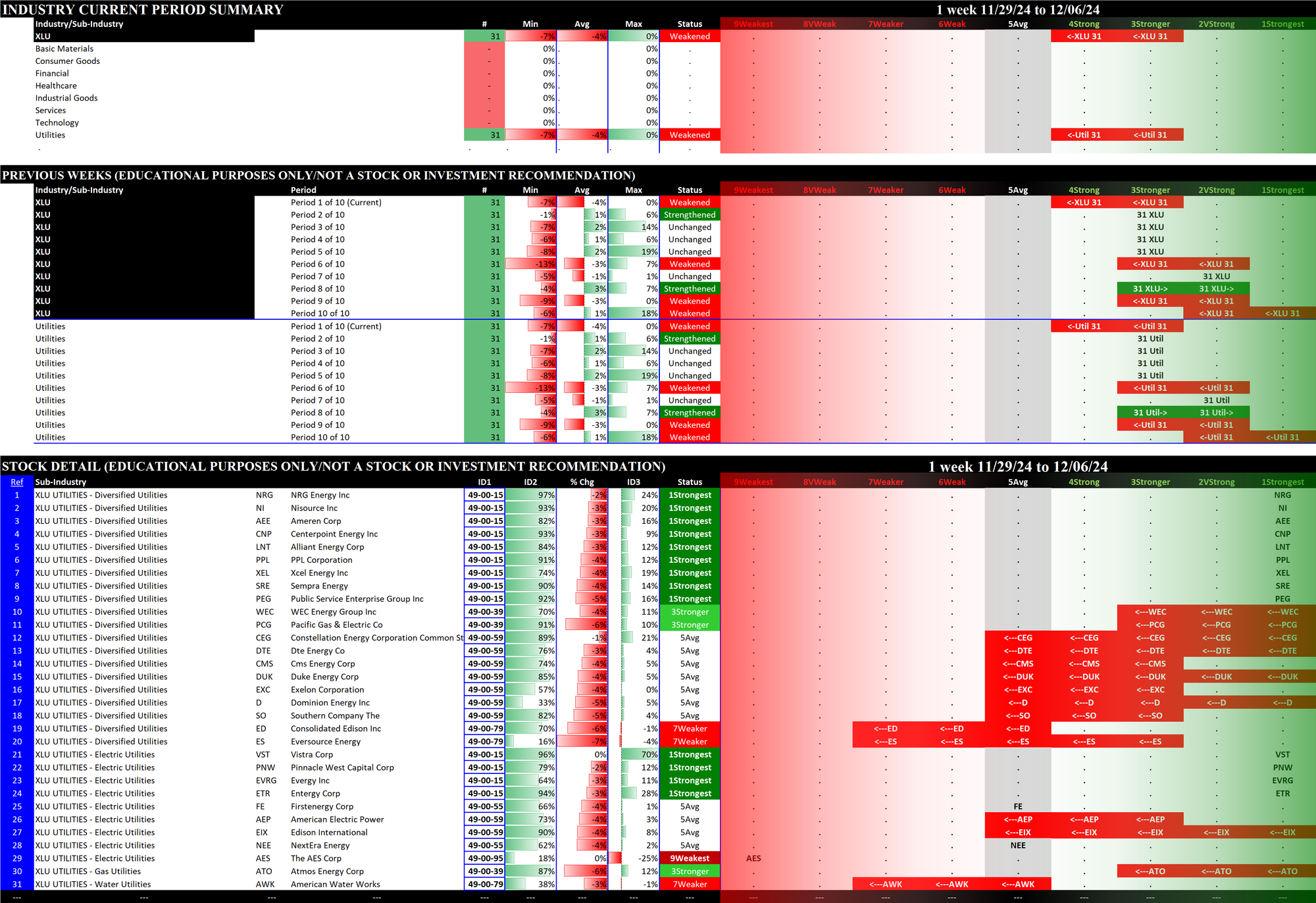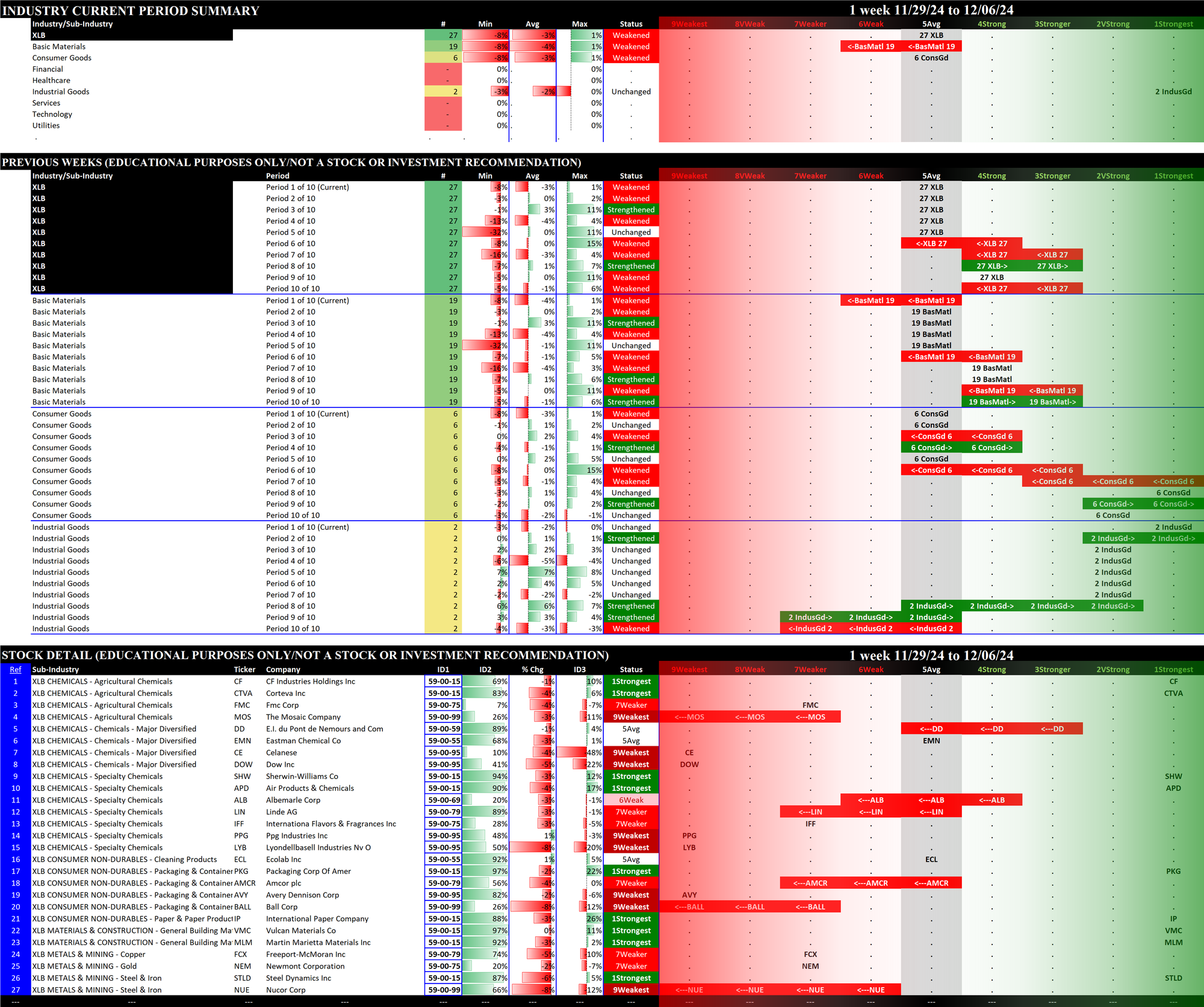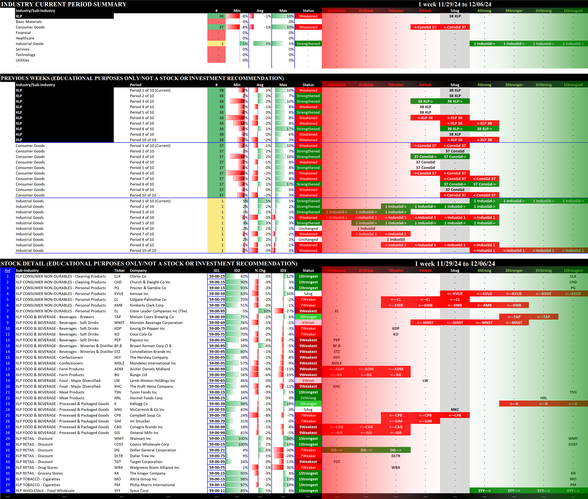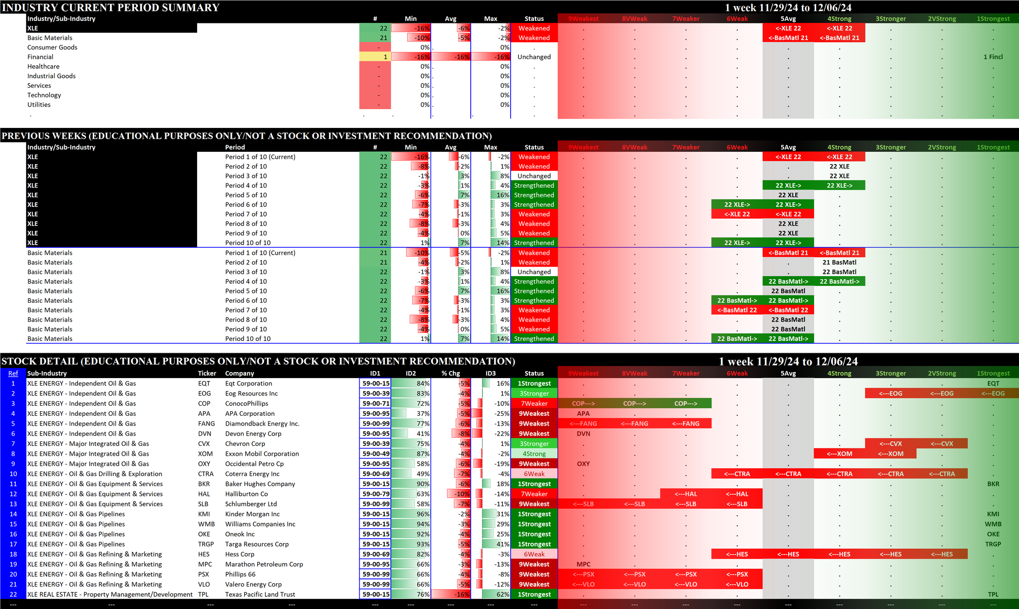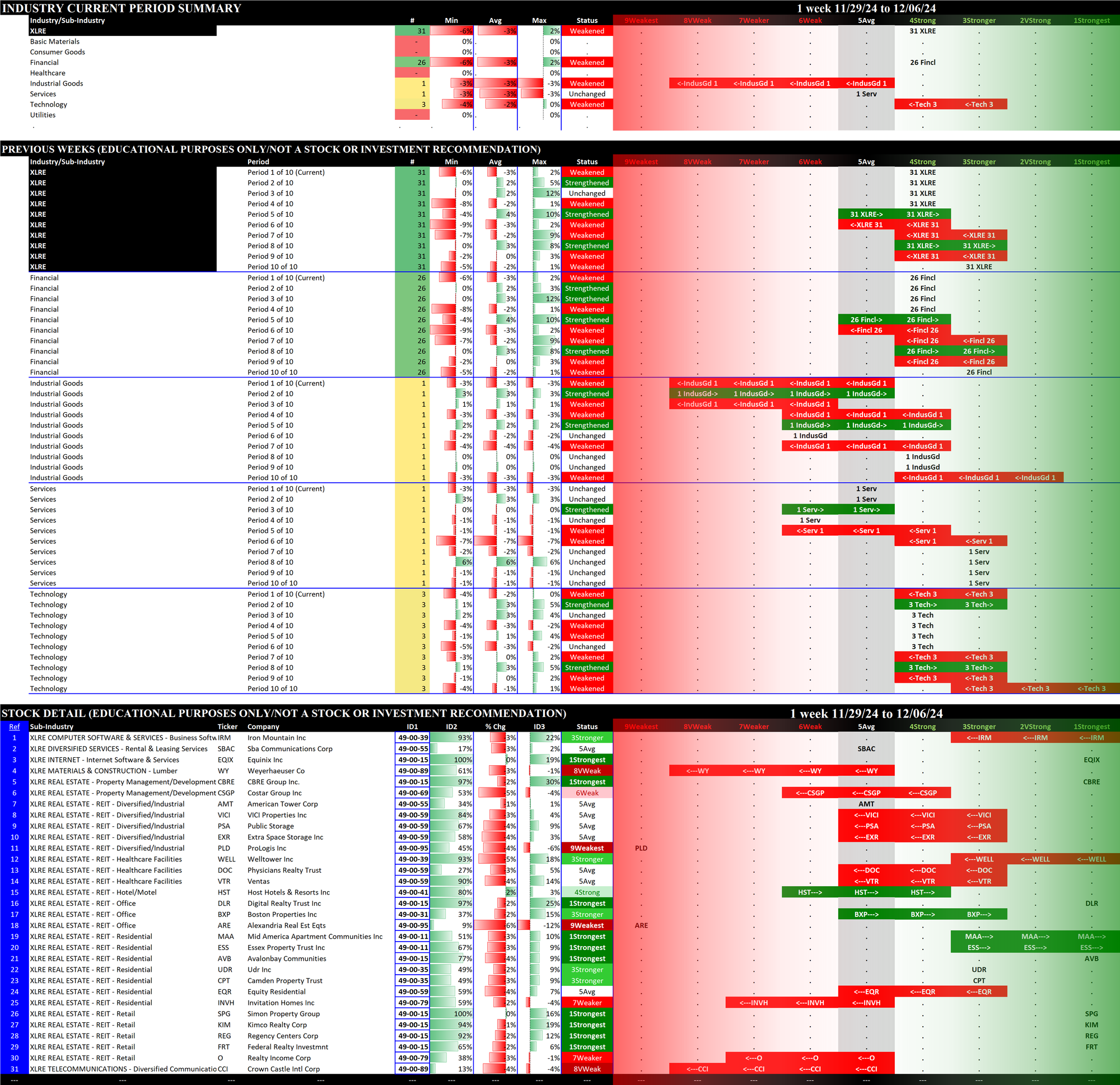 The following Stock Market Organizer strengthening/weakening analysis looks at the 11 SPDR ETFs and their underlying component stocks for the week ending Friday 2024-12-06, as follows: