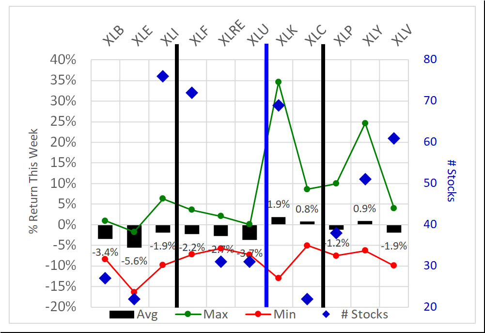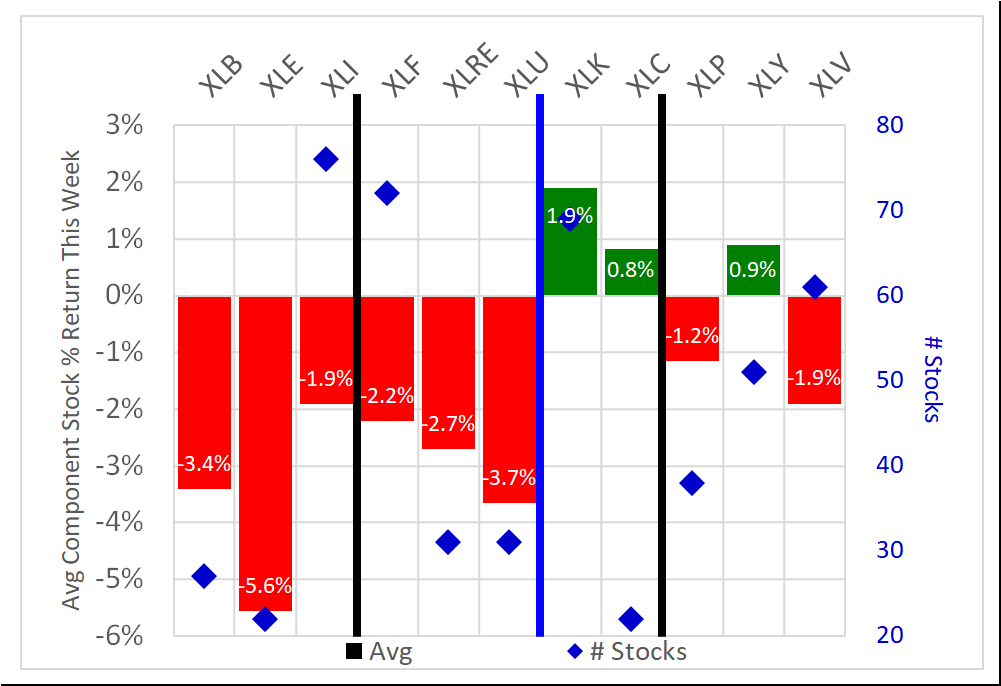 The average returns for the underlying stocks in each ETF are shown below - note this is NOT the return for the ETF for this week. The average returns ranged from -5.6% (XLE/Energy) to +1.9% (XLK/Technology), with eight of 11 negative for the week. The best and worst are highlighted below: