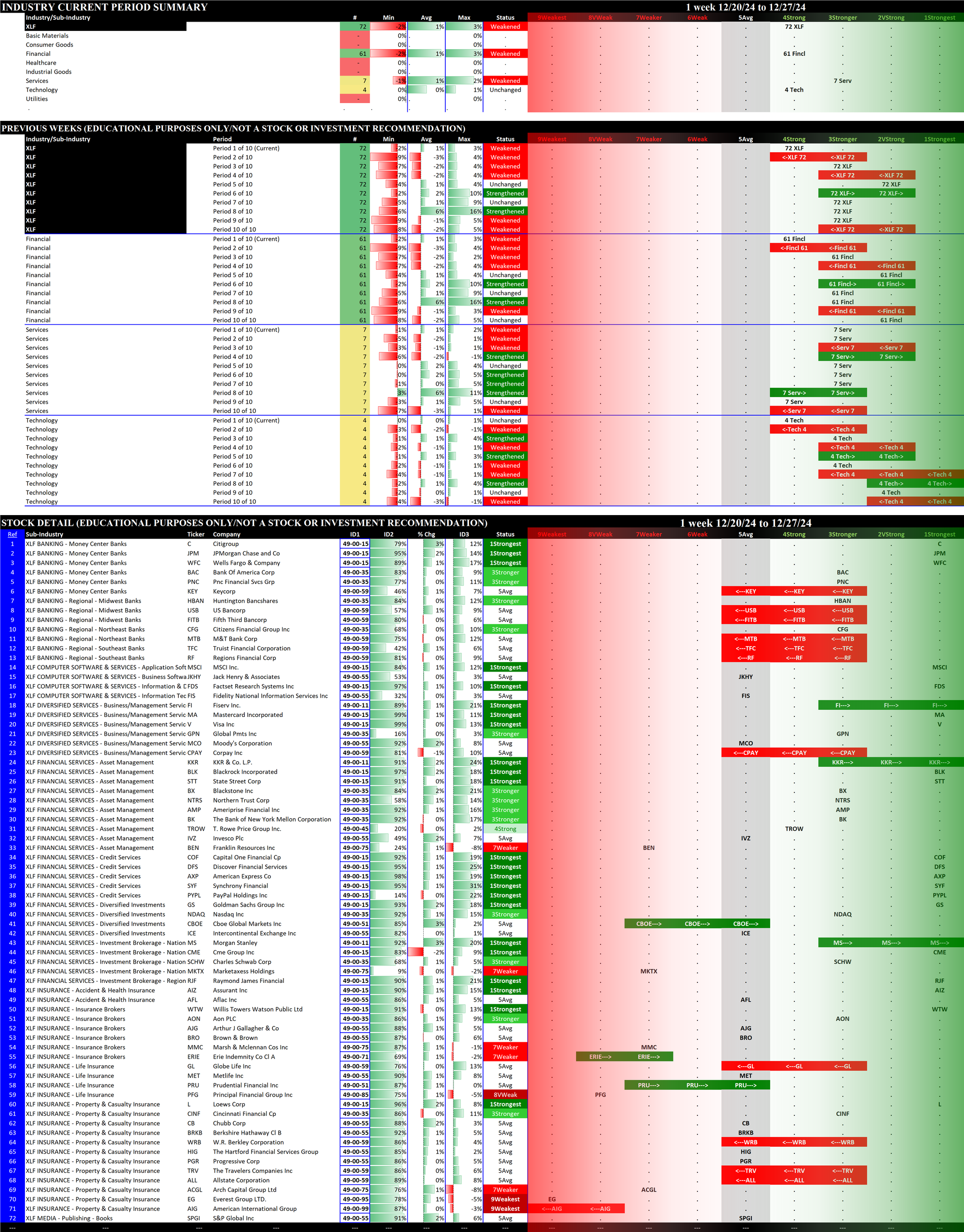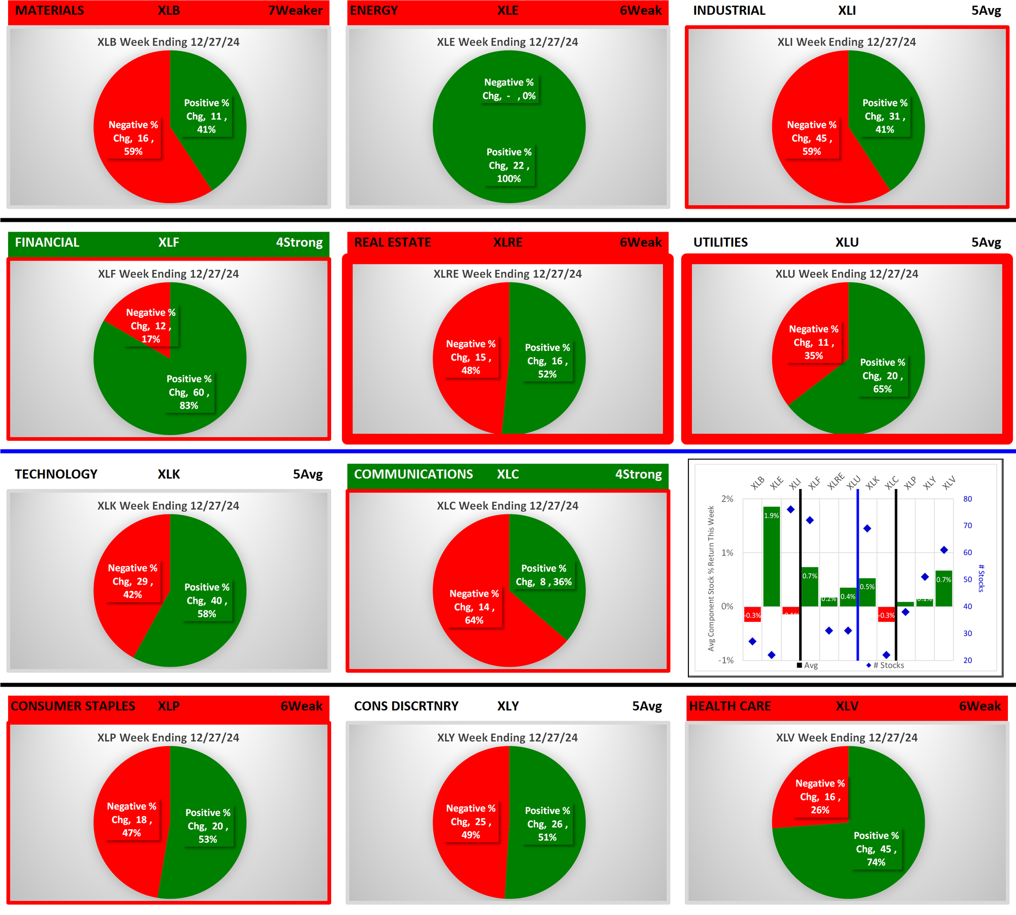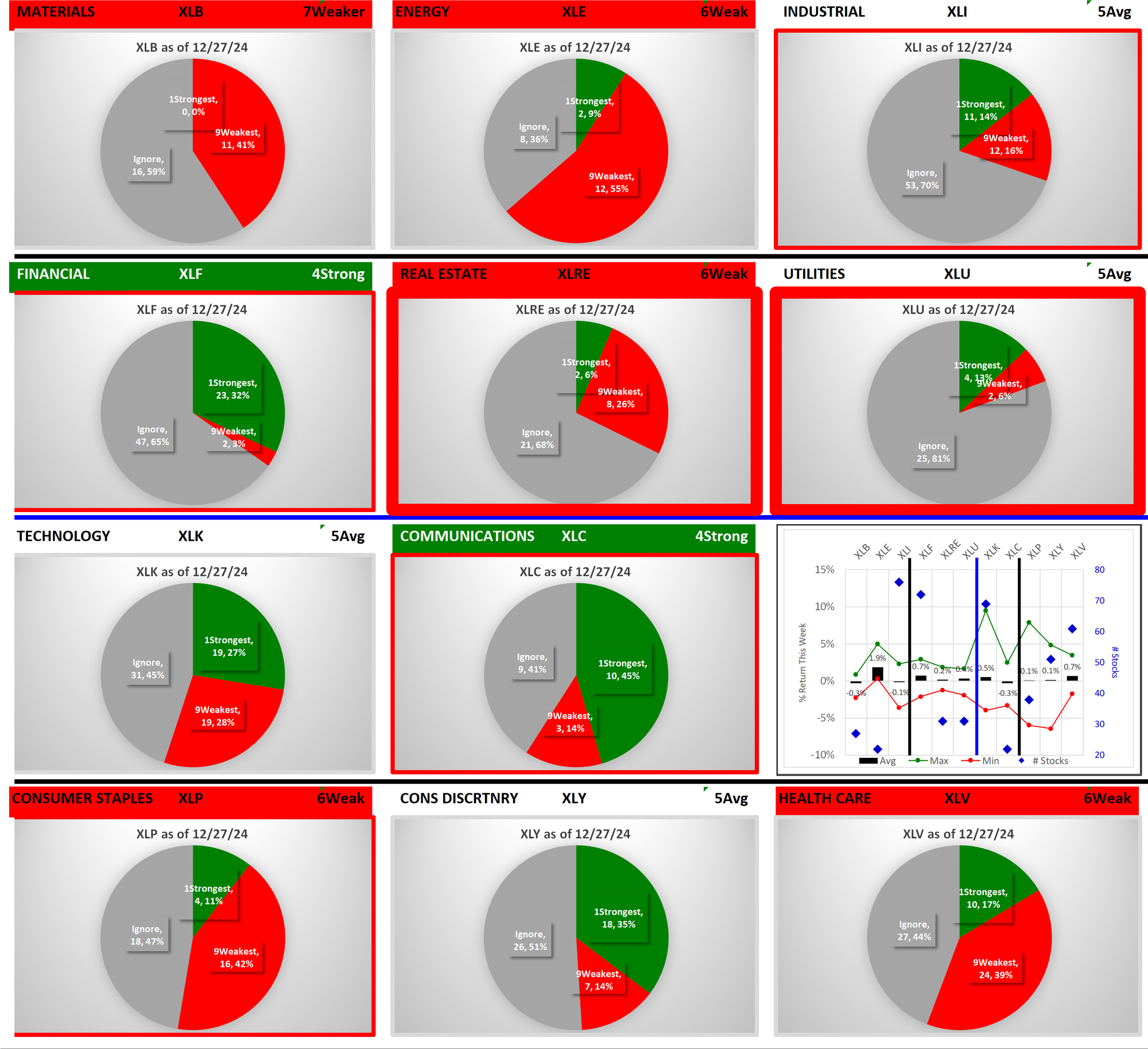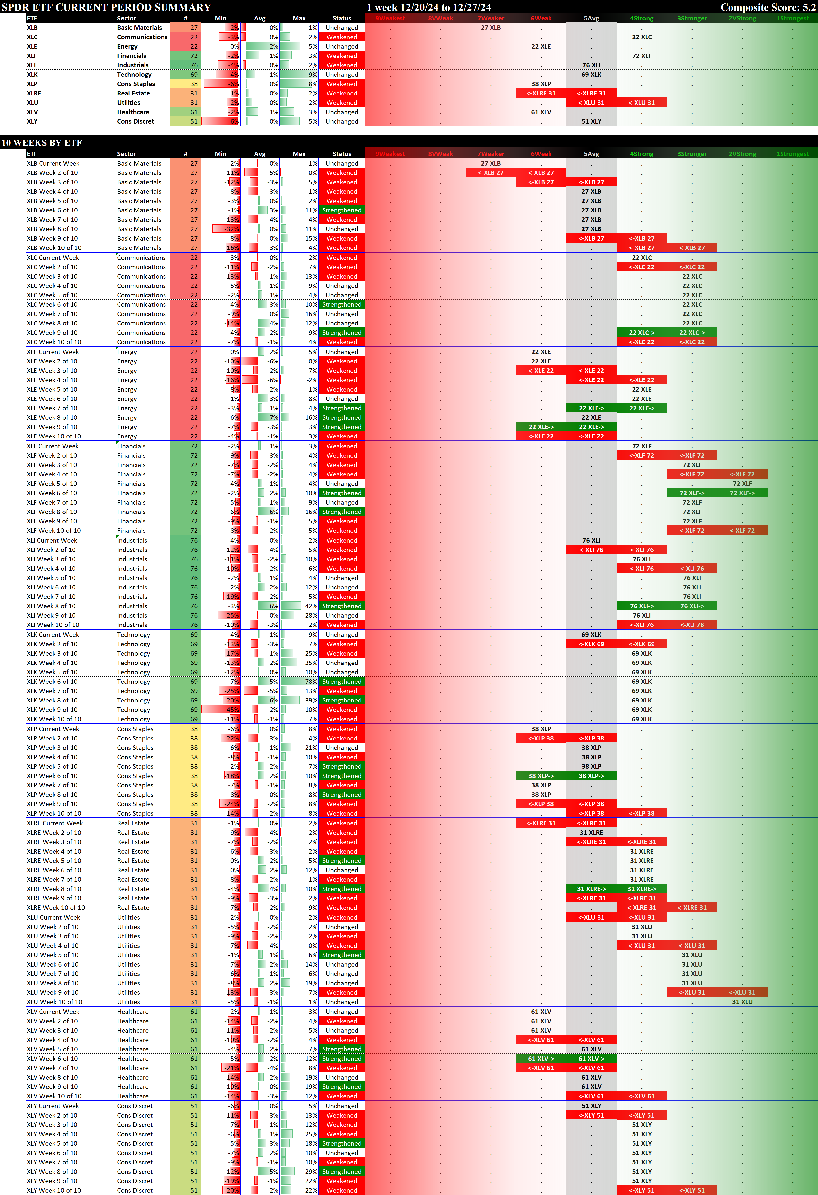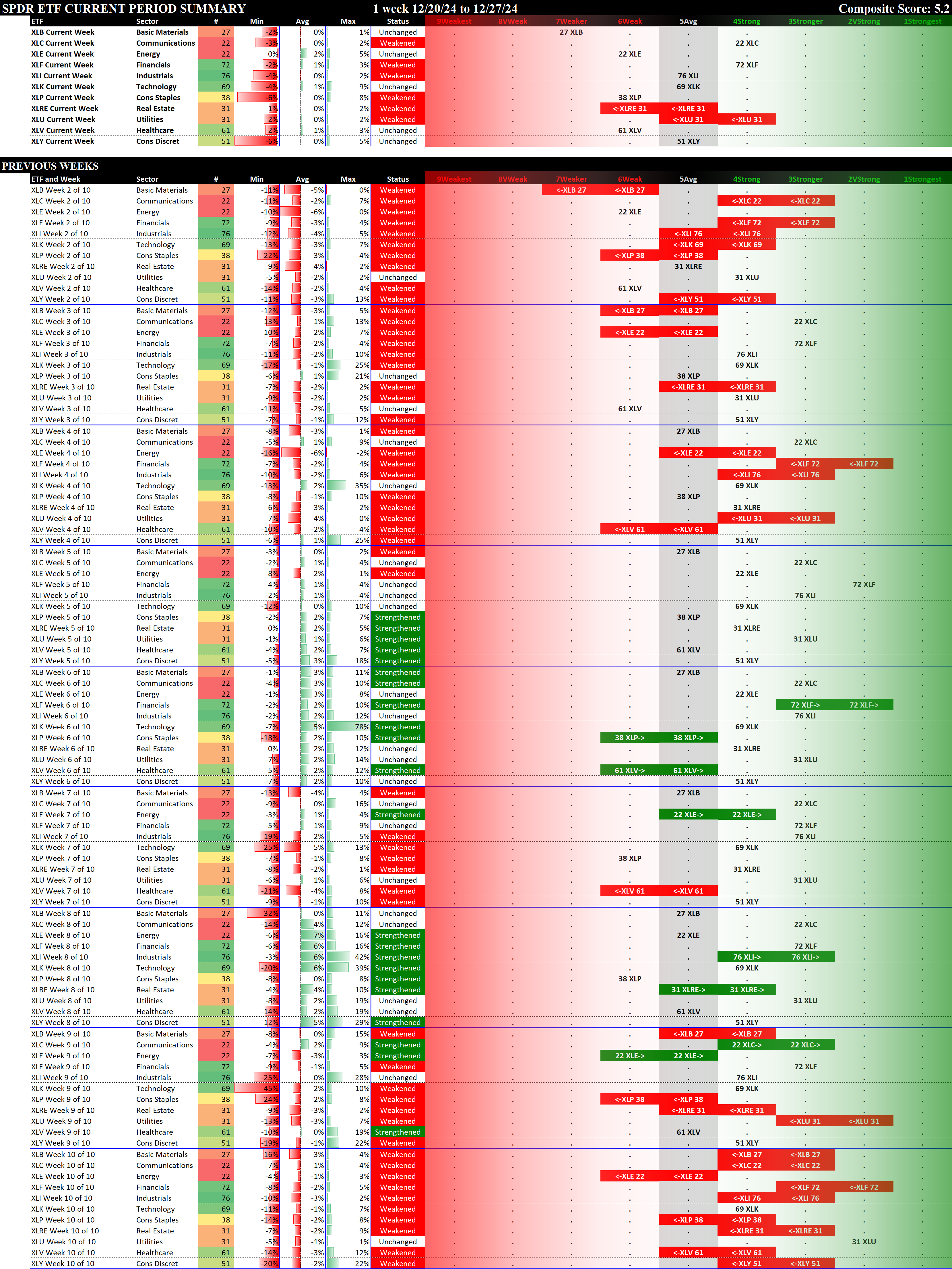 The following Stock Market Organizer strengthening/weakening analysis looks at the 11 SPDR ETFs and their underlying component stocks for the week ending Friday 2024-12-27, as follows: