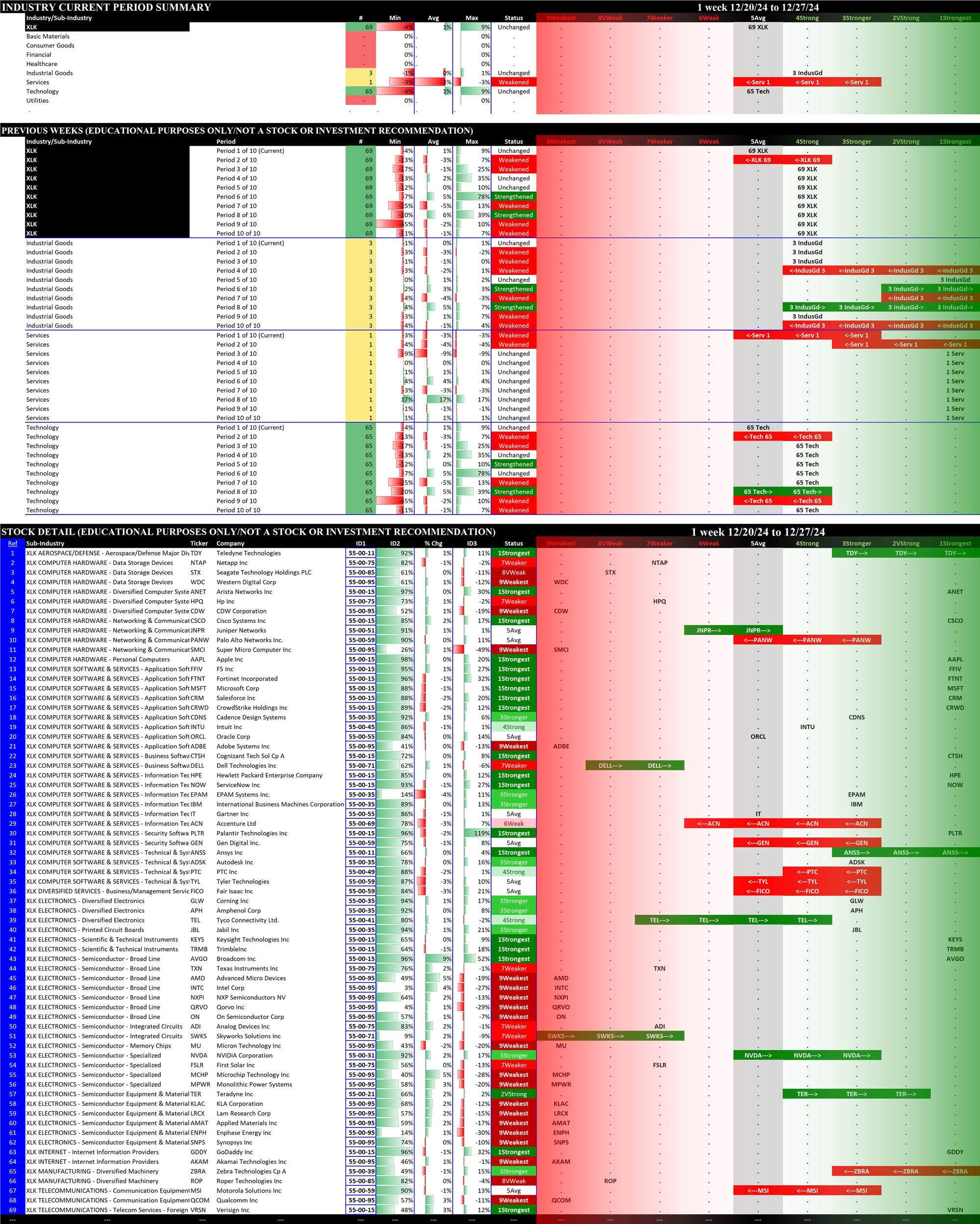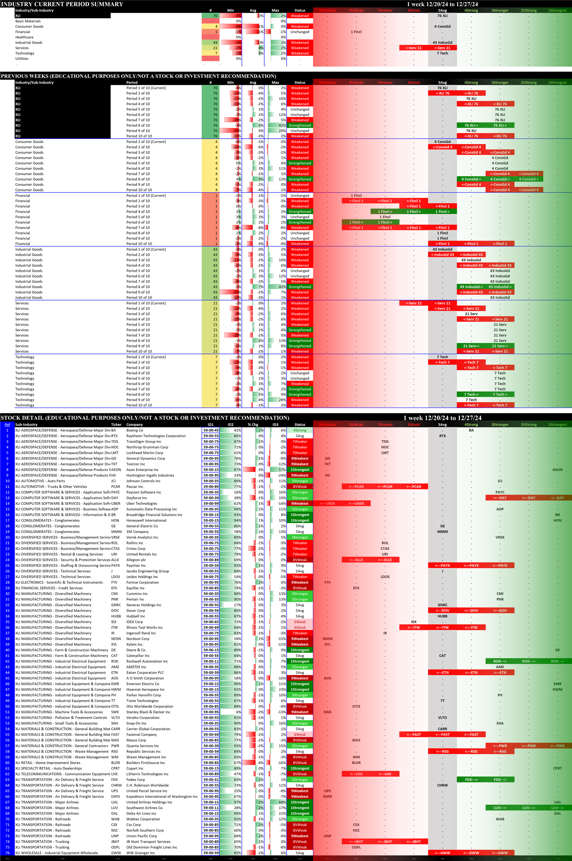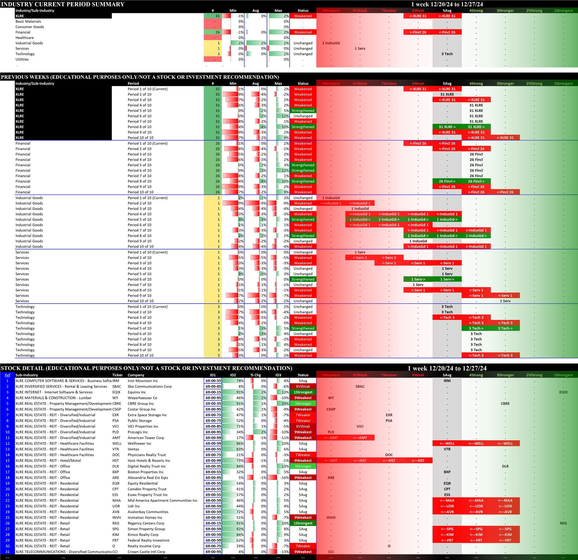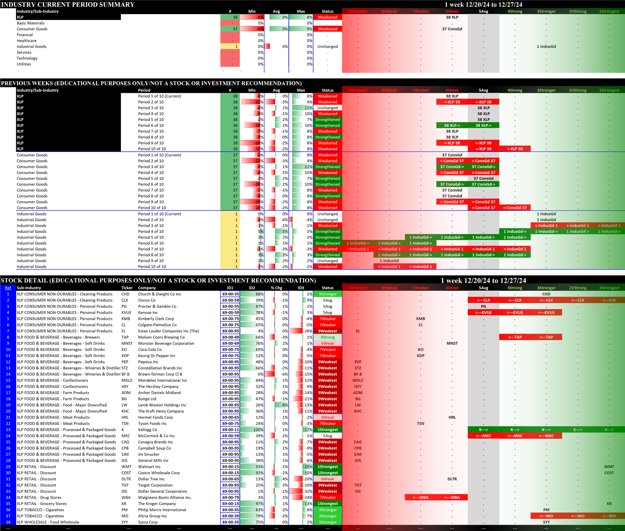 The following Stock Market Organizer strengthening/weakening analysis looks at the 11 SPDR ETFs and their underlying component stocks for the week ending Friday 2024-12-27, as follows:
