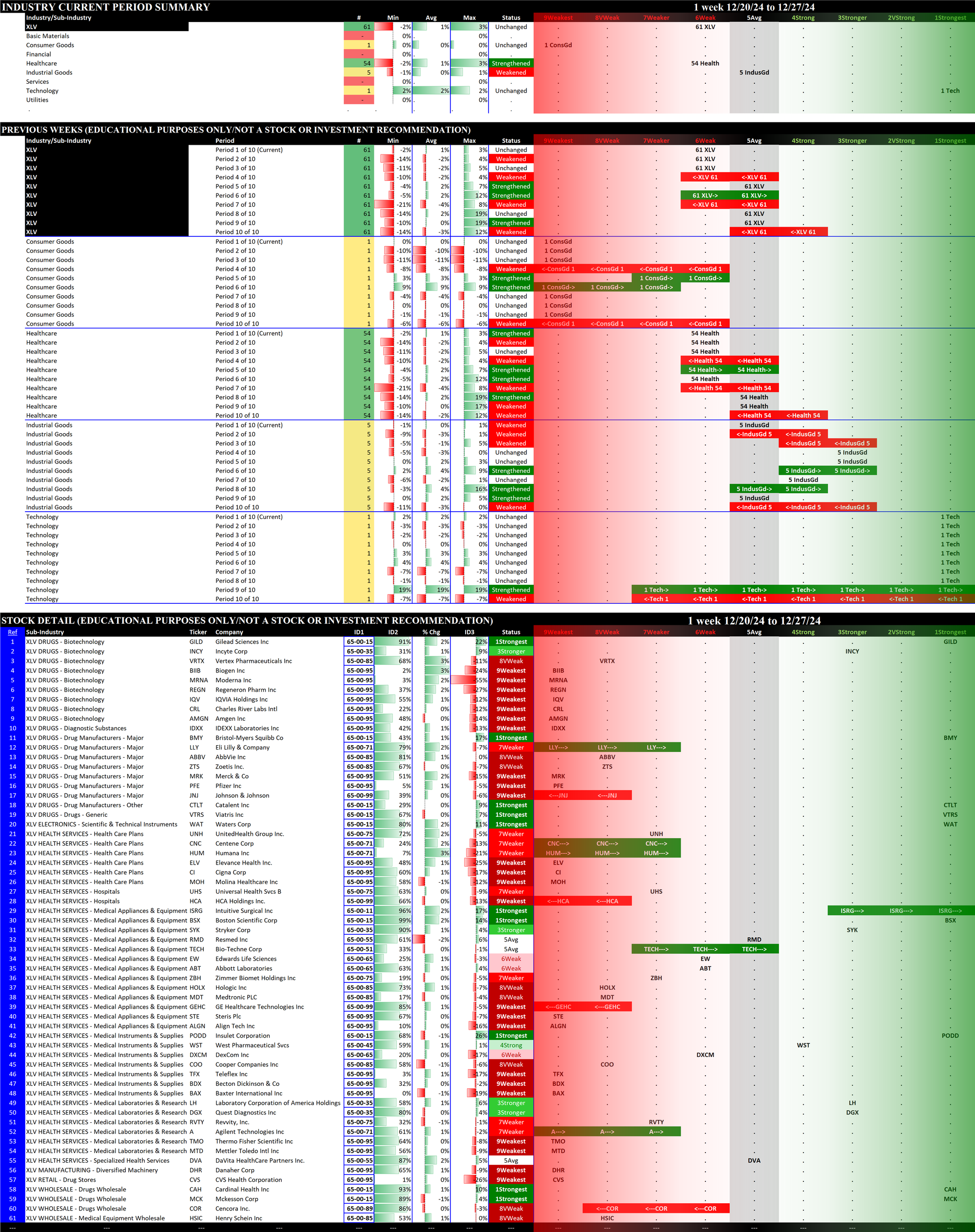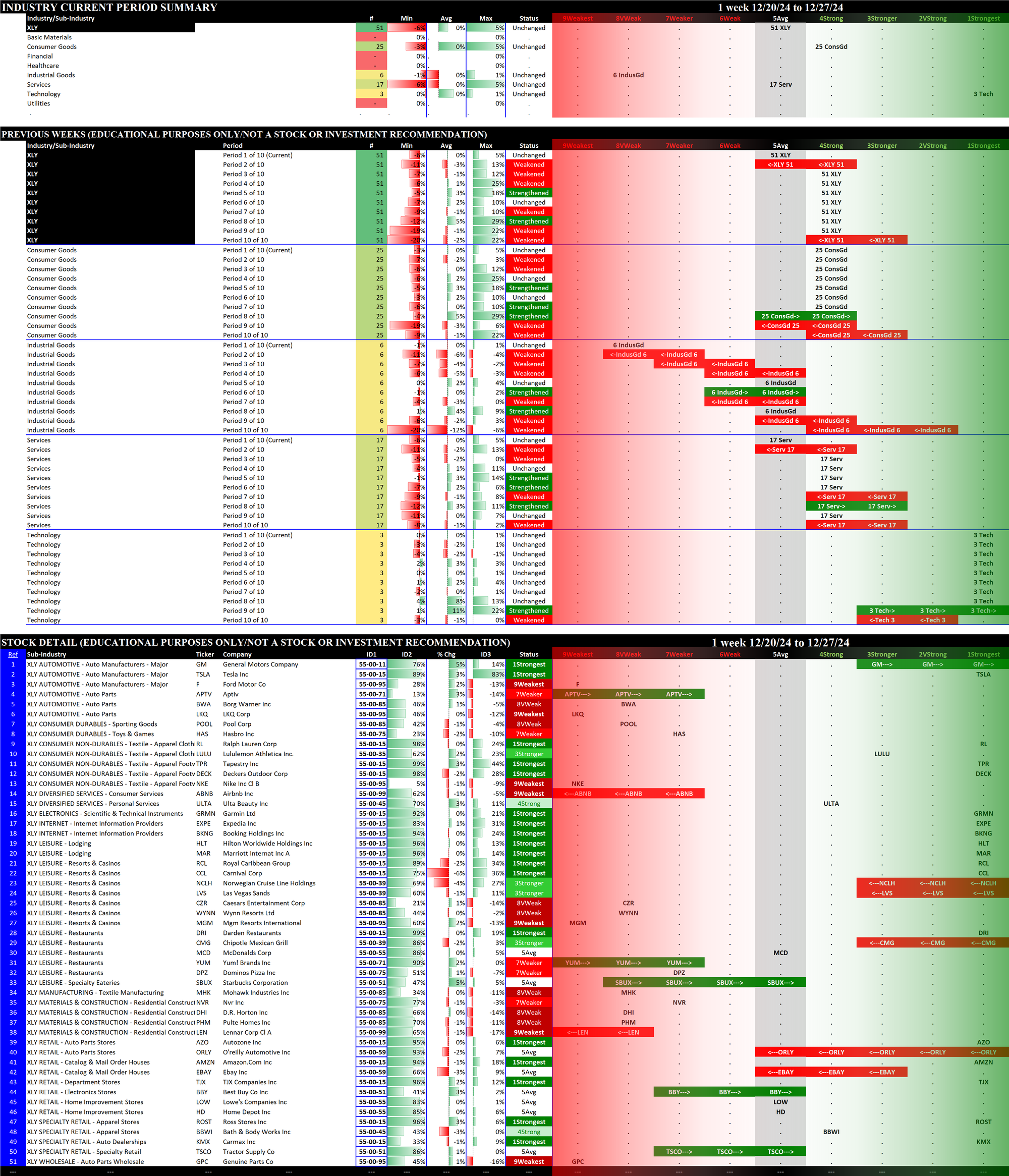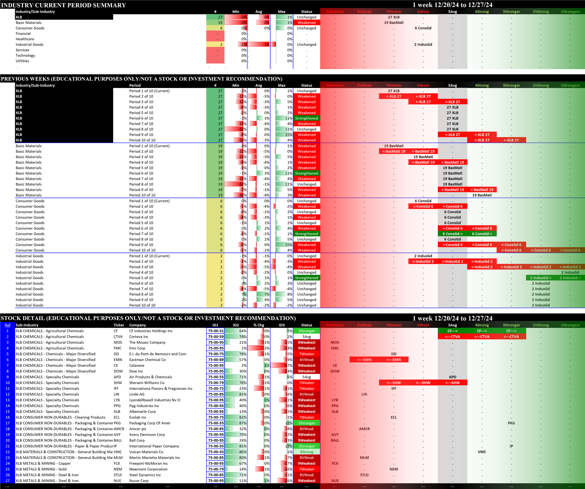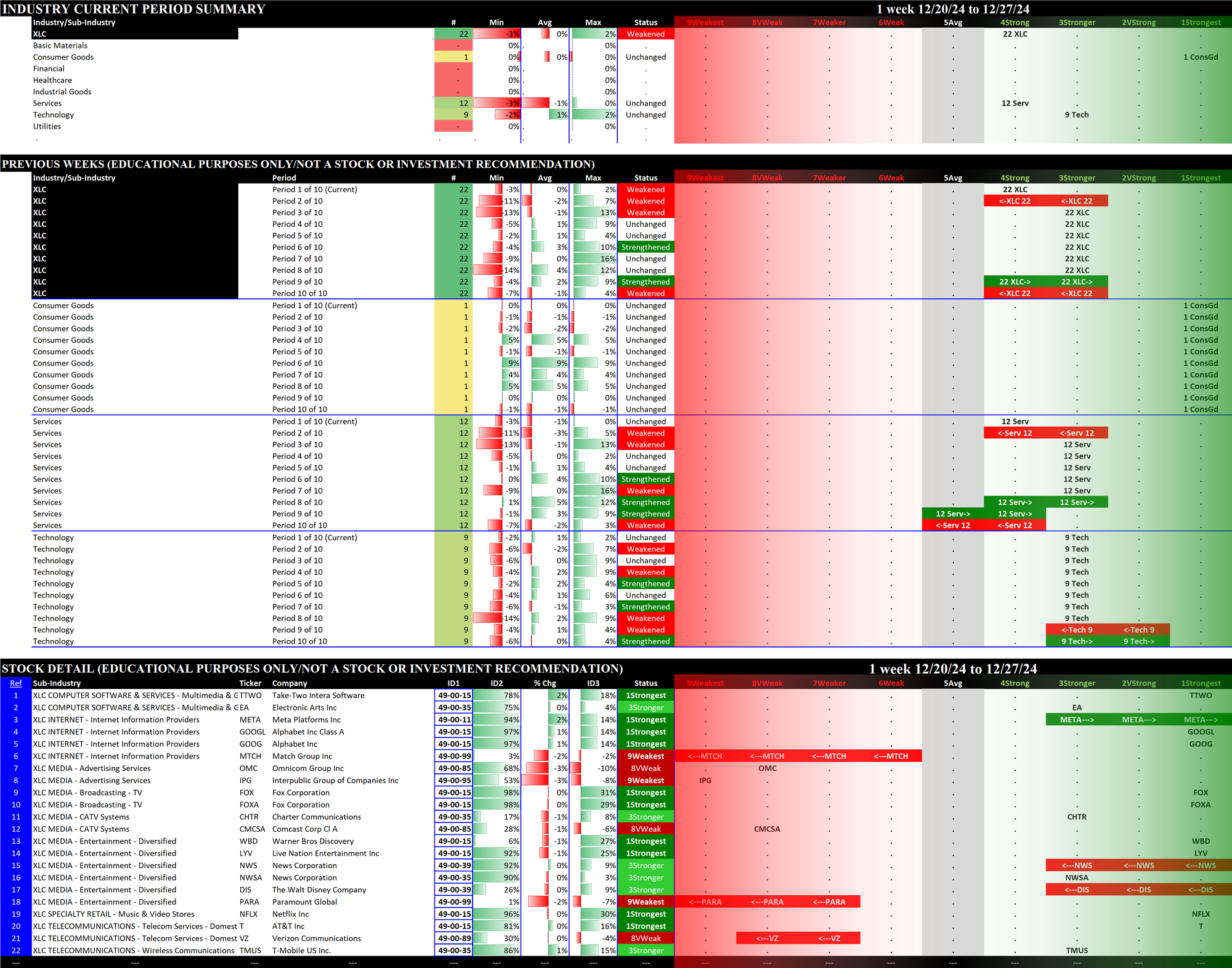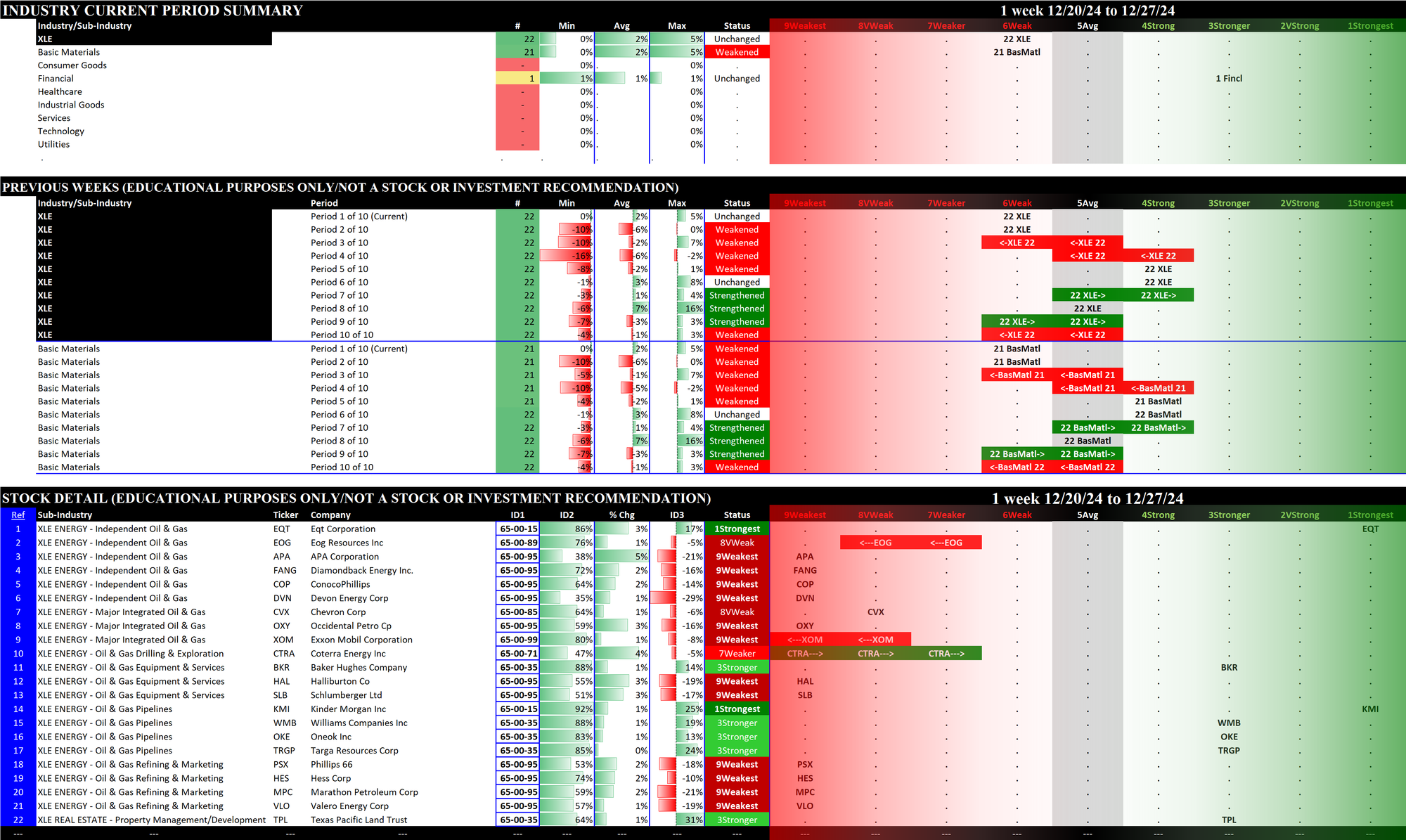 The following Stock Market Organizer strengthening/weakening analysis looks at the 11 SPDR ETFs and their underlying component stocks for the week ending Friday 2024-12-27, as follows: