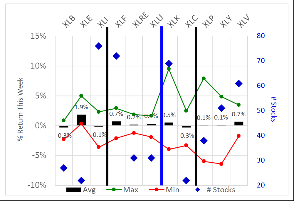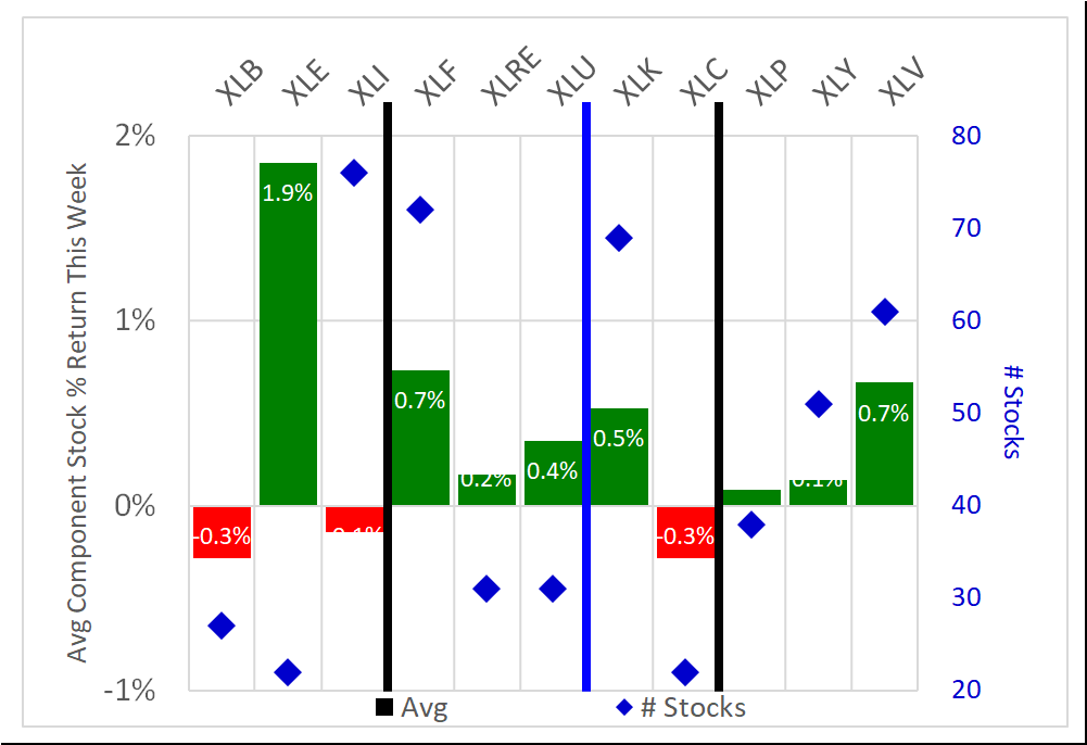 XLE/Energy was the relative strong performer this week with 100% positive stocks and the highest positive average return at 1.9%.